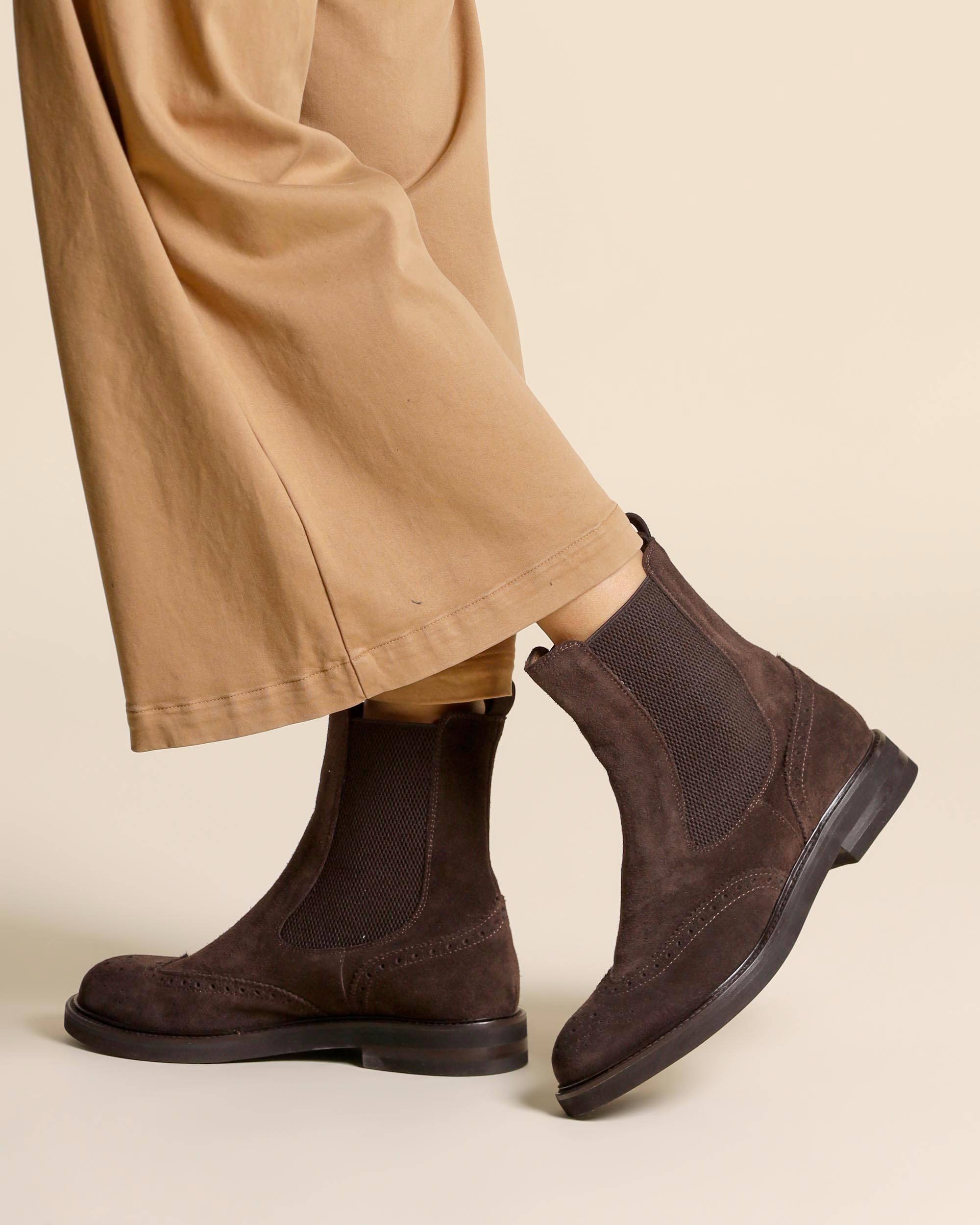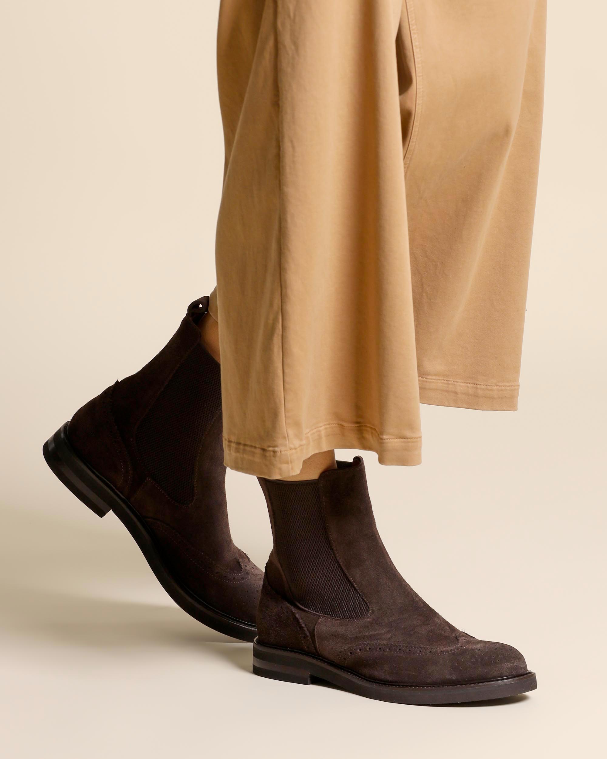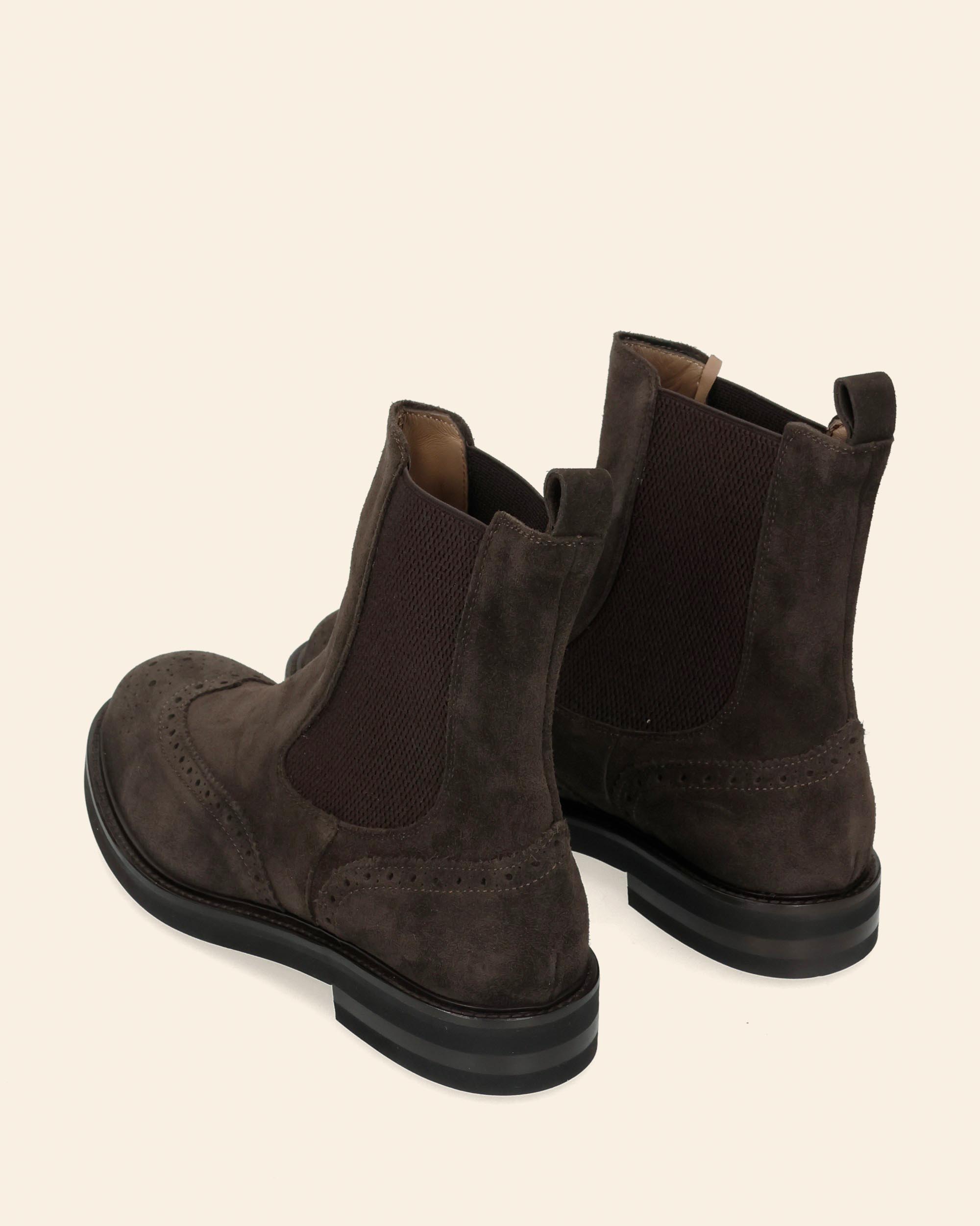 Tronchetti in velour color testa di moro, elastici in tinta, suola in gomma Morflex Vibram, fodera in pelle, tacco 30mm, sottopiede in pelle, punta tonda, made in Italy, collezione donna Duccio del Duca autunno inverno 2025/2026