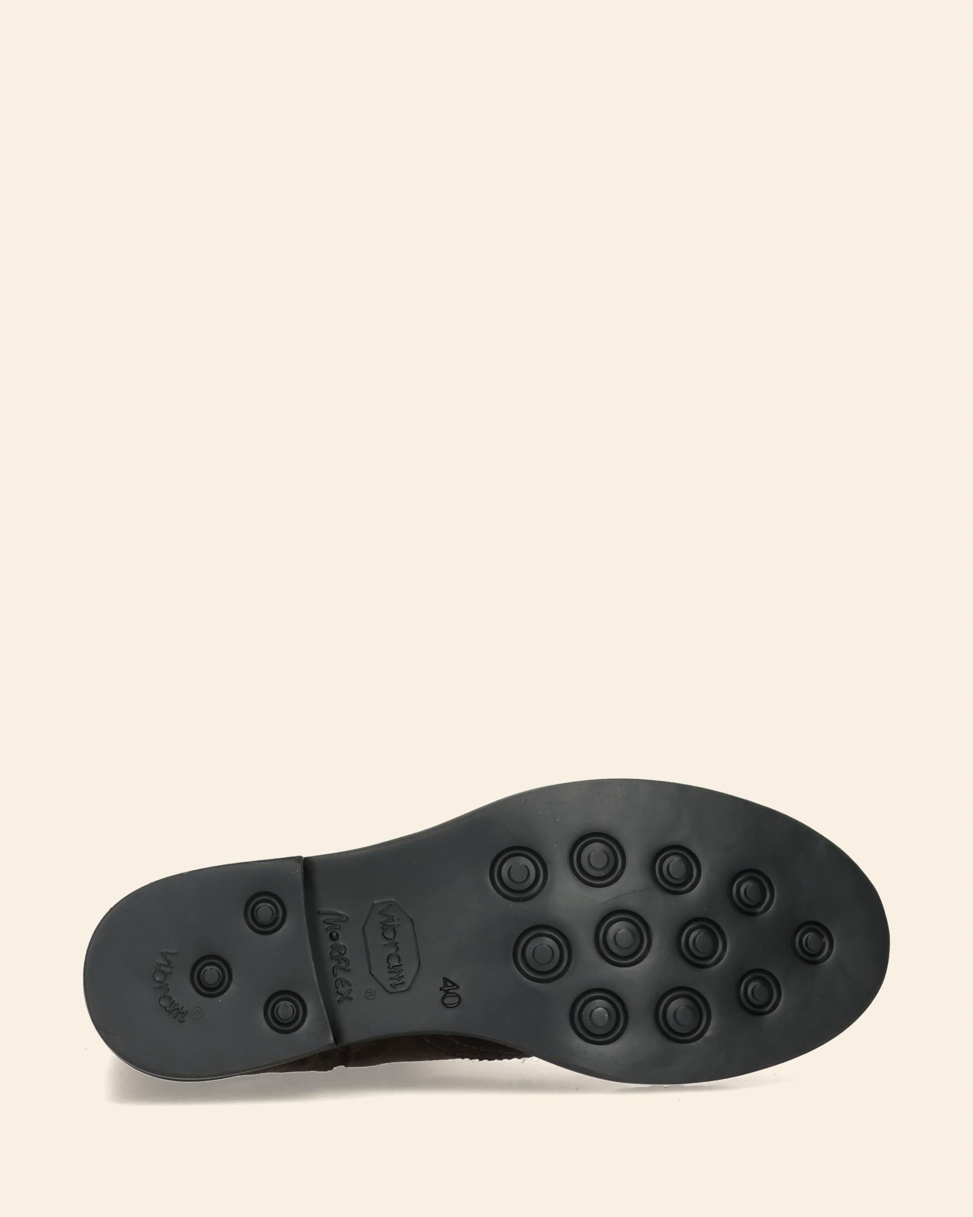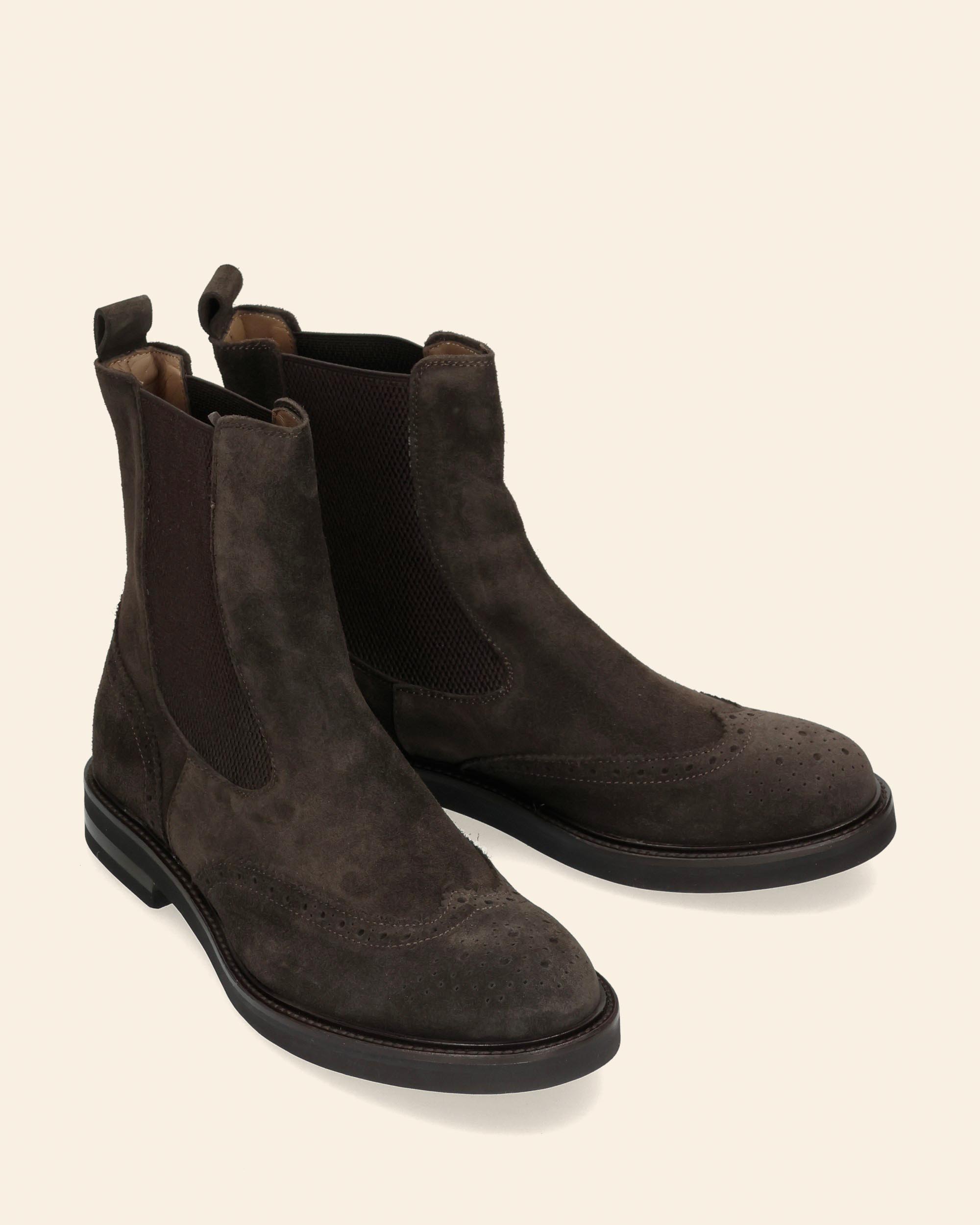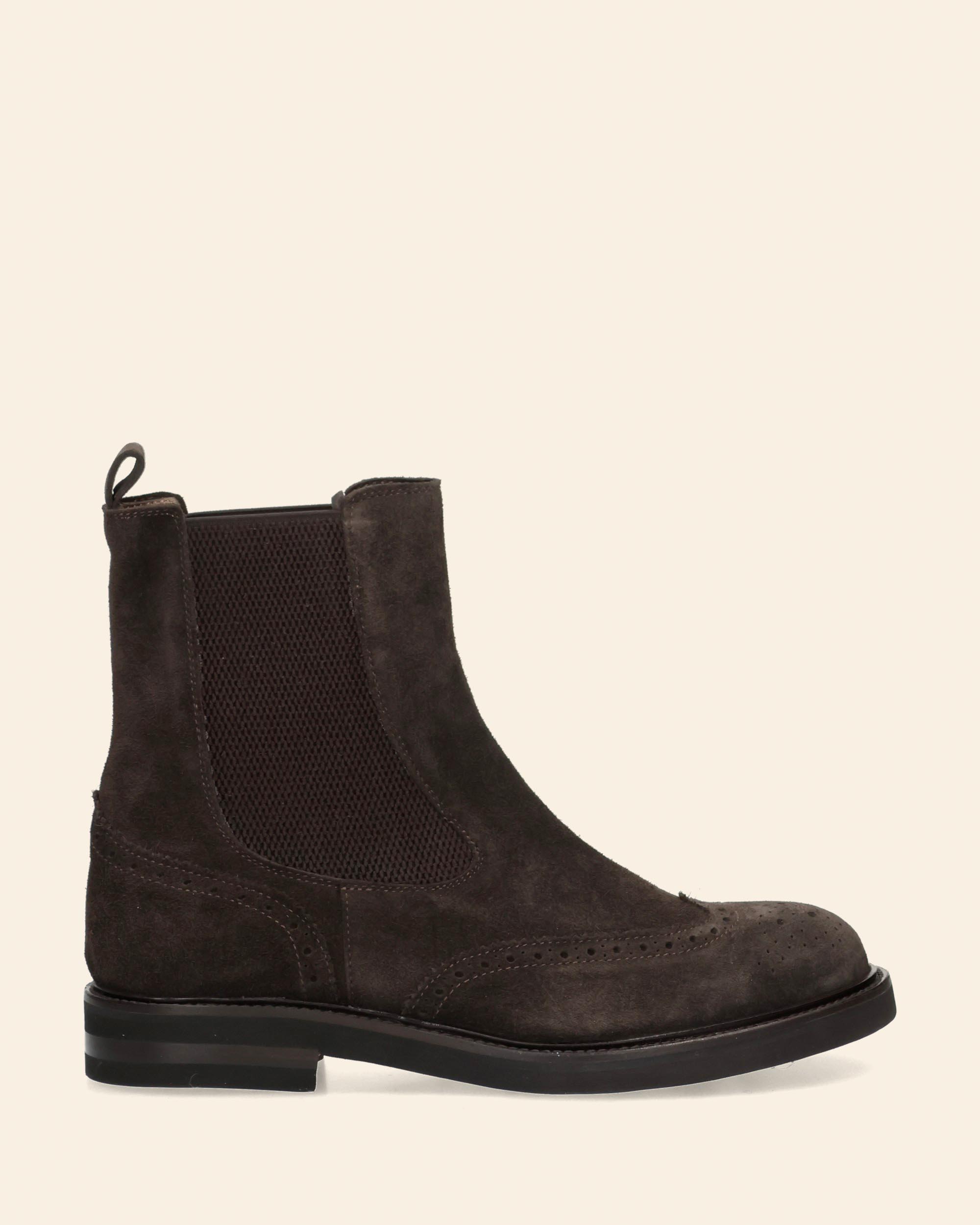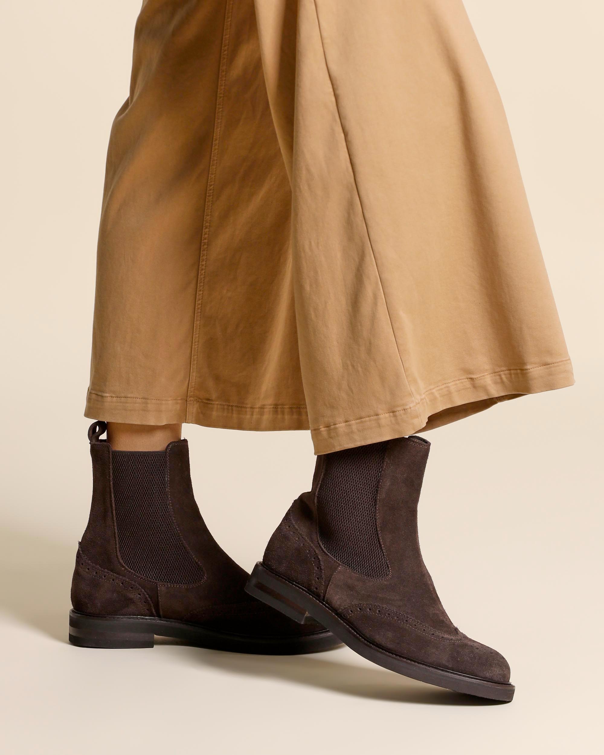 Tronchetti in velour color testa di moro, elastici in tinta, suola in gomma Morflex Vibram, fodera in pelle, tacco 30mm, sottopiede in pelle, punta tonda, made in Italy, collezione donna Duccio del Duca autunno inverno 2025/2026