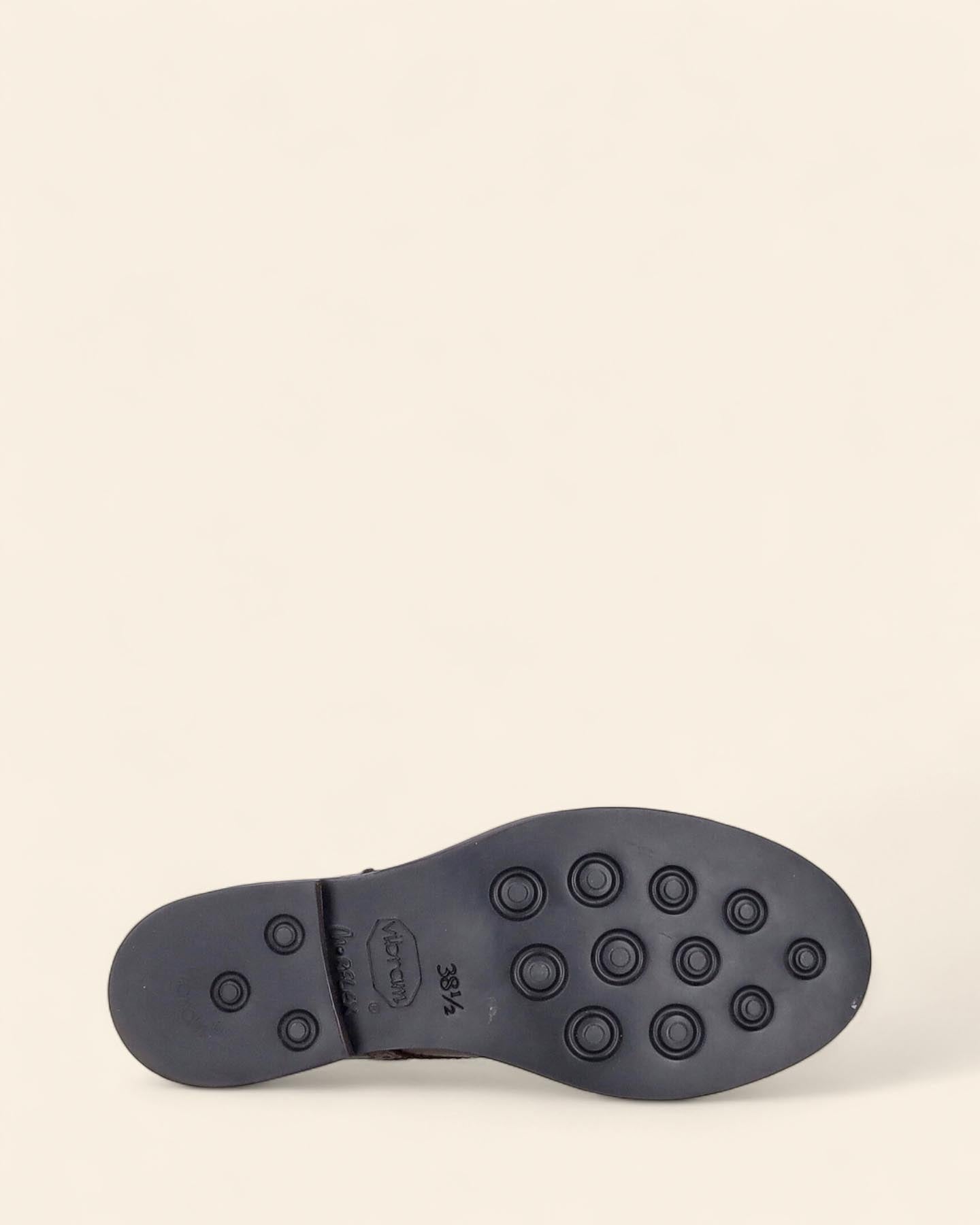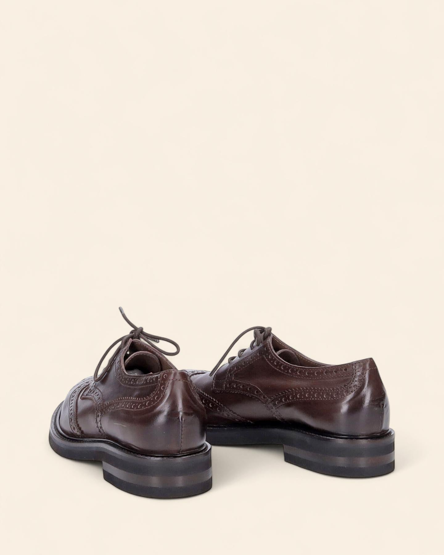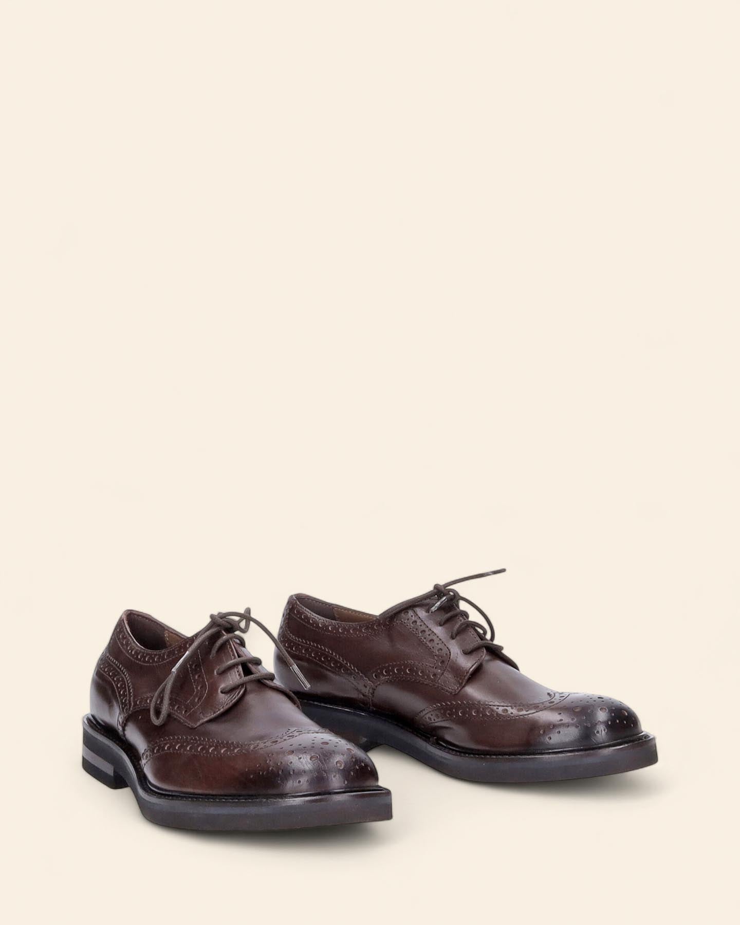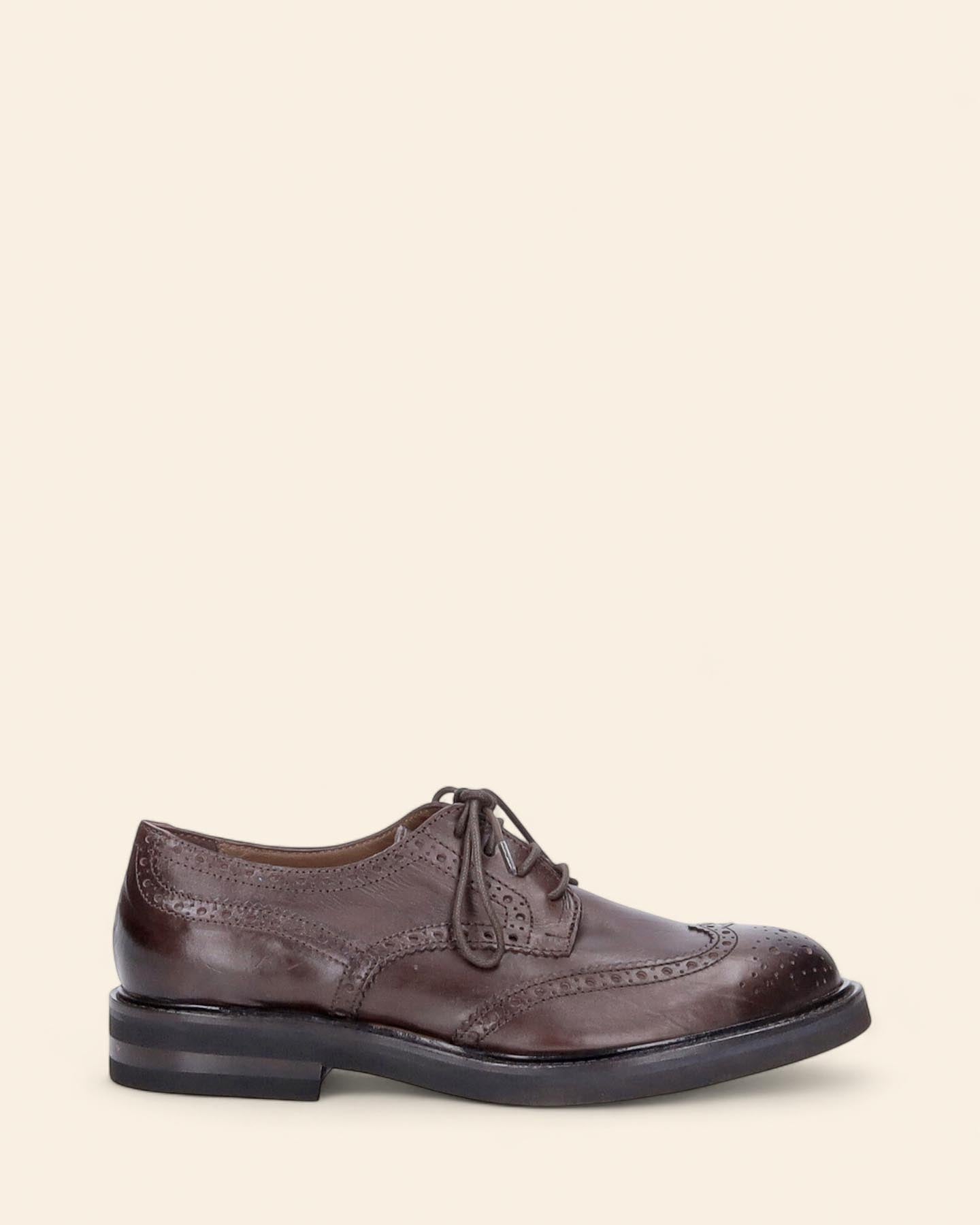 Stringate in pelle color marrone, suola in gomma con lavorazione Morflex Vibram, tacco 30mm, soletta in pelle, lavorazione a coda di rondine, lavorazione artigianale, made in Italy, collezione donna Duccio del Duca Inverno 2025/2026