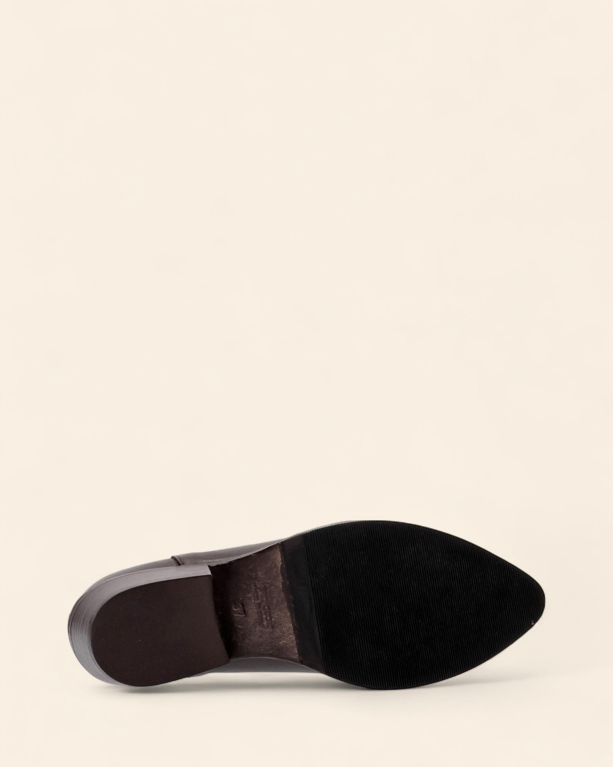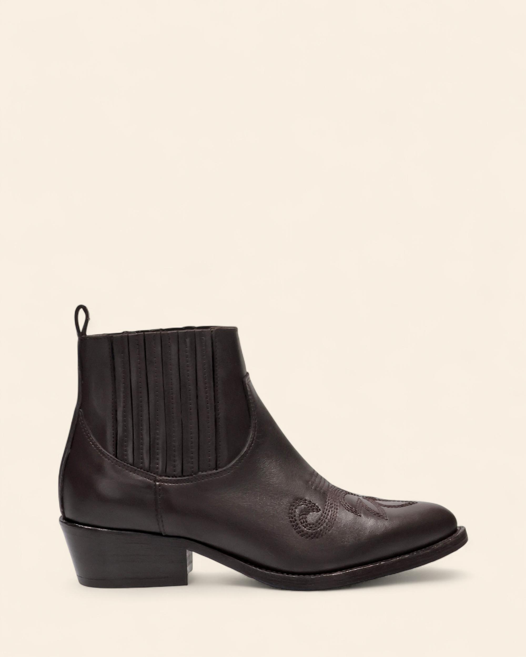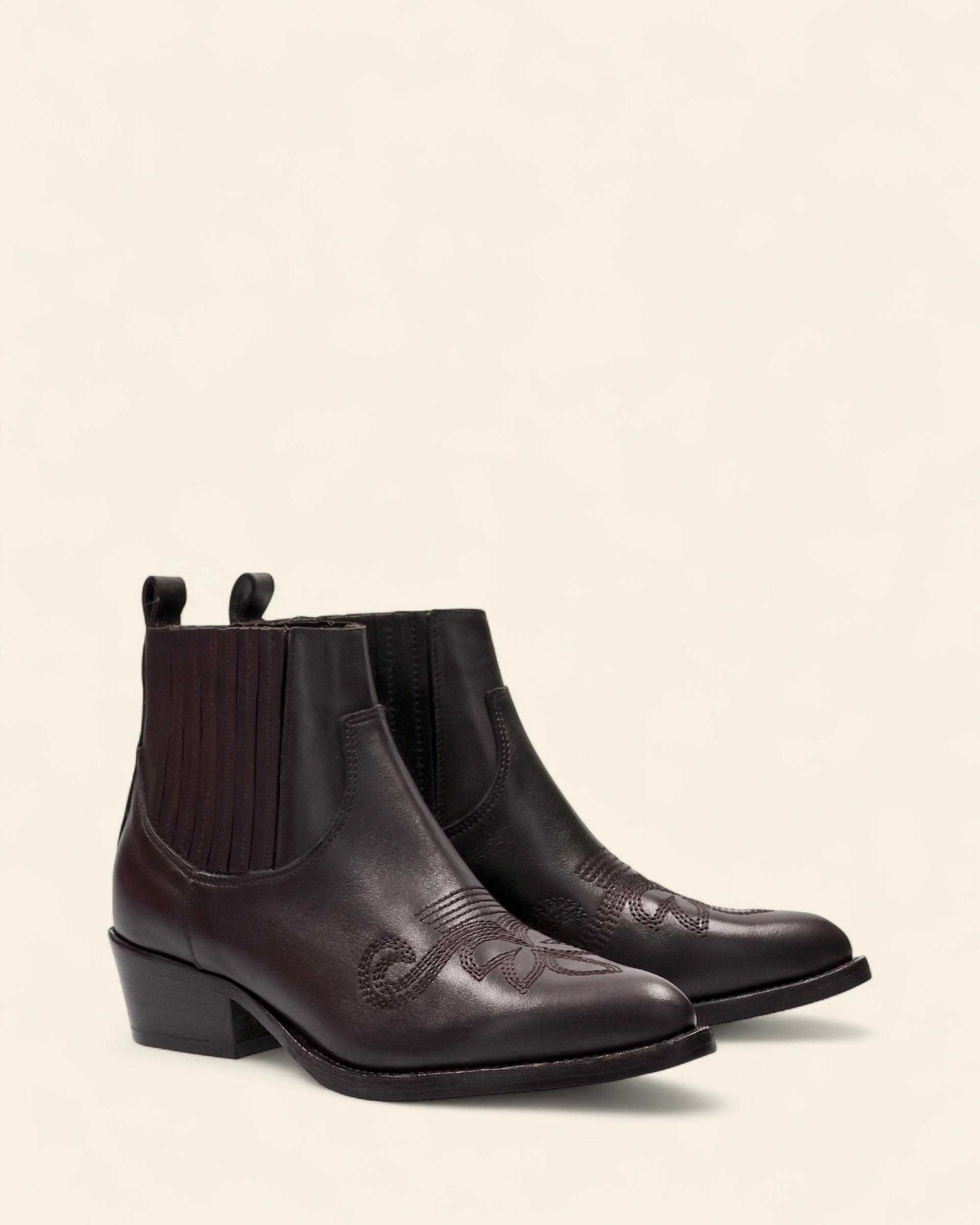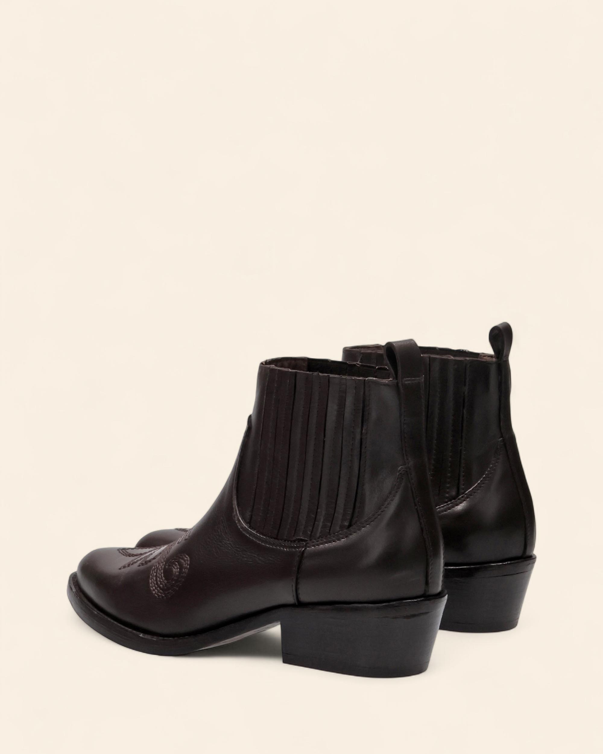 Stivaletti in pelle marrone, tacco 40mm, suola in cuoio e gomma, dettaglio ricamato in tinta sul collo del piede, sottopiede in pelle, fodera in pelle, a punta, dettaglio di elastici ricoperti in pelle in tinta, made in Italy, collezione donna Duccio del Duca Autunno Inverno 2025/2026
