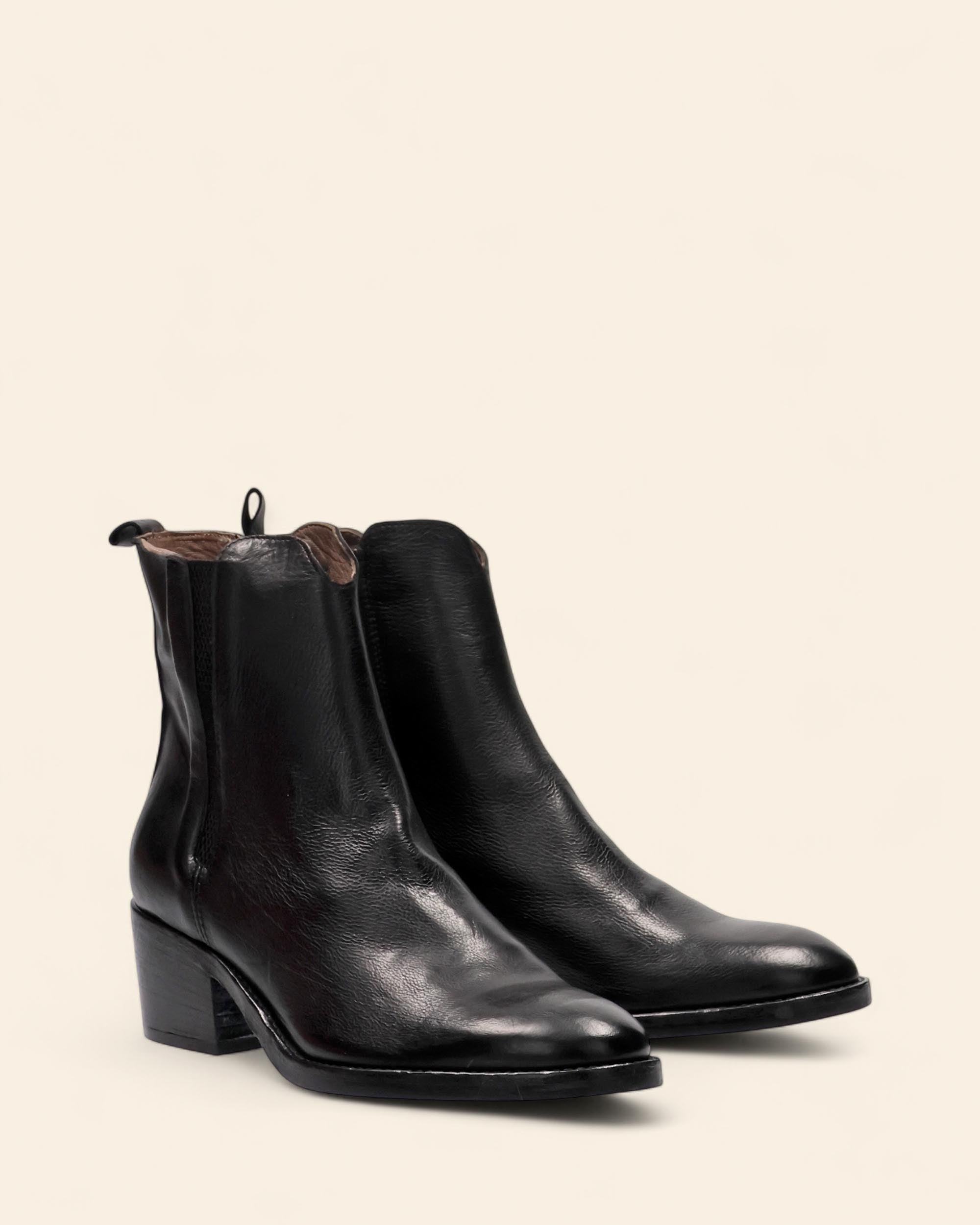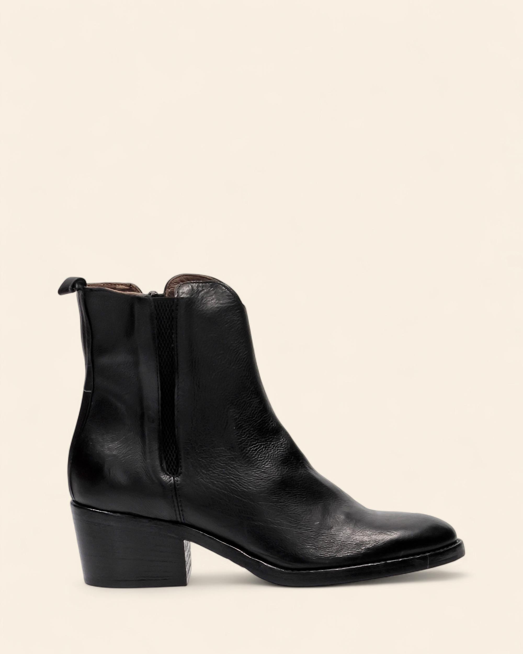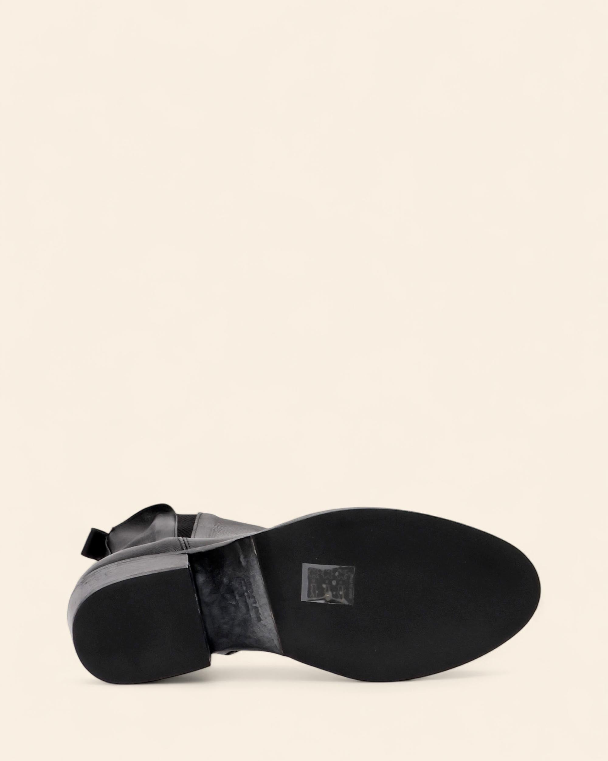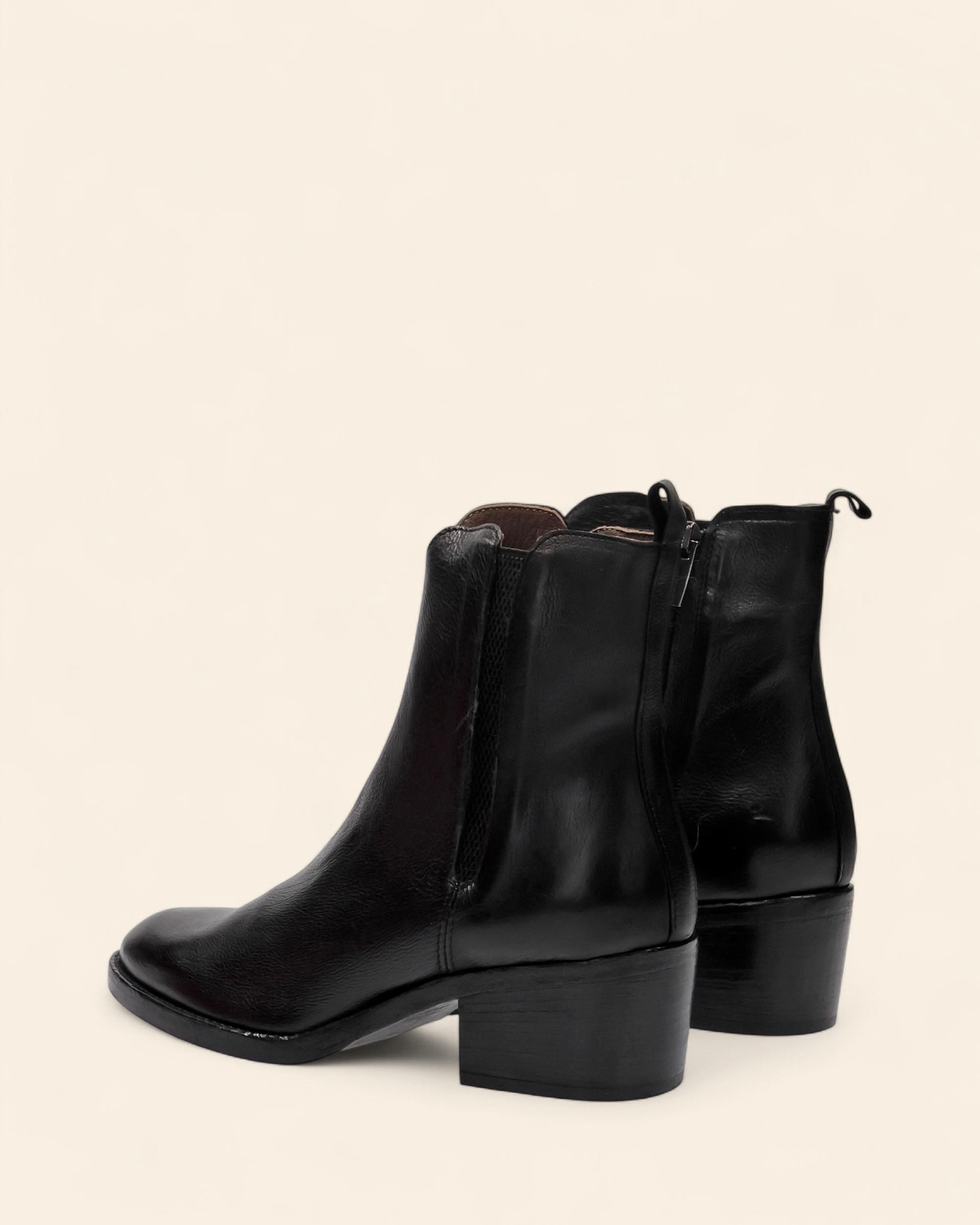 Stivaletti in pelle nera, tacco 50mm, suola in cuoio e gomma, sottopiede in pelle, fodera in pelle, punta tonda, chiusura con zip interna, tirante in tinta, elastico laterale in tinta, made in Italy, collezione donna Duccio del Duca Autunno Inverno 2025/2026