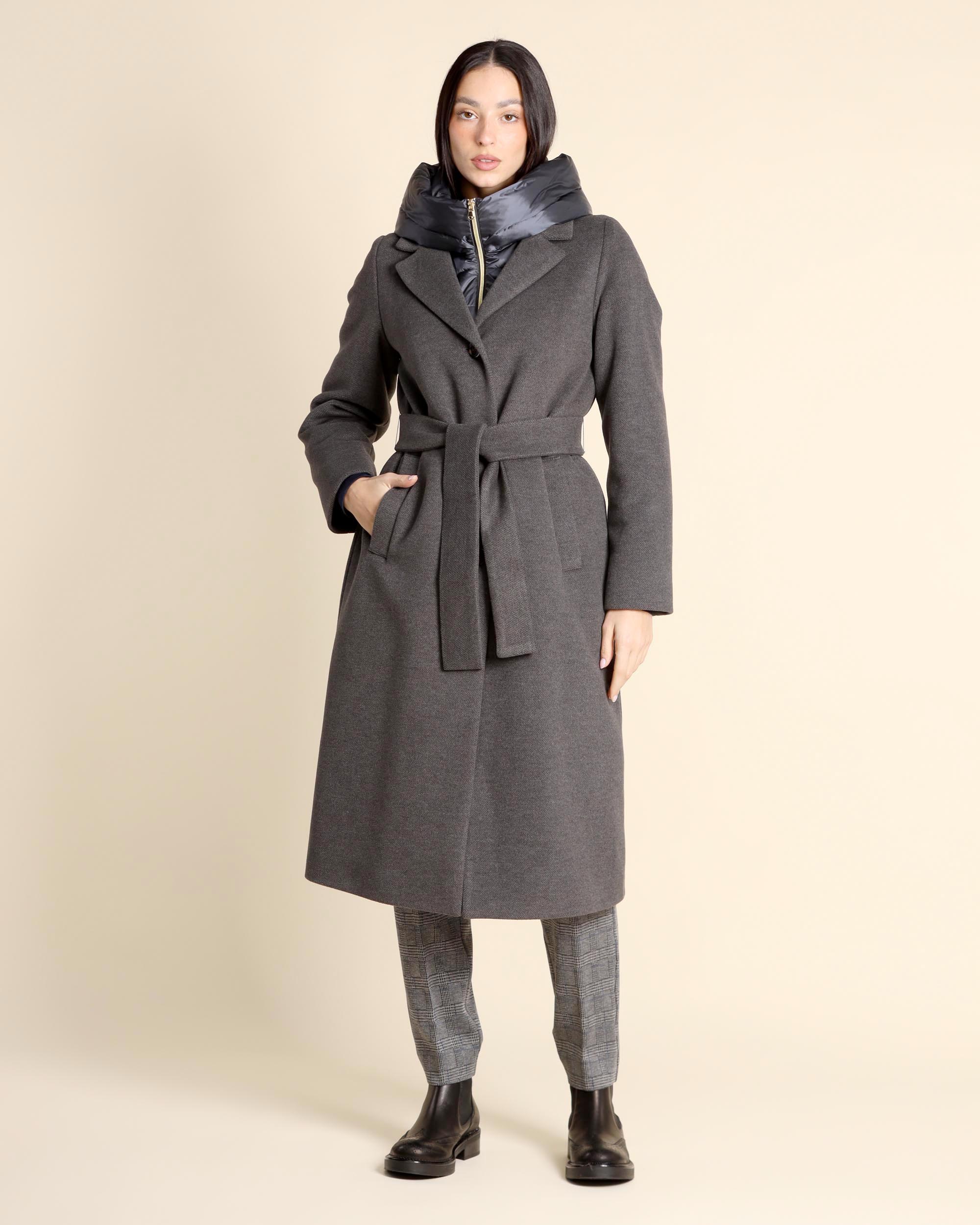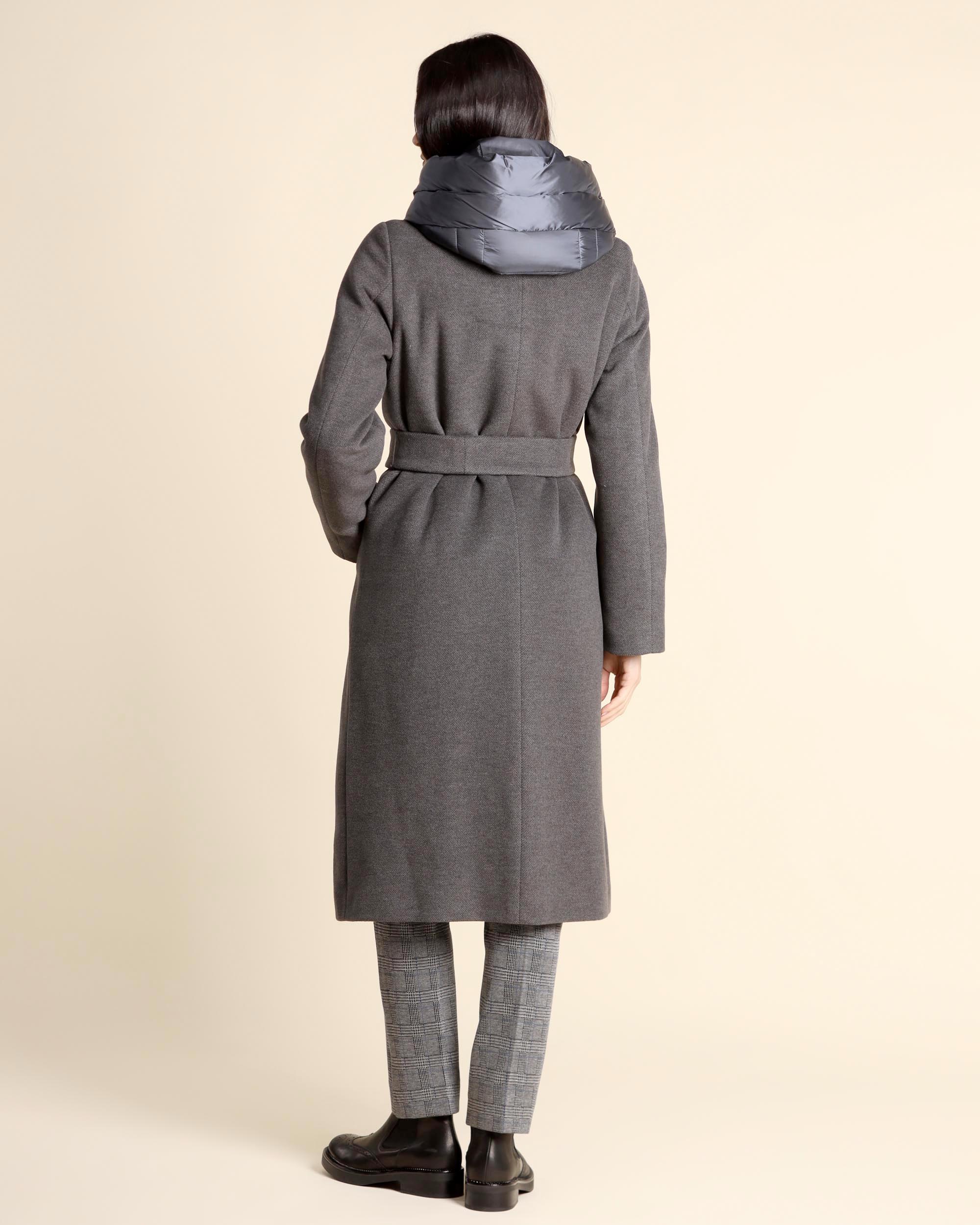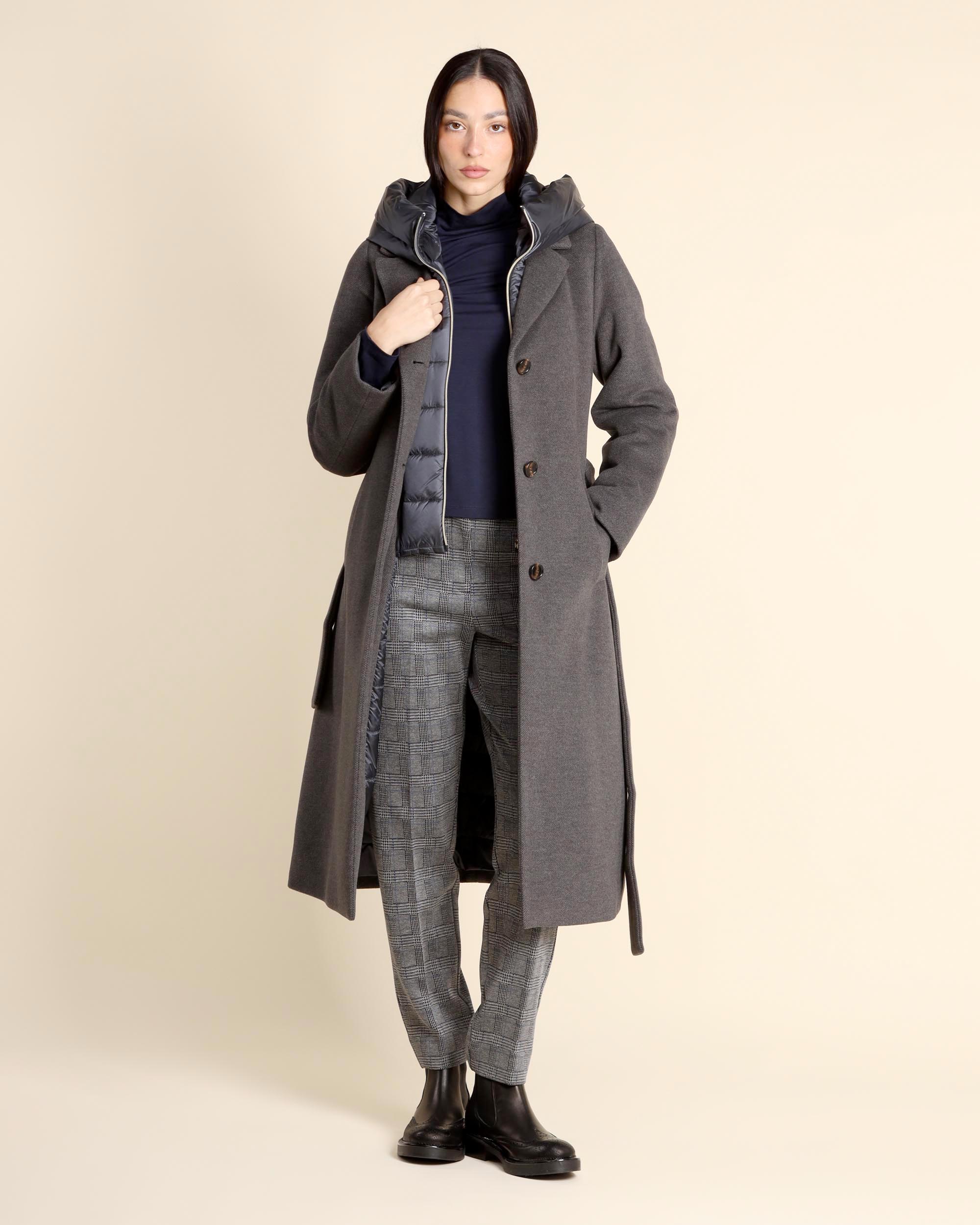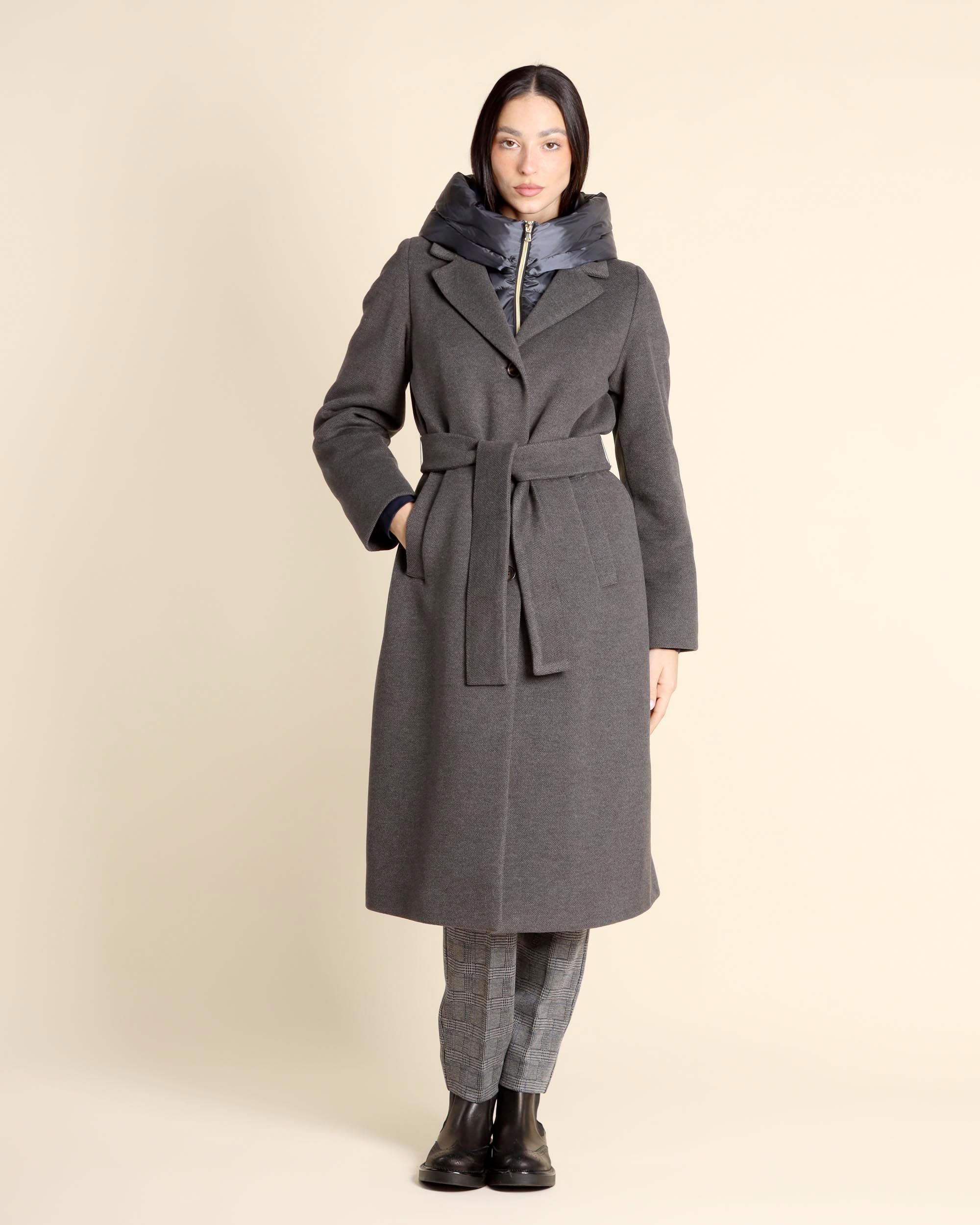 Cappotto imbottito grigio melange in panno soft, collo a revers, pettorina e cappuccio in tessuto tecnico antigoccia removibili, maniche lunghe, chiusura con bottoni e cintura coordinata, linea dritta, tasche a filetto, imbottitura in poliestere, la modella indossa una tg.40, la modella ha le seguenti misure: altezza 173, seno 86,vita 65, fianchi 93, collezione donna Emme by Marella Autunno Inverno 2025/26
