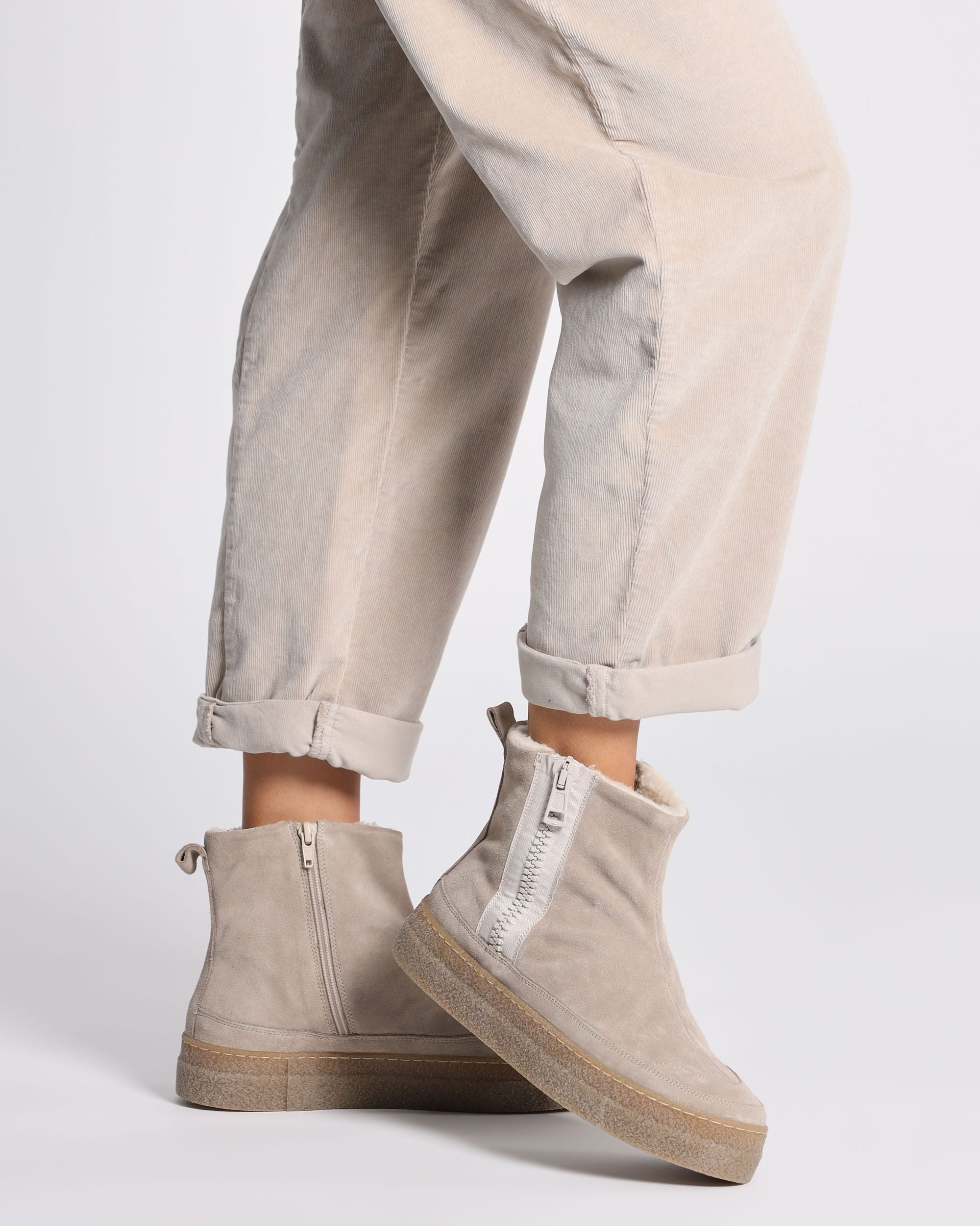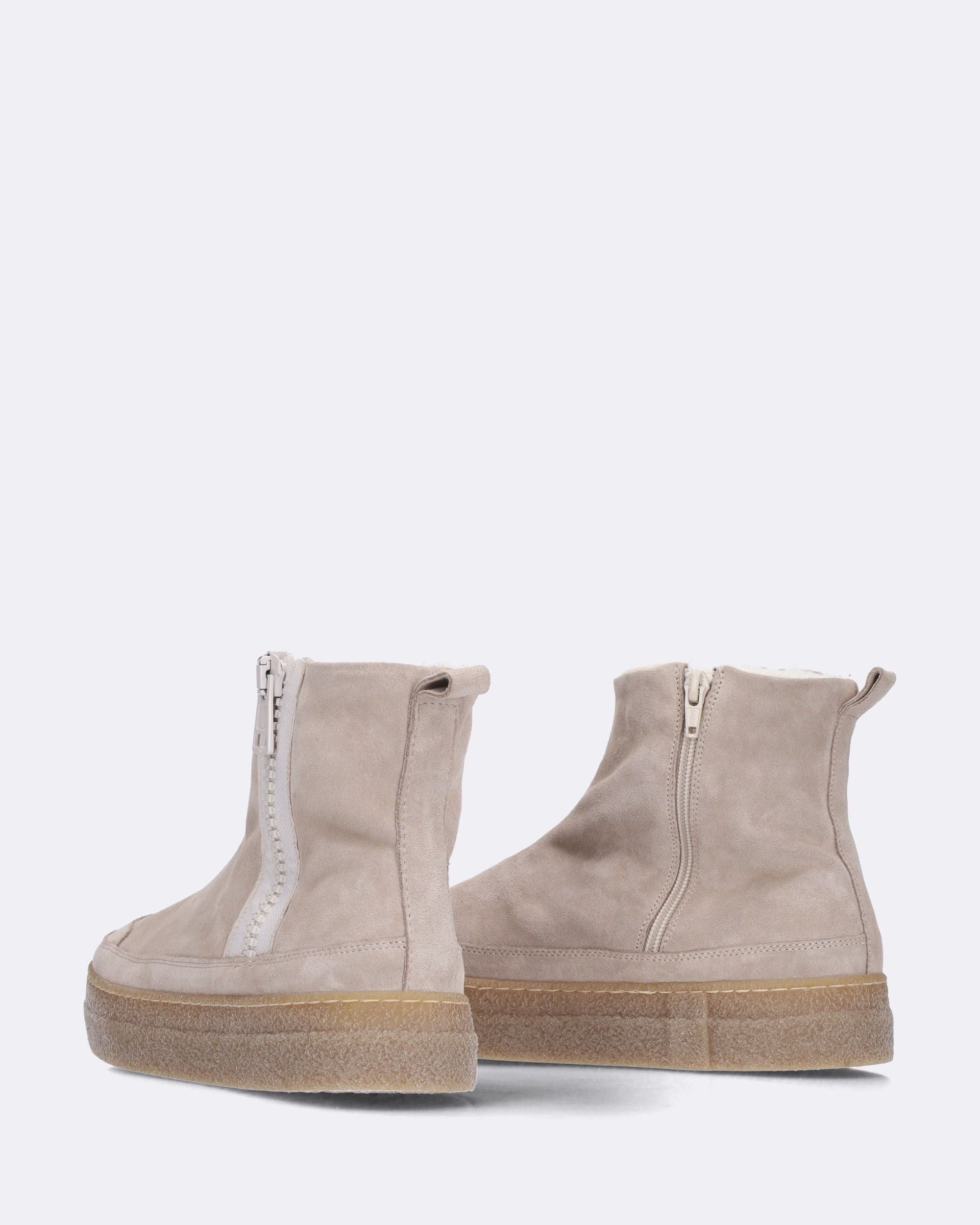 Stivaletti in suede colore sabbia, suola in gomma ultraleggera, chiusura laterale con zip, sottopiede in pelle estraibile, punta tonda, interno in ecomontone, dettaglio di zip laterale con soffietto, made in Italy, collezione donna Patgoa Autunno Inverno 2024/25