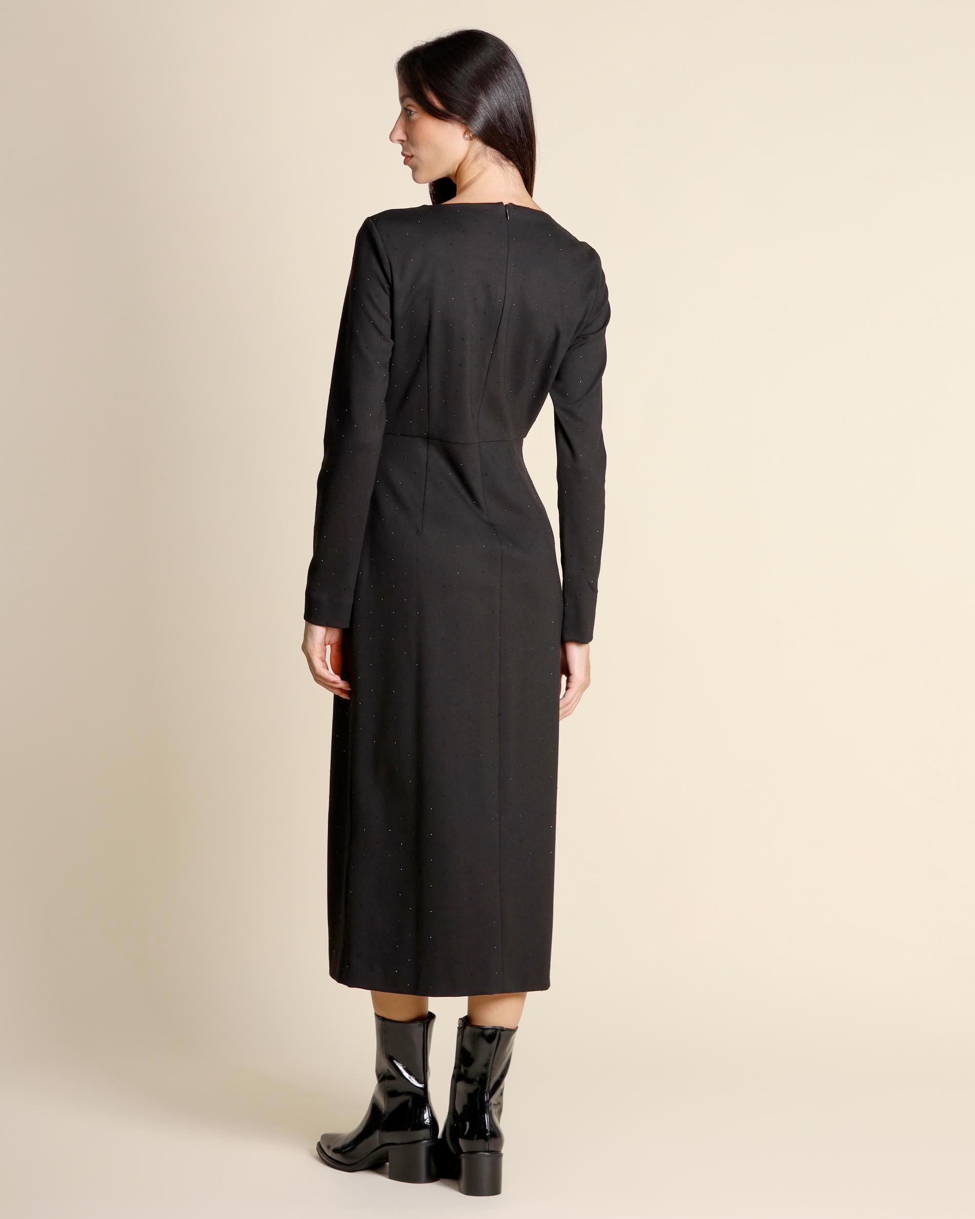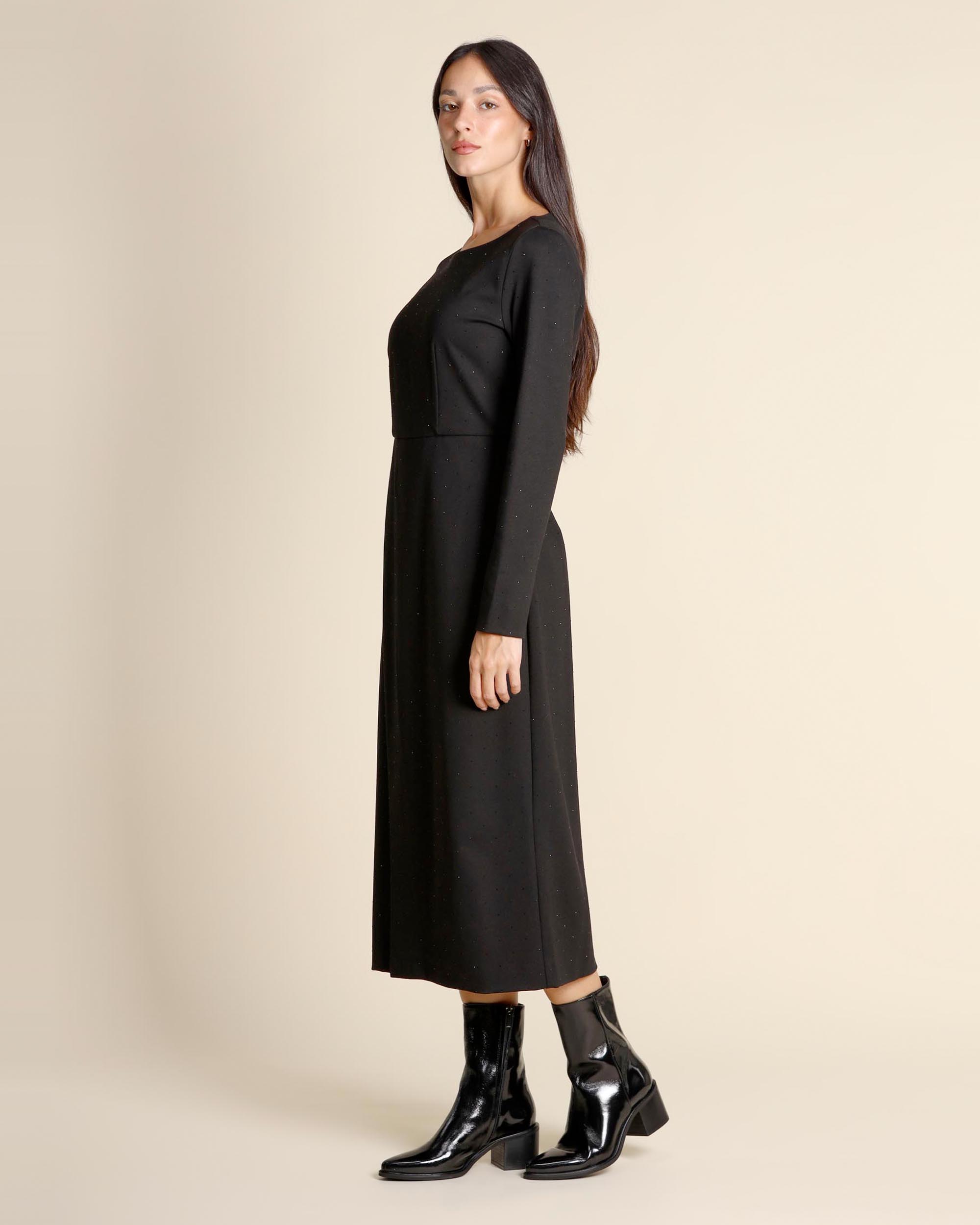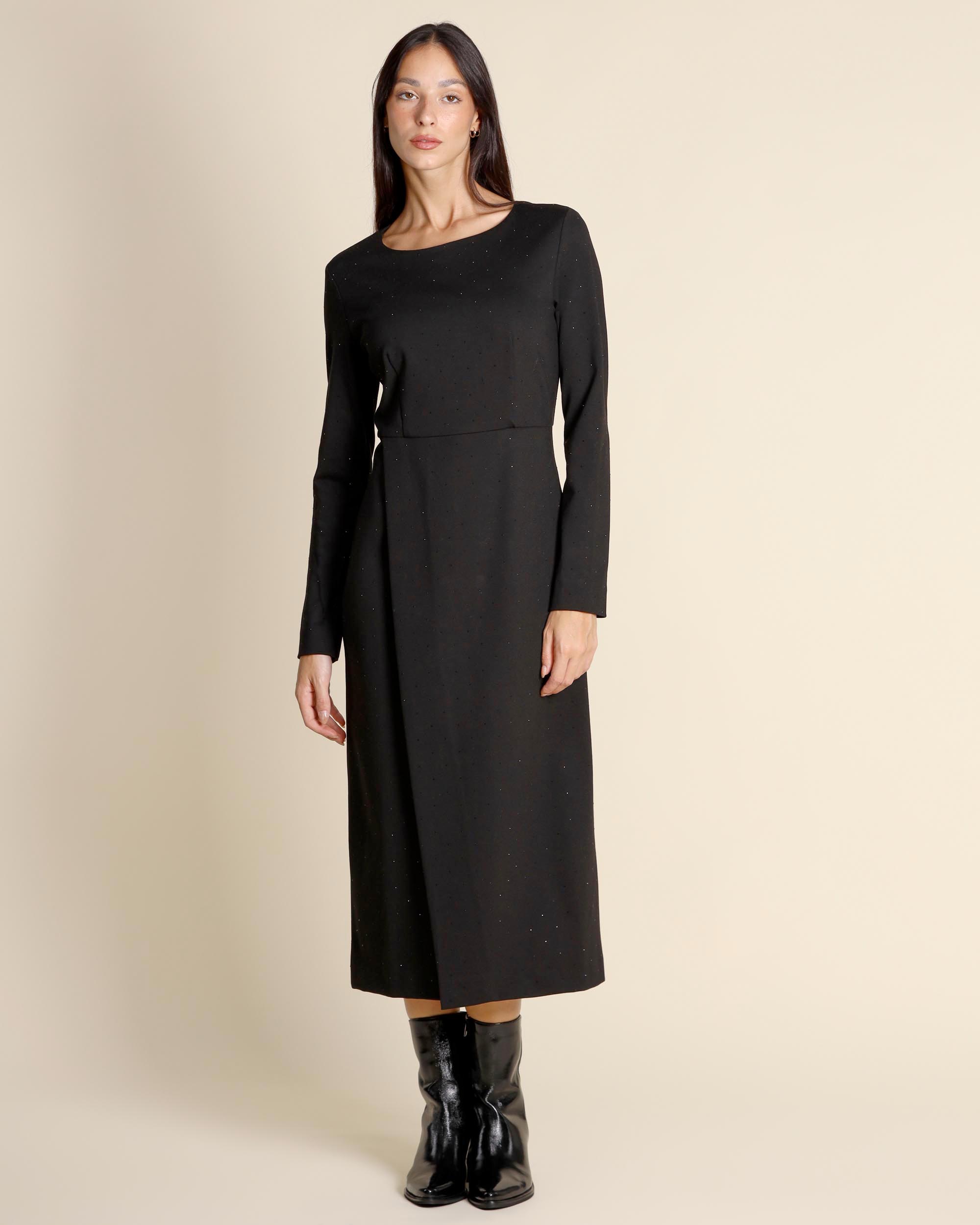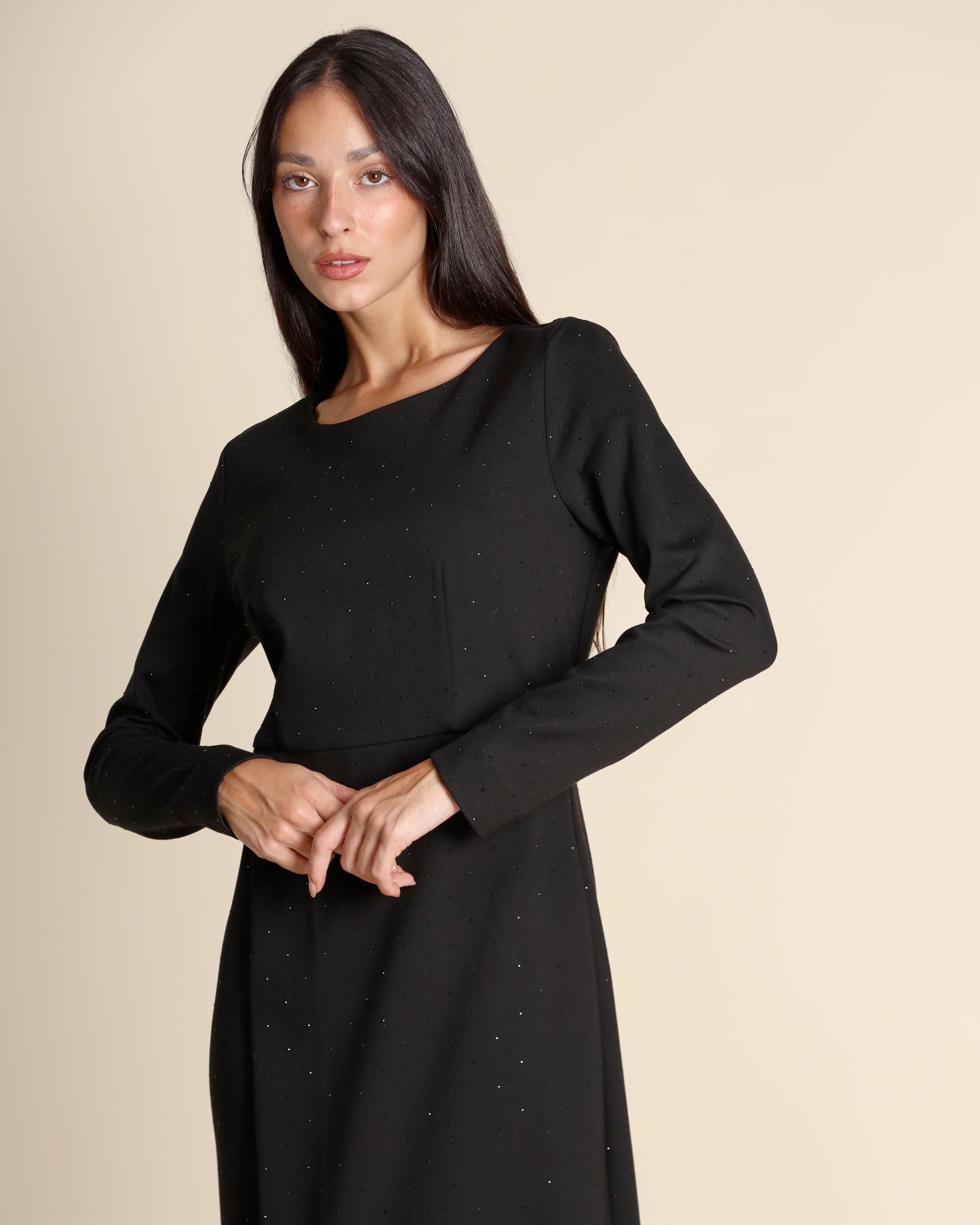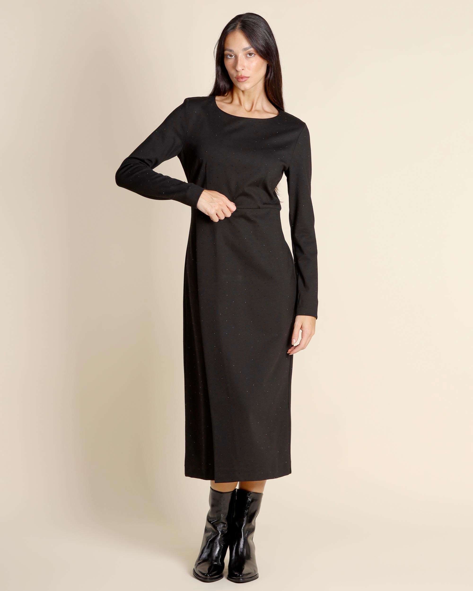 Abito nero in jersey stretch, scollo tondo, maniche lunghe, chiusura con zip invisibile sul dietro, taglio in vita con pannello sovrapposto sulla gonna, linea semiaderente, foderato nel busto, la modella indossa una tg.42, la modella ha le seguenti misure: altezza 173, seno 86,vita 65, fianchi 93, collezione donna Emme by Marella Autunno Inverno 2025/26