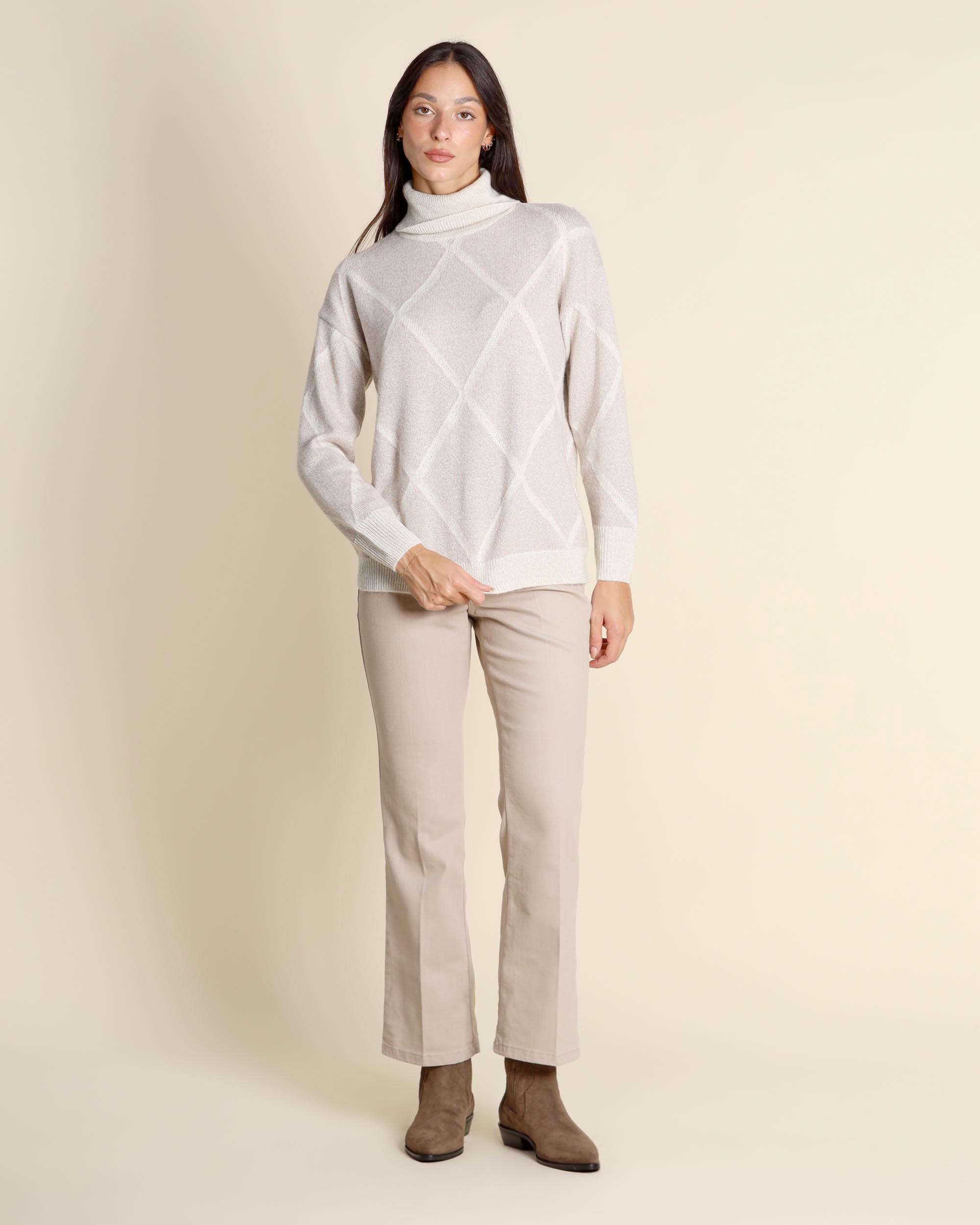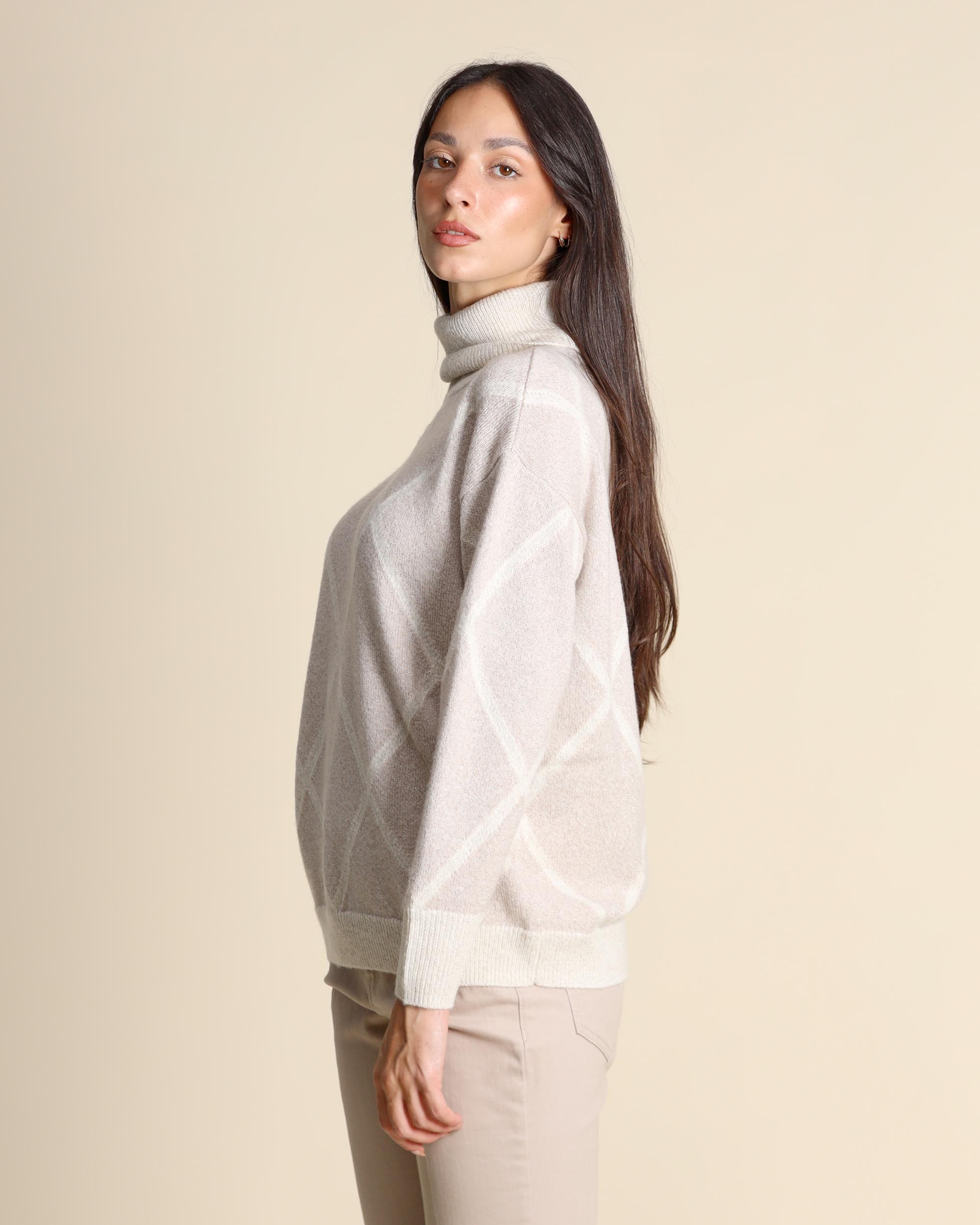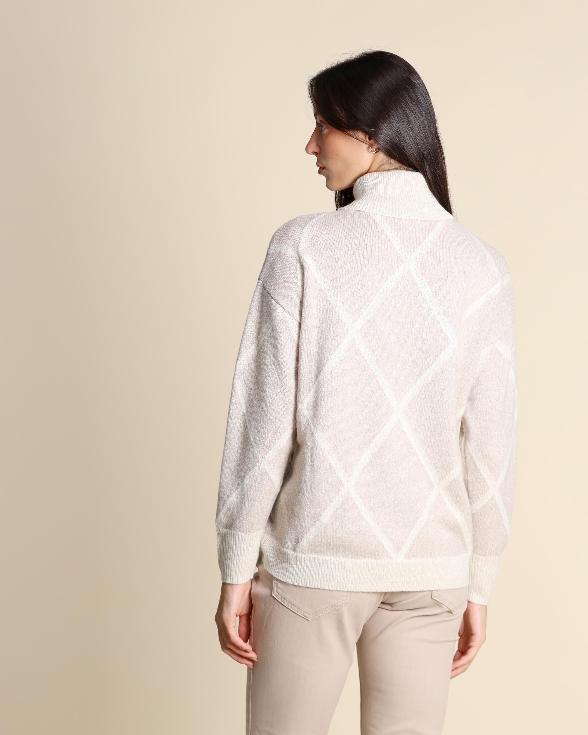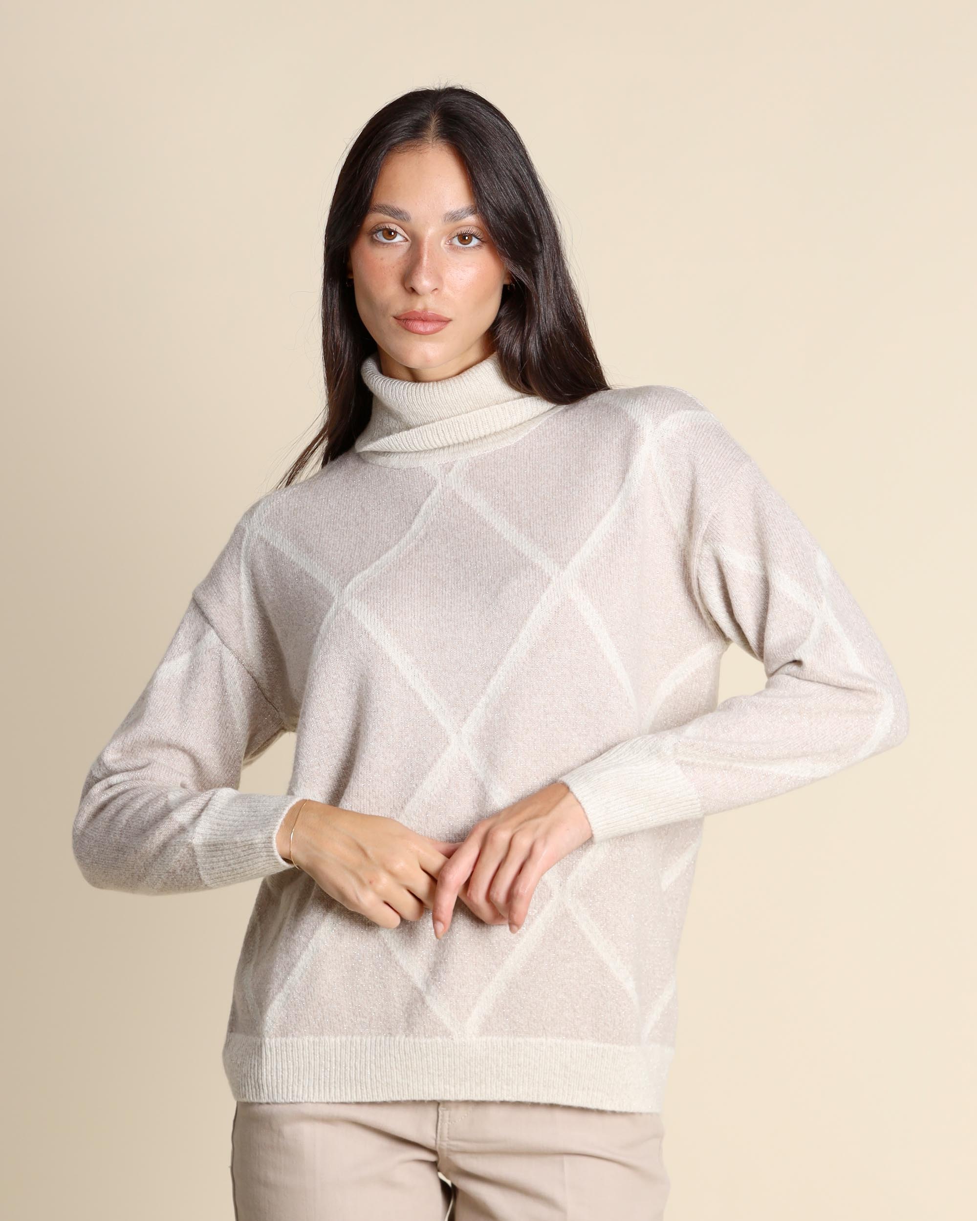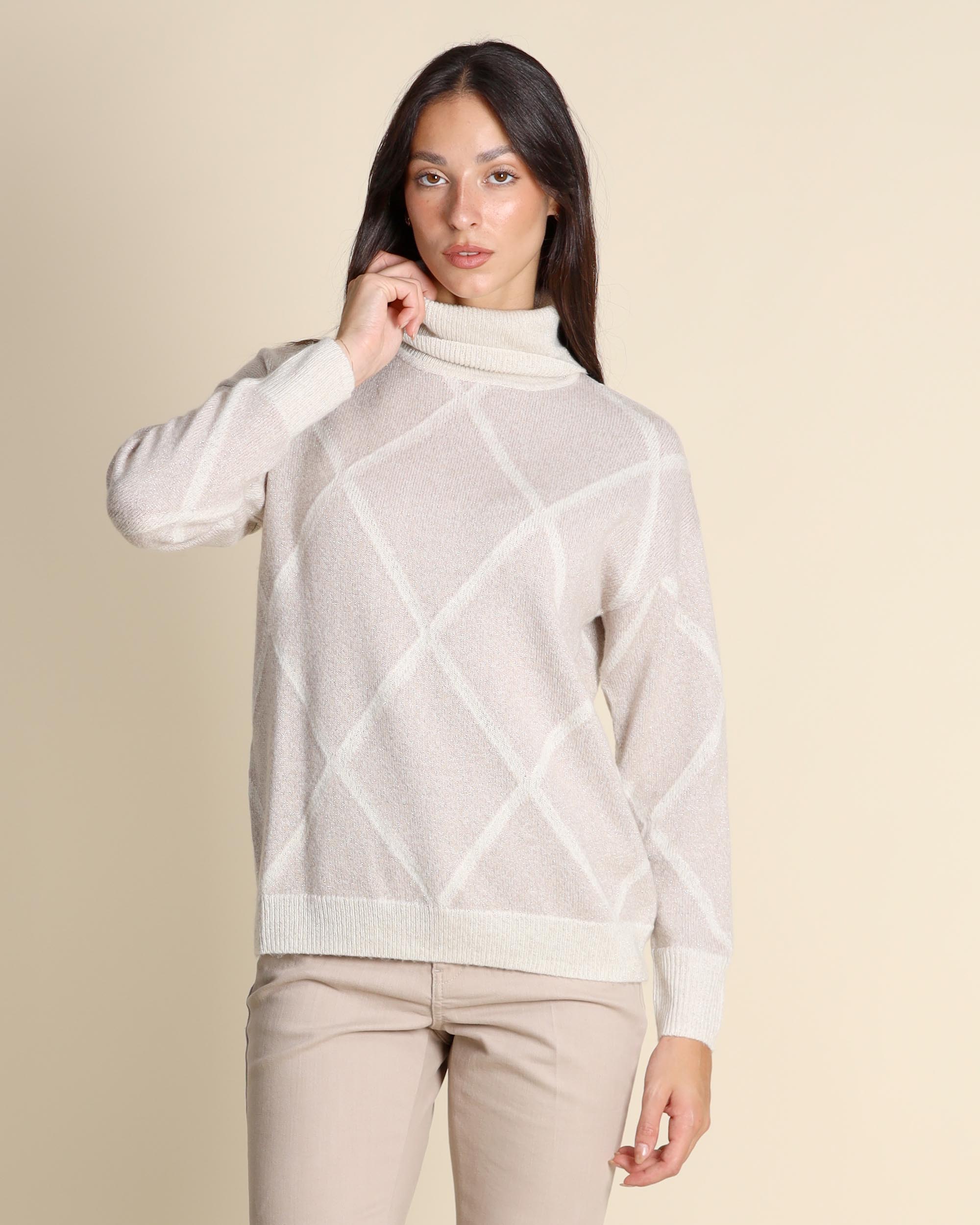 Maglia dolcevita a rombi in misto lana con lurex in tinta, collo alto, maniche lunghe, linea ampia, la modella indossa una tg.S, la modella ha le seguenti misure: altezza 177, seno 87, vita 65, fianchi 93, collezione donna Emme by Marella Autunno Inverno 2025/26