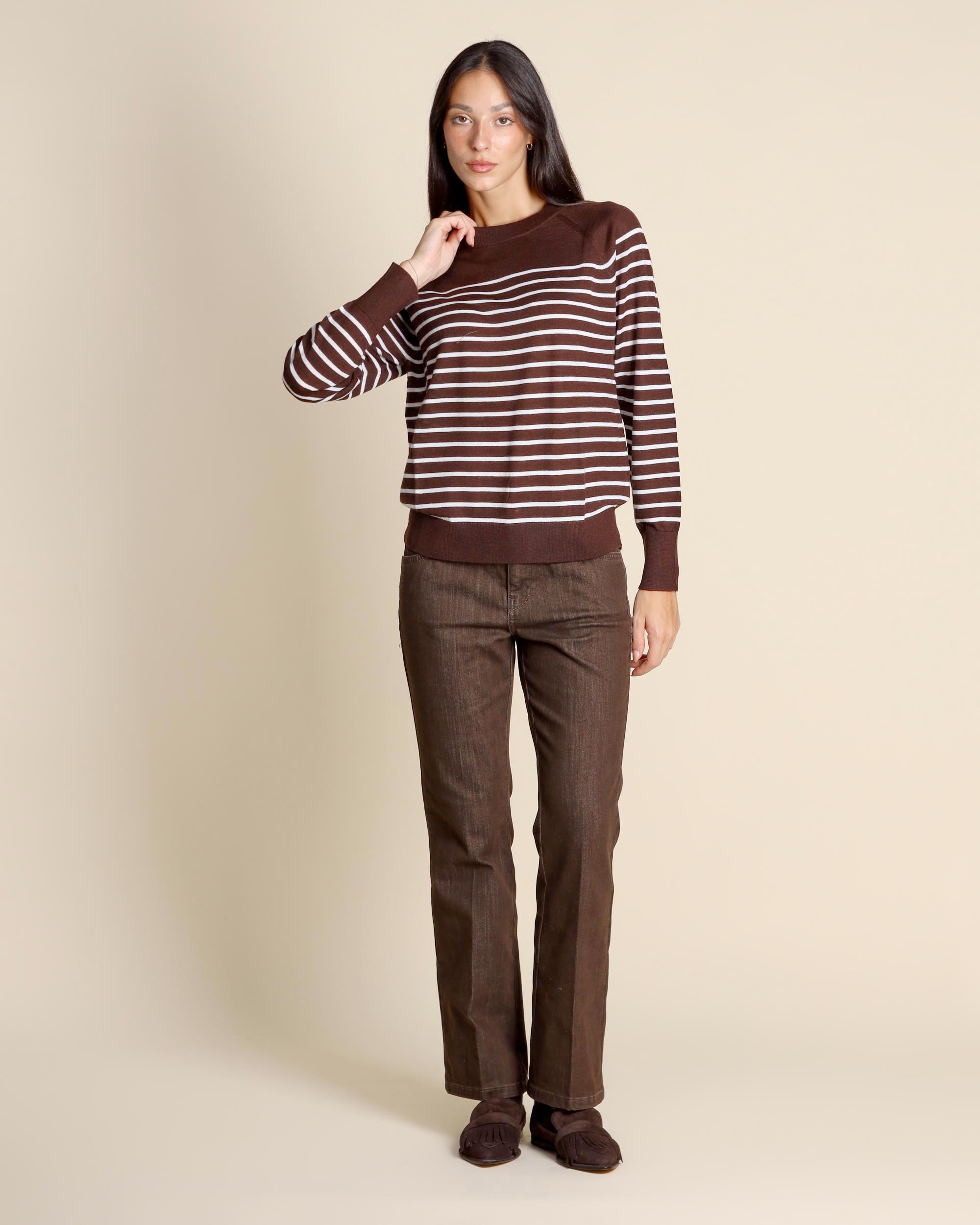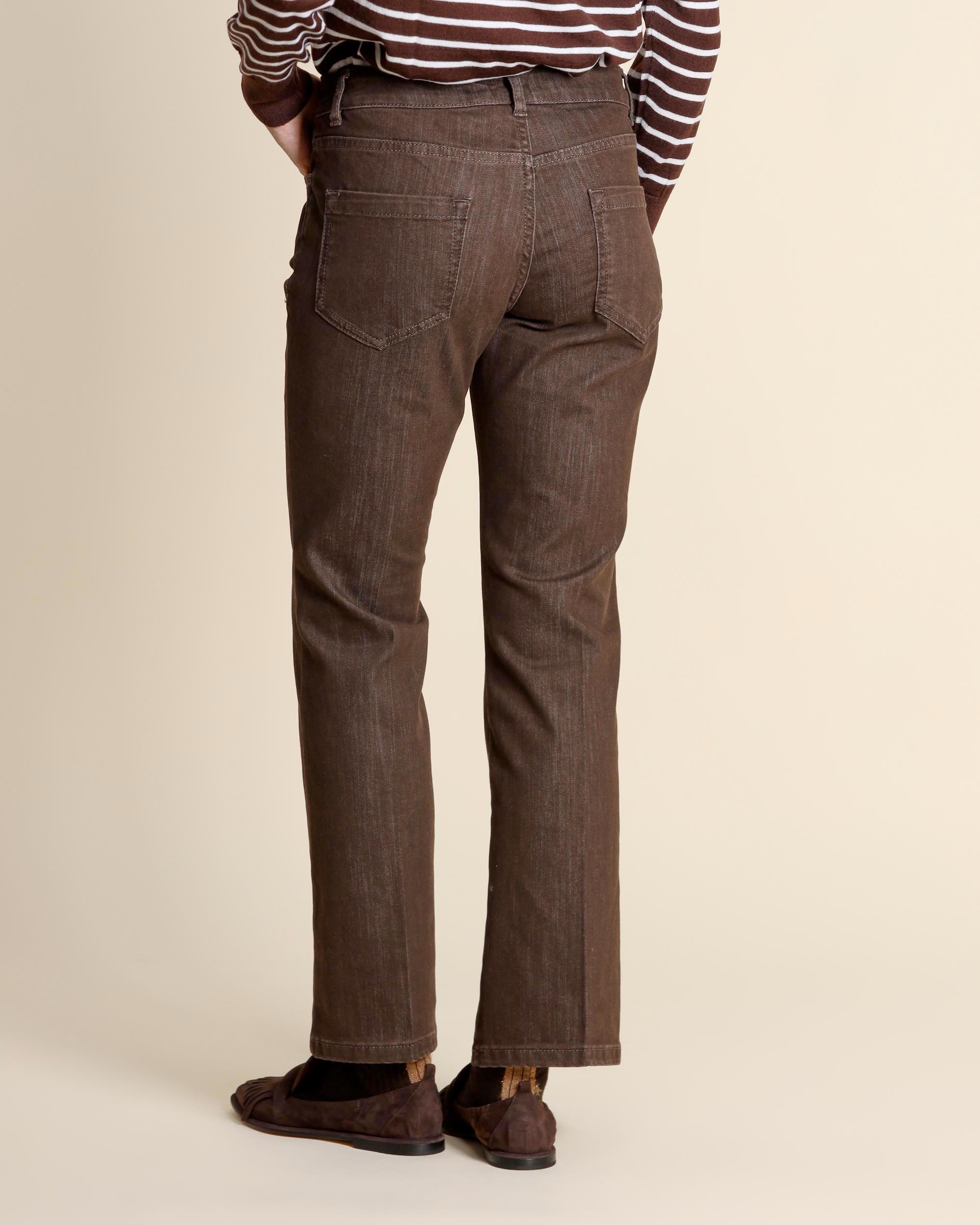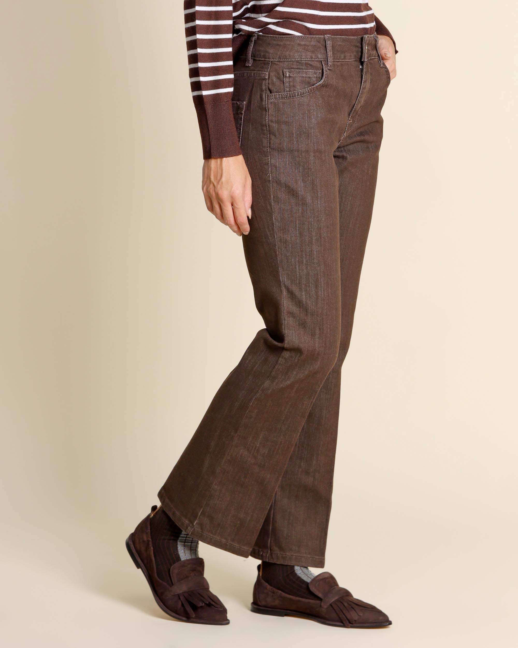 Pantaloni testa moro in bull di cotone e tencel, chiusura con bottone a chiodo personalizzato e zip nascosta, cinque tasche, linea dritta con gamba ampia, la modella indossa una tg.42, la modella ha le seguenti misure: altezza 173, seno 86,vita 65, fianchi 93, collezione donna Emme by Marella Autunno Inverno 2025/26