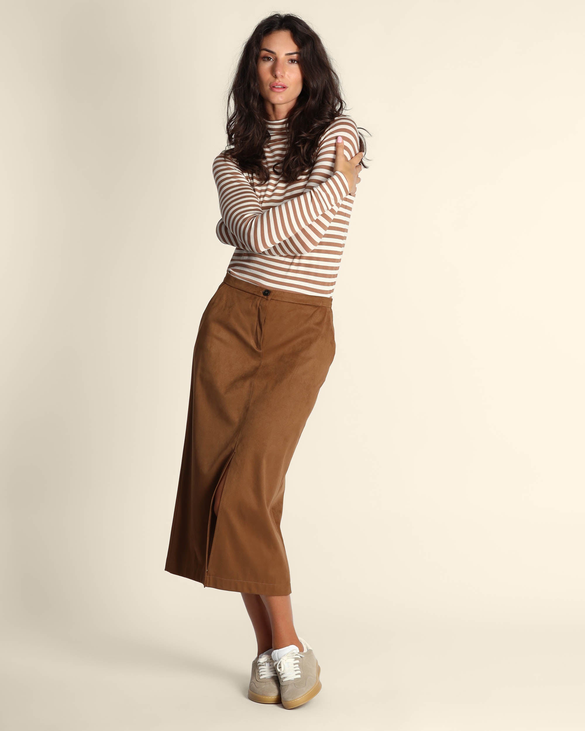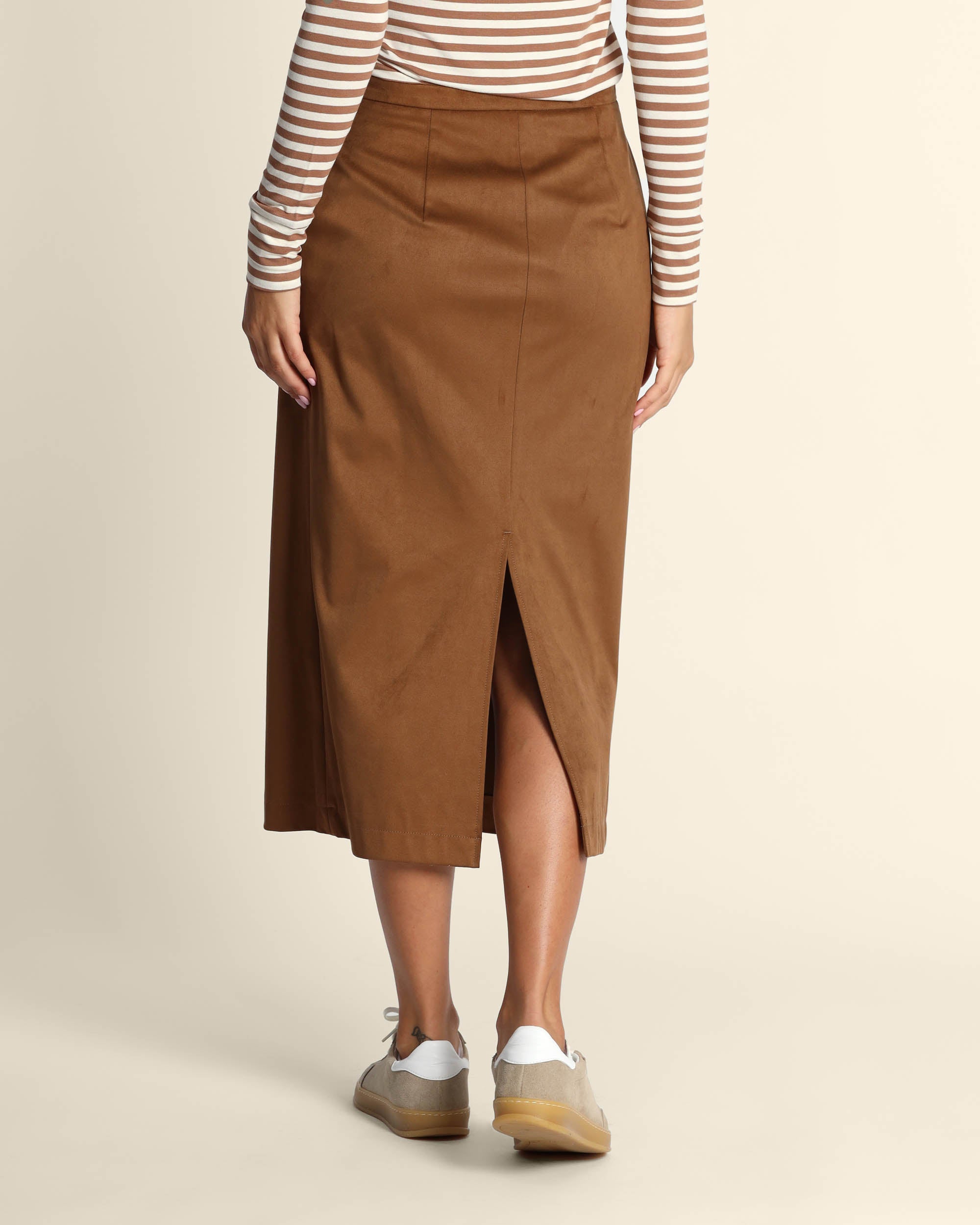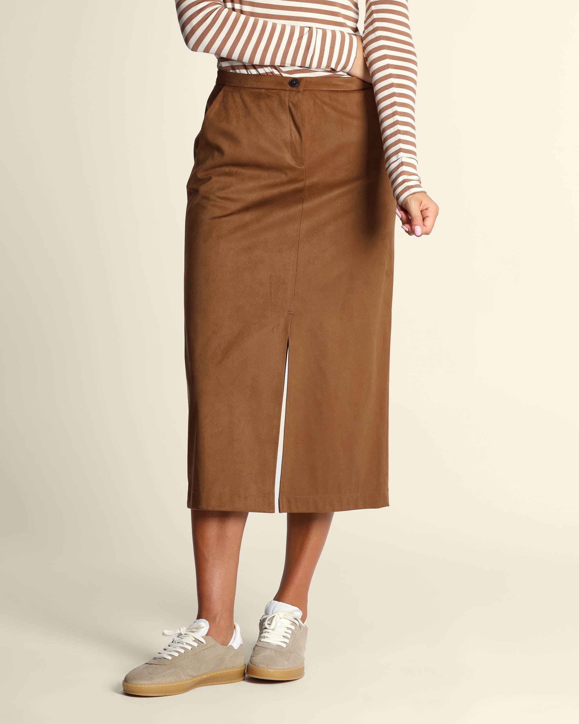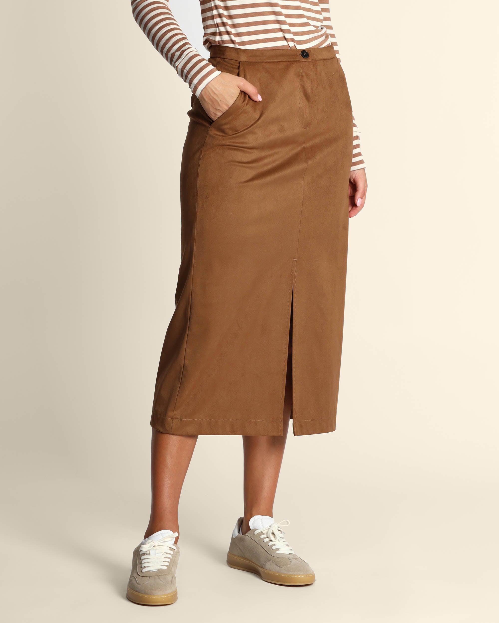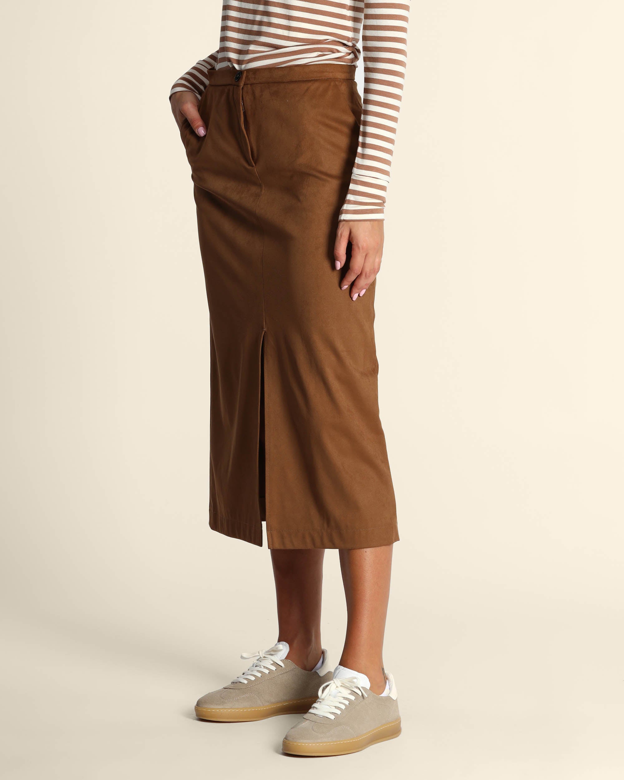 Gonna midi color cuoio in tessuto effetto scamosciato, chiusura con bottone e zip nascosta, tasche alla francese, linea dritta, spacco centrale davanti e dietro, sfoderata, la modella indossa una tg.42, la modella ha le seguenti misure: altezza 178, seno 86,vita 65, fianchi 93, collezione donna Emme by Marella Autunno Inverno 2025/26