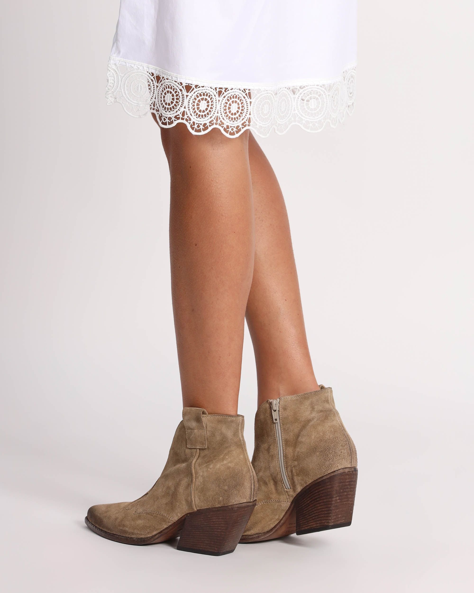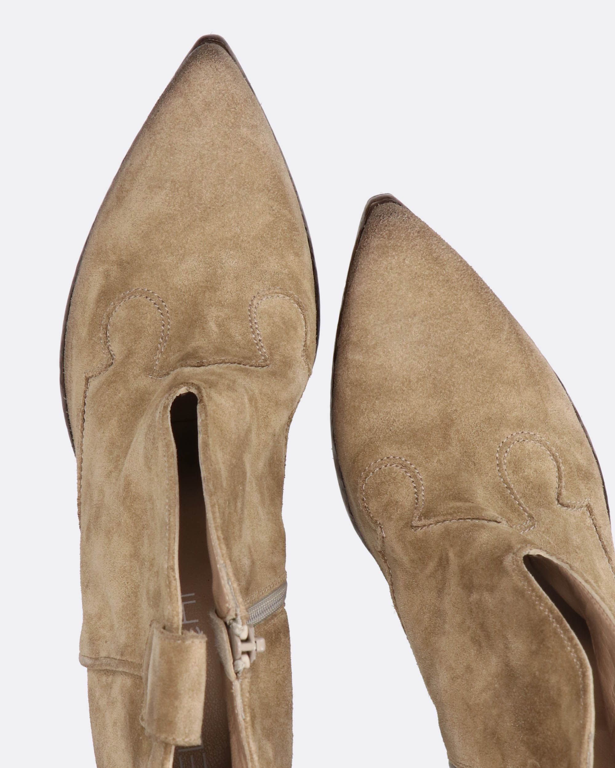 Tronchetti texani in velour vintage color corda, tacco 70mm, scollatura a V sul collo del piede, orlature decorative, sottopiede in pelle, suola in cuoio, chiusura con zip laterale, made in Italy, collezione donna Elena Iachi by Strategia Primavera estate 2025