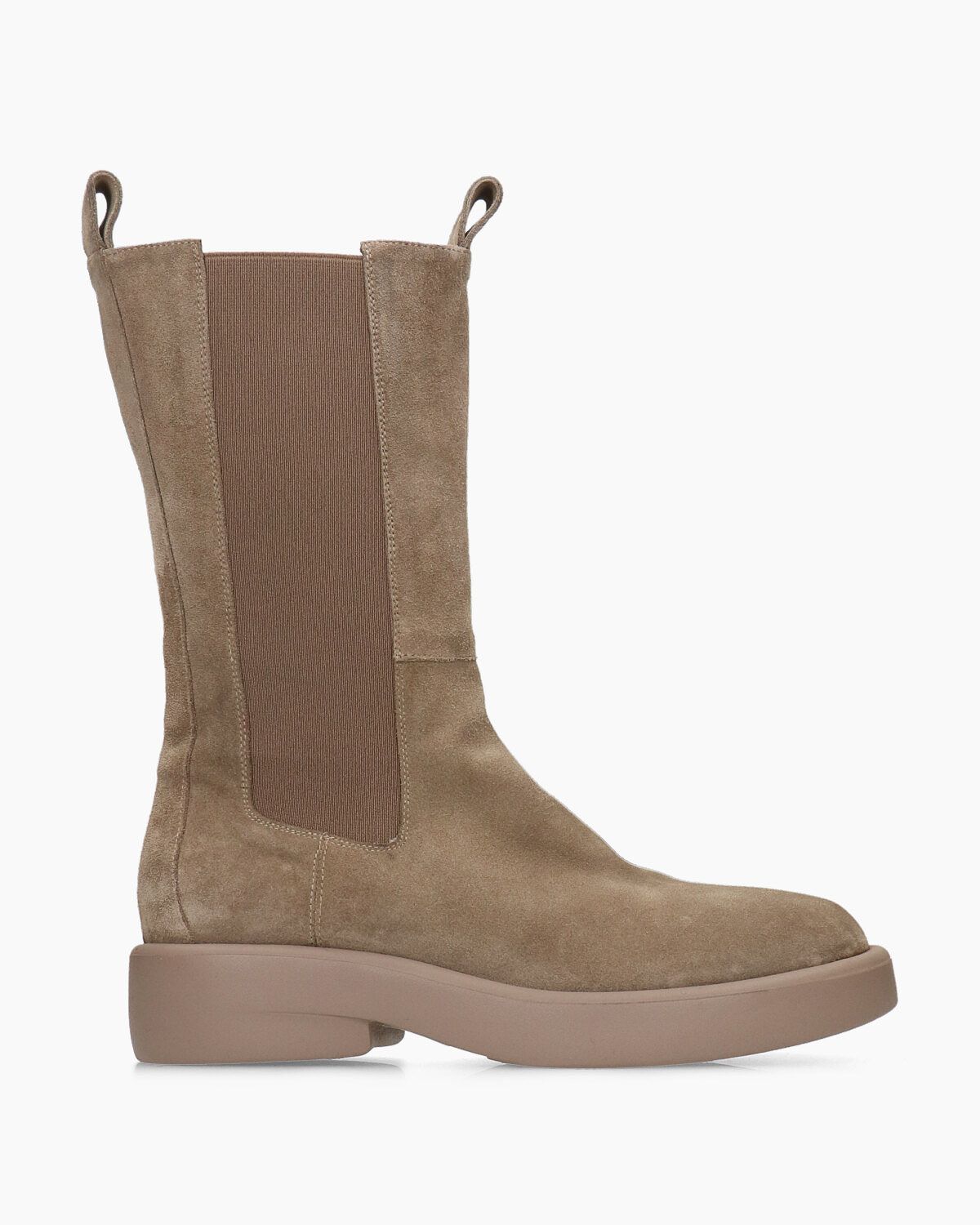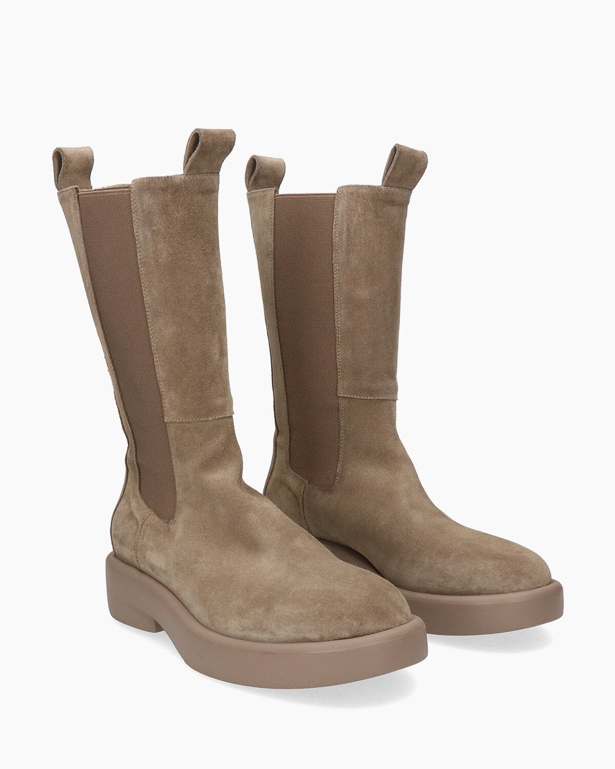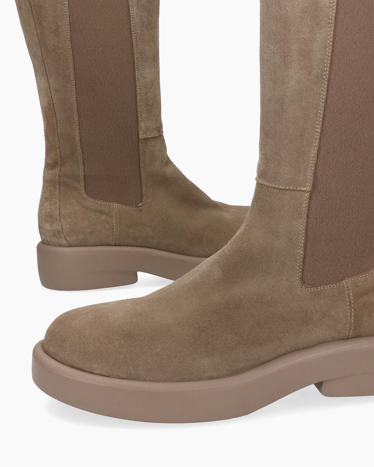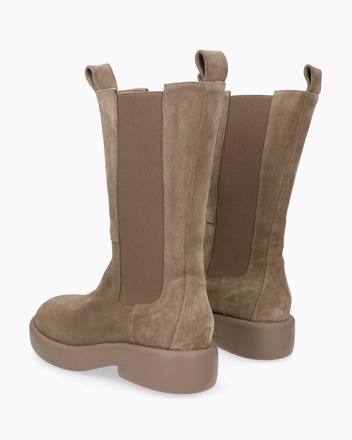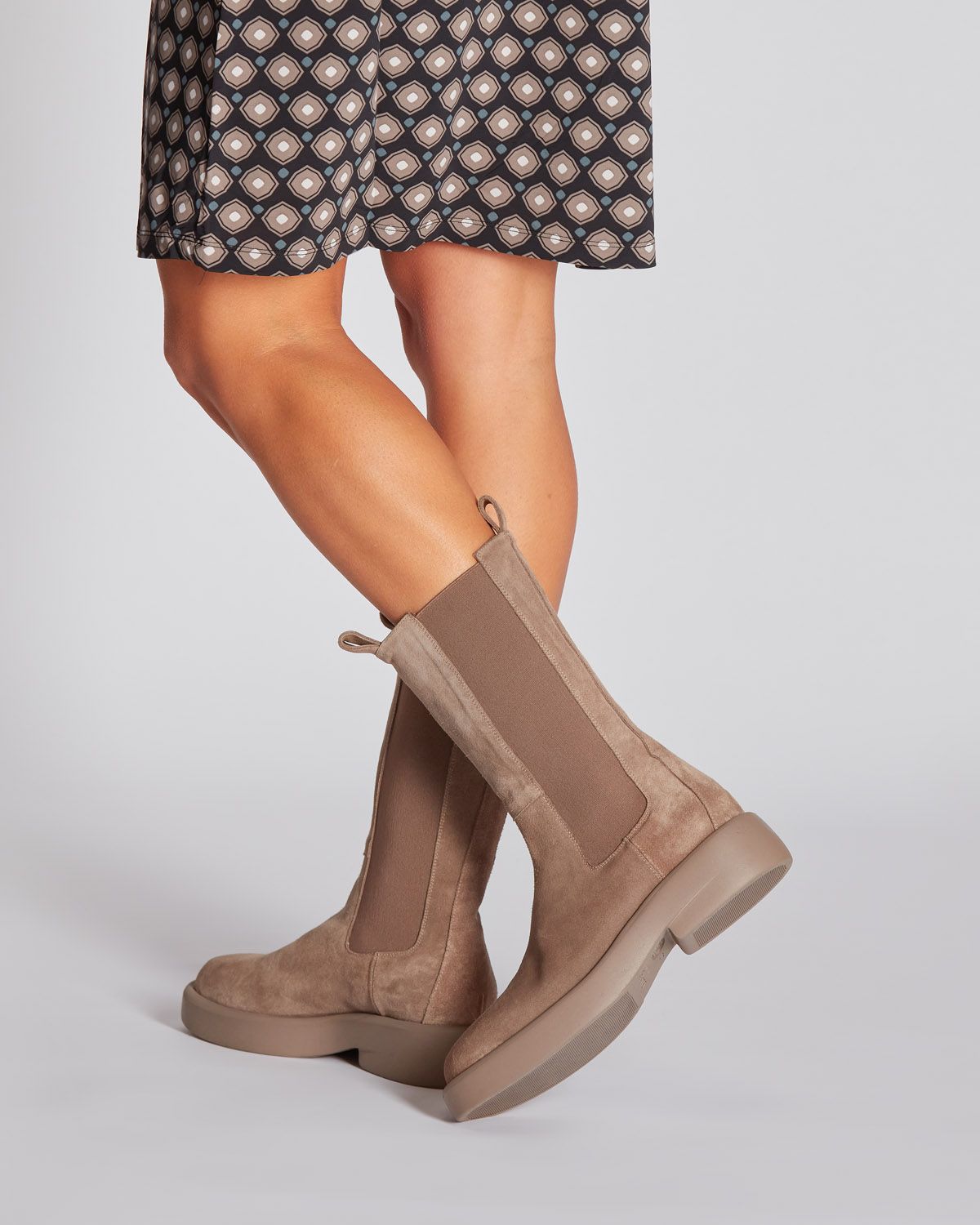Stivaletti alti in camoscio tortora, suola in gomma ultralight 20mm, tacco 40mm, fodera in pelle, punta tonda, elastici laterali in tinta, soletta in pelle, tiranti in pelle frontali e sul retro, made in Italy, collezione donna Elena Iachi Autunno Inverno 2021/22