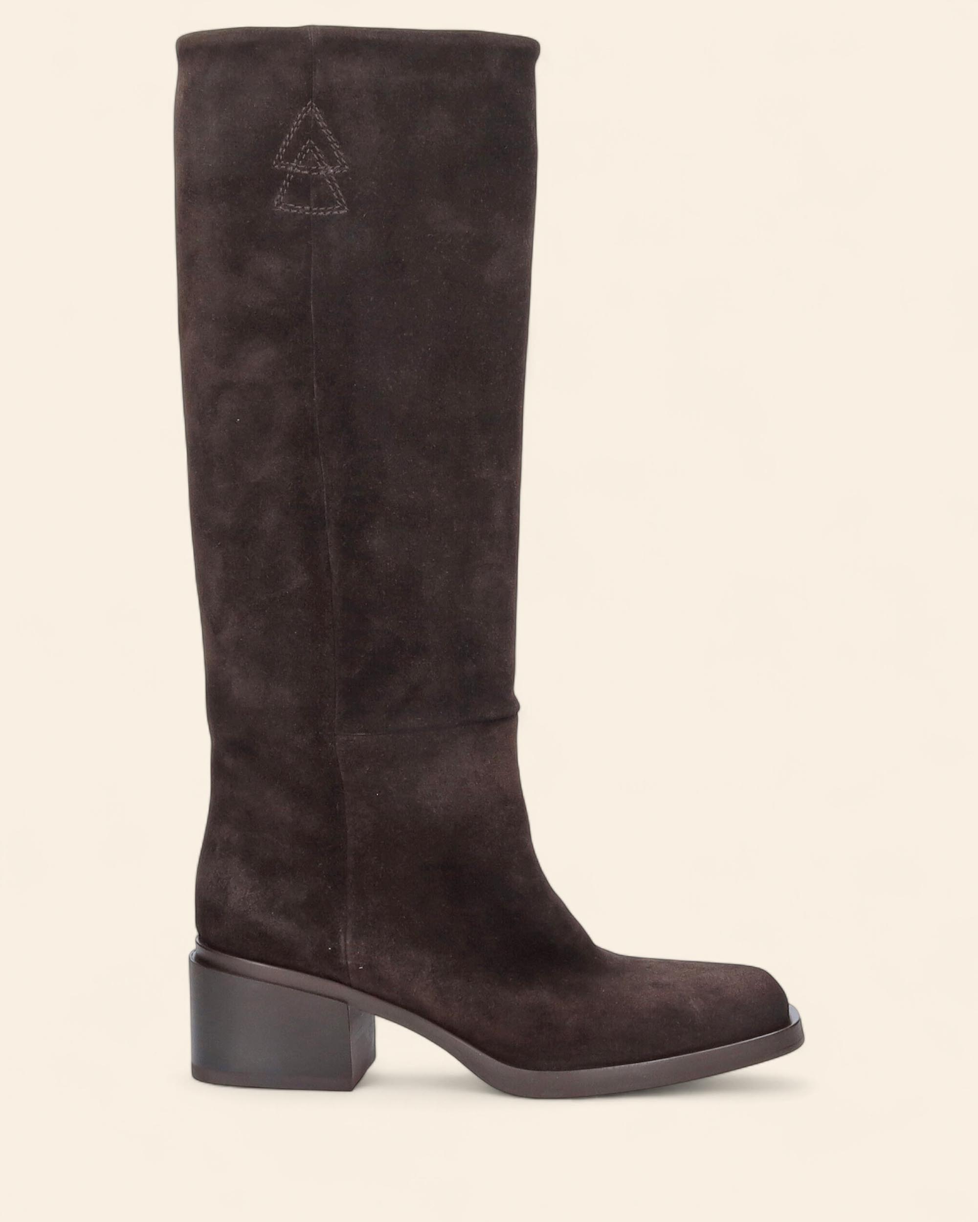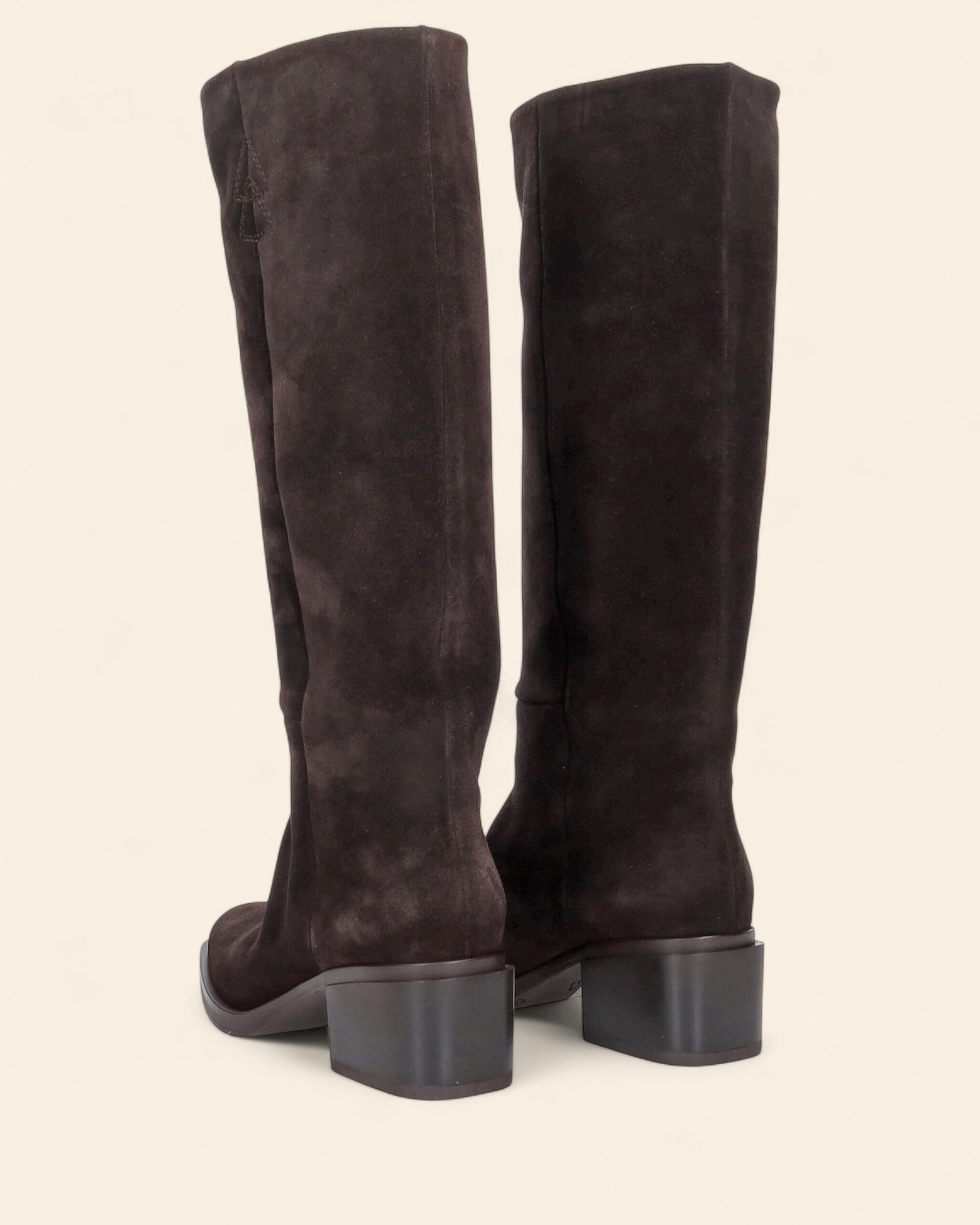 Stivali in velour vintage color testa di moro, tacco 60mm, fodera in pelle, sottopiede in pelle, suola in gomma, punta quadrata, made in Italy, collezione donna Elena Iachi by Strategia Autunno inverno 2025/2026