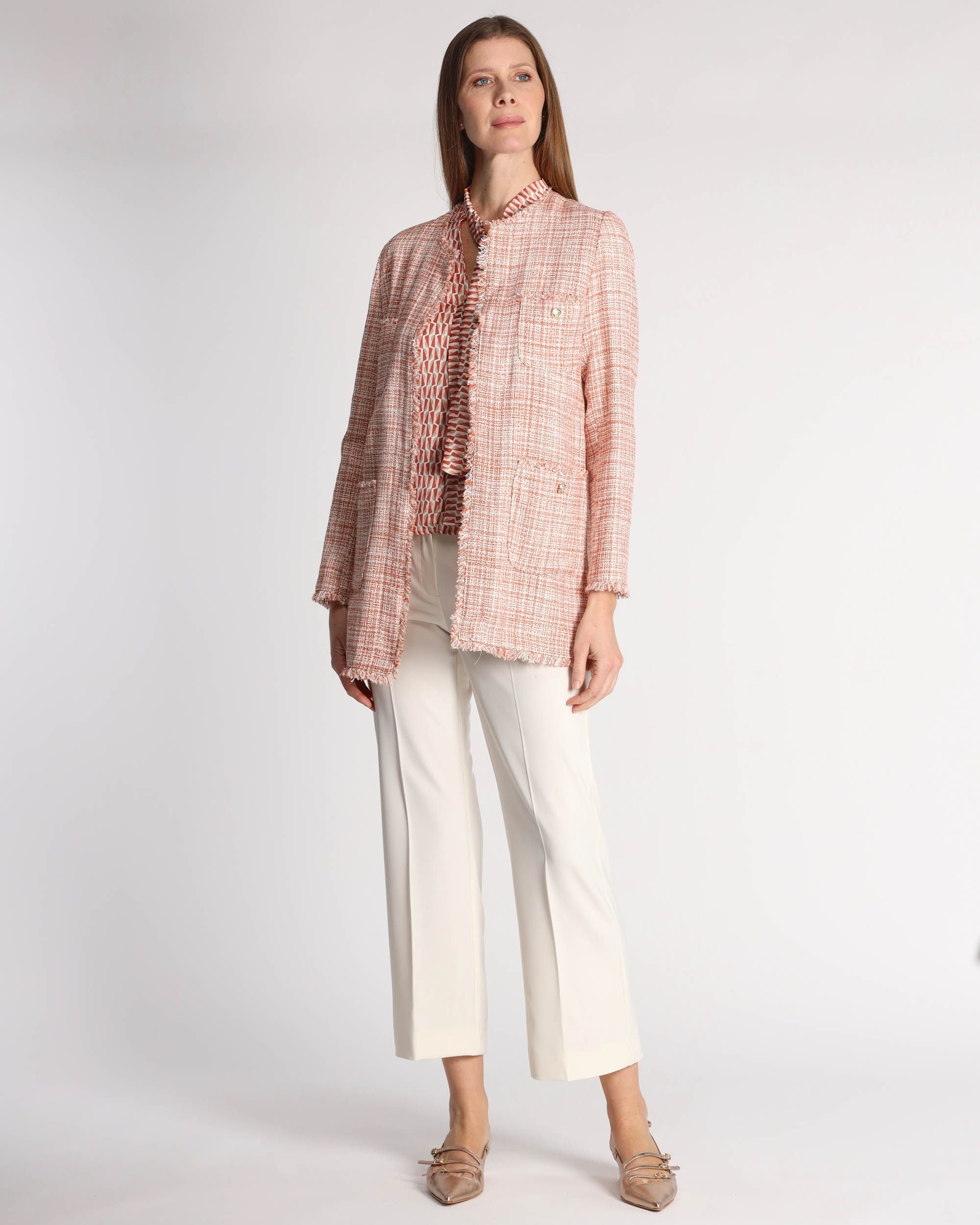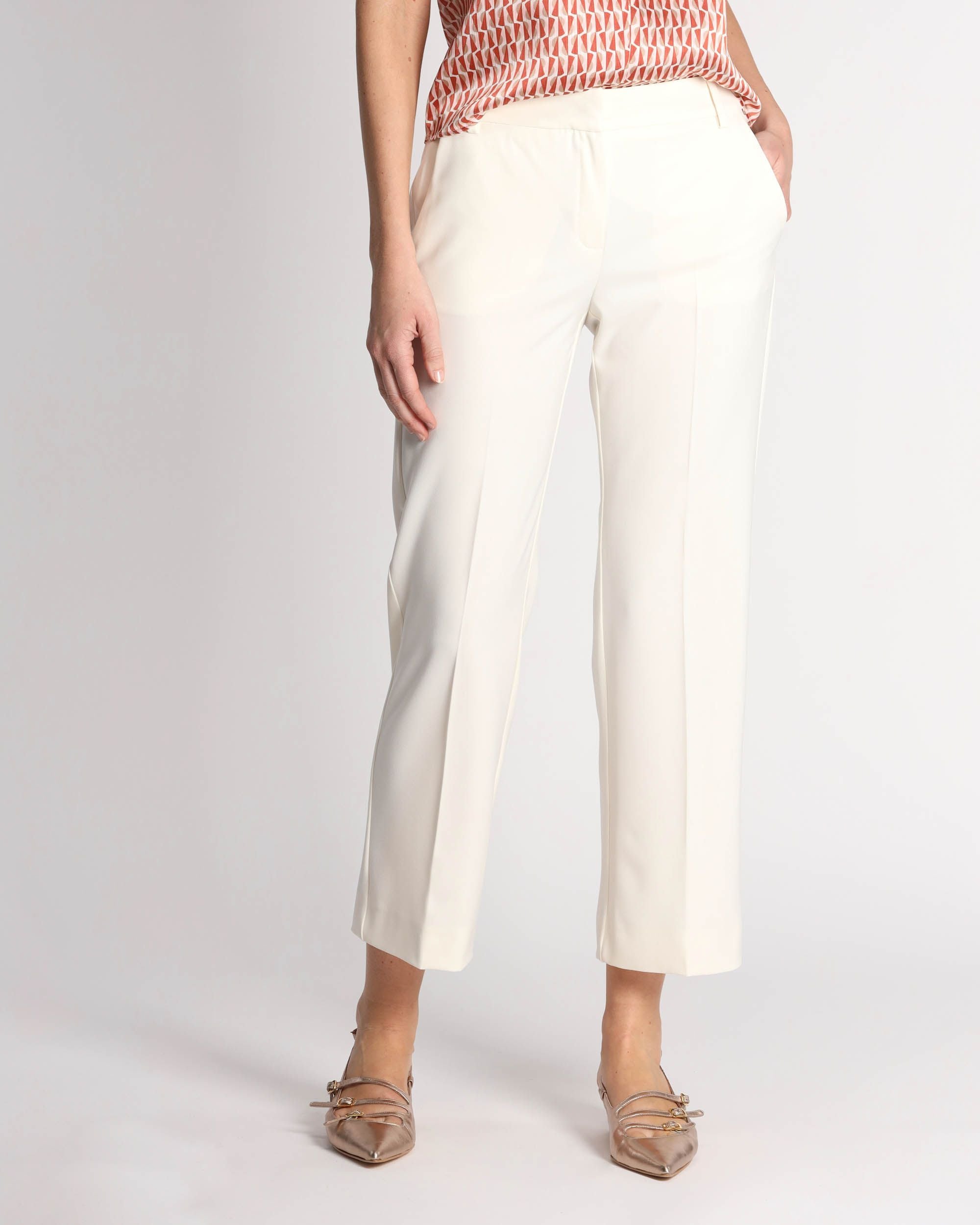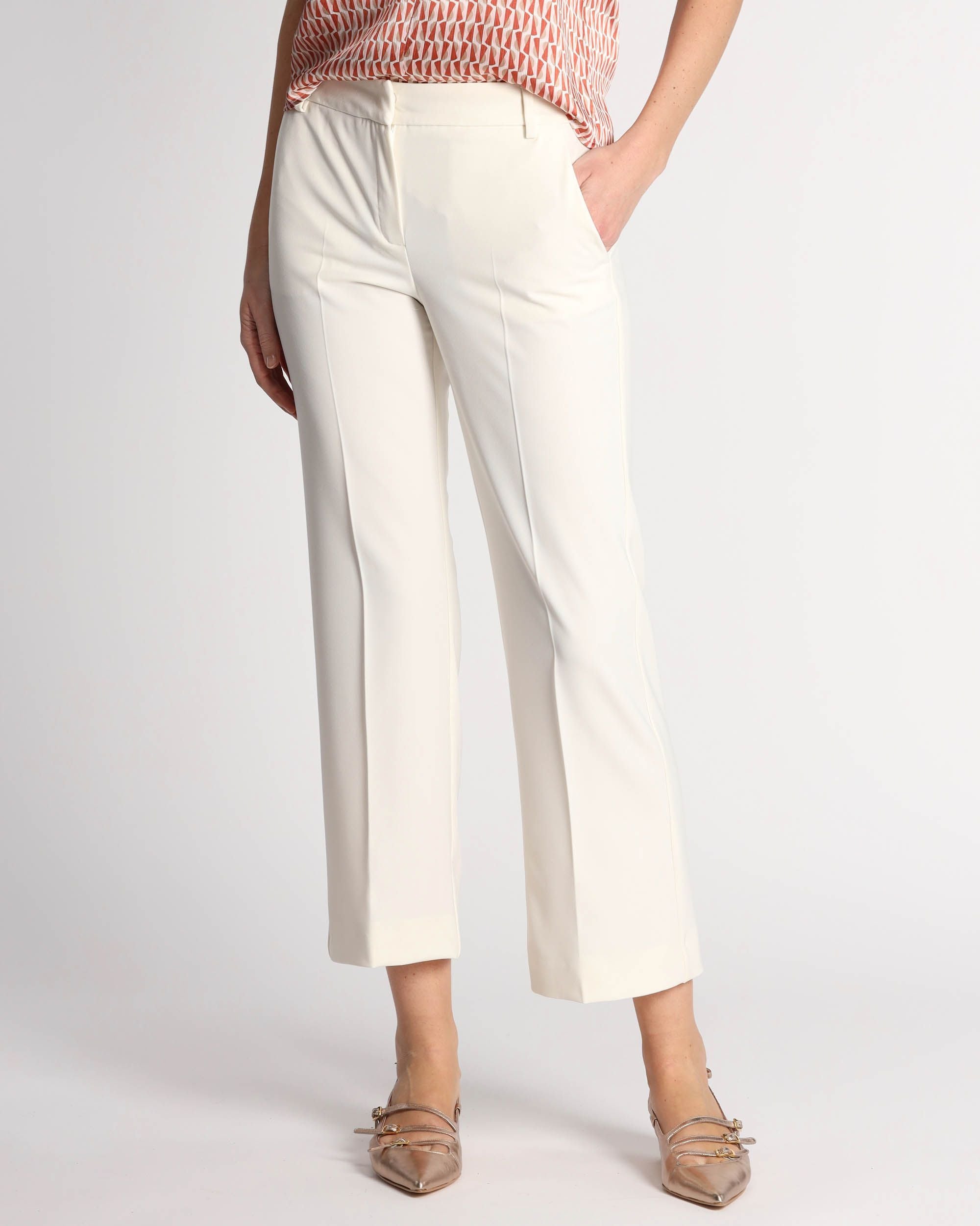 Pantaloni color burro in tessuto stretch, chiusura con bottone automatico e zip nascosta, tasche alla francese, linea flare, piega stirata davanti e dietro, la modella indossa una tg.42, la modella ha le seguenti misure: altezza 178, seno 86,vita 65, fianchi 93, collezione donna Emme by Marella Primavera Estate 2025