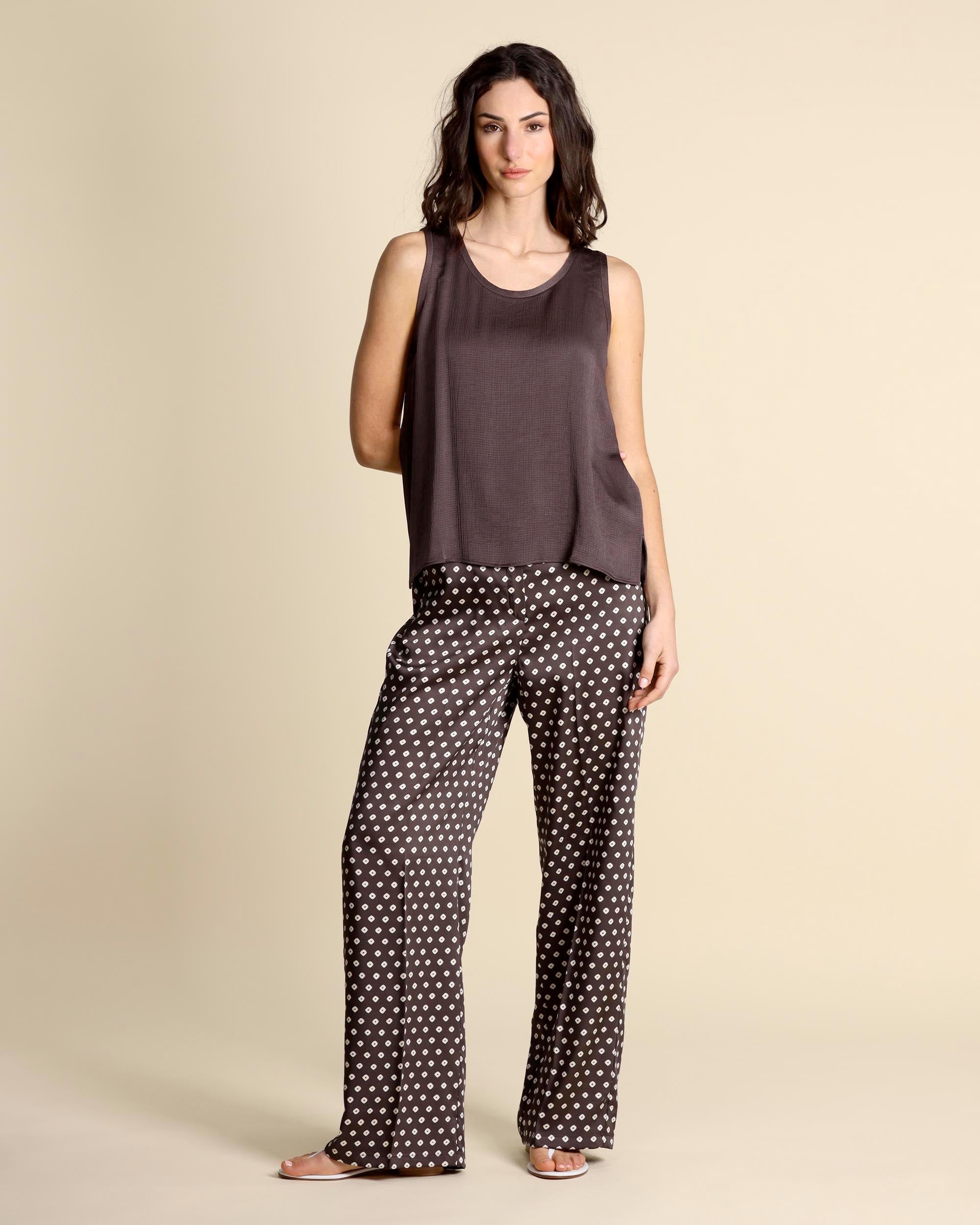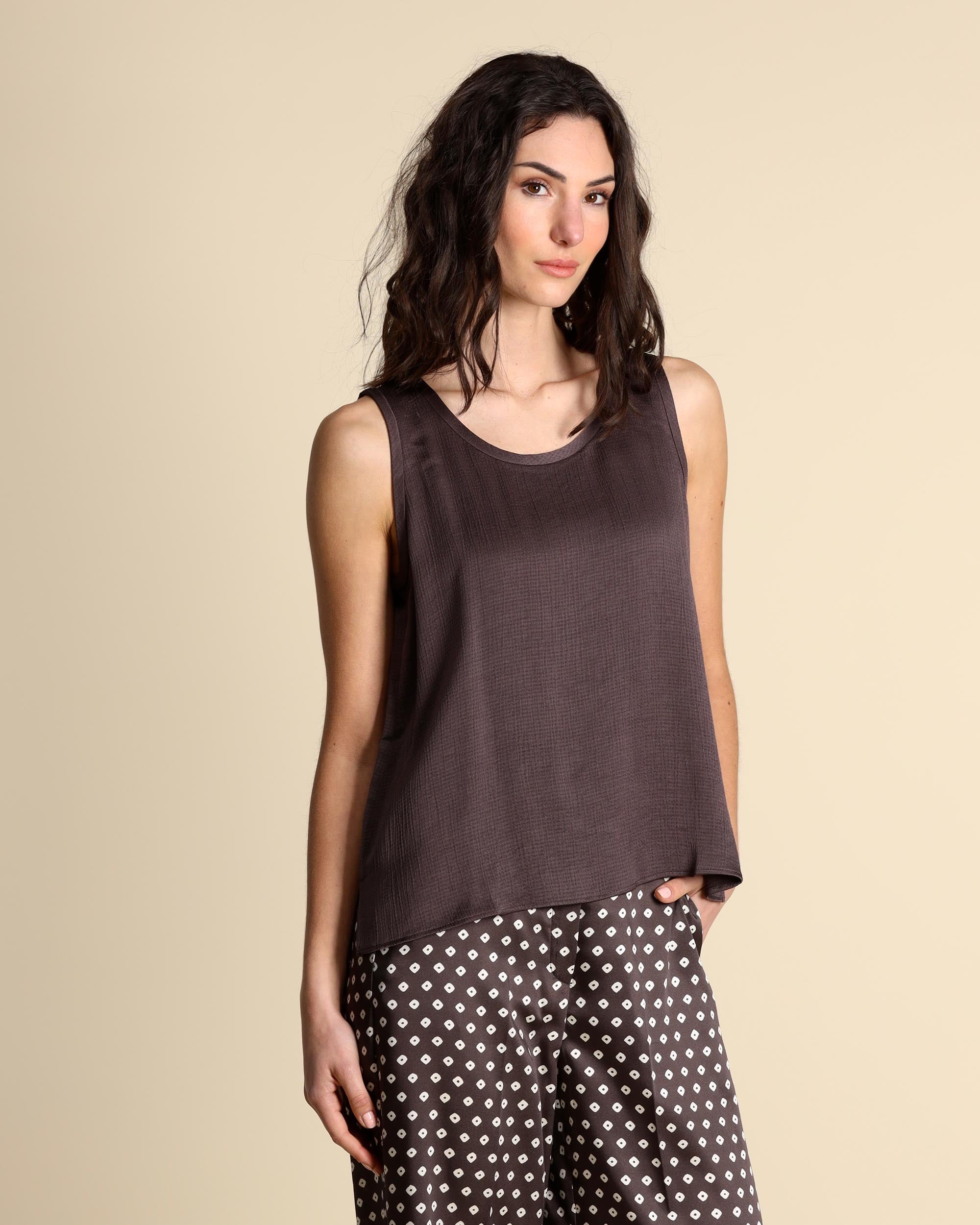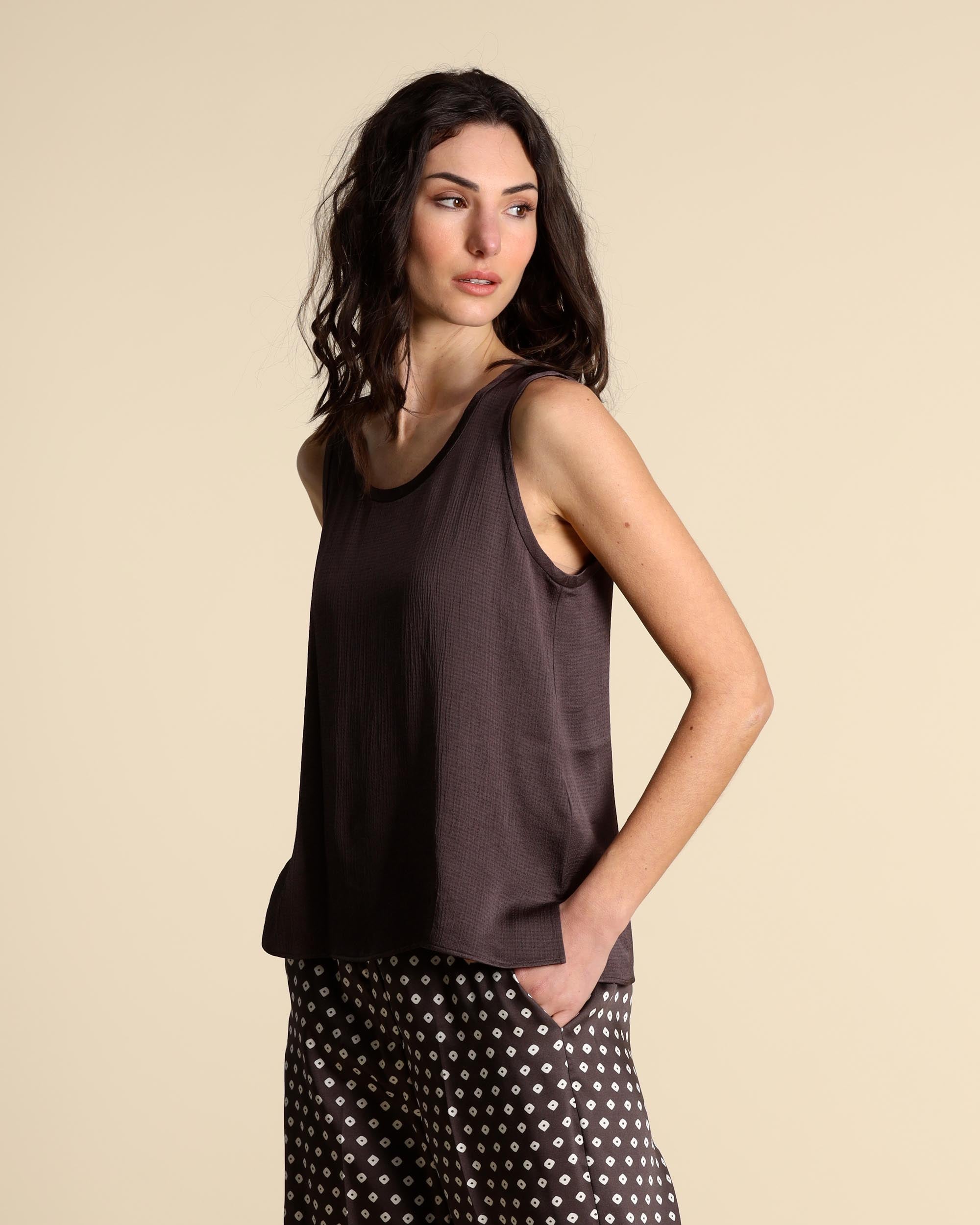 Top fluido testa moro in acetato di viscosa lavata con texture martellata, senza maniche, linea dritta morbida, la modella indossa una tg.42, la modella ha le seguenti misure: altezza 177, seno 86,vita 65, fianchi 93, collezione donna Emme by Marella Primavera Estate 2026