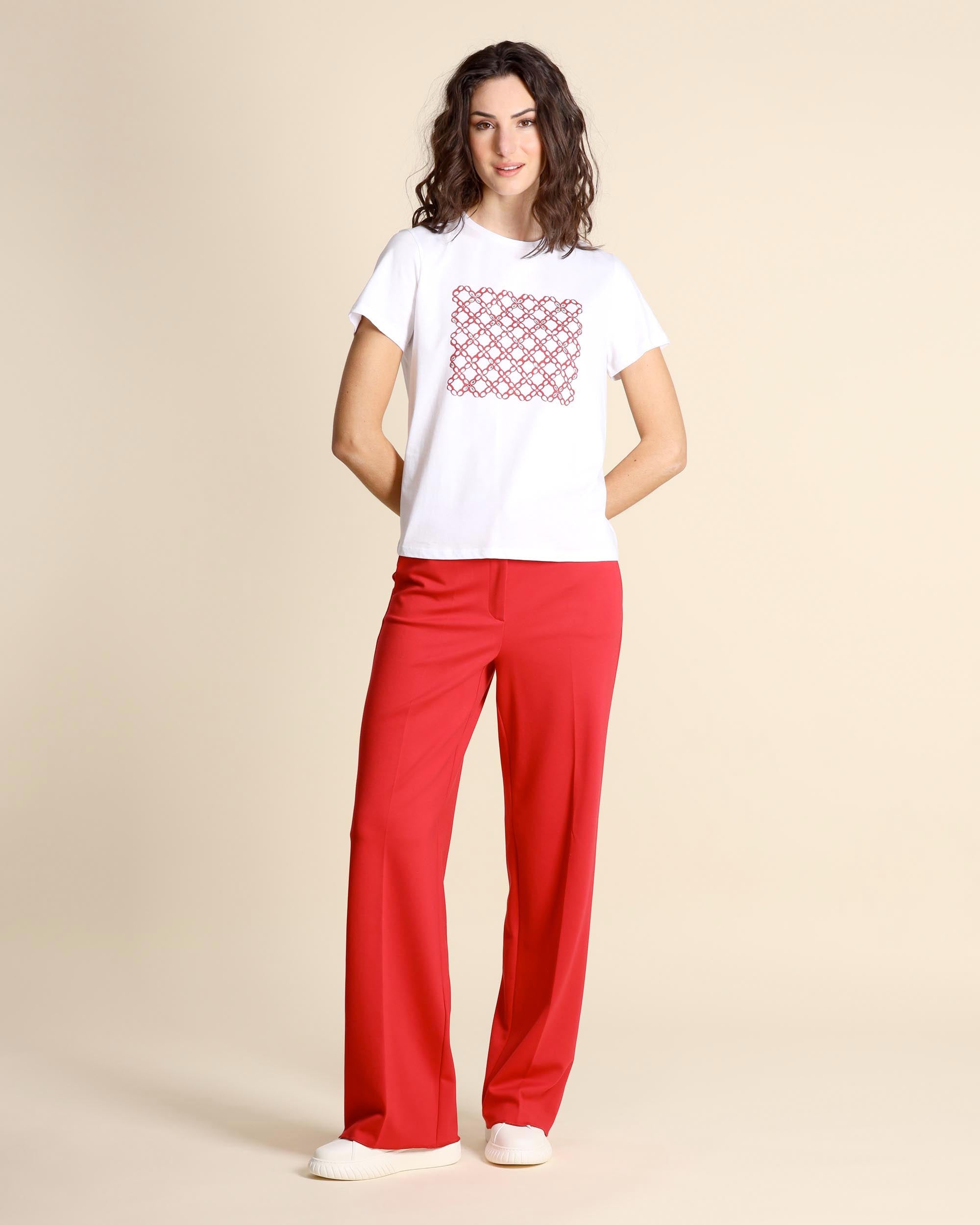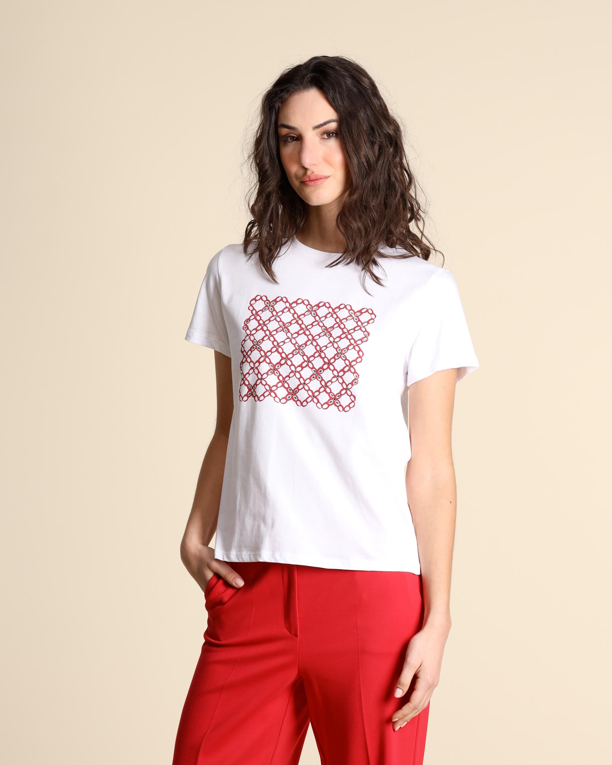 T shirt bianca in cotone con stampa rosa, scollo tondo, linea dritta, maniche corte, la modella indossa una tg.S, la modella ha le seguenti misure: altezza 177, seno 86,vita 65, fianchi 93, collezione donna Emme by Marella Primavera Estate 2026