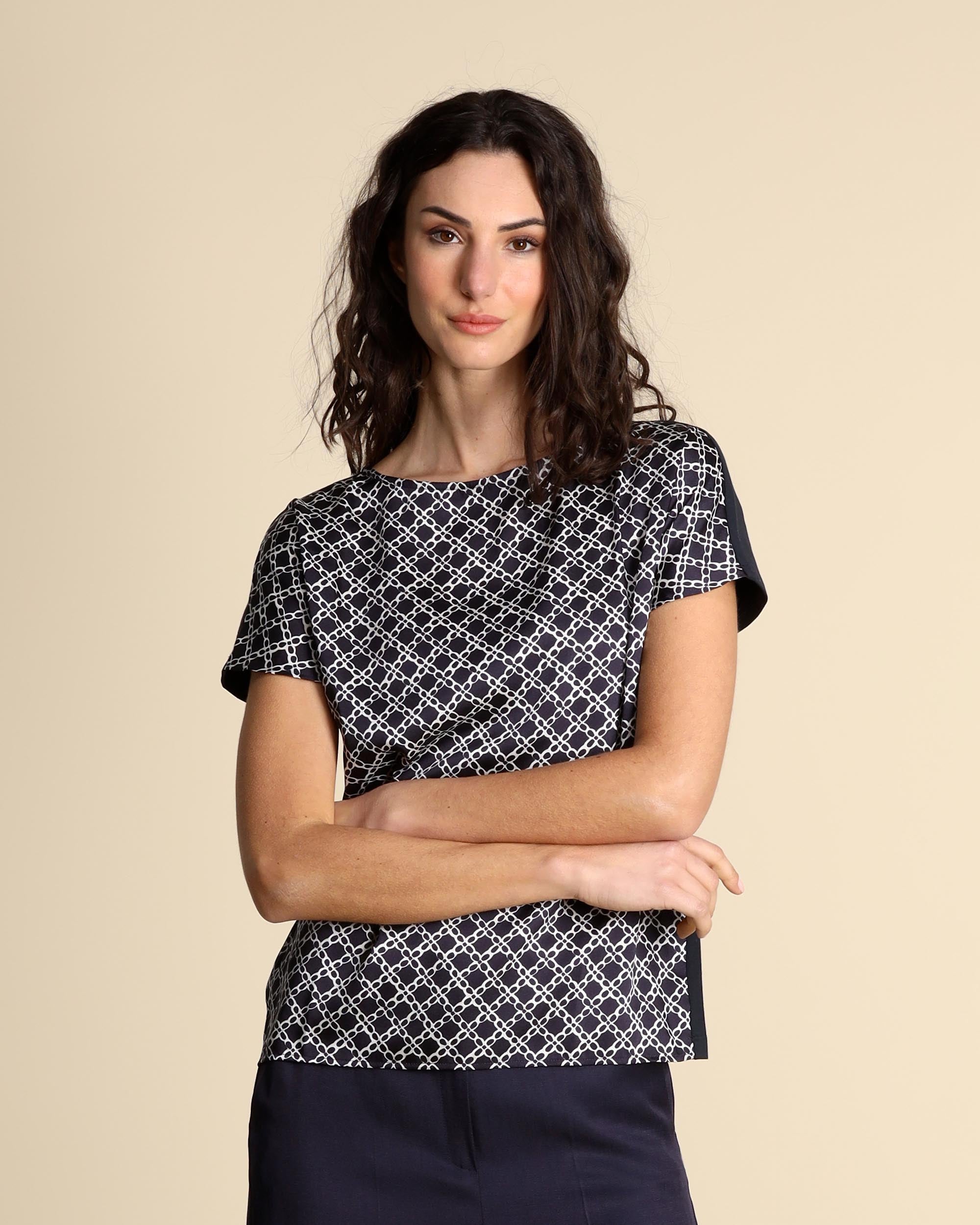 Blusa in bimaterale, twill blu a fantasia sul davanti e jersey di cotone stretch blu sul dietro, scollo a barchetta, linea dritta, maniche corte, la modella indossa una tg.42, la modella ha le seguenti misure: altezza 177, seno 86,vita 65, fianchi 93, collezione donna Emme by Marella Primavera Estate 2026