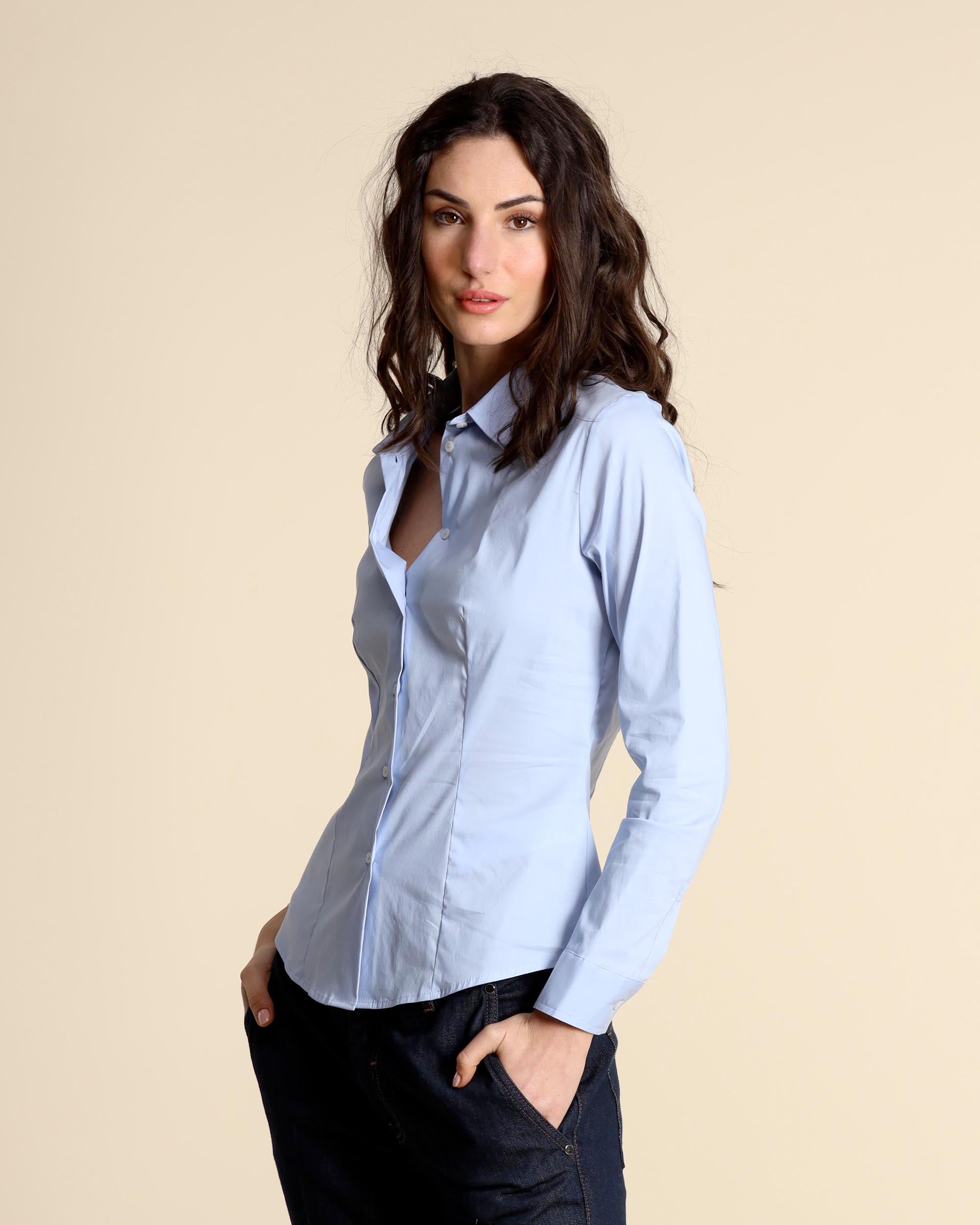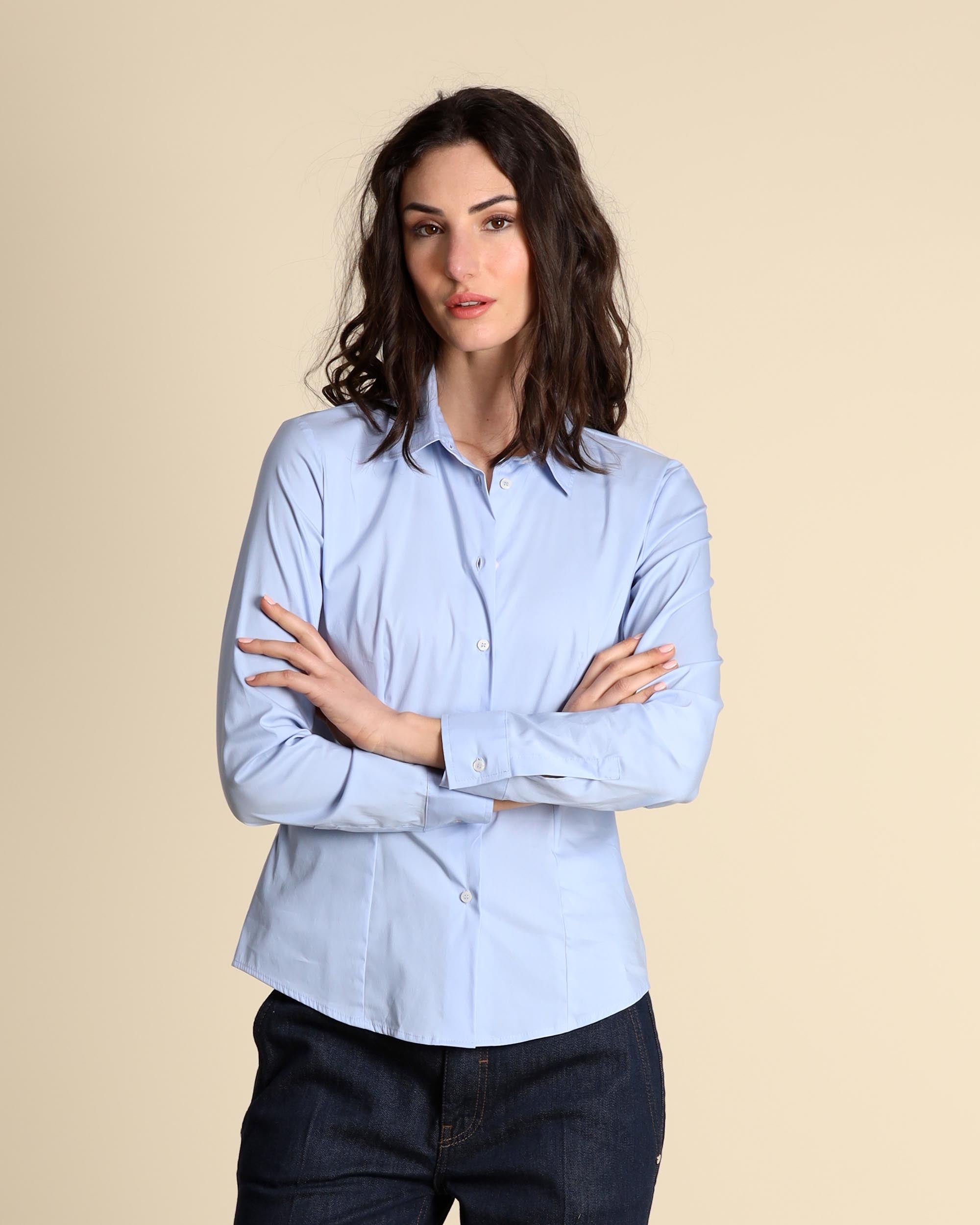 Camicia in popeline di misto cotone stretch, collo a camicia, linea semiaderente, chiusura con bottoni, maniche lunghe con polsino, la modella indossa una tg.42, la modella ha le seguenti misure: altezza 177, seno 86,vita 65, fianchi 93, collezione donna Emme by Marella Primavera Estate 2026