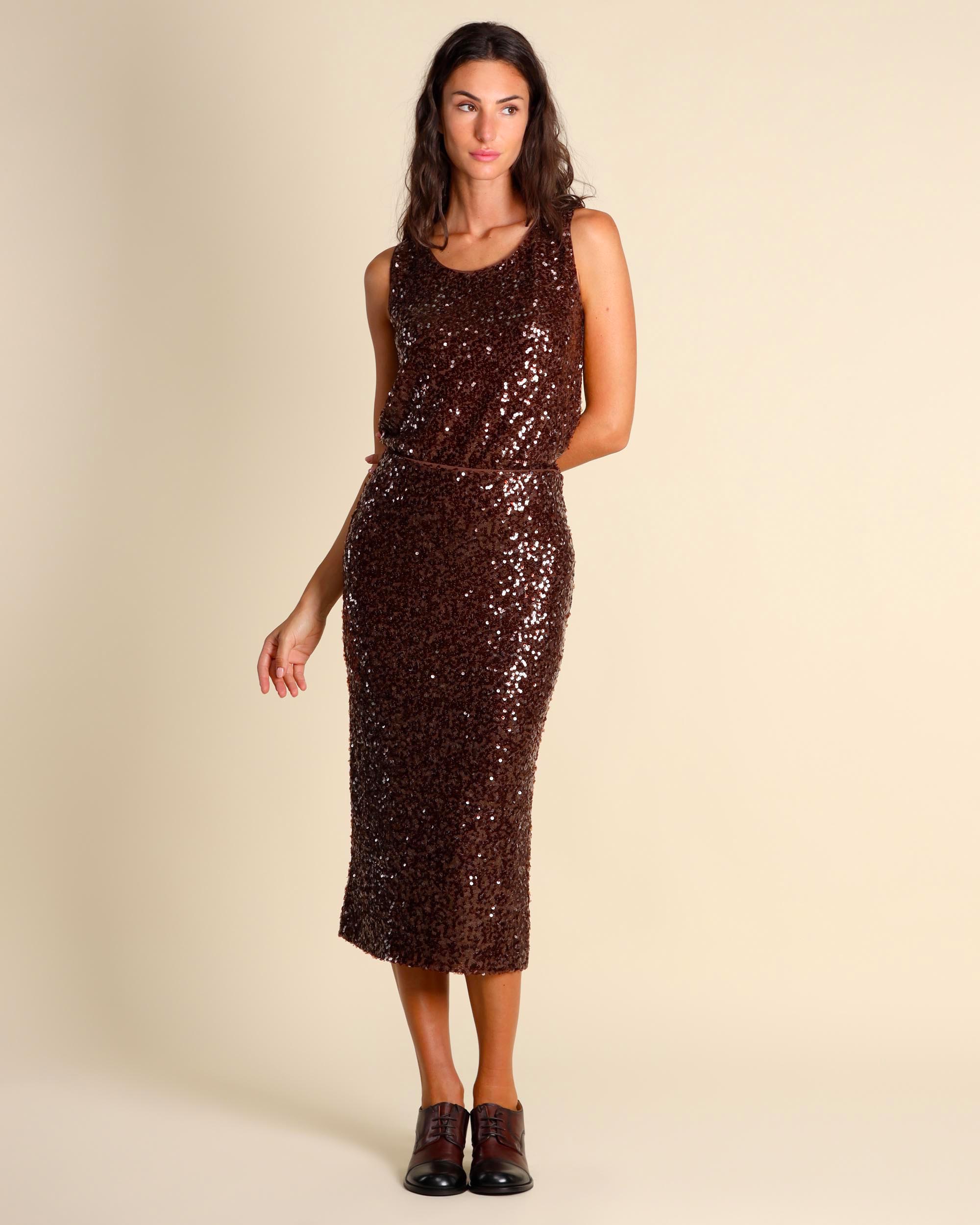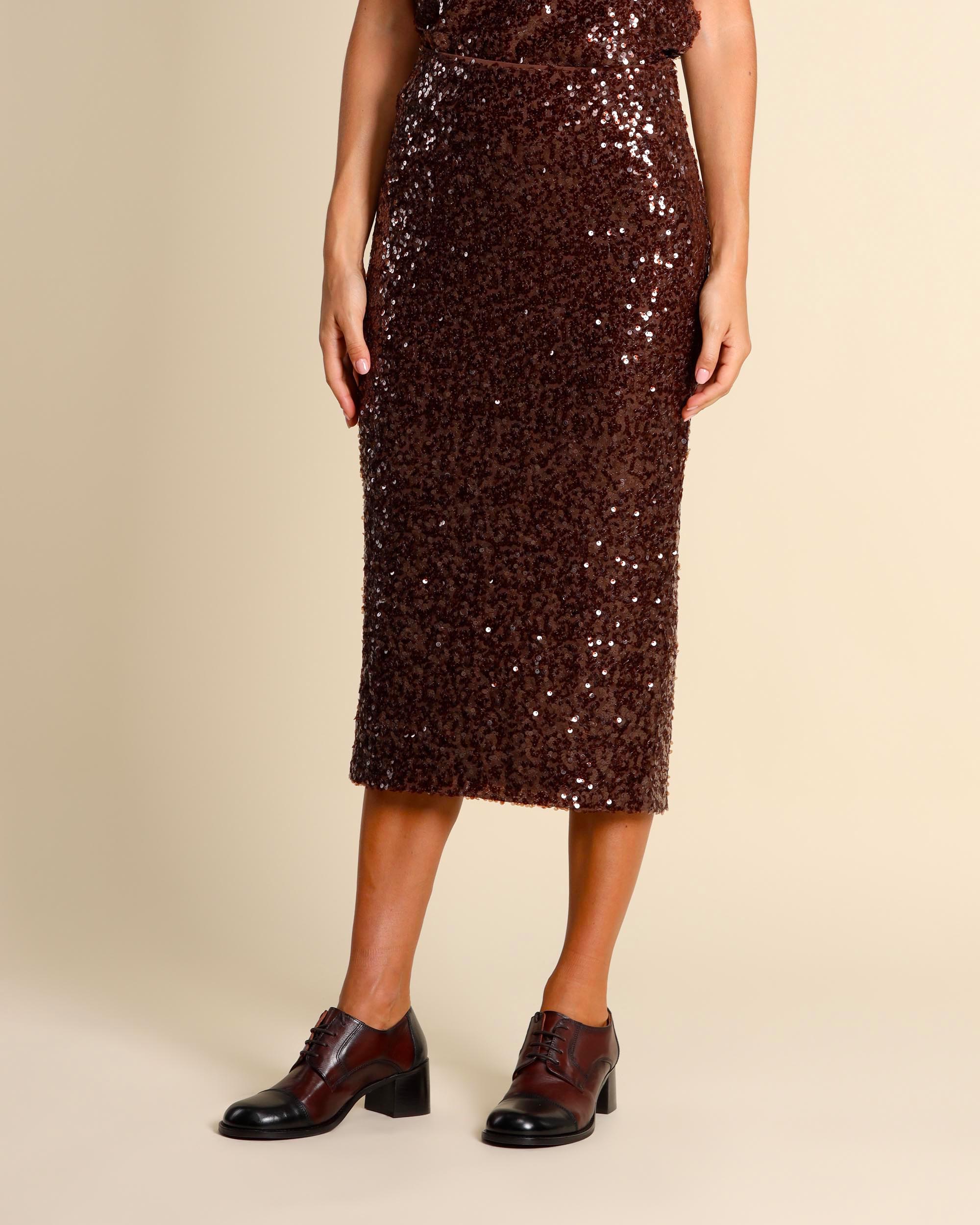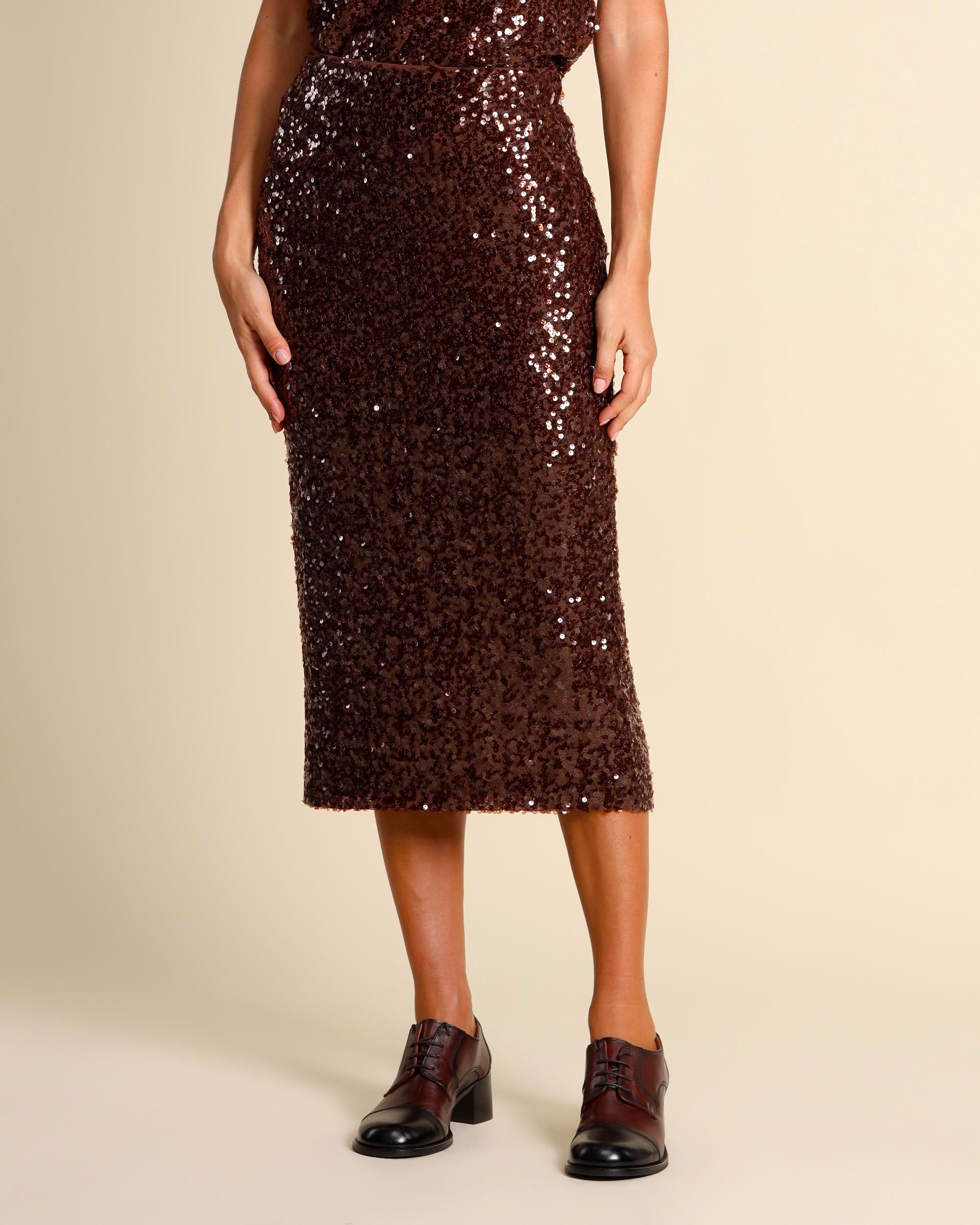 Gonna marrone in jersey tulle con applicazione di paillettes, chiusura con zip invisibile sul dietro, linea dritta, spacco centrale sul dietro, foderata, la modella indossa una tg.42, la modella ha le seguenti misure: altezza 178, seno 86,vita 65, fianchi 93, collezione donna Pennyblack Autunno Inverno 2025/26