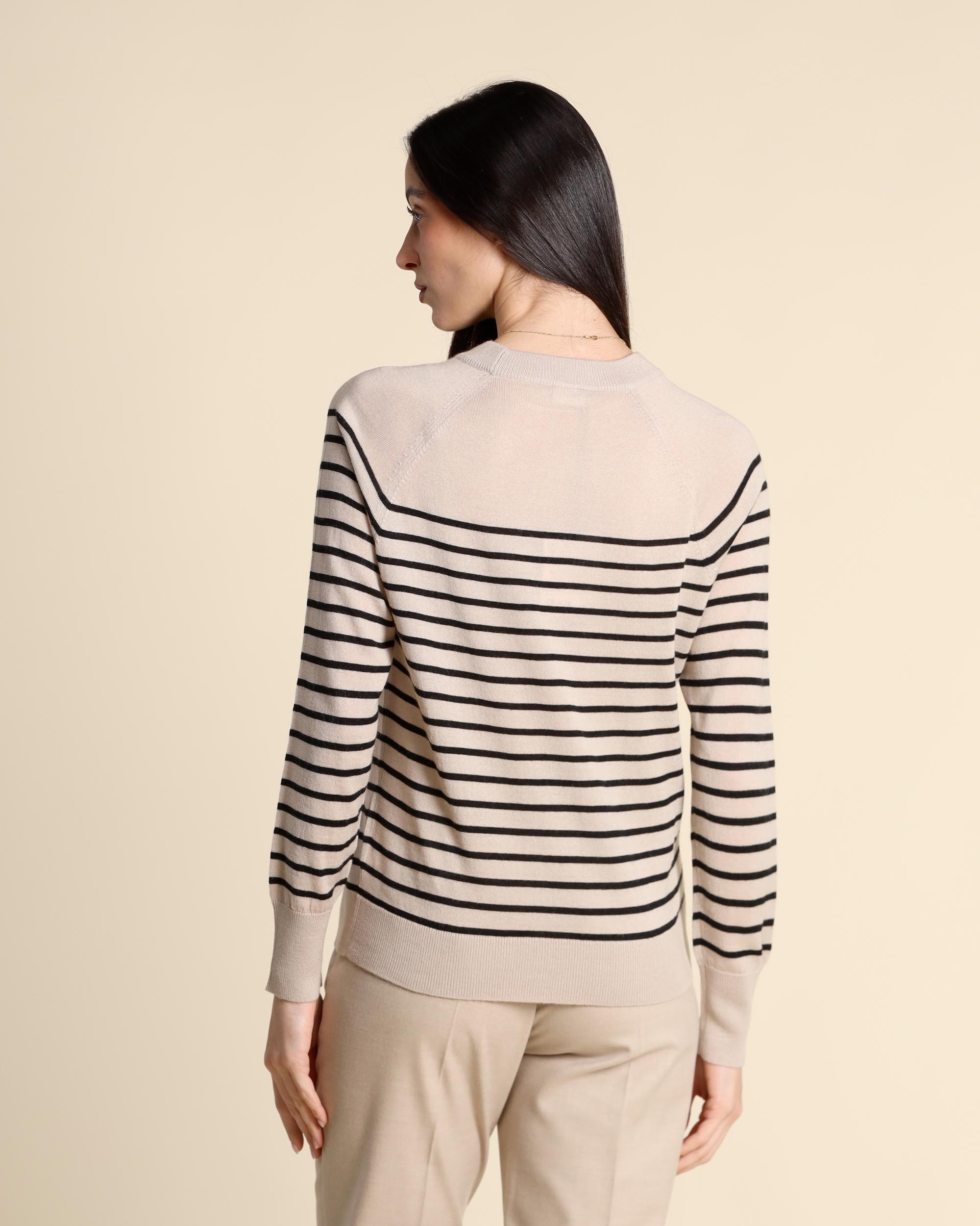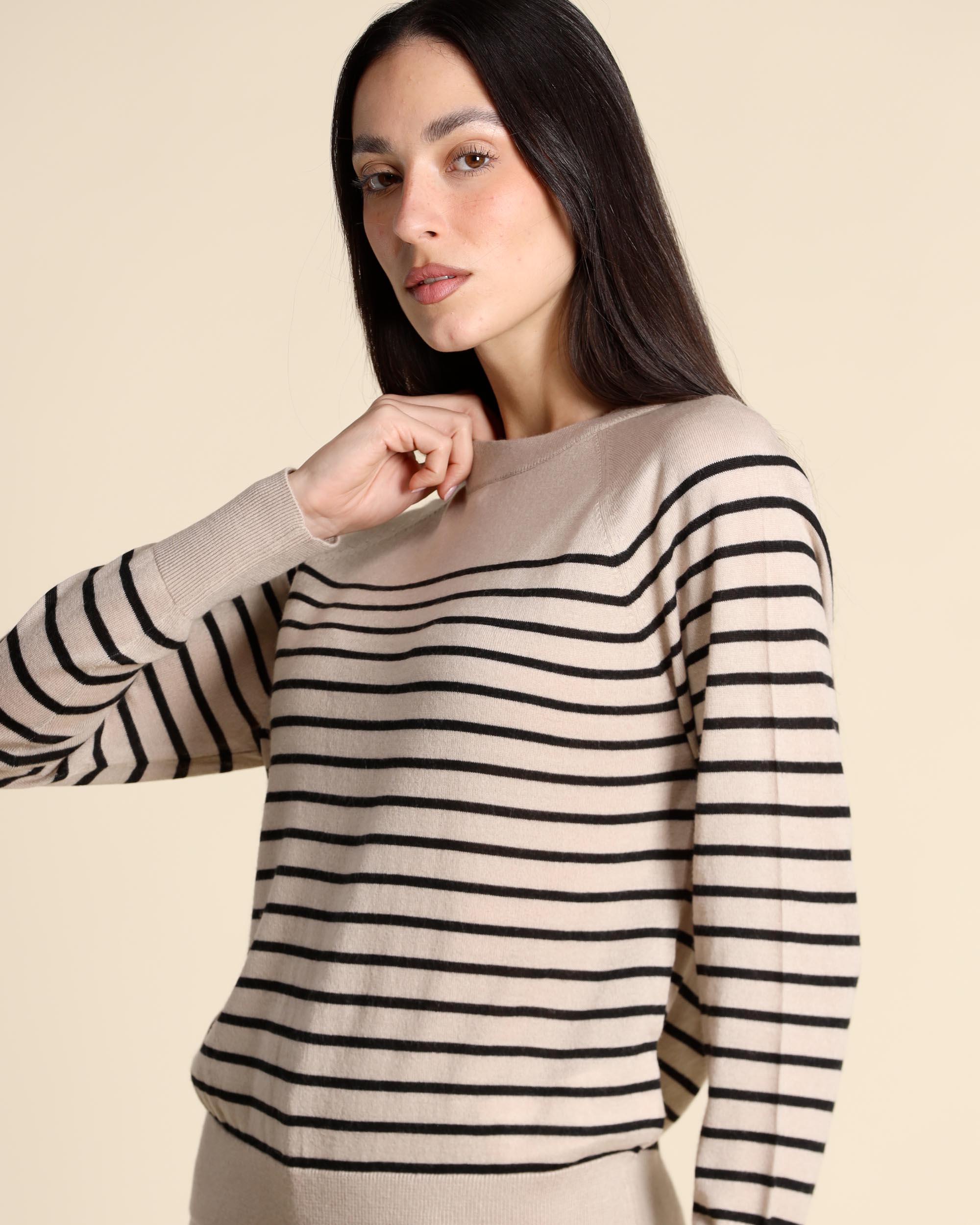 Maglia casha a righe in misto lana, scollo tondo, maniche lunghe raglan, linea dritta, la modella indossa una tg.S, la modella ha le seguenti misure: altezza 173, seno 84, vita 63, fianchi 94, collezione donna Emme by Marella Autunno Inverno 2025/26