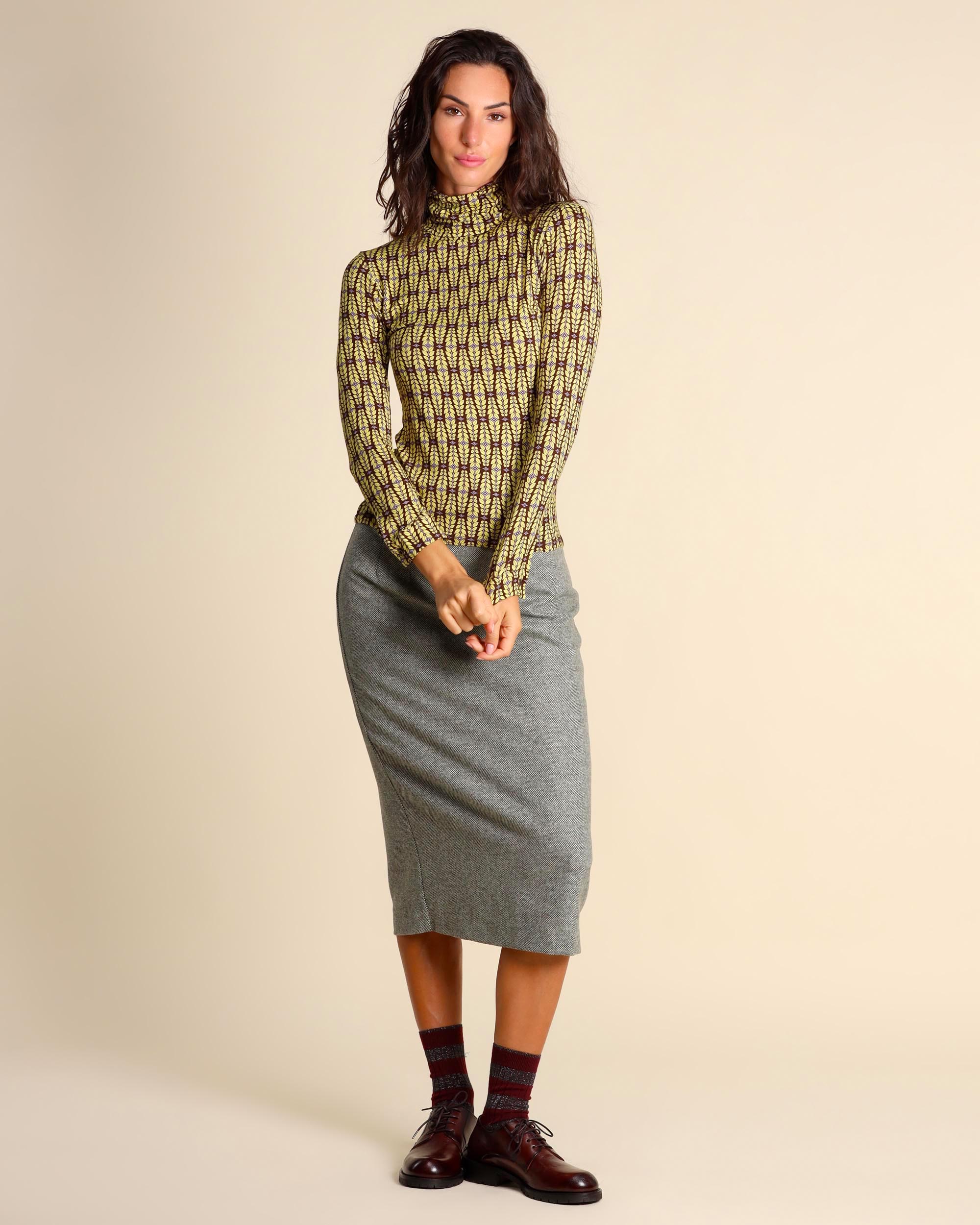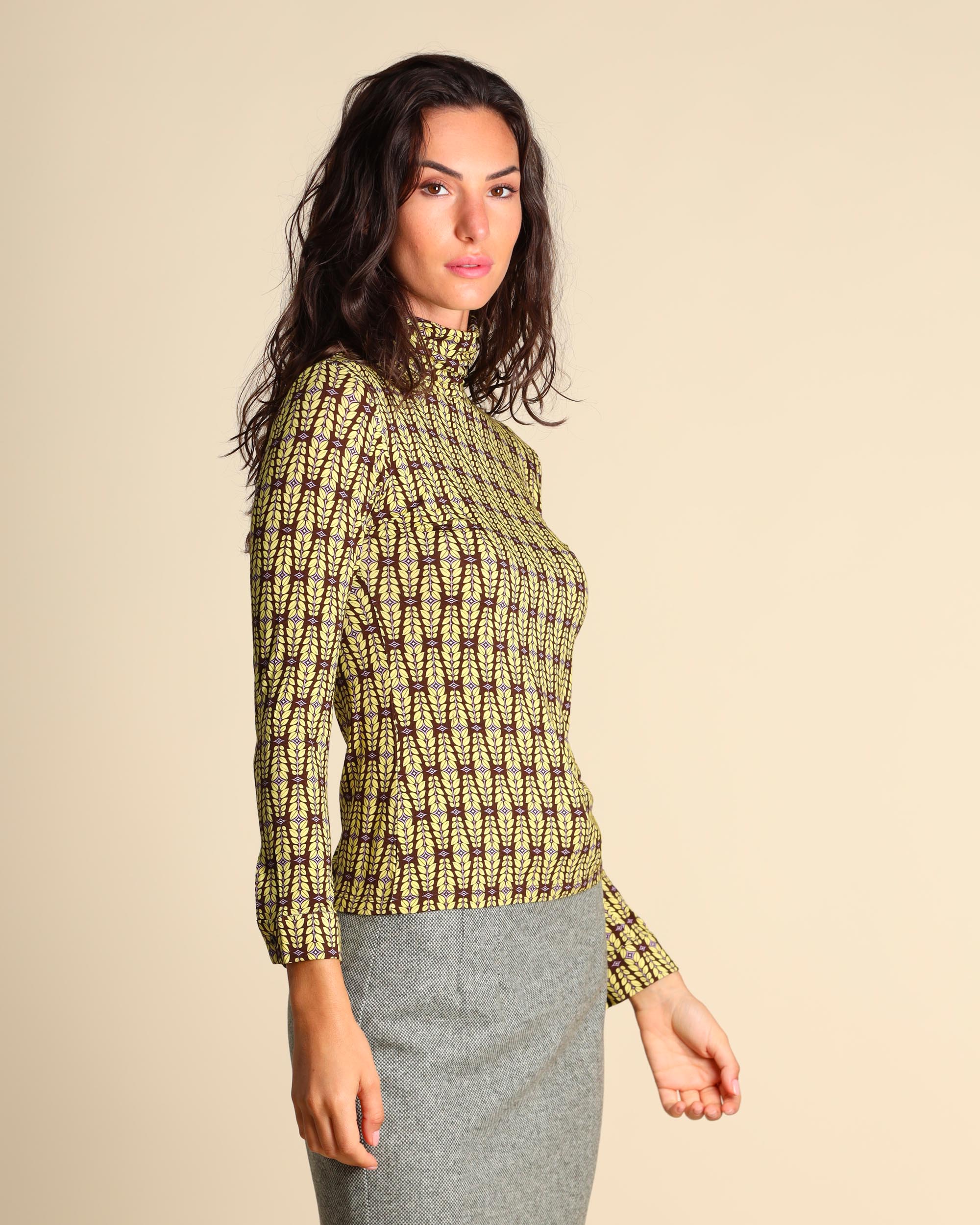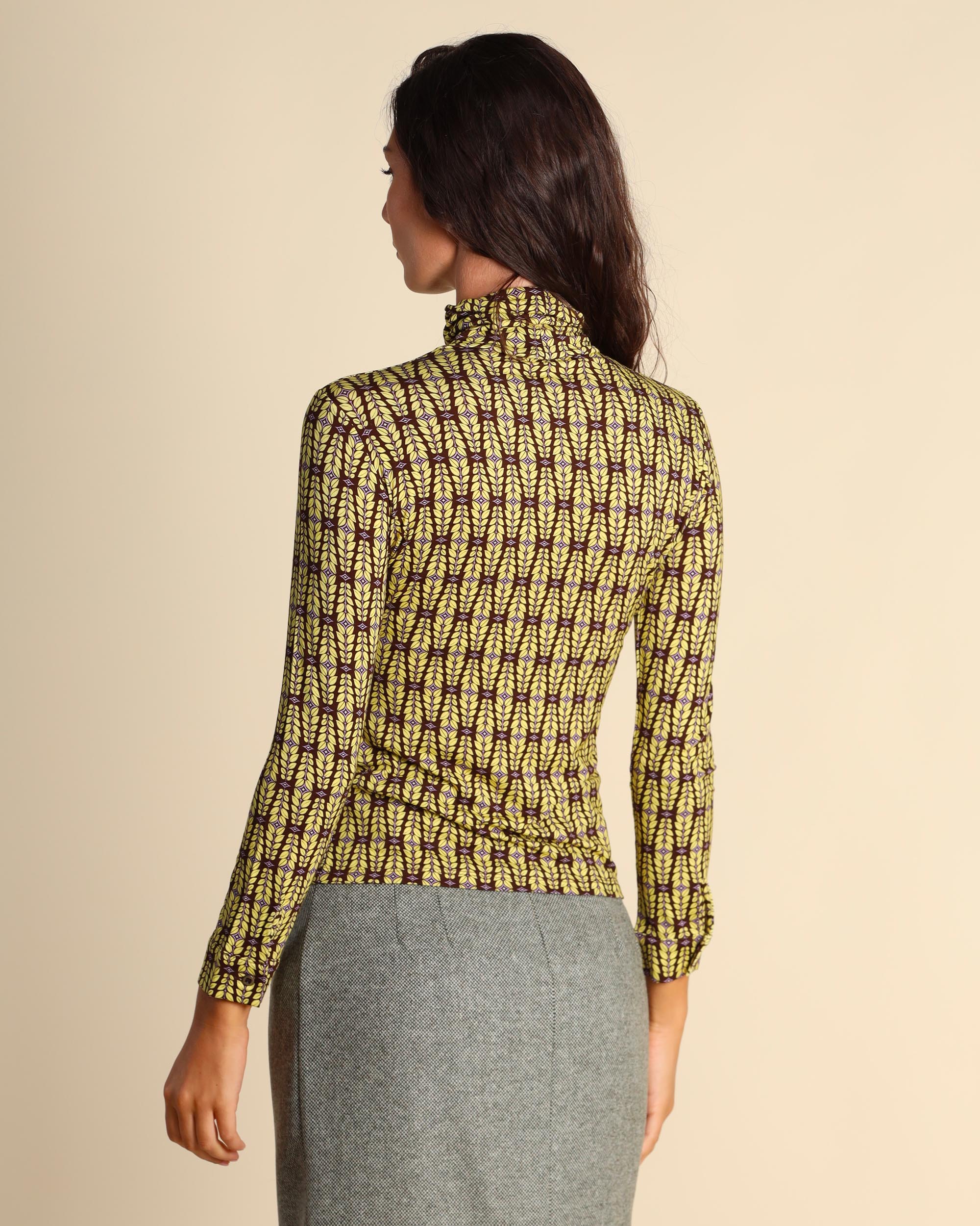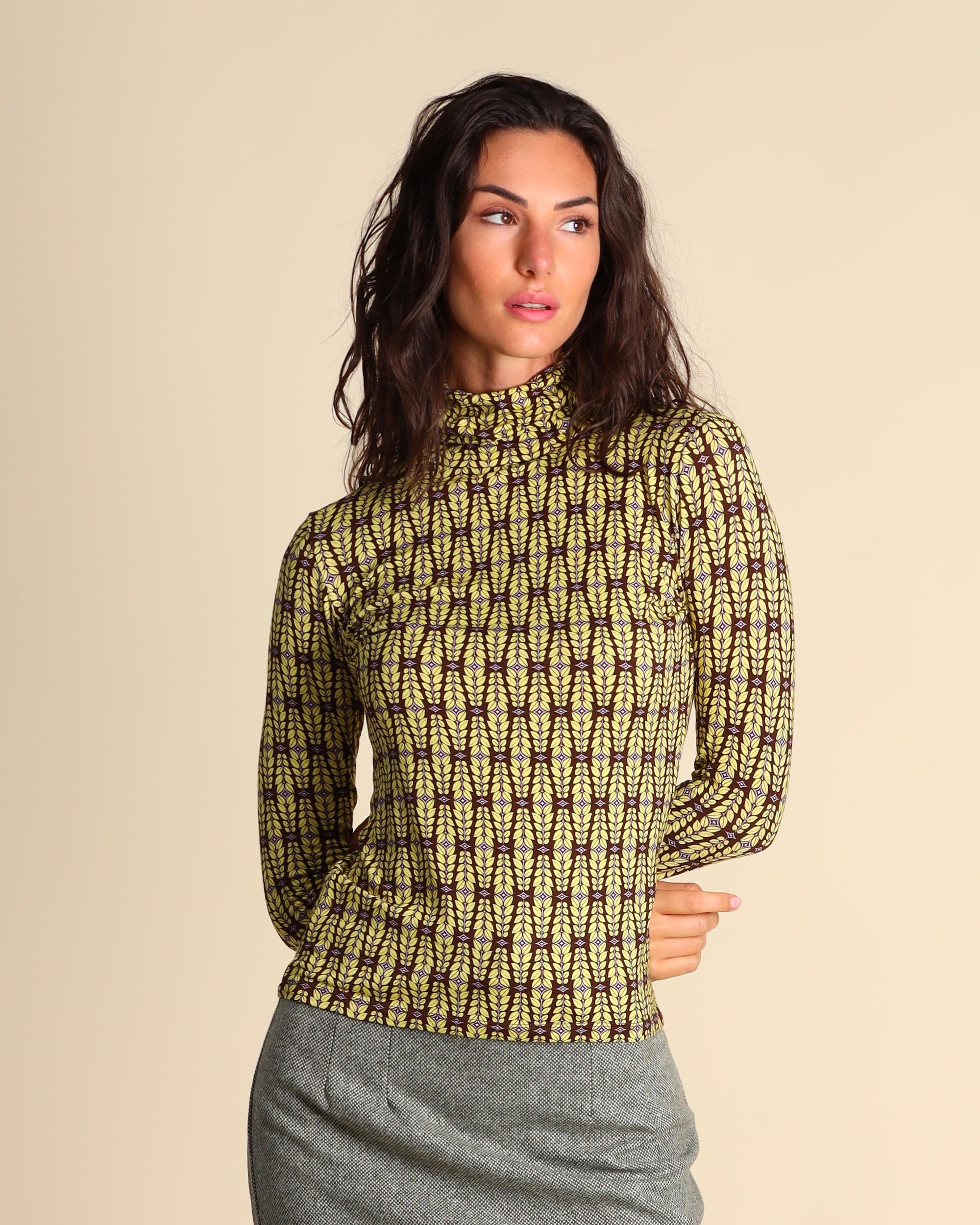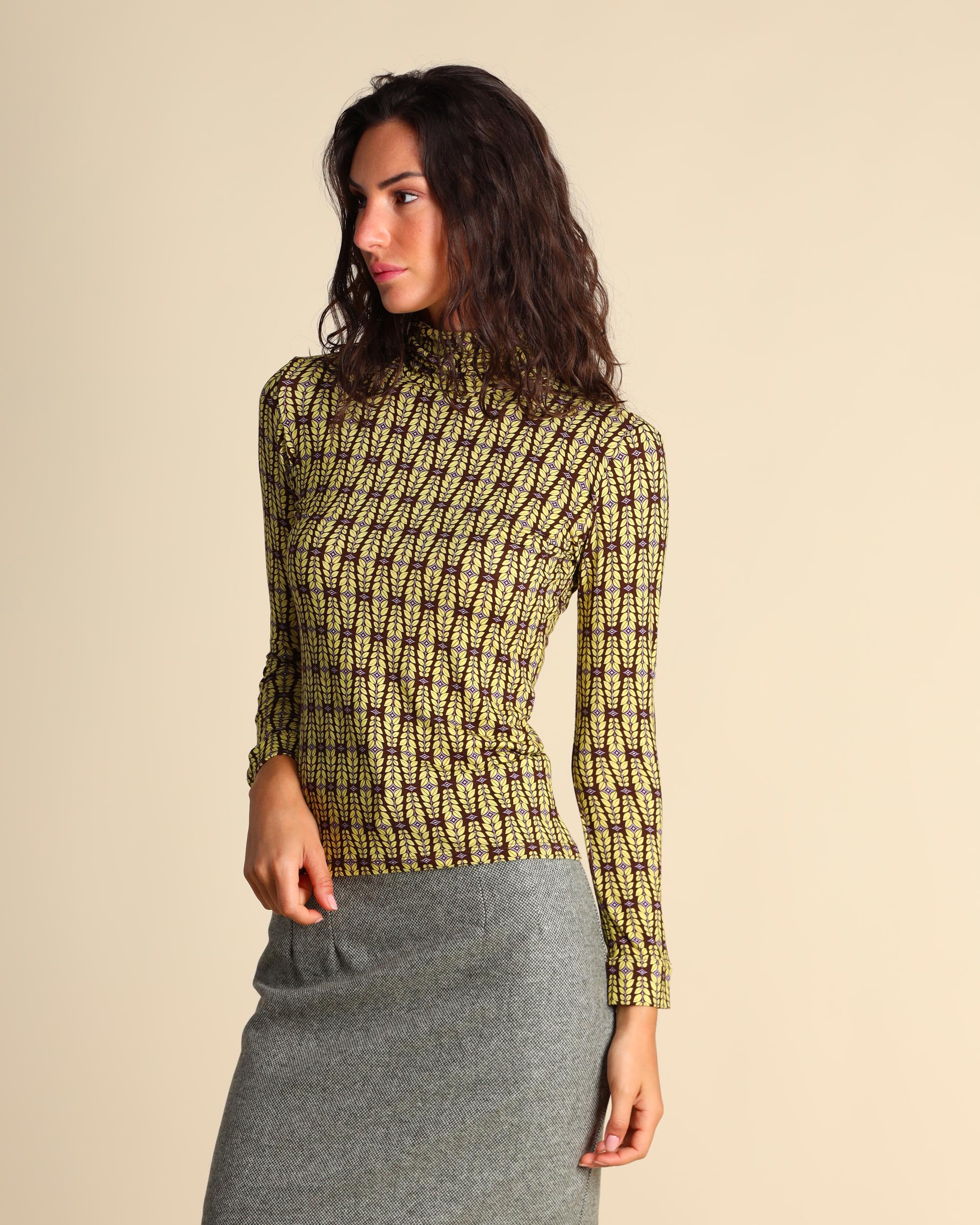 T shirt a fantasia giallo banana e viola in jersey di viscosa stretch, collo alto, maniche lunghe, linea semiaderente, made in Italy, la modella indossa una tg.S, la modella ha le seguenti misure: altezza 179, seno 84, vita 63, fianchi 94, collezione donna Justmine Autunno Inverno 2025/26