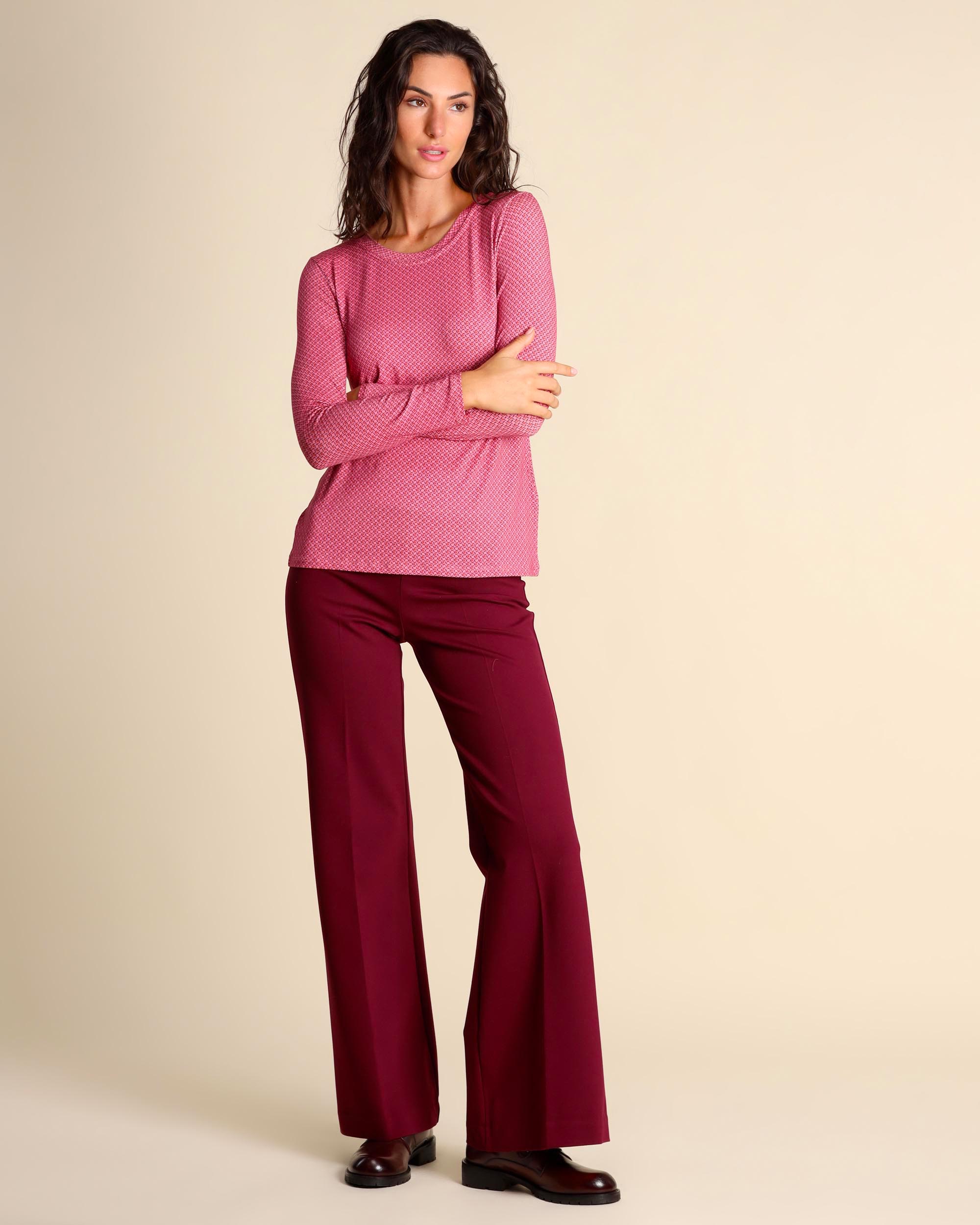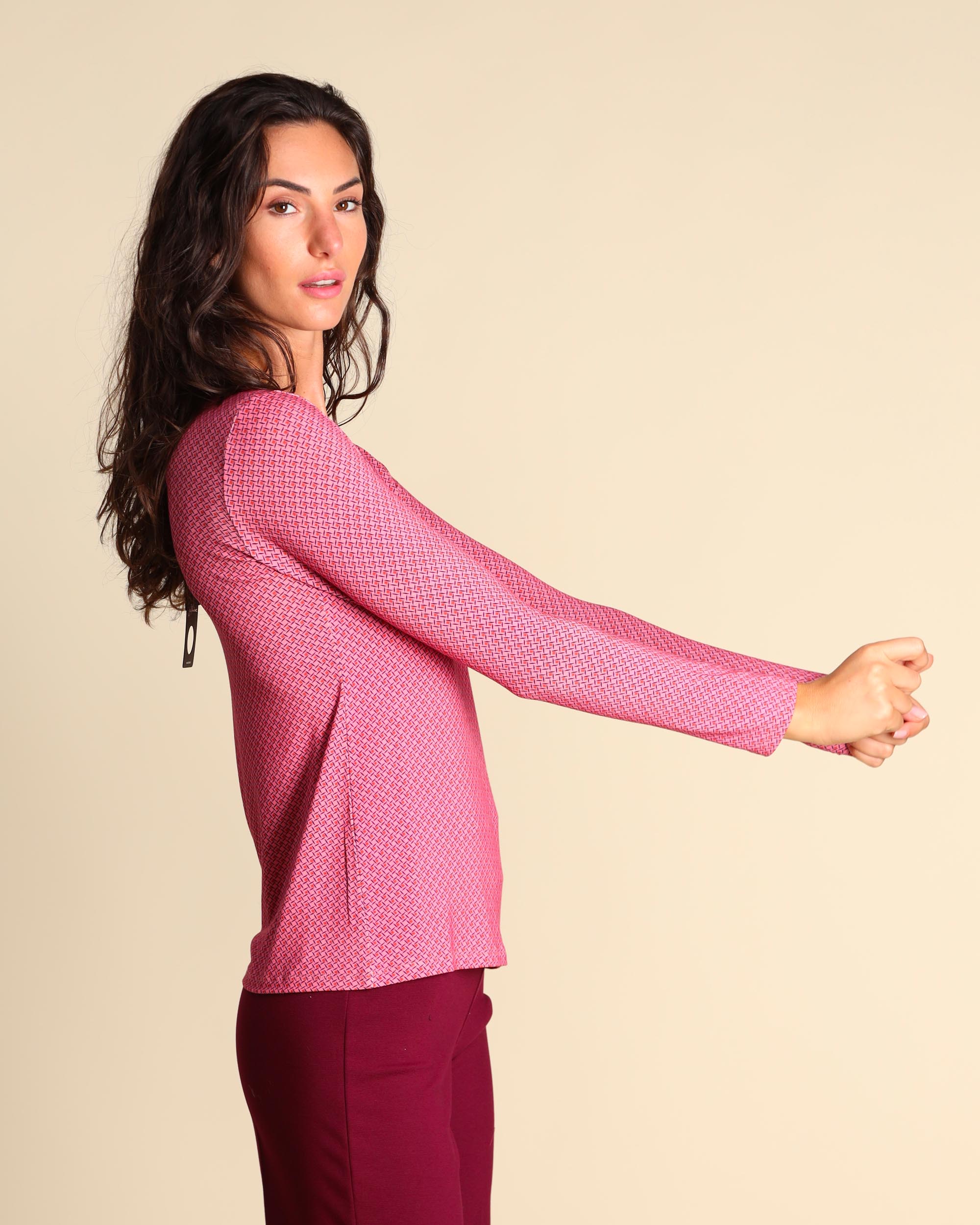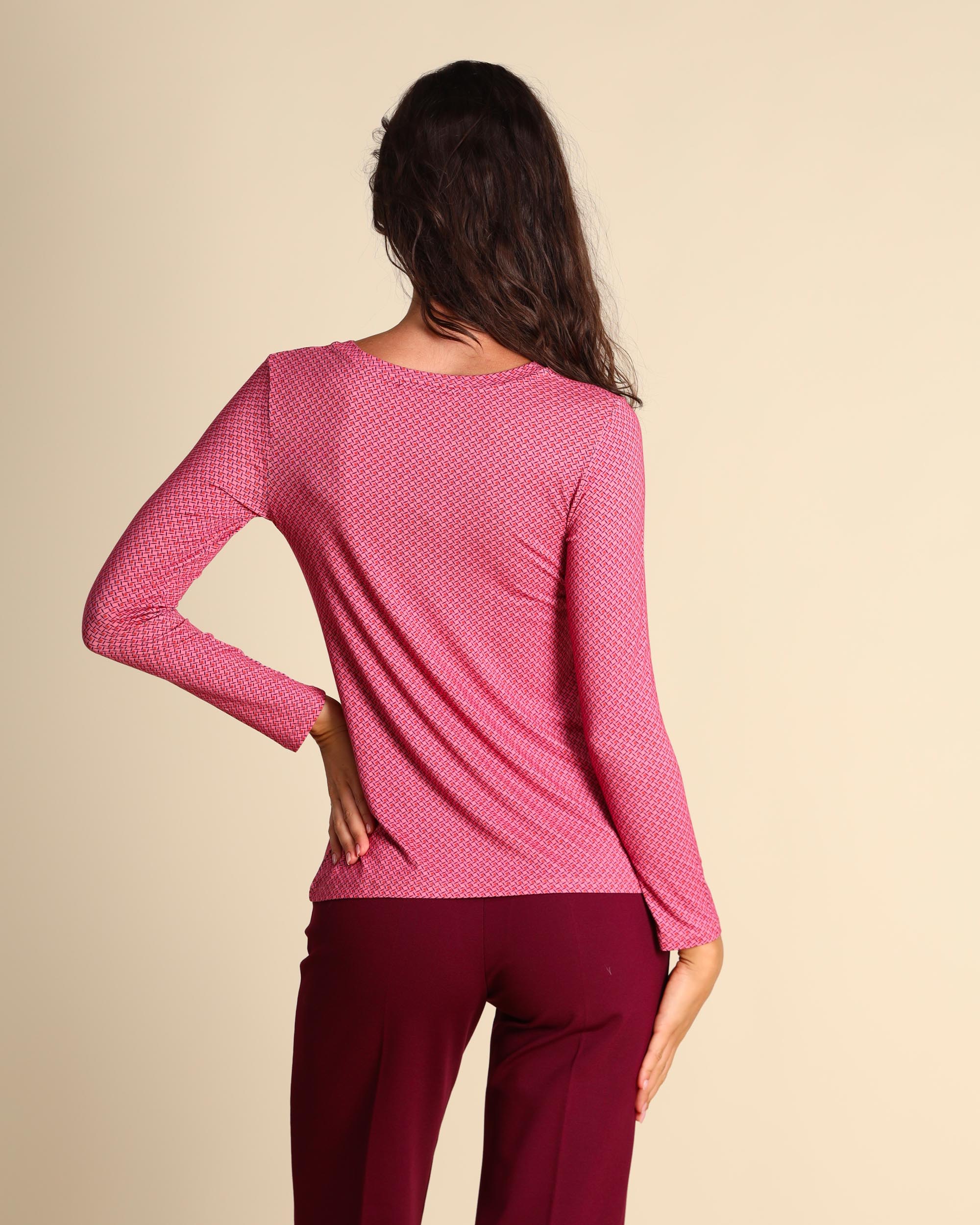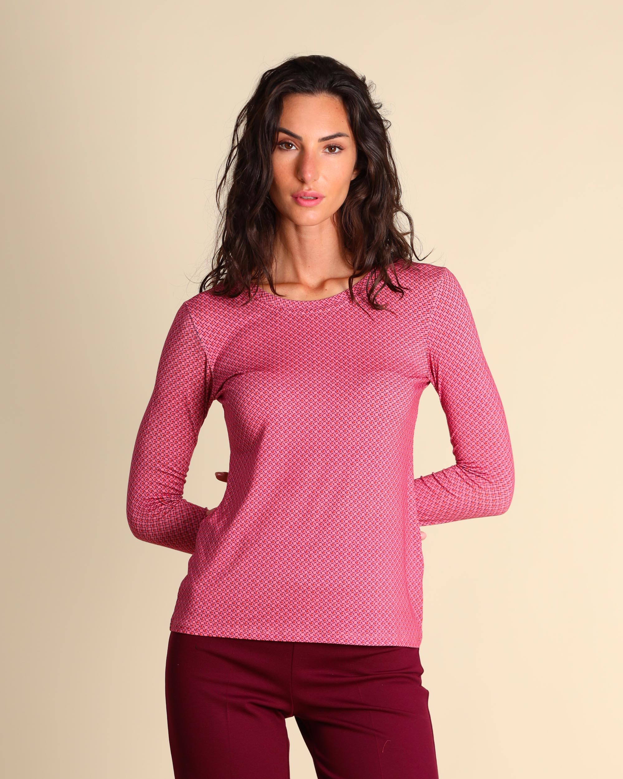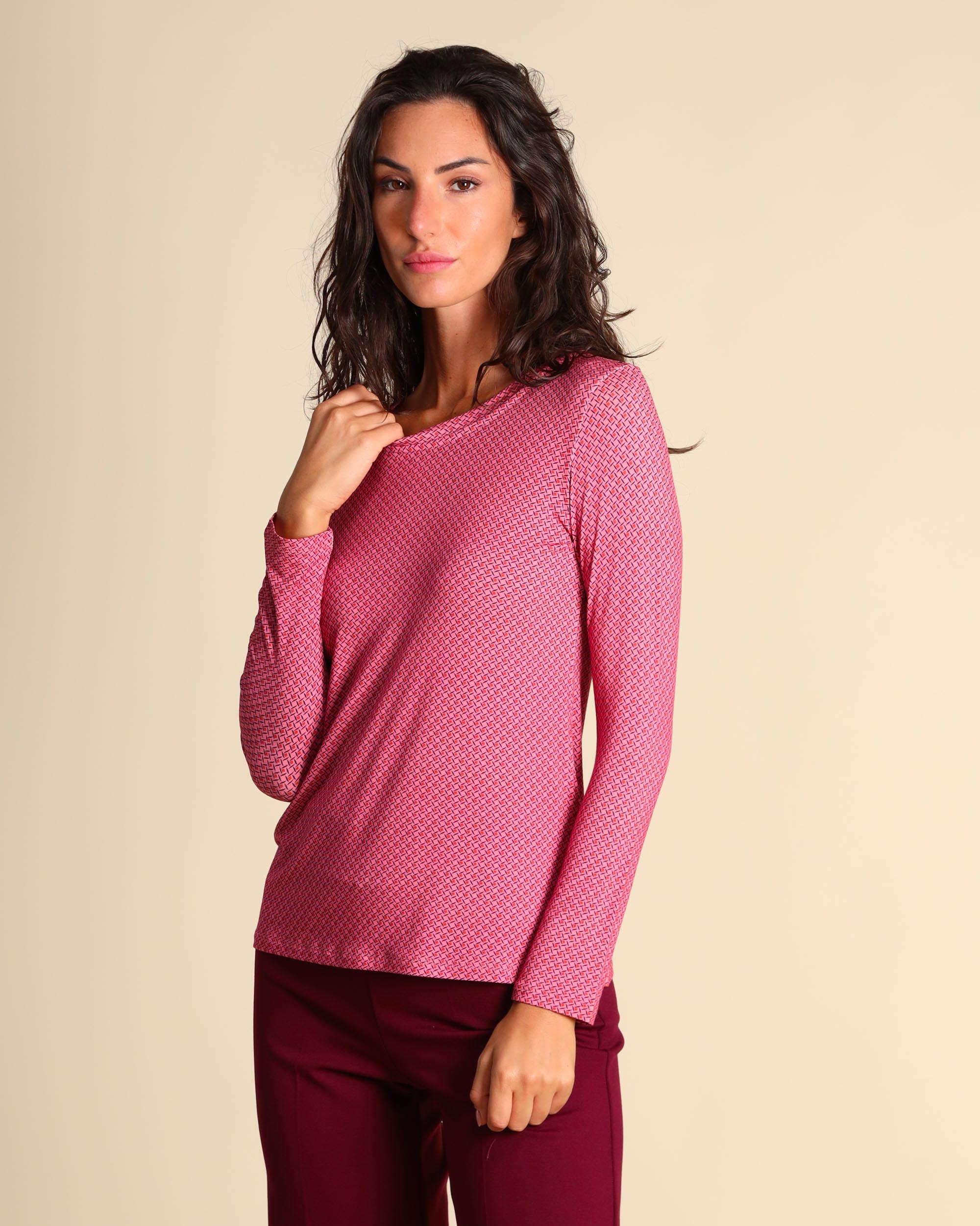 T shirt a fantasia rosa e fucsia in jersey di viscosa stretch, scollo a barchetta, maniche lunghe, linea dritta, made in Italy, la modella indossa una tg.S, la modella ha le seguenti misure: altezza 179, seno 84, vita 63, fianchi 94, collezione donna Justmine Autunno Inverno 2025/26