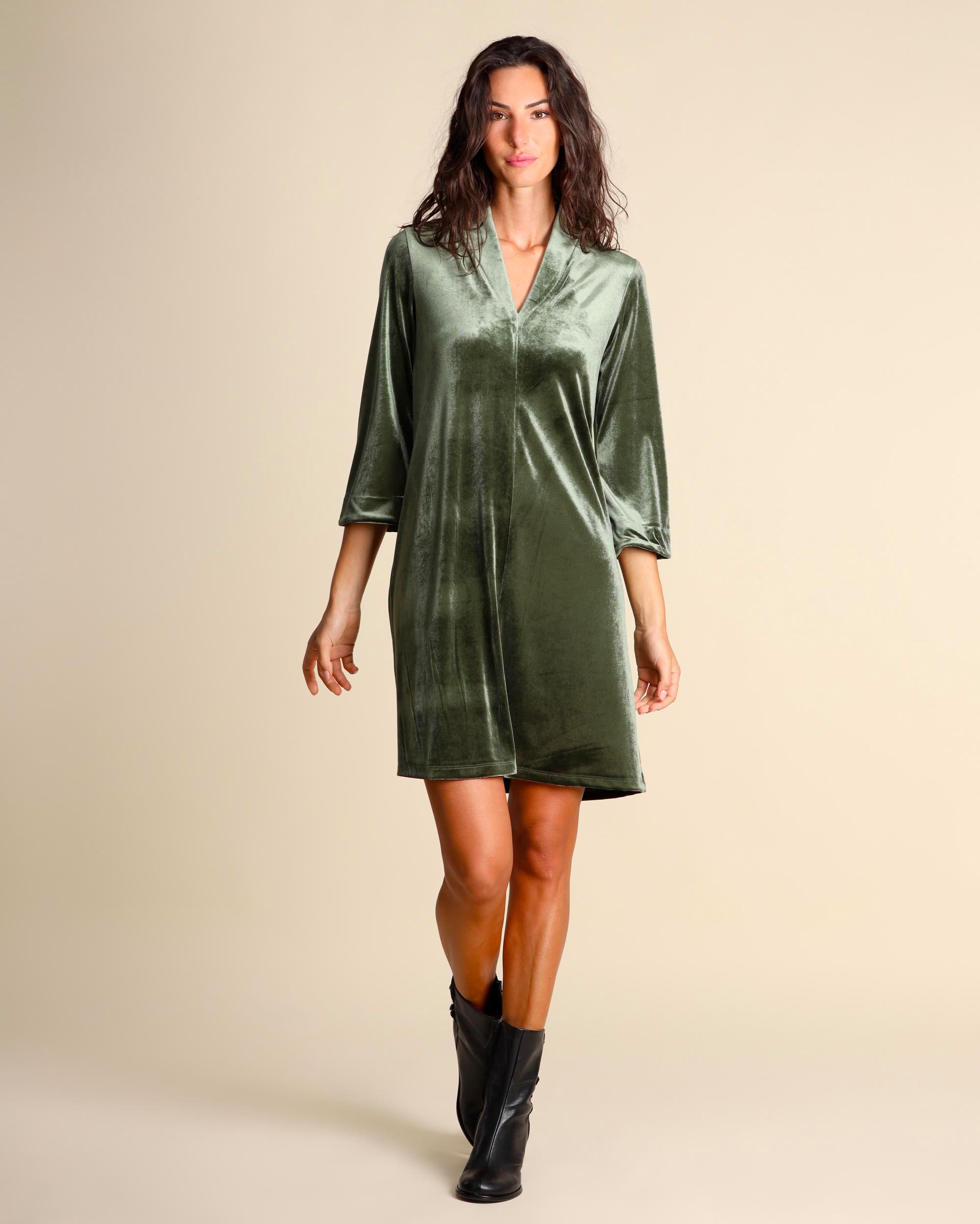 Abito verde in jersey di velluto stretch, scollo a V, maniche tre quarti, linea svasata, sfoderato, made in Italy, la modella indossa una tg.S, la modella ha le seguenti misure: altezza 178, seno 86,vita 65, fianchi 93, collezione donna Justmine Autunno Inverno 2025/26