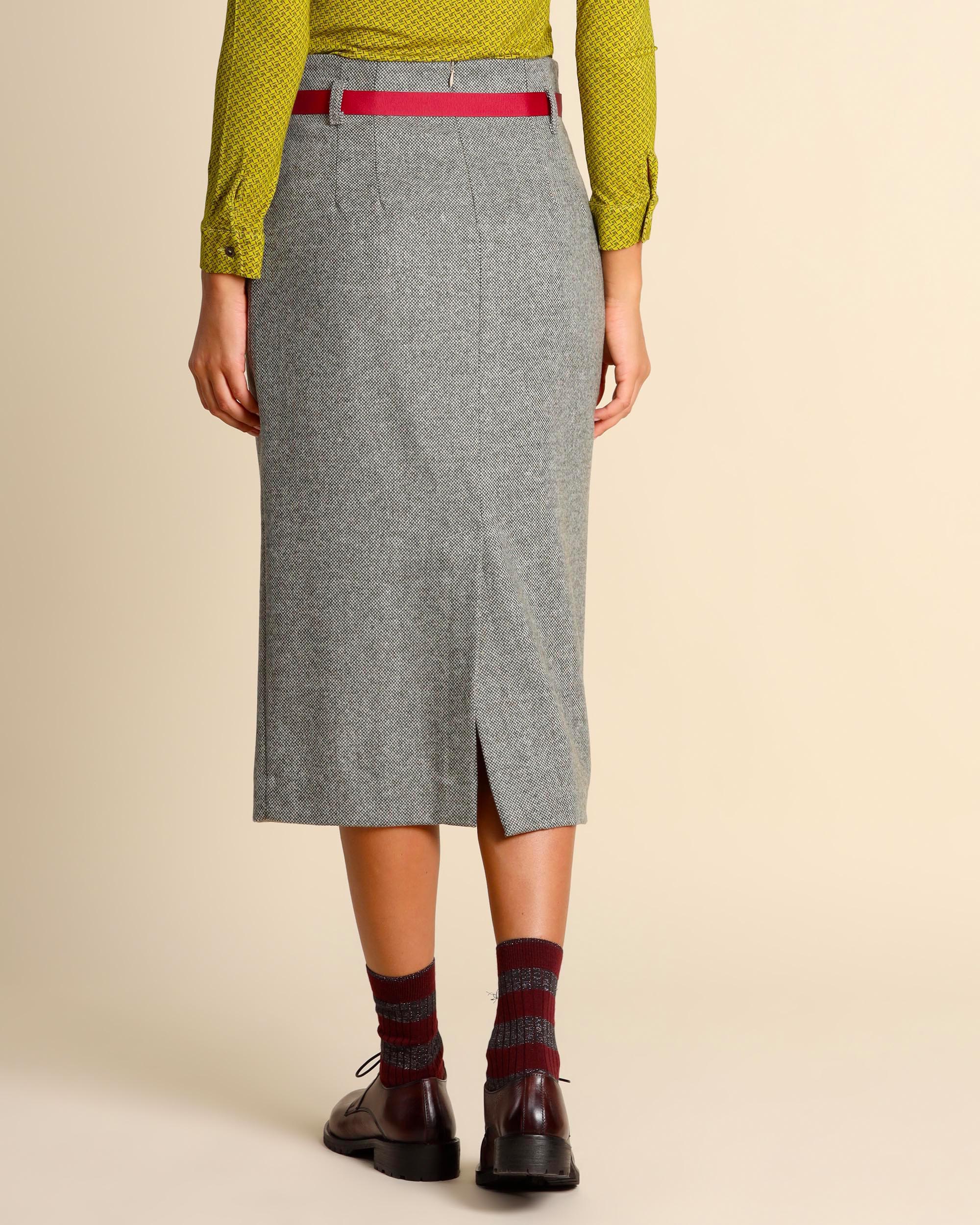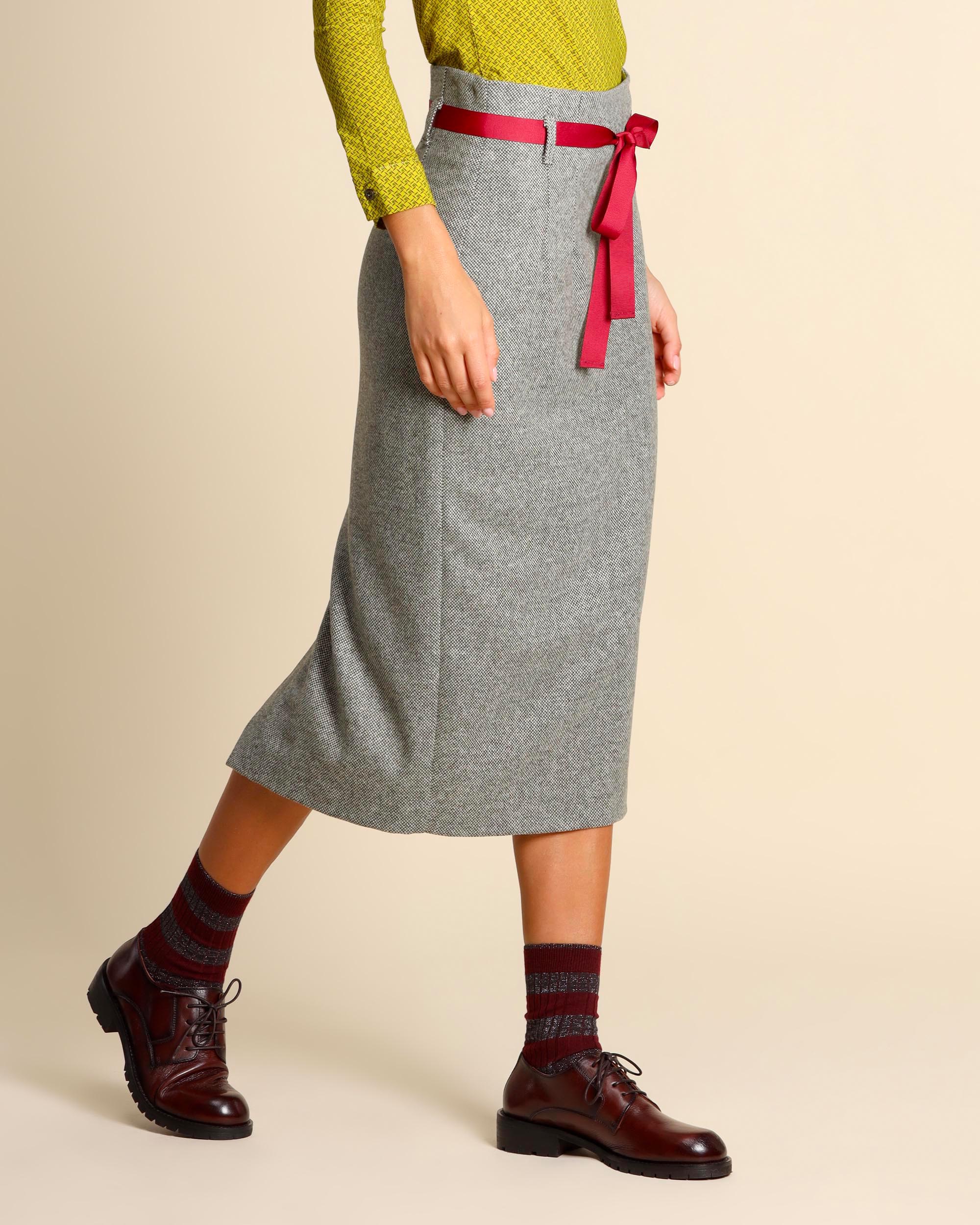 Gonna verde in tweed di misto lana, vita alta con cintura in gros grain bordeaux, linea dritta, spacco centrale sul dietro, foderata, la modella indossa una tg.S, la modella ha le seguenti misure: altezza 178, seno 86,vita 65, fianchi 93, collezione donna Justmine Autunno Inverno 2025/26