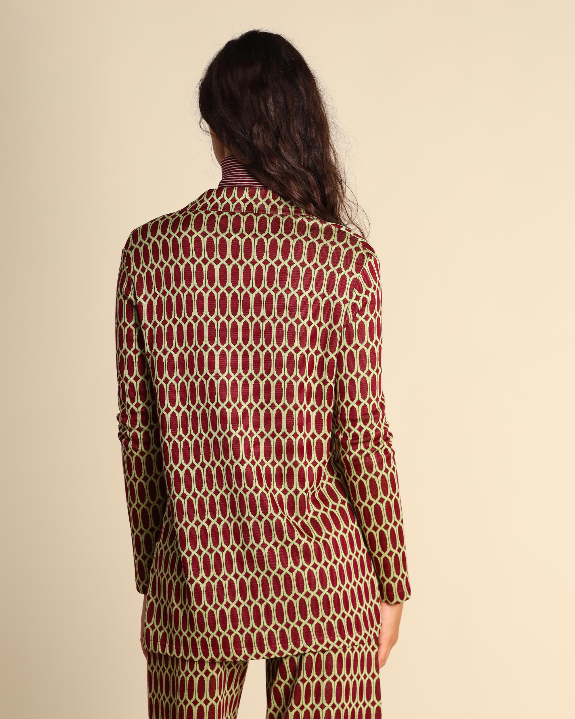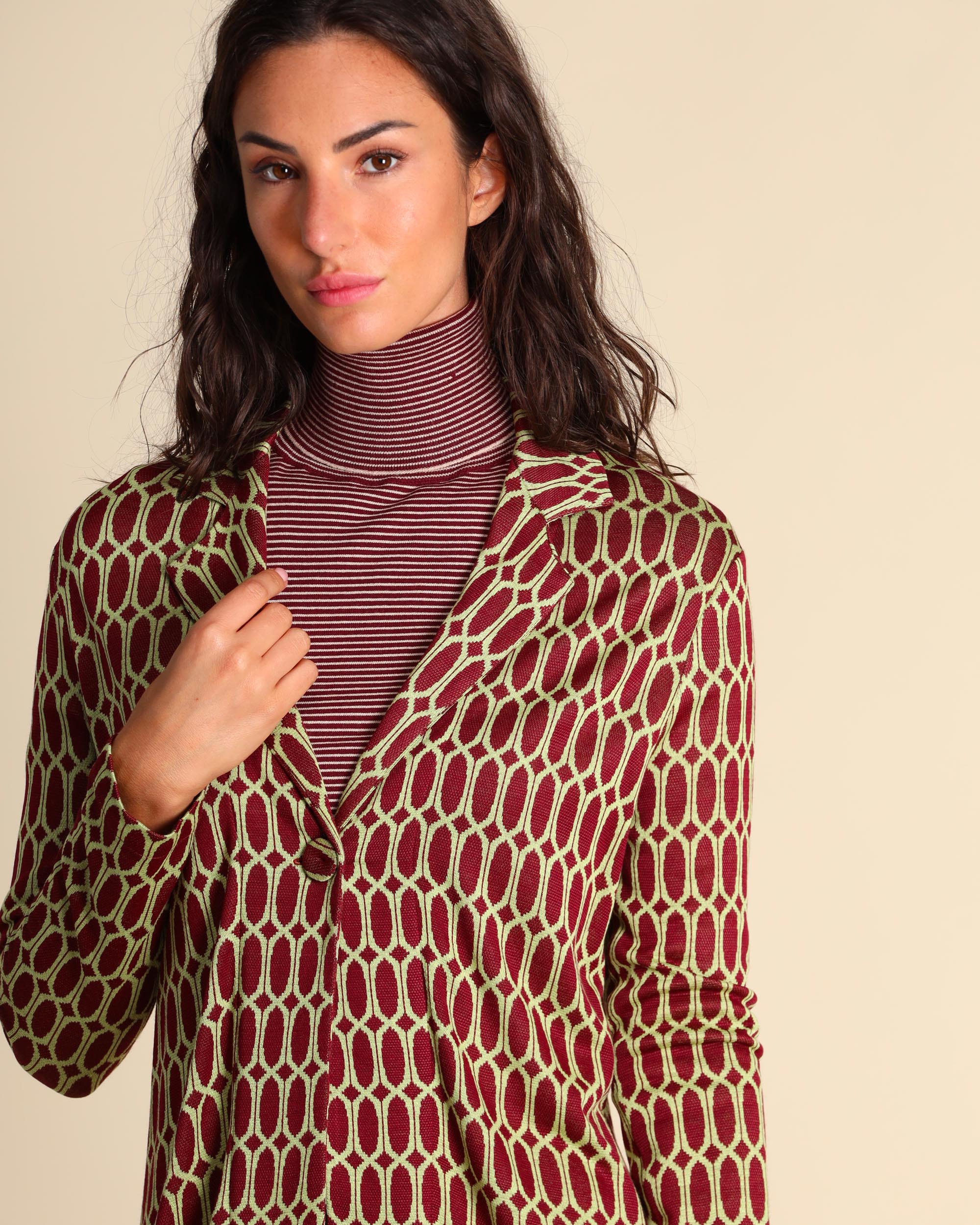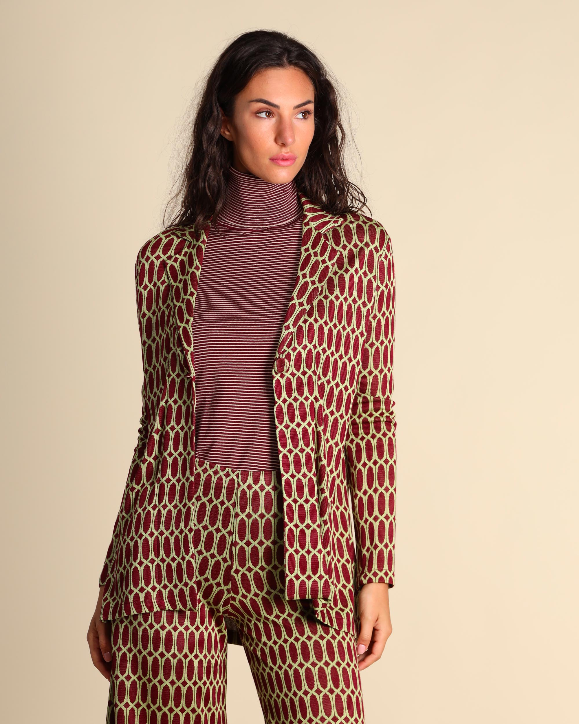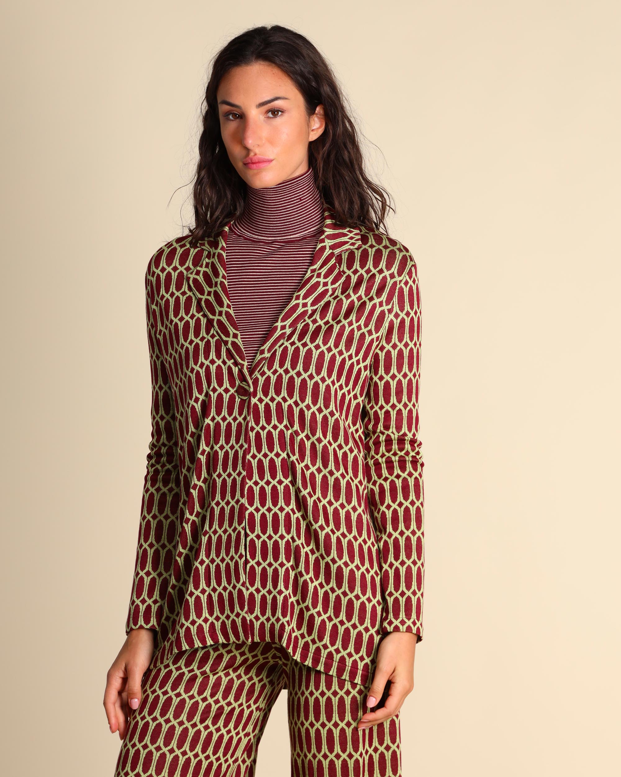 Giacca a fantasia bordeaux in jersey di viscosa stretch, collo a rever, maniche lunghe, linea dritta, chiusura con bottone,ricoperto, sfoderata, made in Italy, la modella indossa una tg.S, la modella ha le seguenti misure: altezza 178, seno 86,vita 65, fianchi 93, collezione donna Justmine Autunno Inverno 2025/26