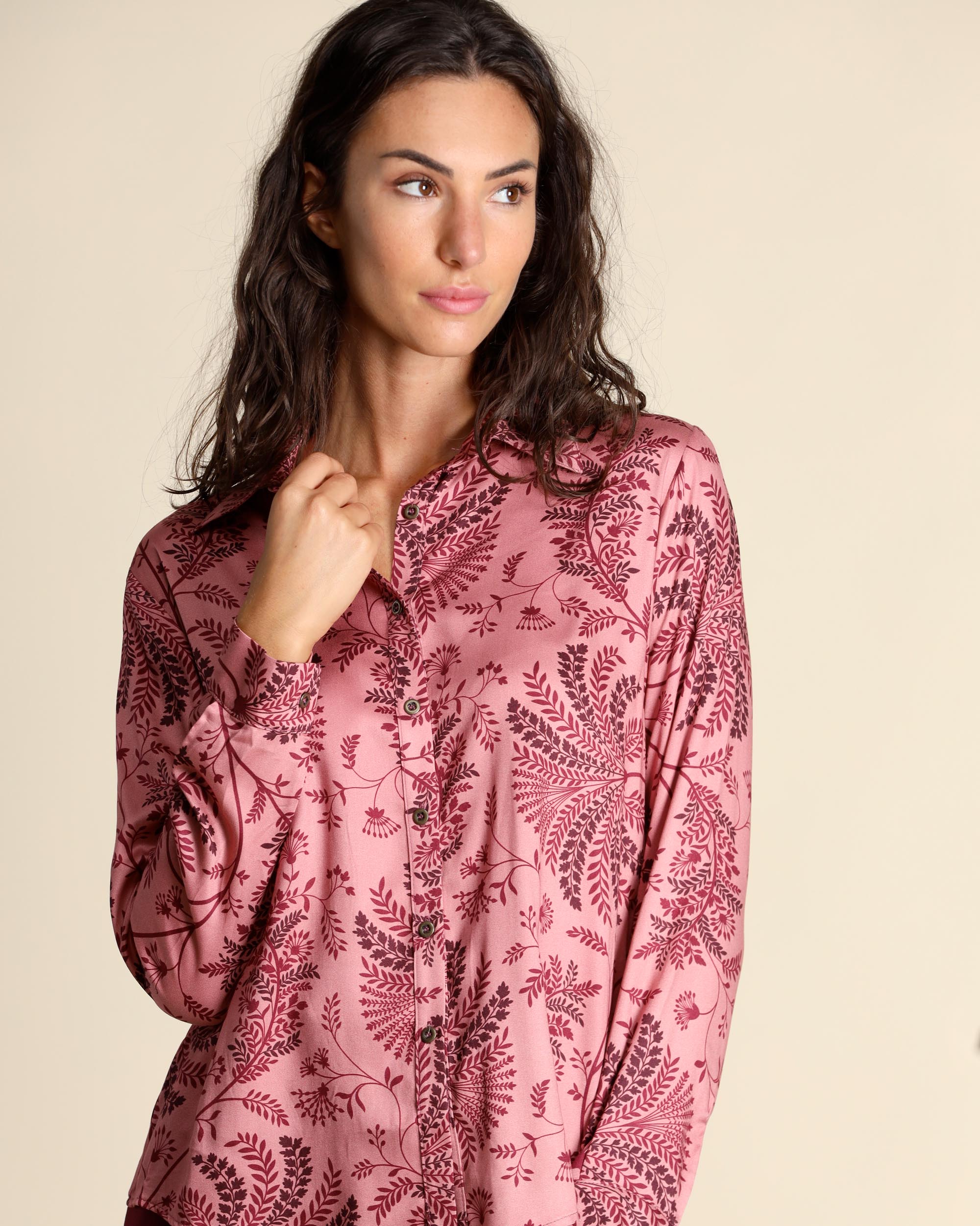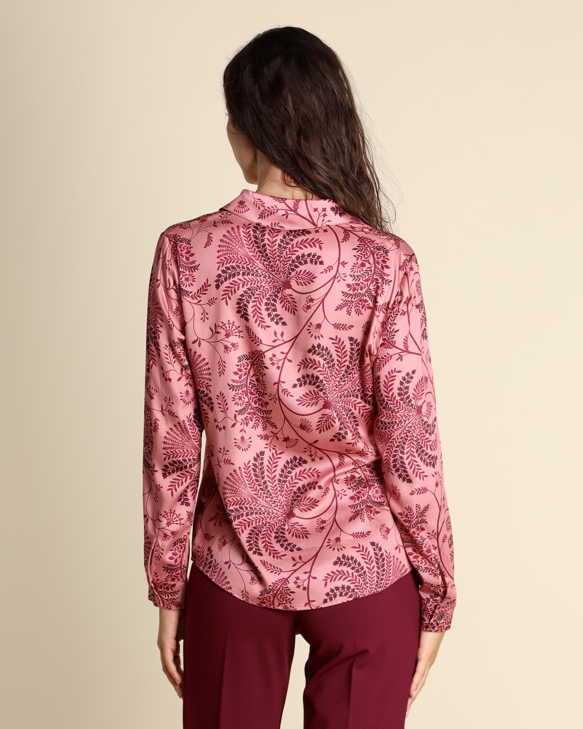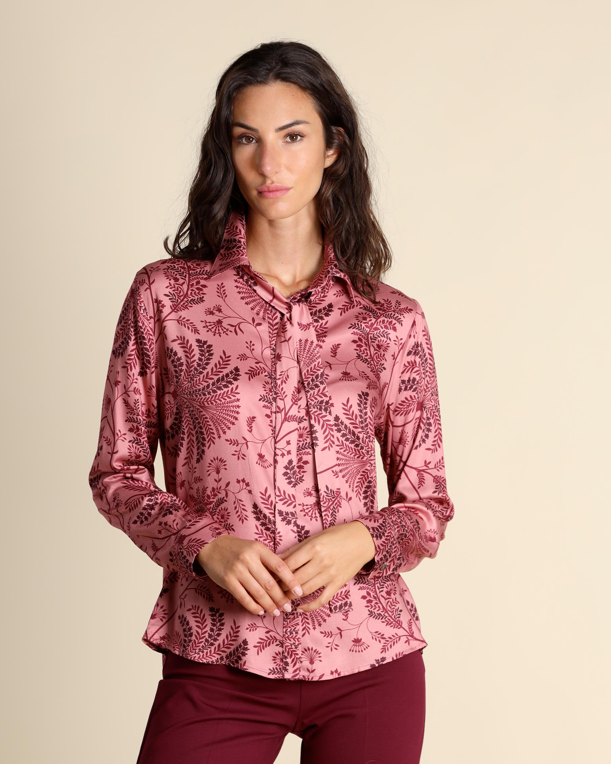 Camicia rosa a fantasia bordeaux in viscosa, collo a camicia, maniche lunghe con polsino, linea dritta, dettaglio di nastro nel collo removibile, chiusura on bottoni, made in Italy, la modella indossa una tg.S, la modella ha le seguenti misure: altezza 178, seno 86,vita 65, fianchi 93, collezione donna Justmine Autunno Inverno 2025/26