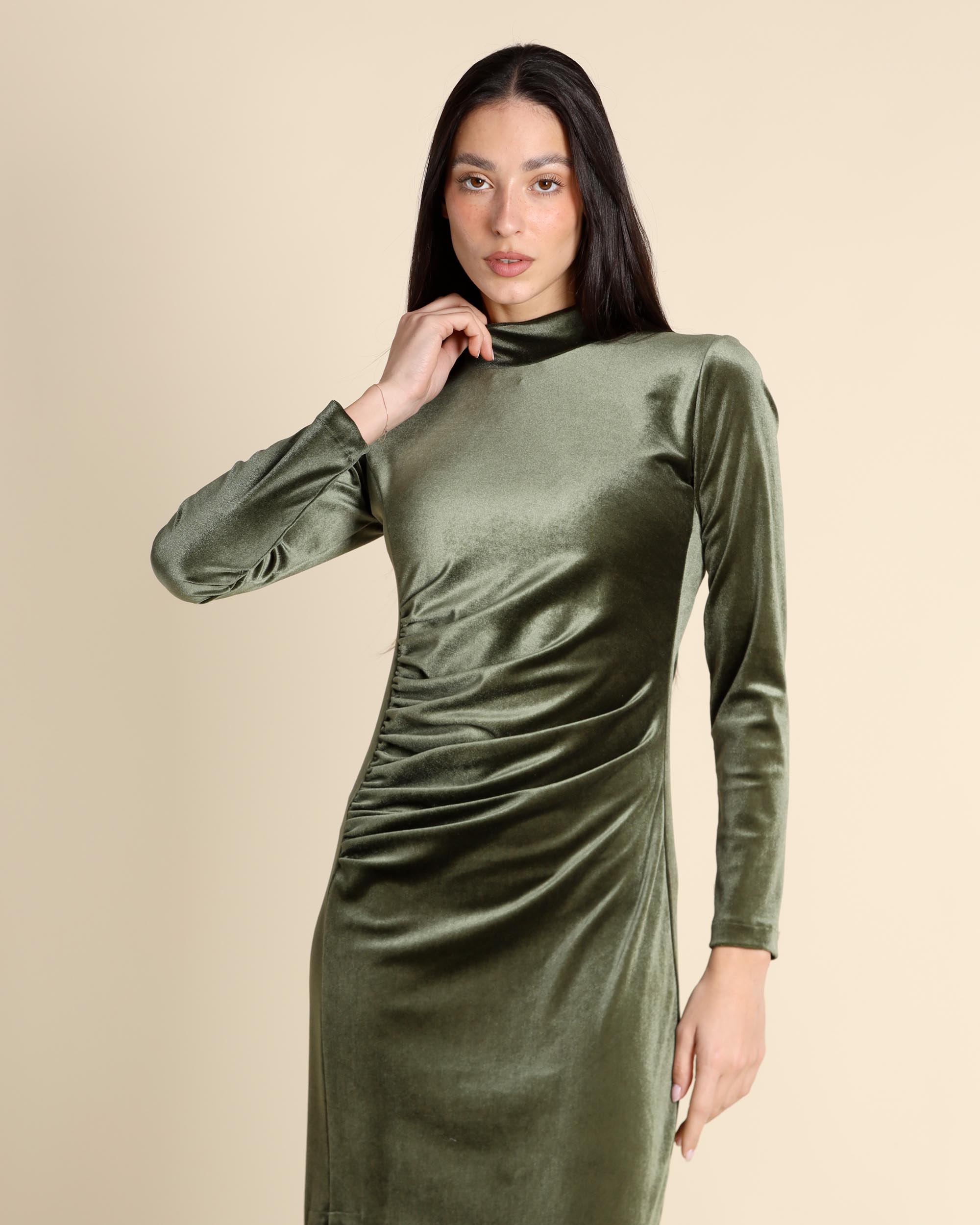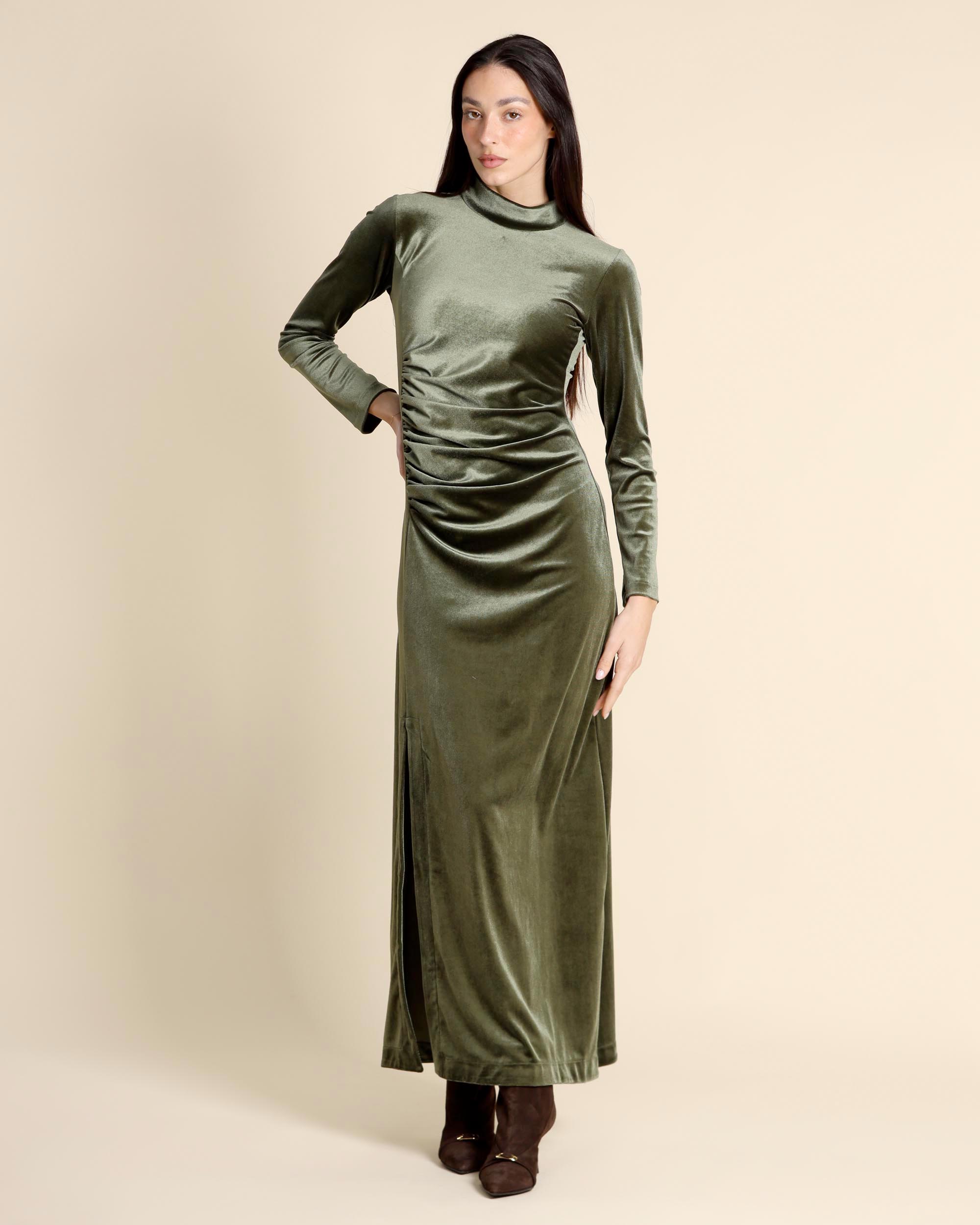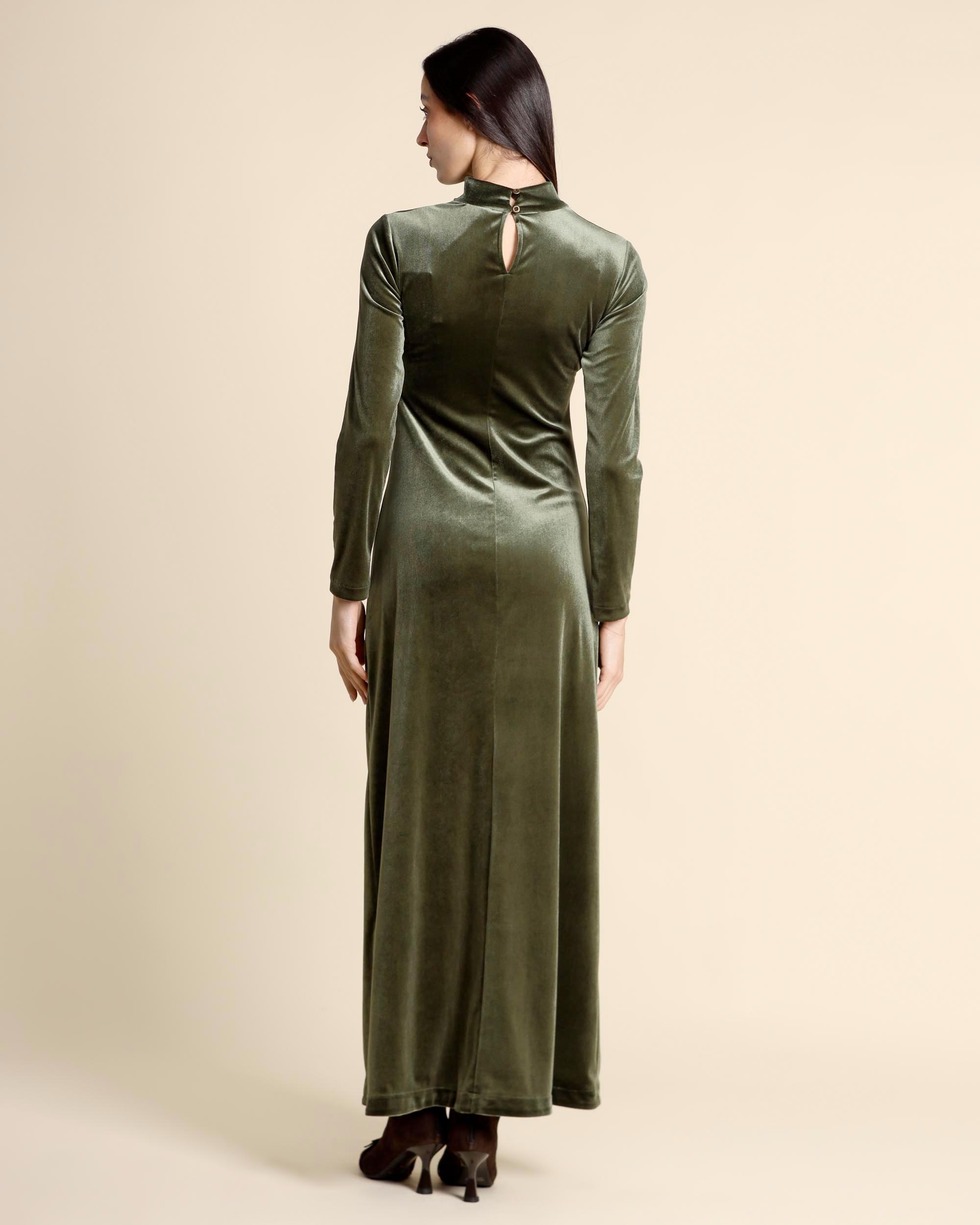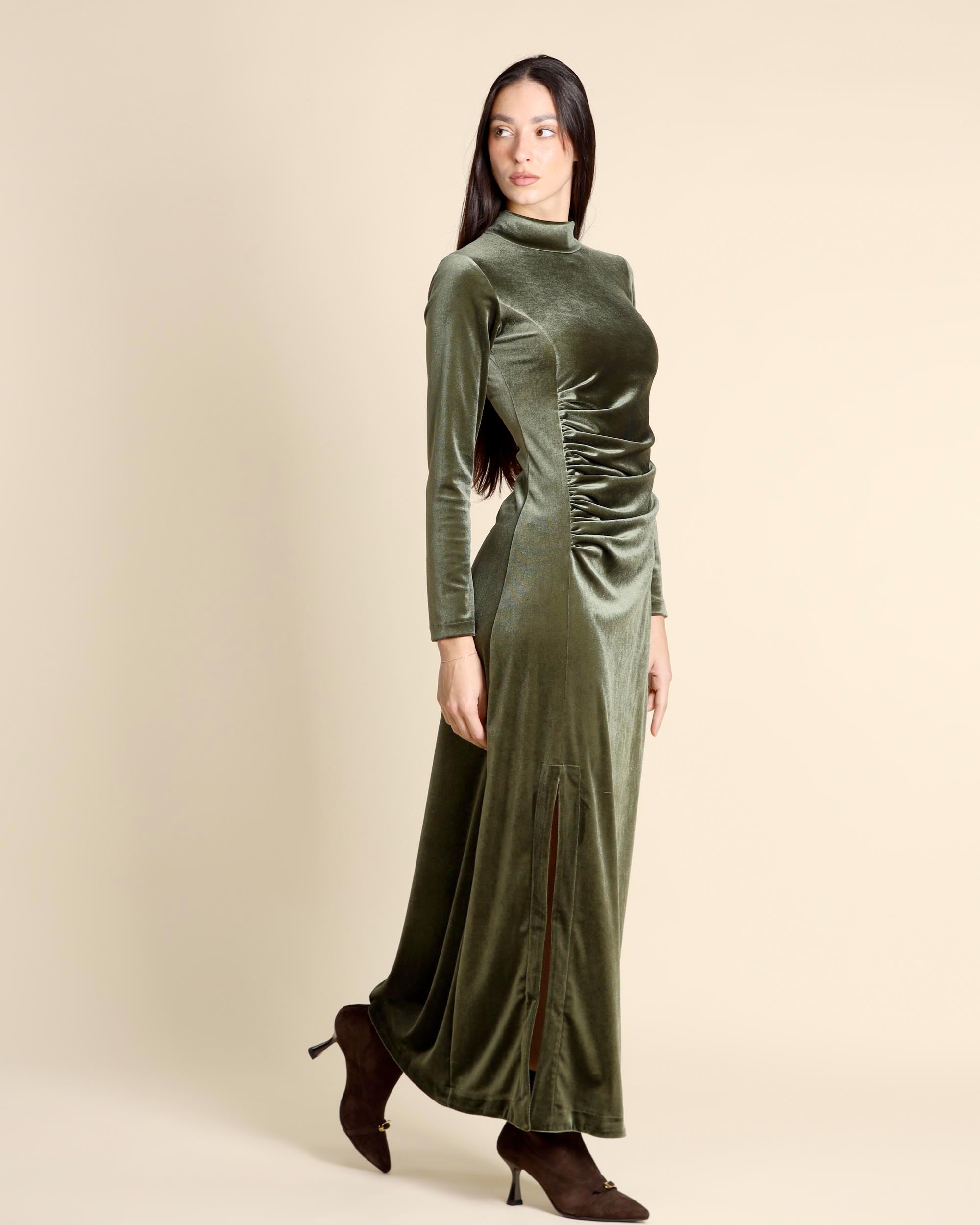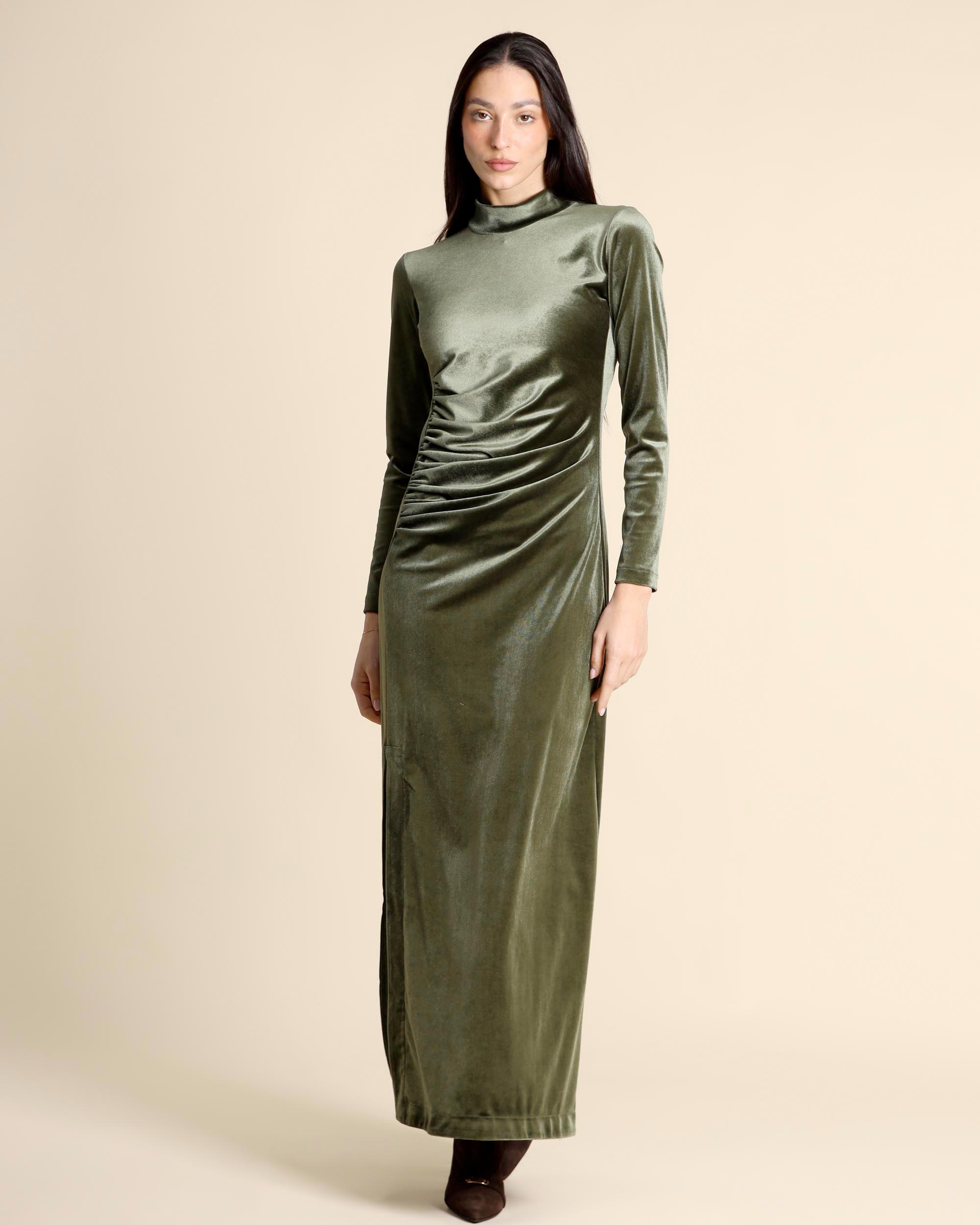 Abito lungo verde in jersey di velluto stretch, collo alto, maniche tre quarti, linea semiaderente, sfoderato, spacchi laterali, made in Italy, la modella indossa una tg.S, la modella ha le seguenti misure: altezza 178, seno 86,vita 65, fianchi 93, collezione donna Justmine Autunno Inverno 2025/26
