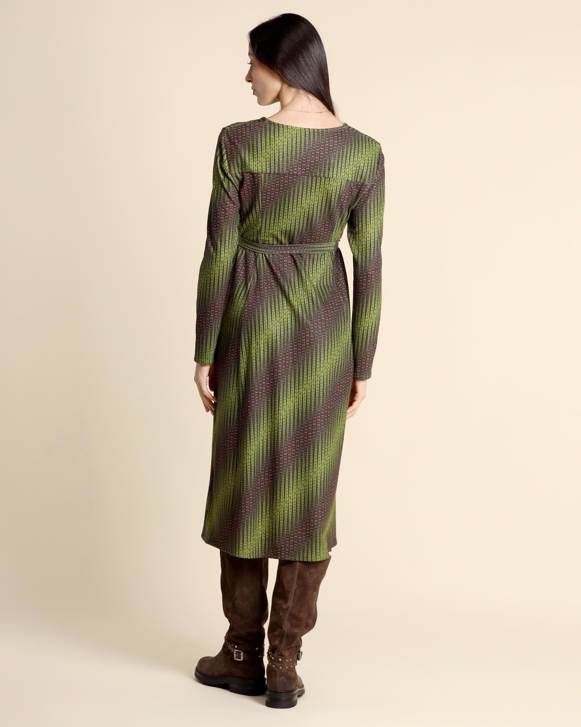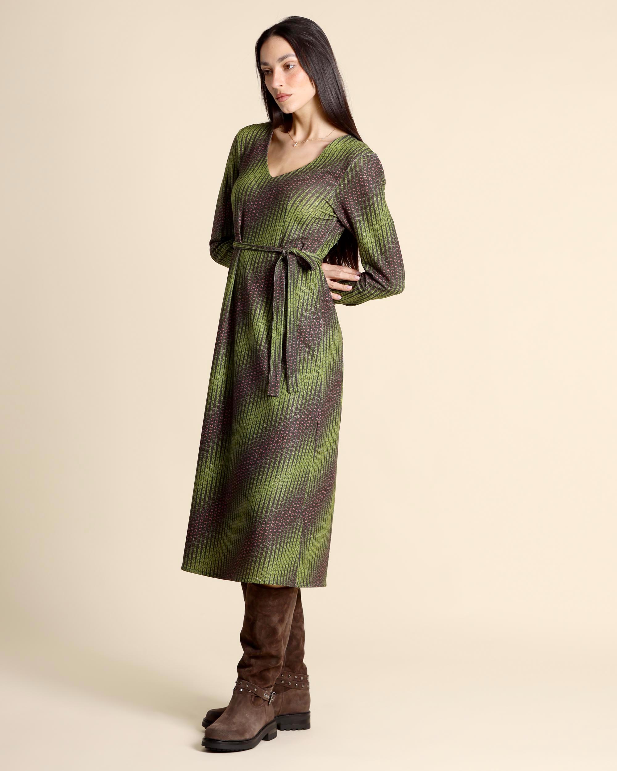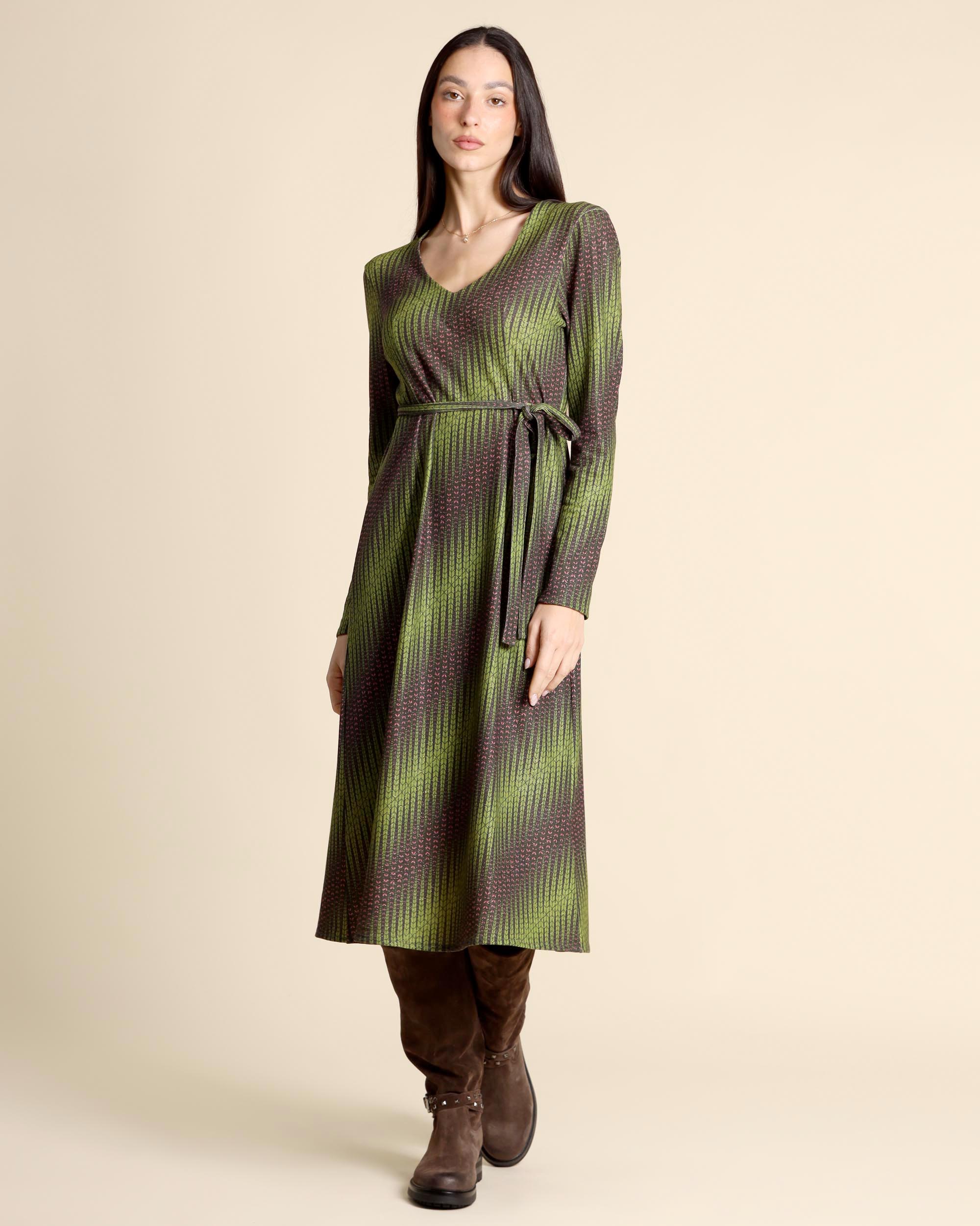 Abito a fantasia verde oliva in jersey di viscosa stretch, scollo a V, maniche lunghe, linea asciutta nel busto e leggermente svasata sul fondo, sfoderato, cintura coordinata, made in Italy, la modella indossa una tg.S, la modella ha le seguenti misure: altezza 175, seno 86,vita 65, fianchi 93, collezione donna Justmine Autunno Inverno 2025/26