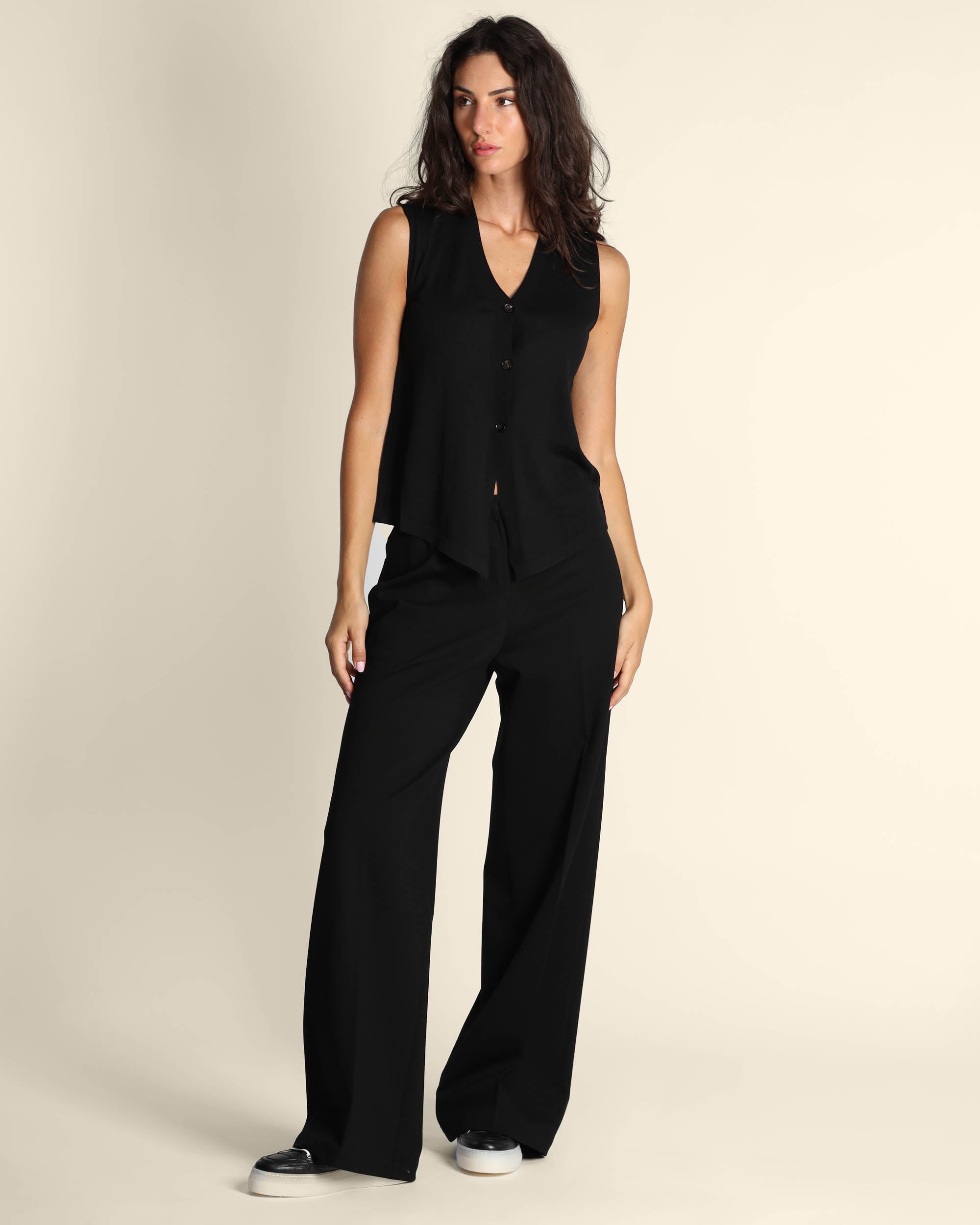 Gilet nero in maglia di lana merinos extrafine, chiusura con bottoni, senza maniche, scollo a V, linea dritta, made in Italy, Elisa indossa una tg.S, Elisa ha le seguenti misure: altezza 179, seno 84, vita 63, fianchi 94, collezione donna Liviana Conti Autunno Inverno 2025/26