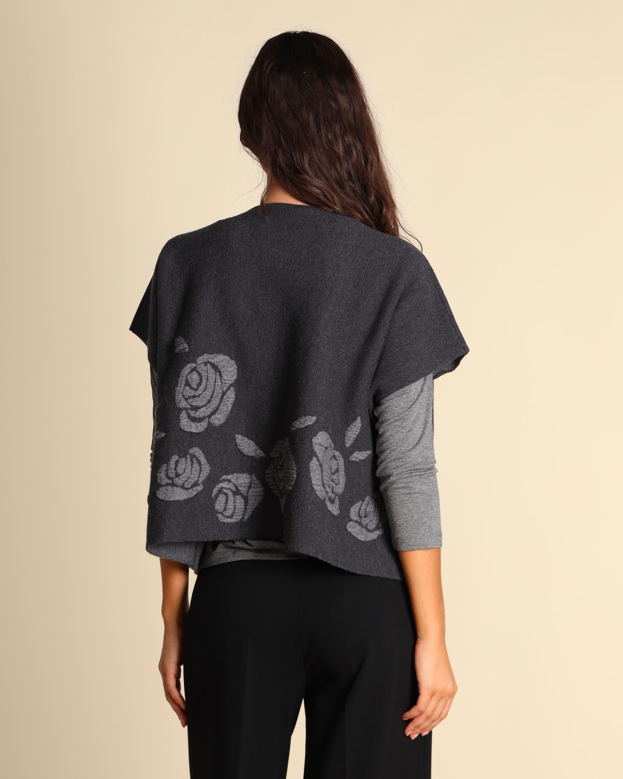 Maglia grigio antracite jacquard in pura lana vergine effetto lana cotta, collo a barchetta, maniche corte, linea ampia, dettaglio di rose tono su tono, made in Italy, la modella indossa una tg.S, la modella ha le seguenti misure: altezza 179, seno 84, vita 63, fianchi 94, collezione donna Liviana Conti Autunno Inverno 2025/26
