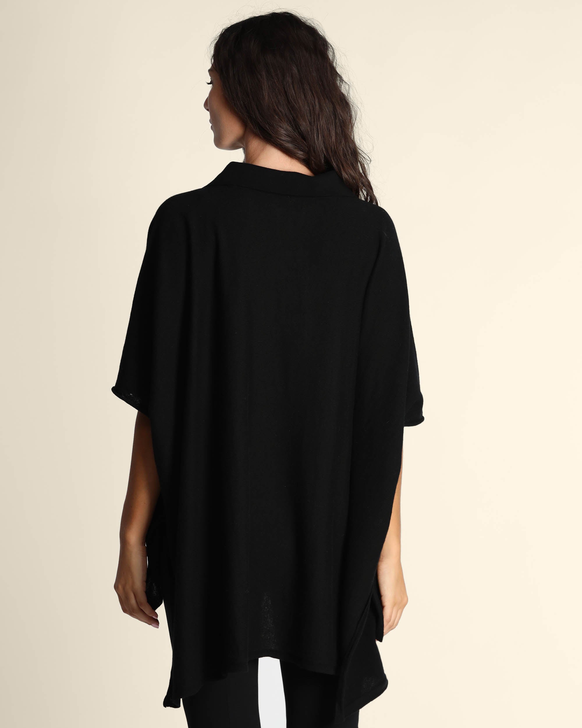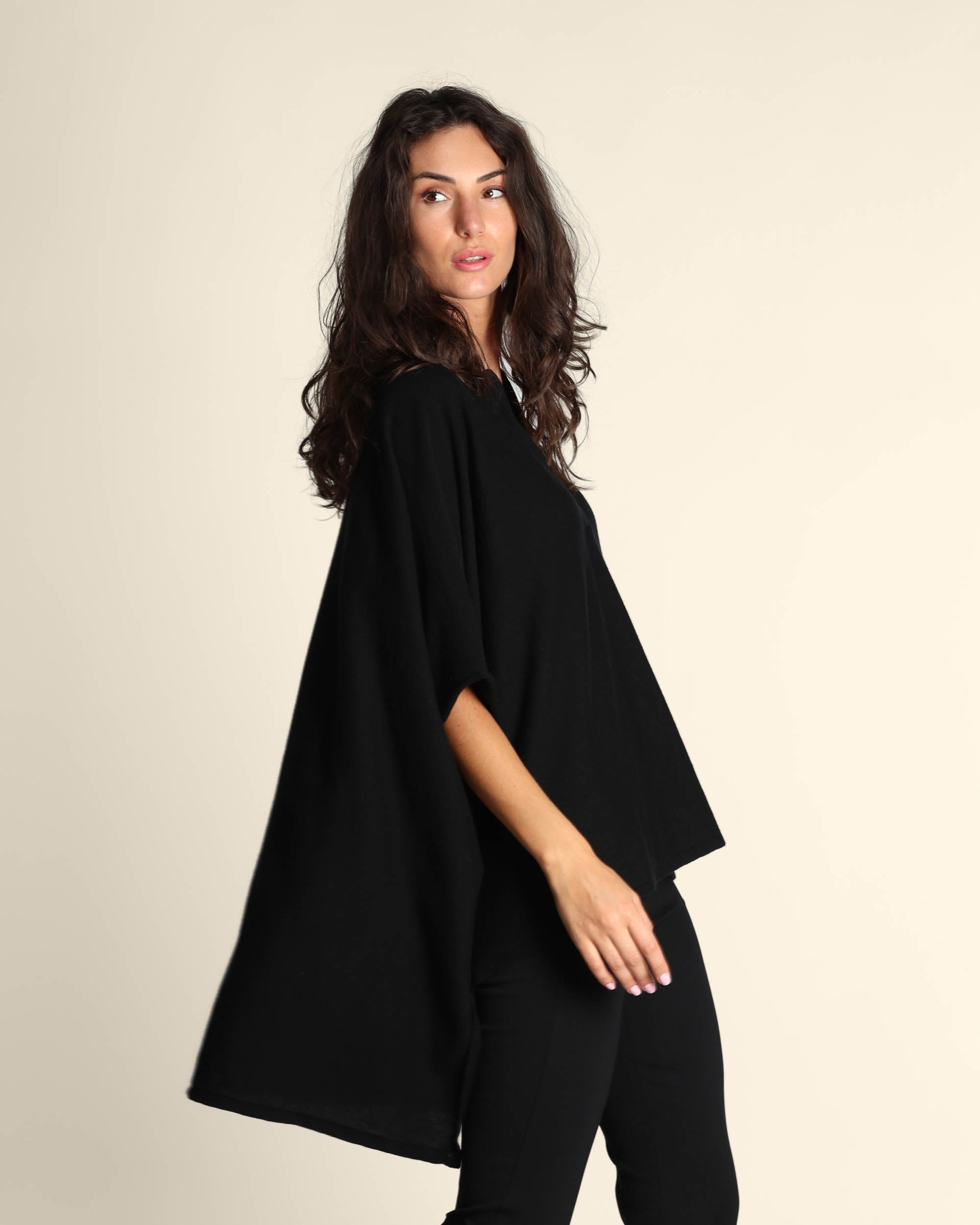 Maglia oversize nera in lana merinos cardata, maniche al gomito, collo a camicia con scollatura a V, spacchi laterali, linea ampia, fondo più lungo sul dietro, made in Italy, Elisa indossa una tg.S-M, Elisa ha le seguenti misure: altezza 179, seno 84, vita 63, fianchi 94, collezione donna Liviana Conti Autunno Inverno 2025/26