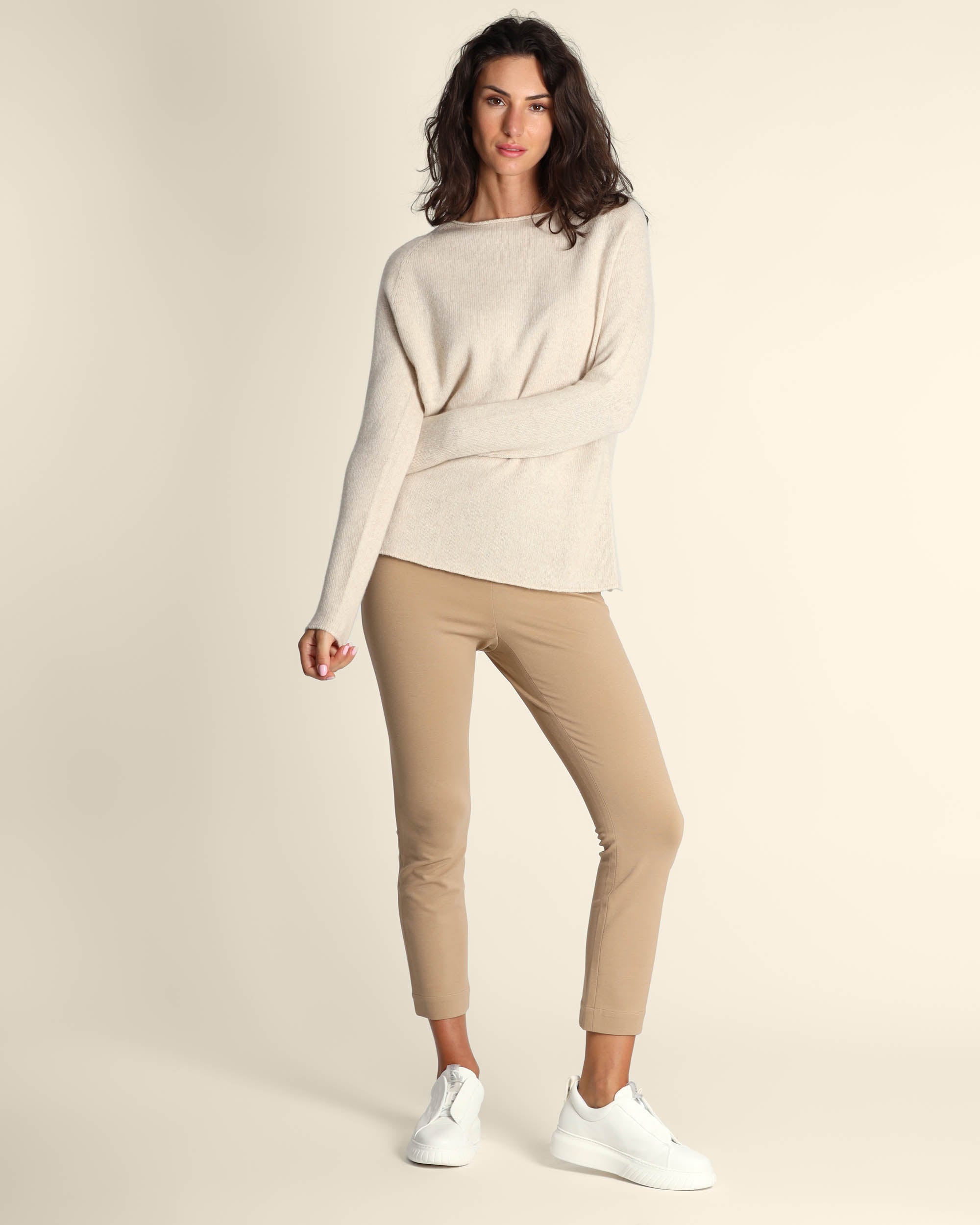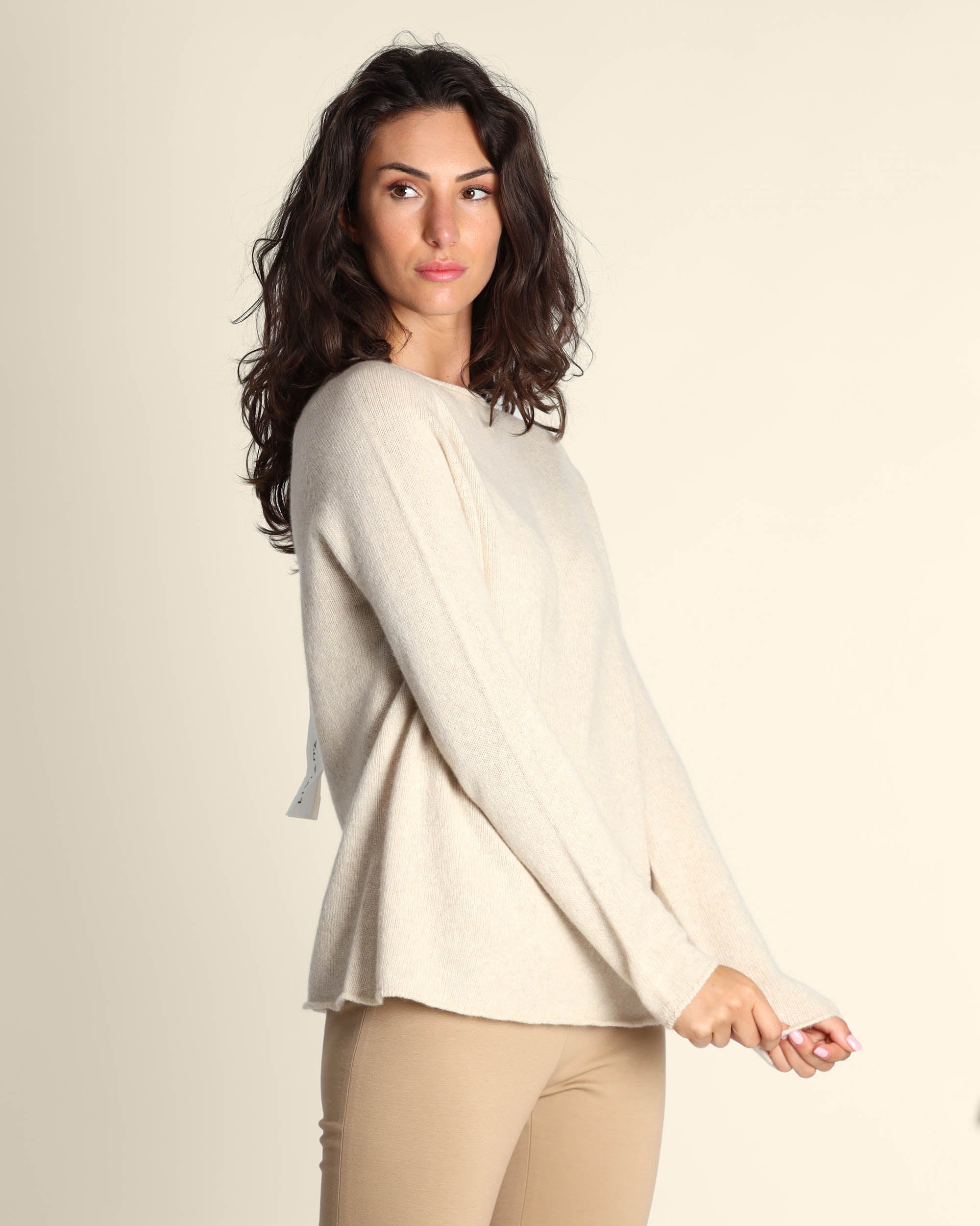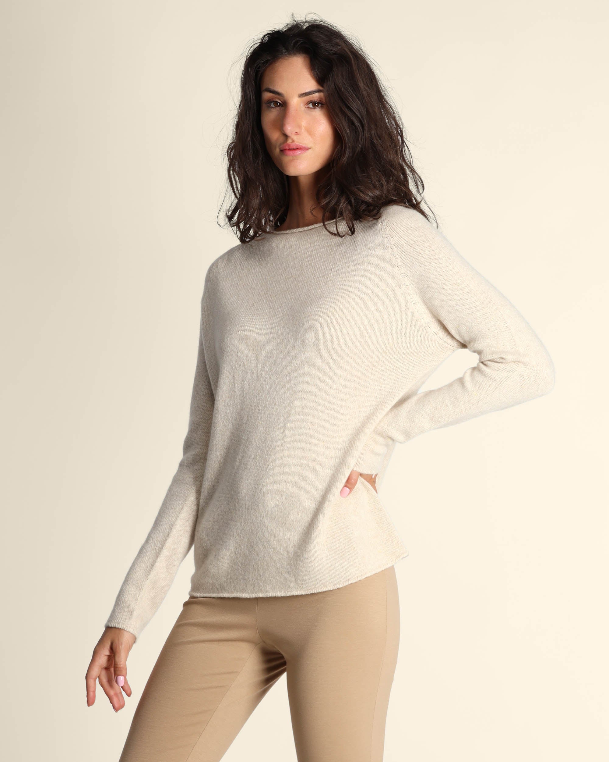 Maglia in cachemire, seta e lana color cacha melange, scollo a barchetta, maniche lunghe raglan, linea dritta, made in Italy, Elisa indossa una tg.S, Elisa ha le seguenti misure: altezza 179, seno 84, vita 63, fianchi 94, collezione donna Liviana Conti Autunno Inverno 2025/26