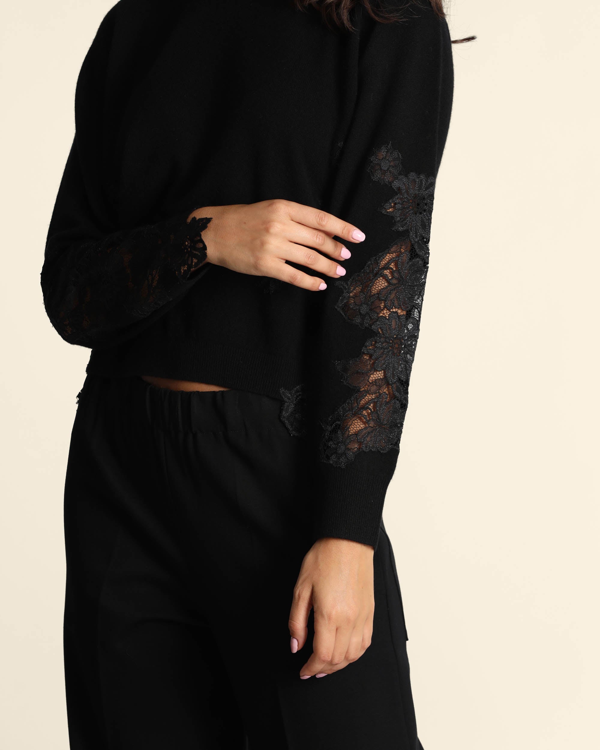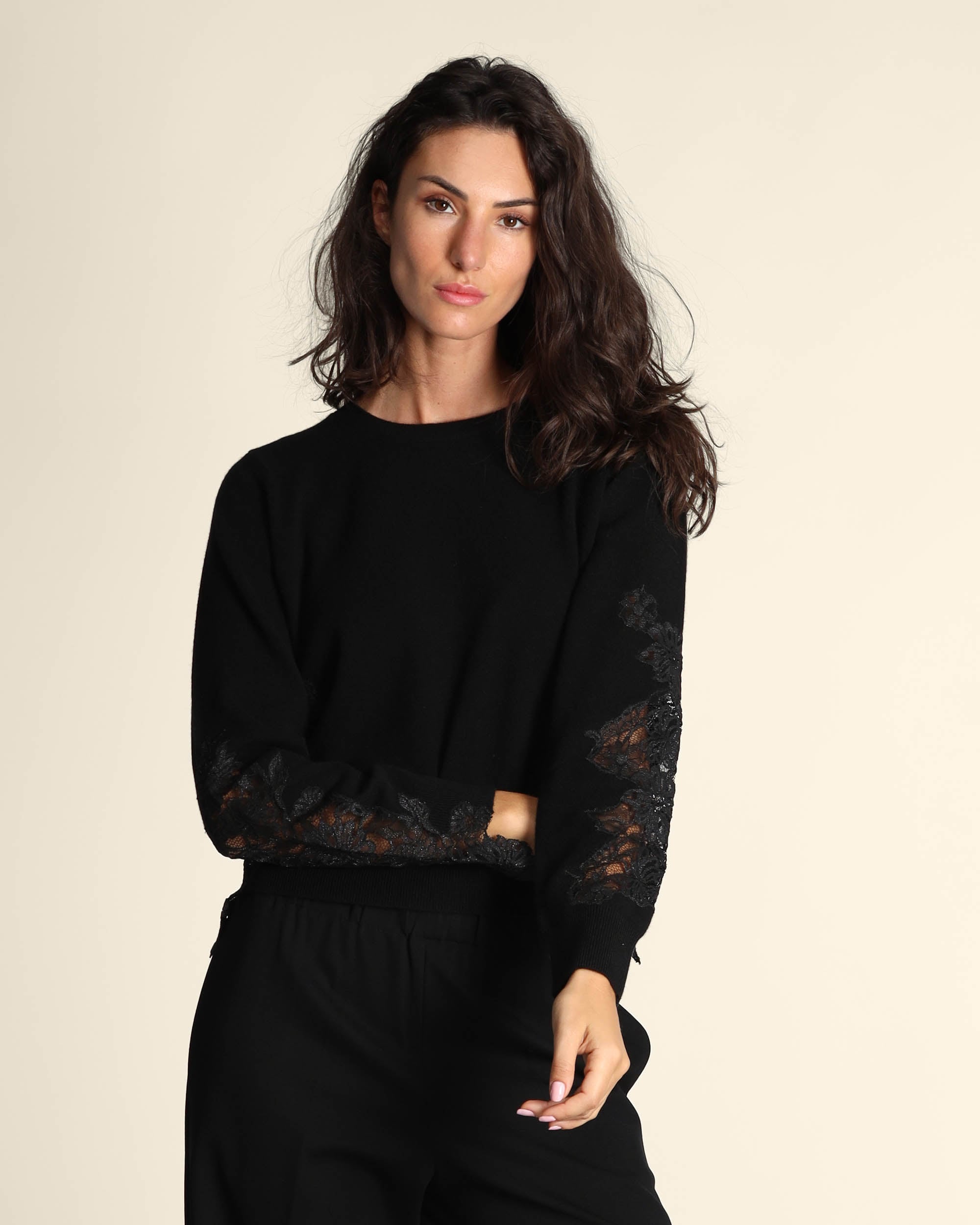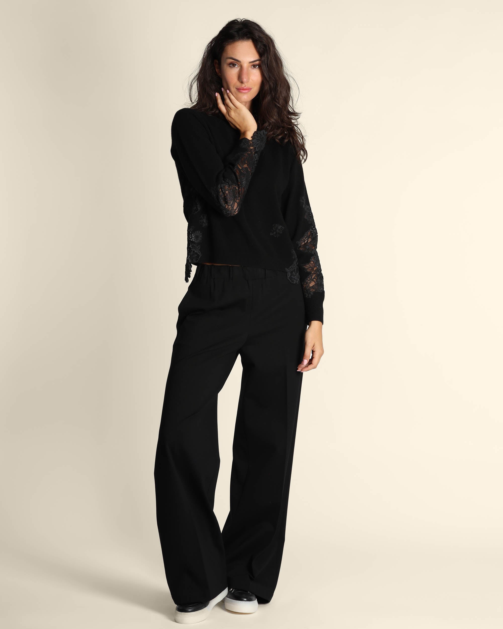 Maglia nera in lana con inserti in pizzo tono su tono, maniche lunghe, scollo tondo, linea dritta morbida, Elisa indossa una tg.S, Elisa ha le seguenti misure: altezza 179, seno 84, vita 63, fianchi 94, collezione donna Liviana Conti Autunno Inverno 2025/26