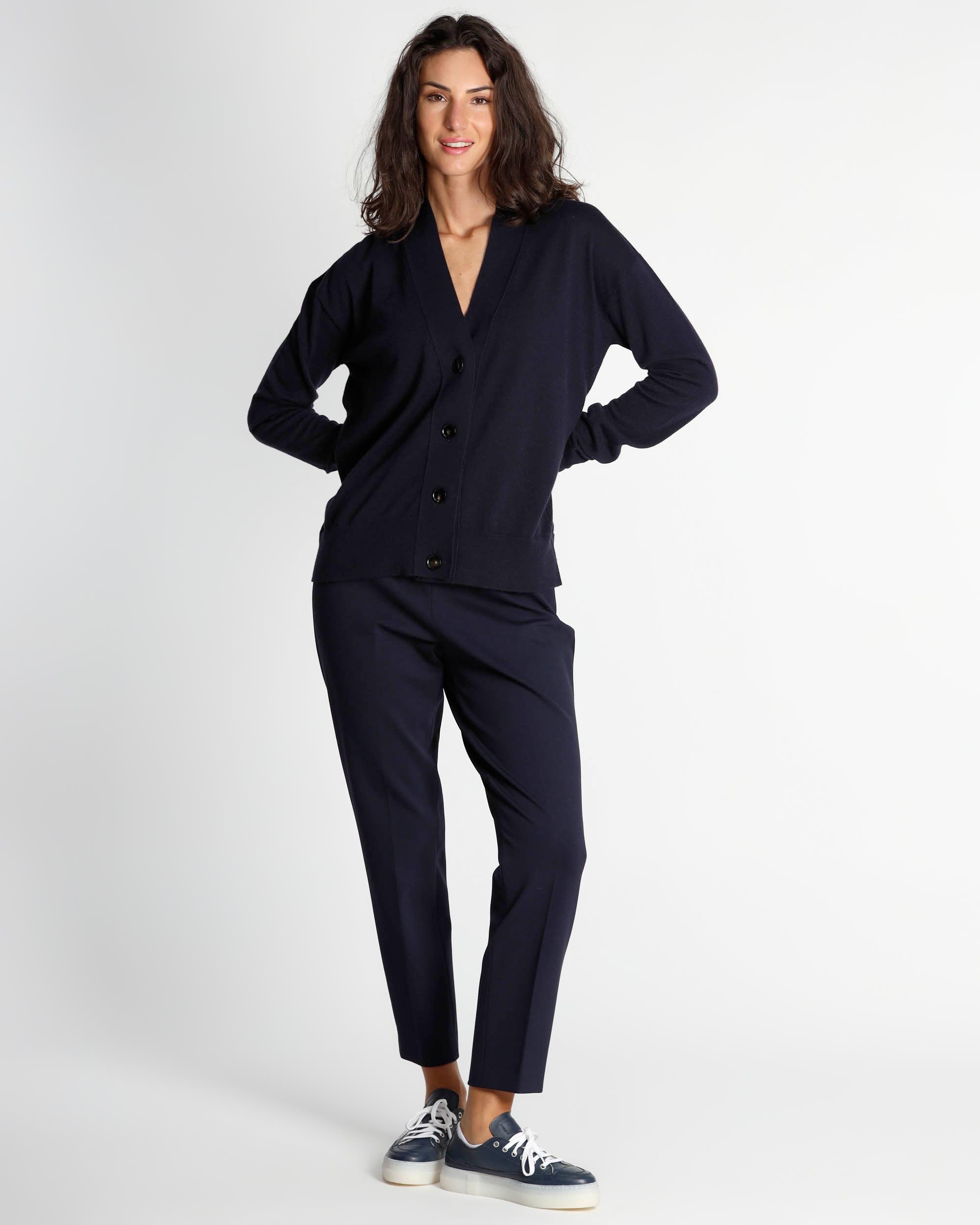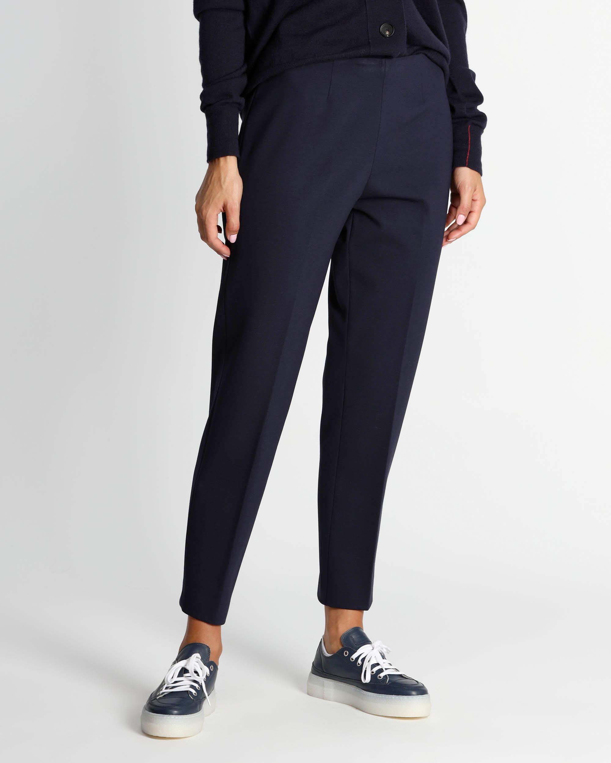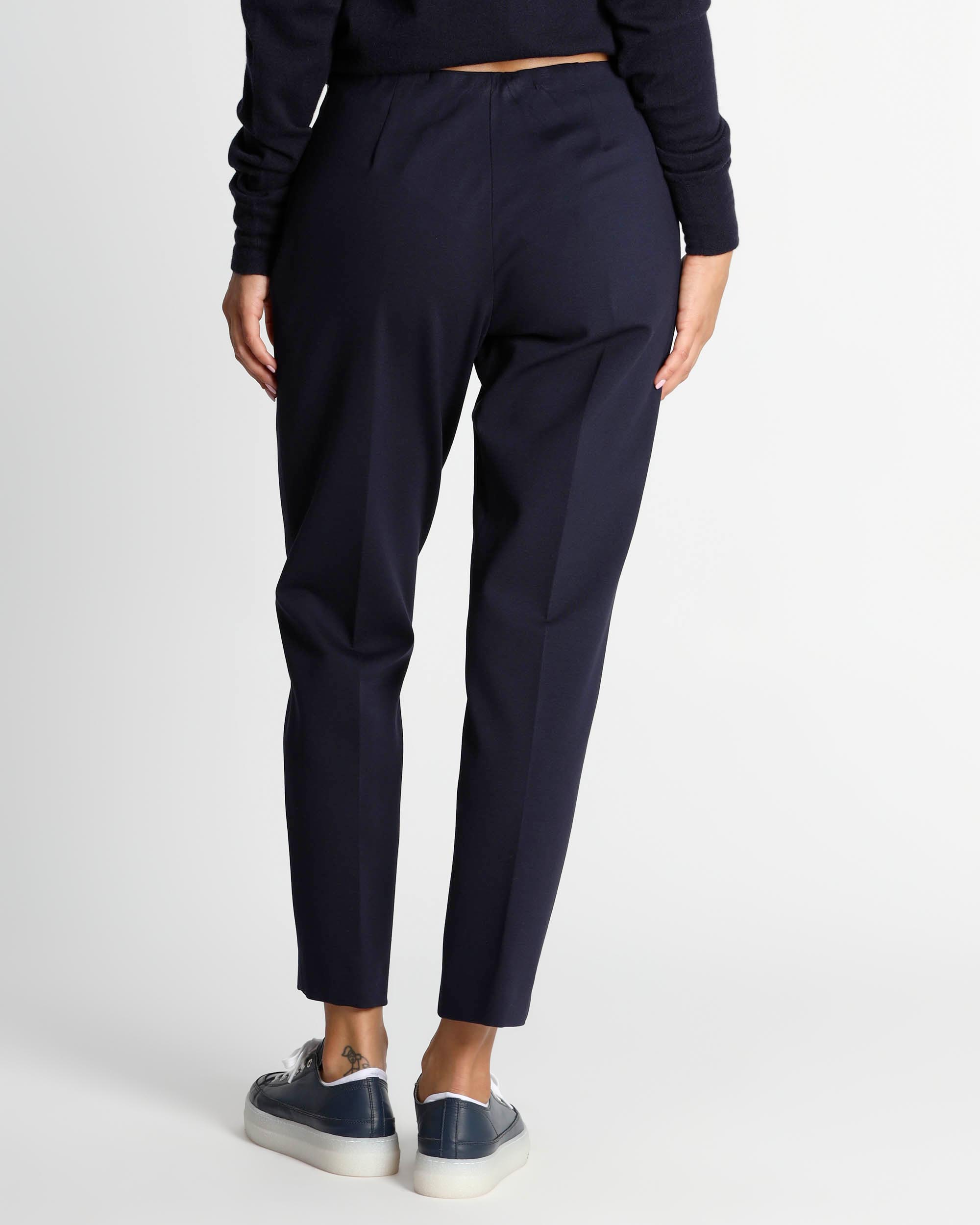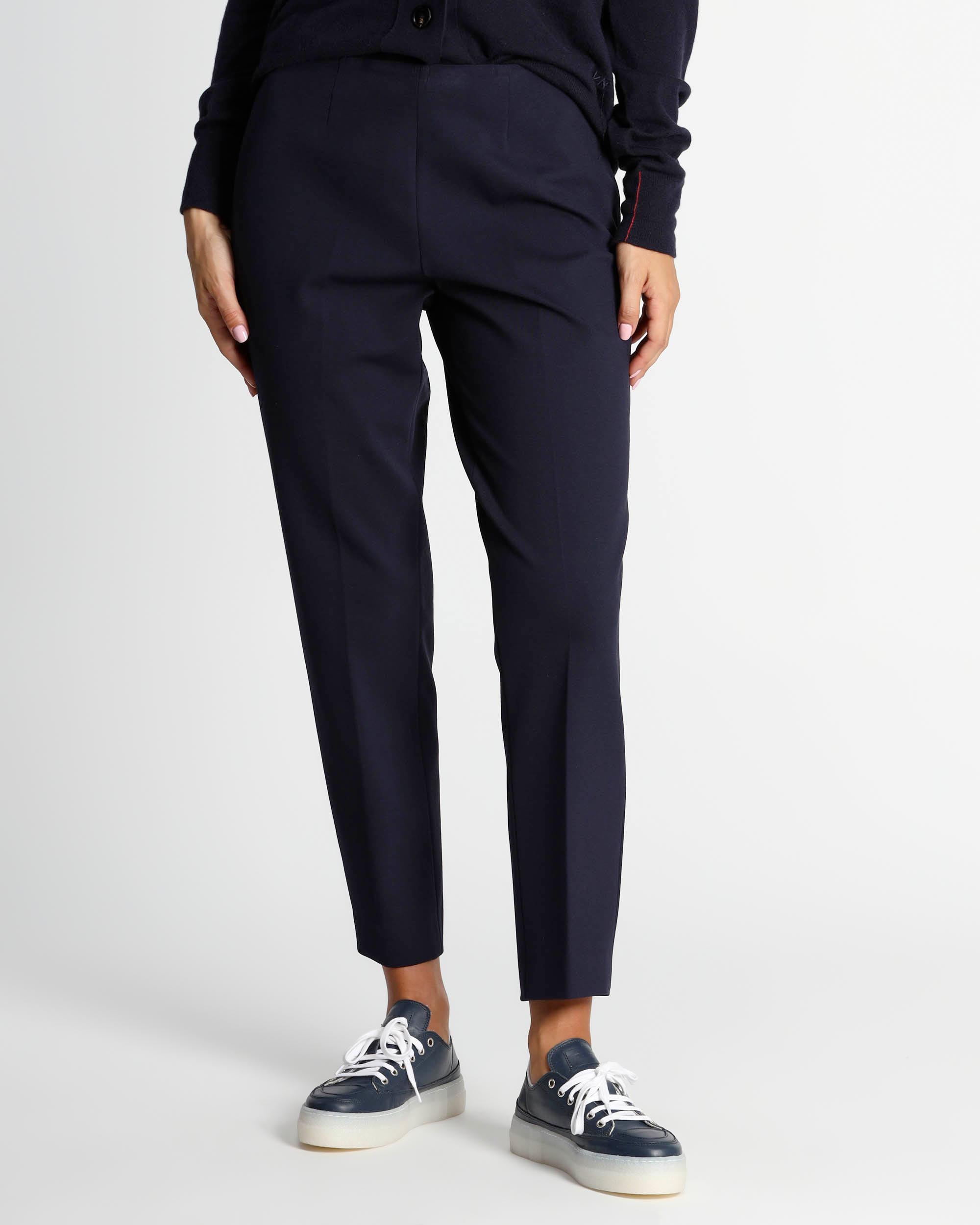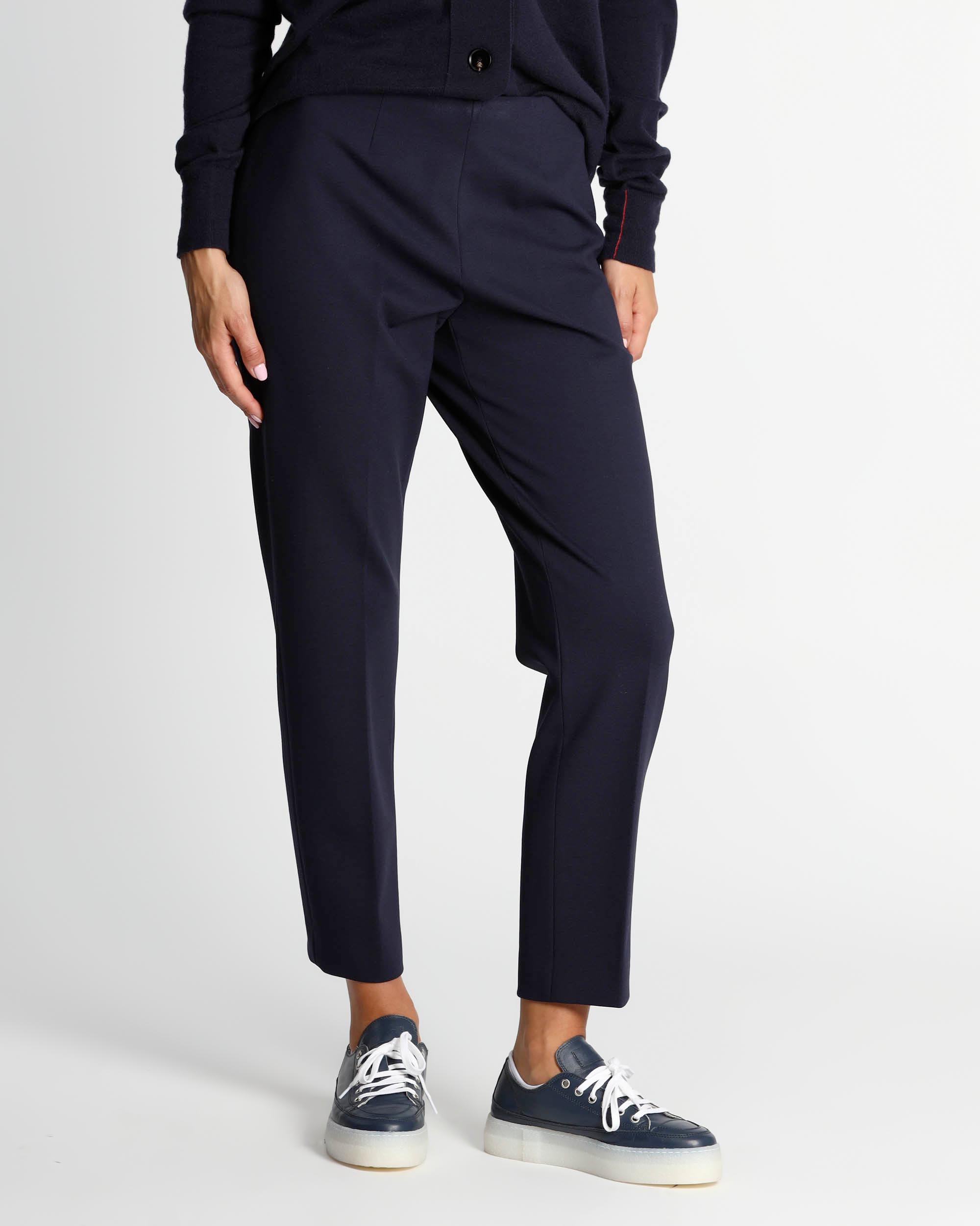 Pantaloni blu notte in punto Milano di misto viscosa stretch, vita elastica, chiusura laterale con zip invisibile, linea a sigaretta, piega stirata, made in Italy, Elisa indossa una tg.42, Elisa ha le seguenti misure: altezza 179, seno 84, vita 63, fianchi 94, collezione donna Liviana Conti Autunno Inverno 2025/26