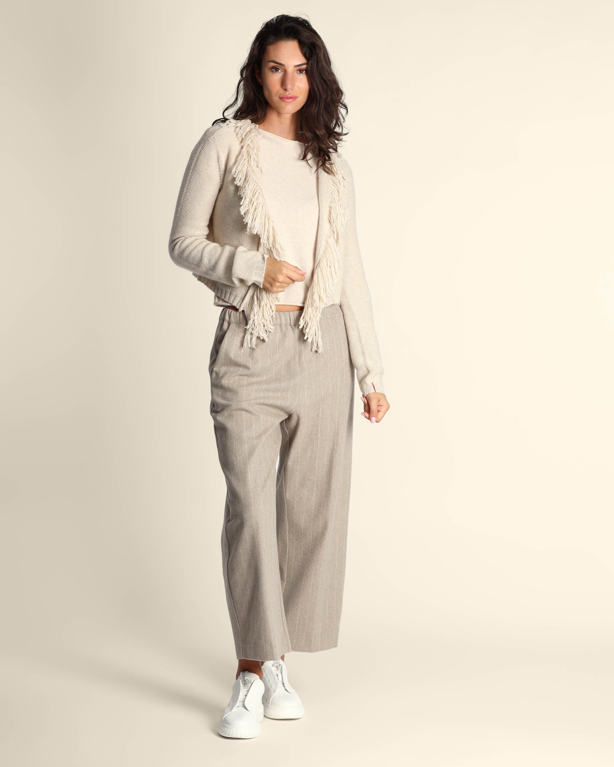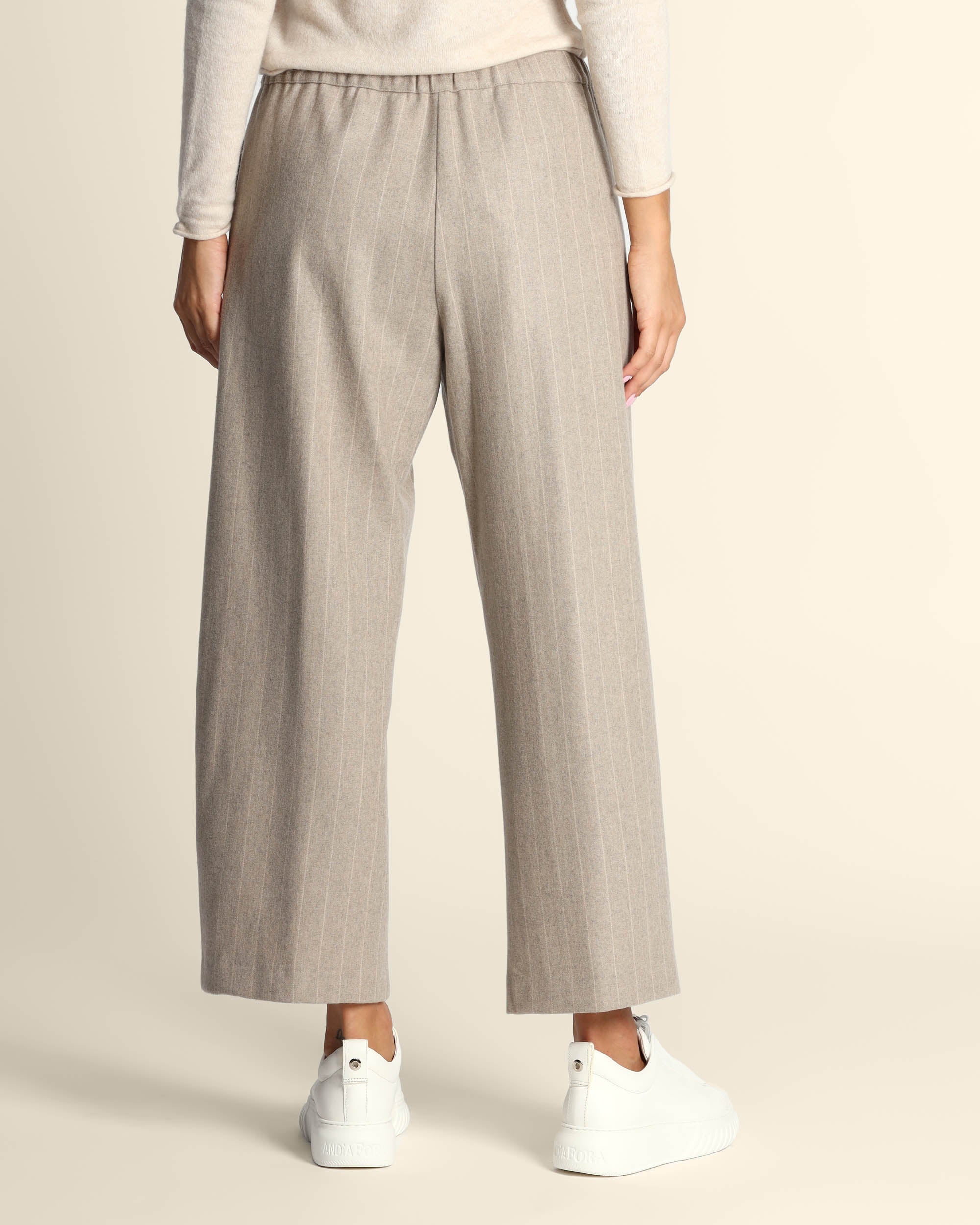 Pantaloni gessati in panno di misto cachemire color tortora, vita elastica, linea ampia cropped, piega stirata, made in Italy, Elisa indossa una tg.42, Elisa ha le seguenti misure: altezza 179, seno 84, vita 63, fianchi 94, collezione donna Liviana Conti Autunno Inverno 2025/26