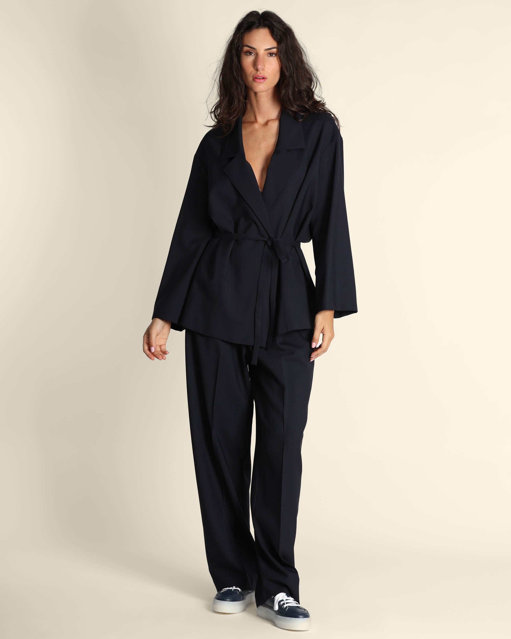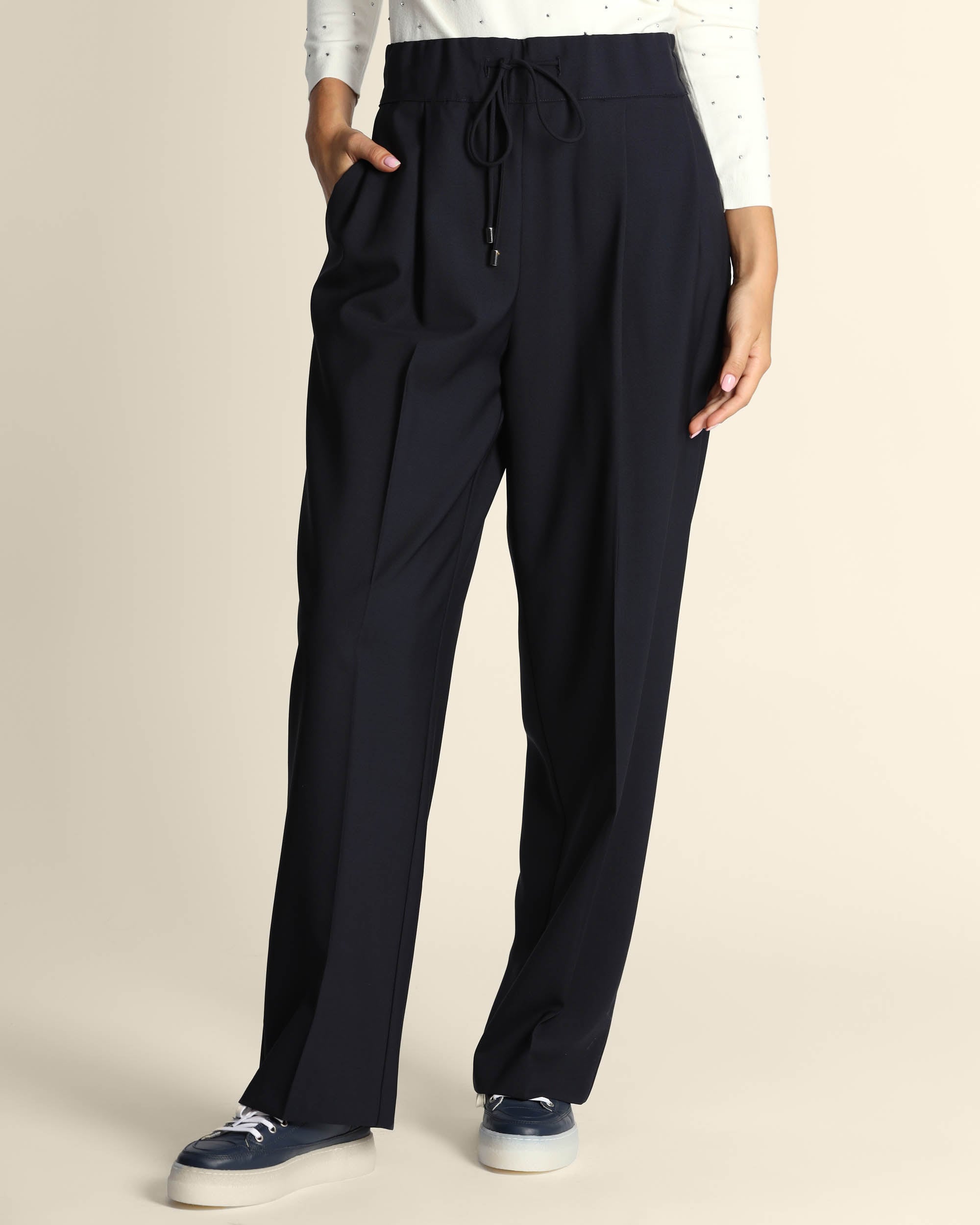 Pantaloni blu in pura lana, vita elastica con coulisse, linea ampia, tasche alla francese, piega stirata, made in Italy, Elisa indossa una tg.42, Elisa ha le seguenti misure: altezza 179, seno 84, vita 63, fianchi 94, collezione donna Liviana Conti Autunno Inverno 2025/26