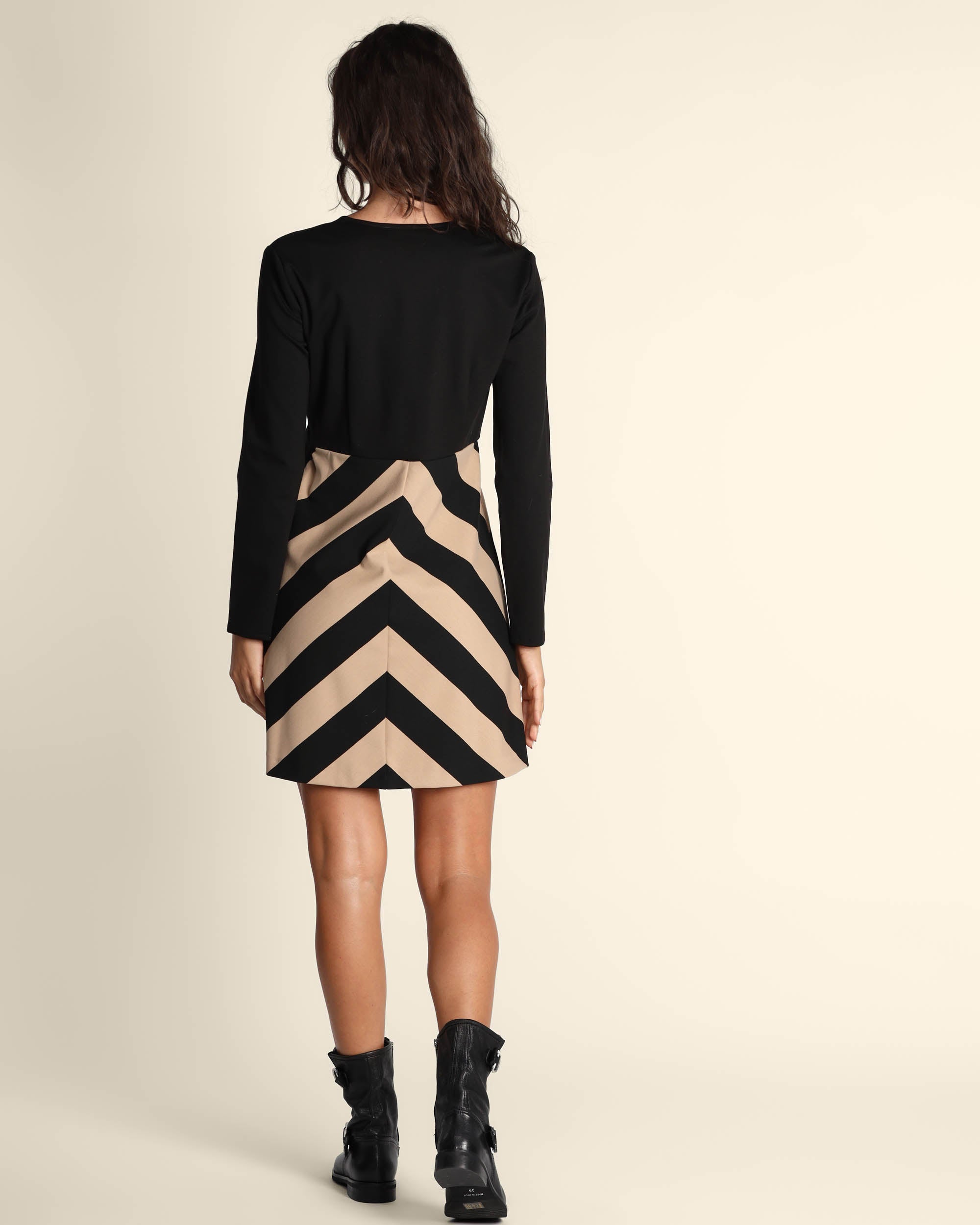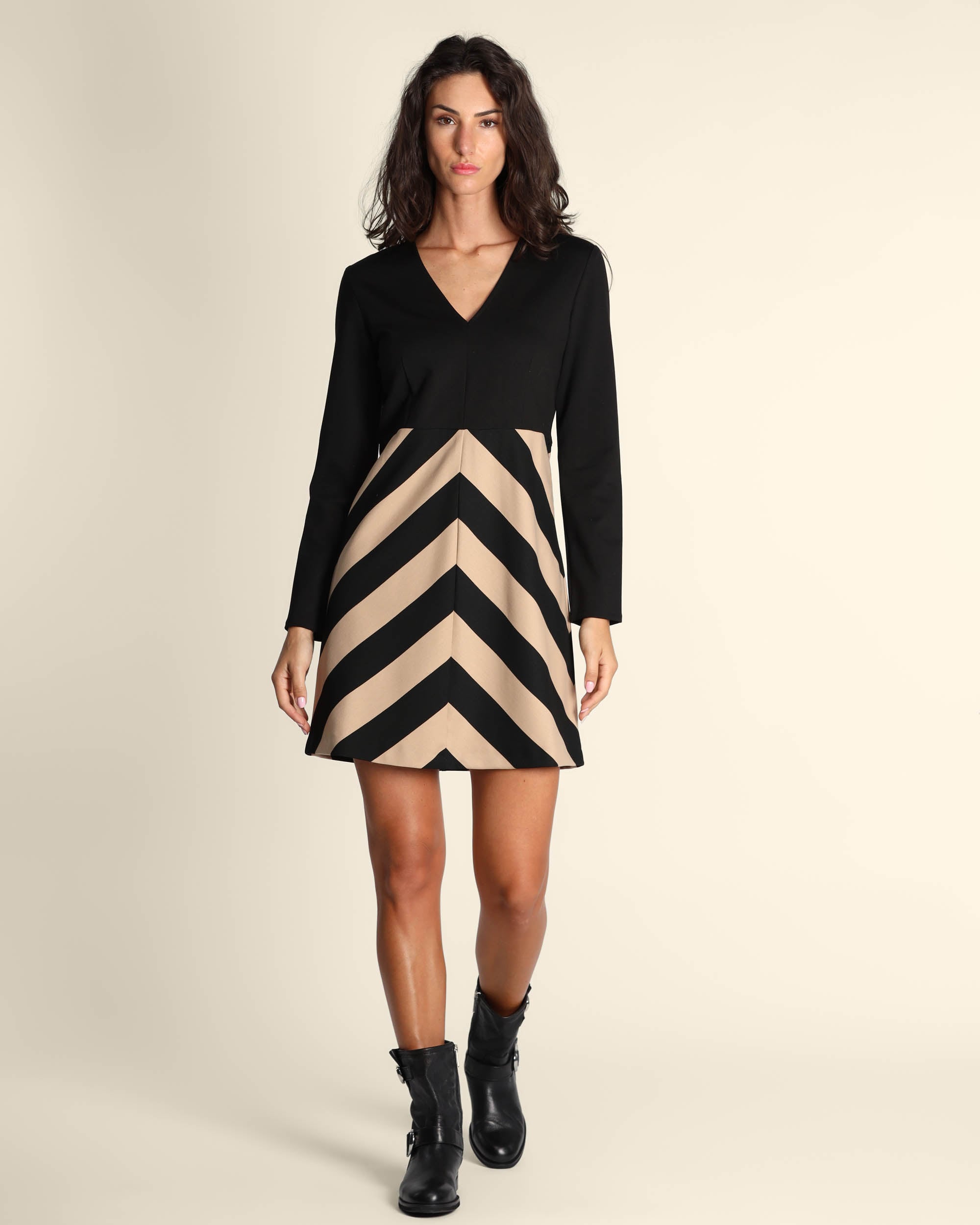 Abito nero e cammello in punto Milano di misto viscosa stretch, scollo a V, maniche lunghe, chiusura laterale con zip invisibile, linea asciutta nel busto e svasato sul fiondo, sfoderato, la modella indossa una tg.42, la modella ha le seguenti misure: altezza 178, seno 86,vita 65, fianchi 93, collezione donna Pennyblack Autunno Inverno 2025/26