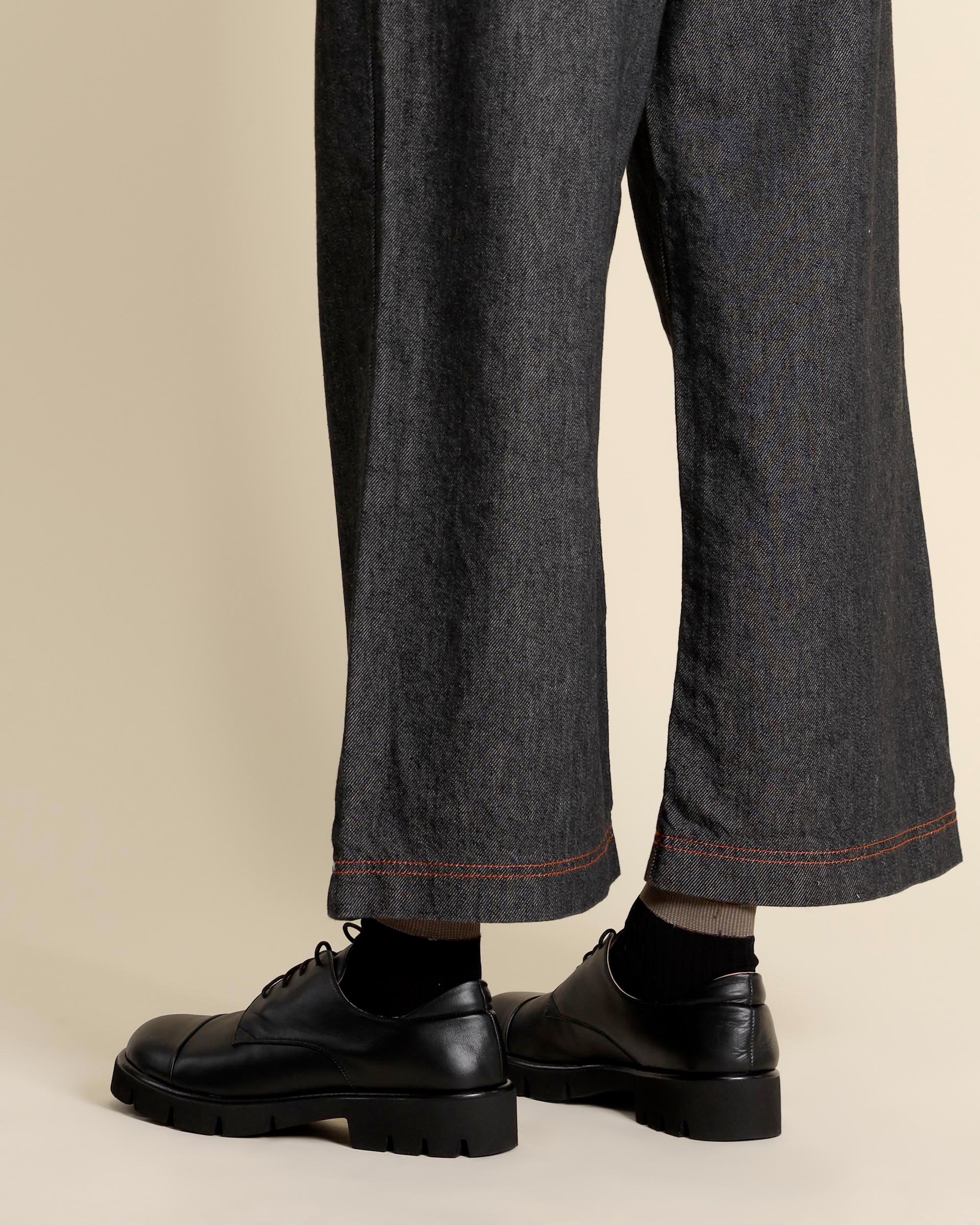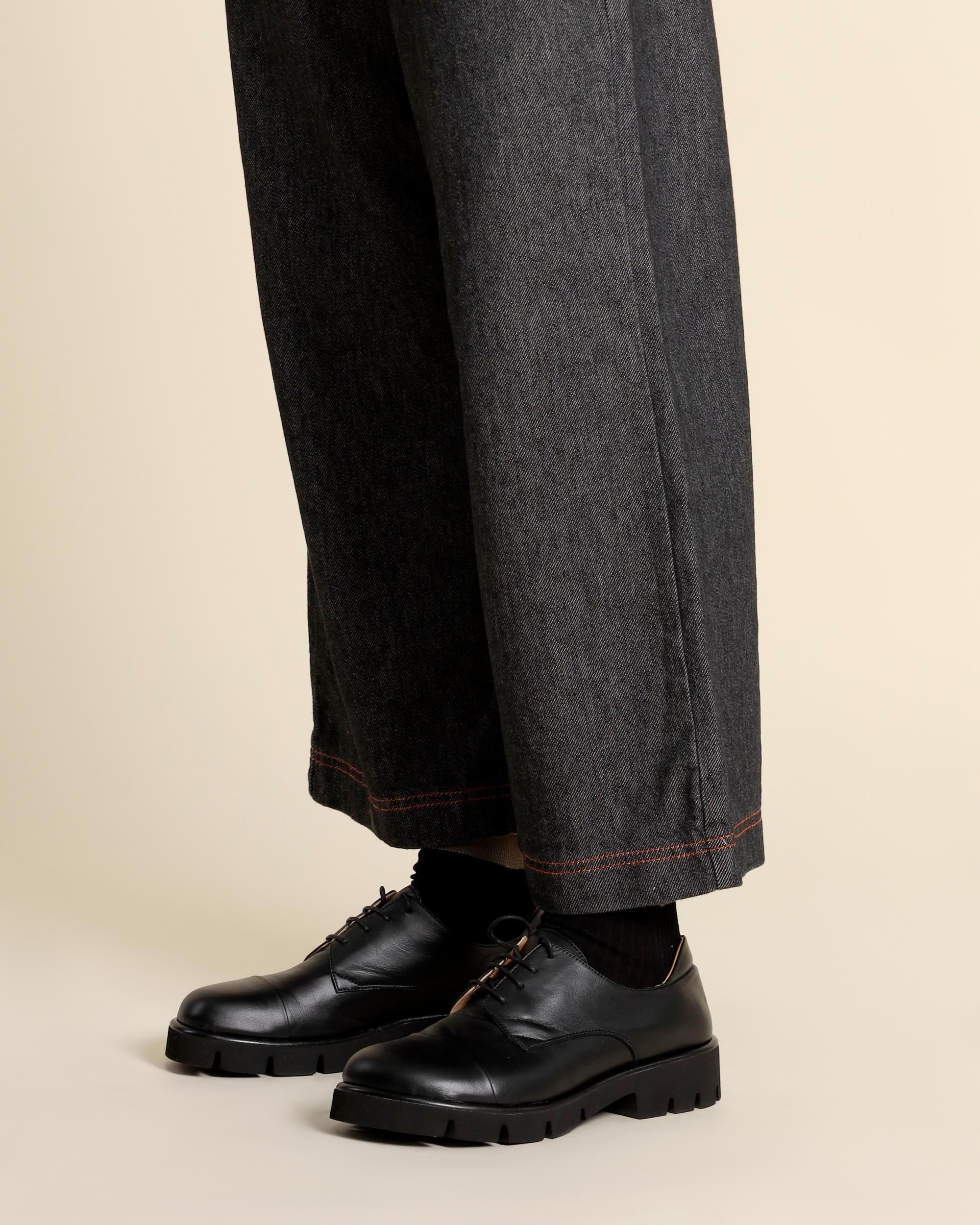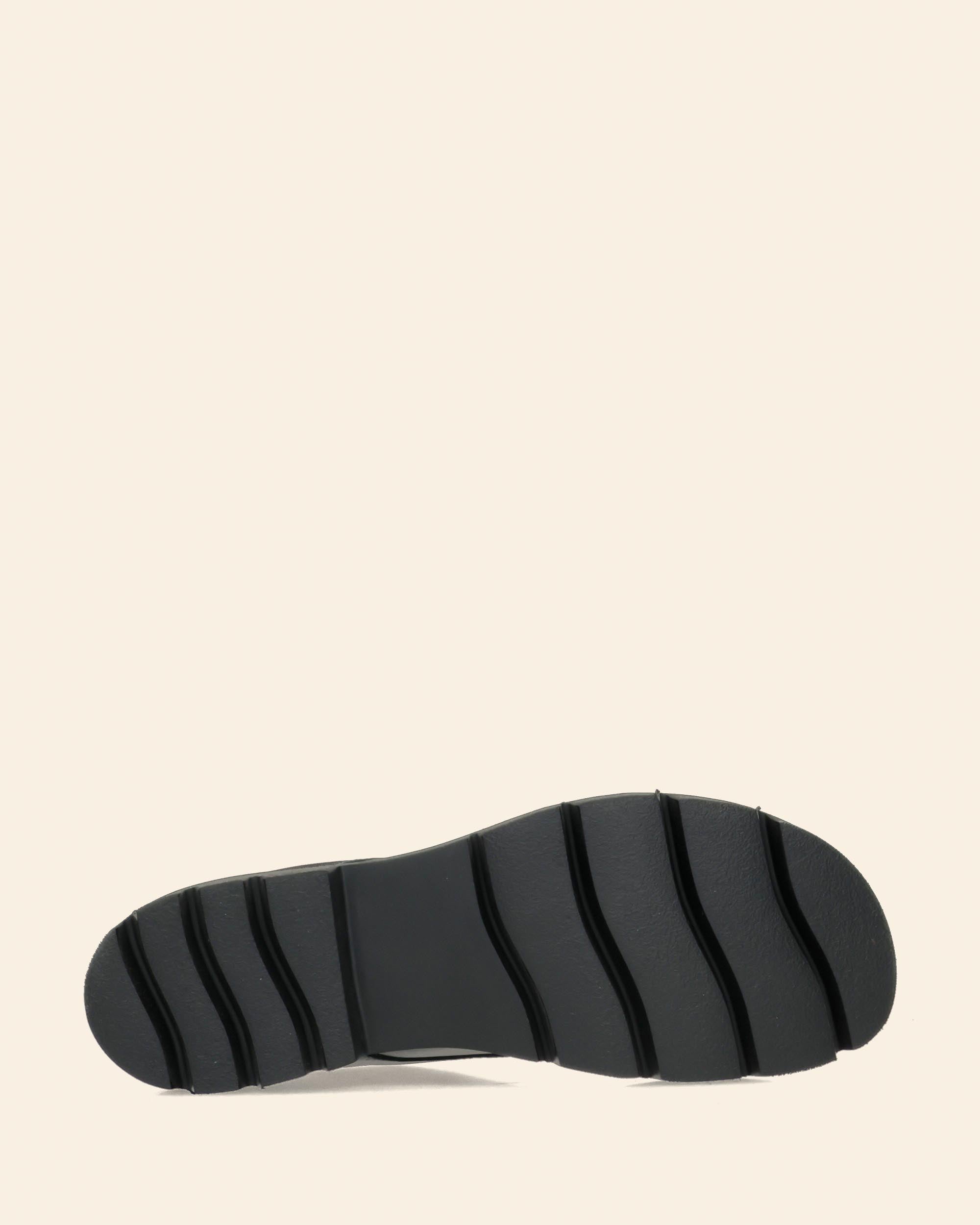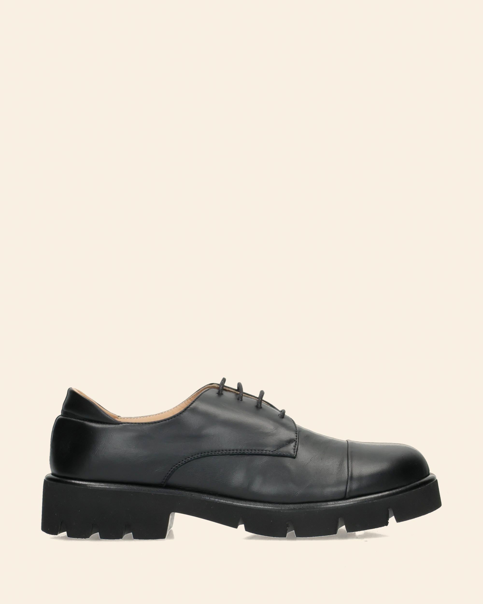 Stringata in pelle nera, realizzata artigianalmente in una morbidissima nappa, punta larga ultralight e flessibilissima, lavorazione a sacchetto,pratica suola antiscivolo in EVA caratterizzata da profondi intagli, tacco cm 3,5, made in Italy, collezione donna Hope autunno inverno 2025/2026