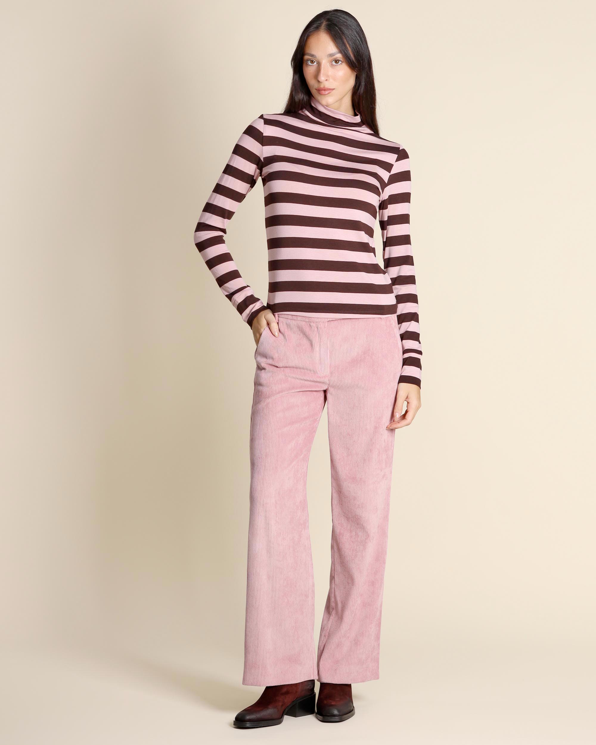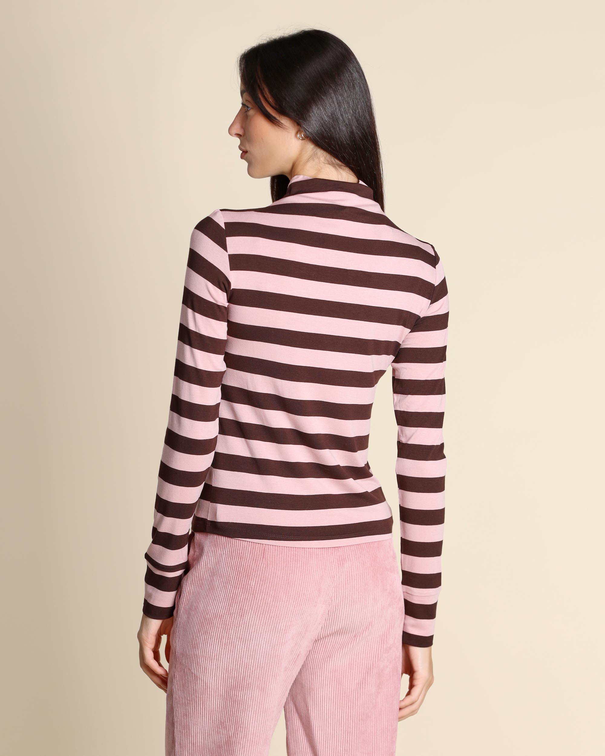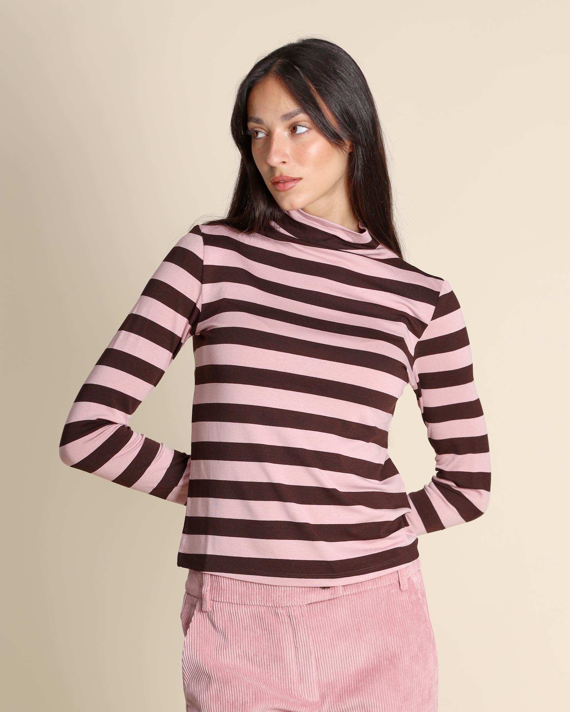 T shirt marrone e rosa a righe in jersey di viscosa stretch, collo alto, maniche lunghe, linea semiaderente, la modella indossa una tg.S, la modella ha le seguenti misure: altezza 173, seno 84, vita 63, fianchi 94, collezione donna Emme by Marella Autunno Inverno 2025/26