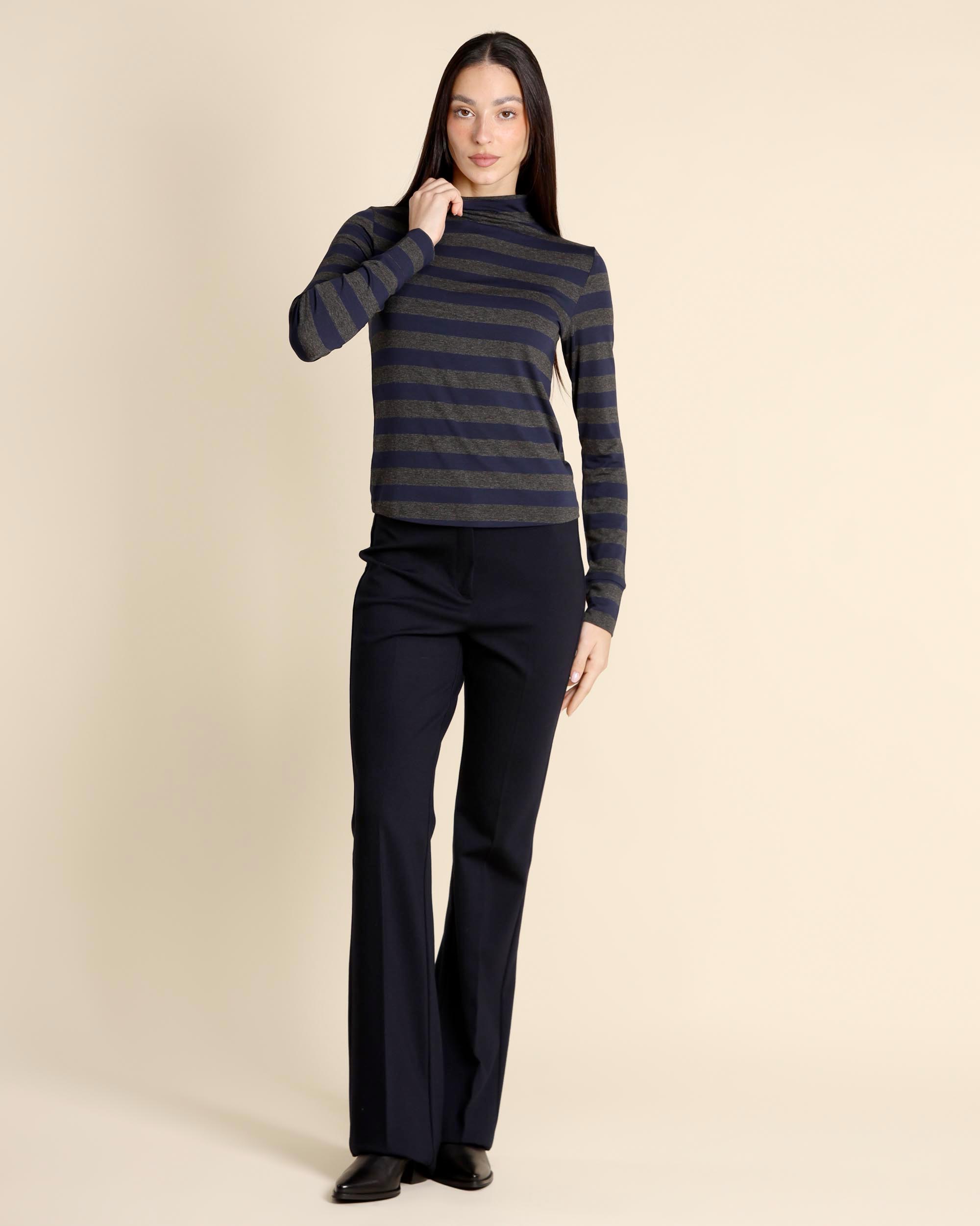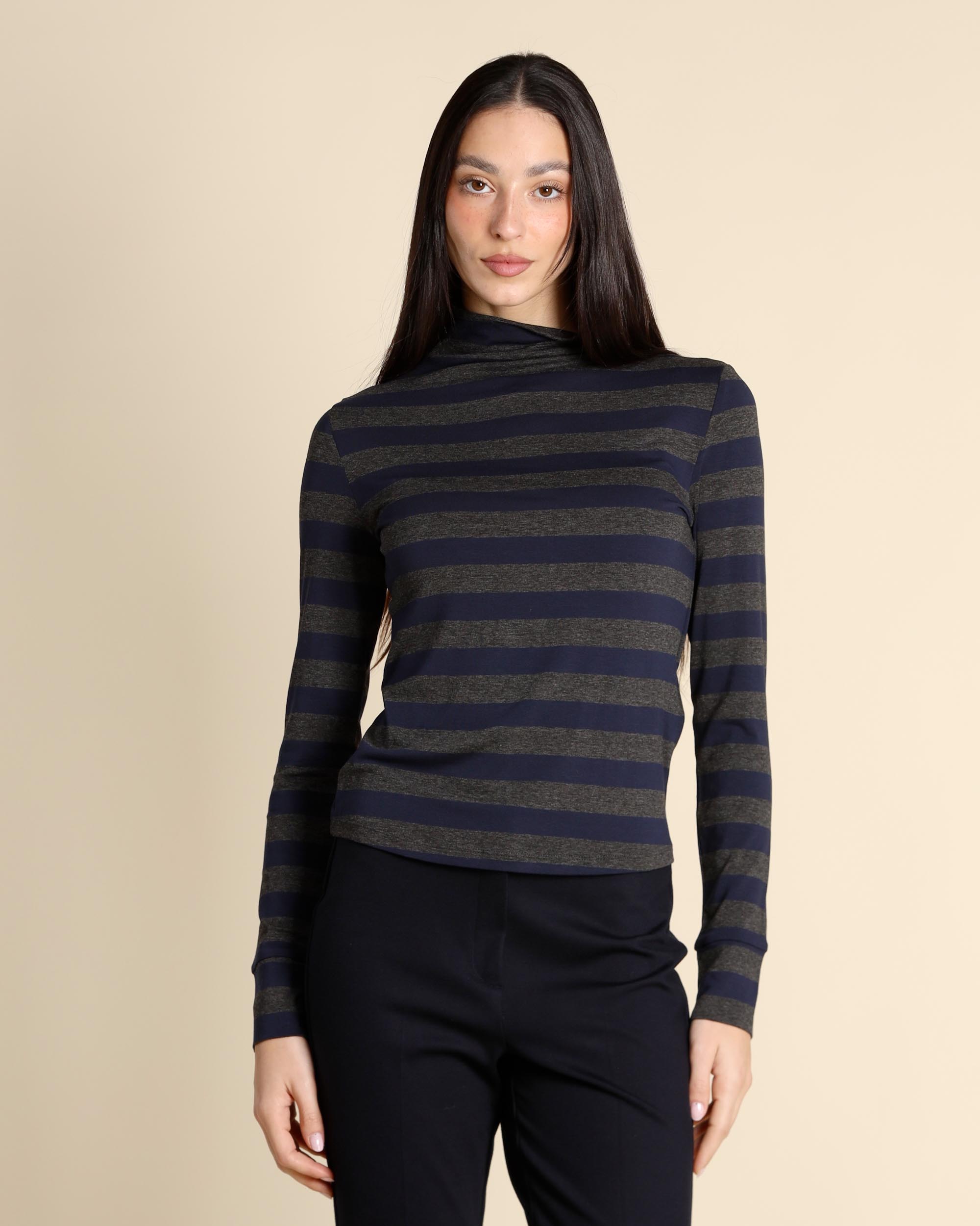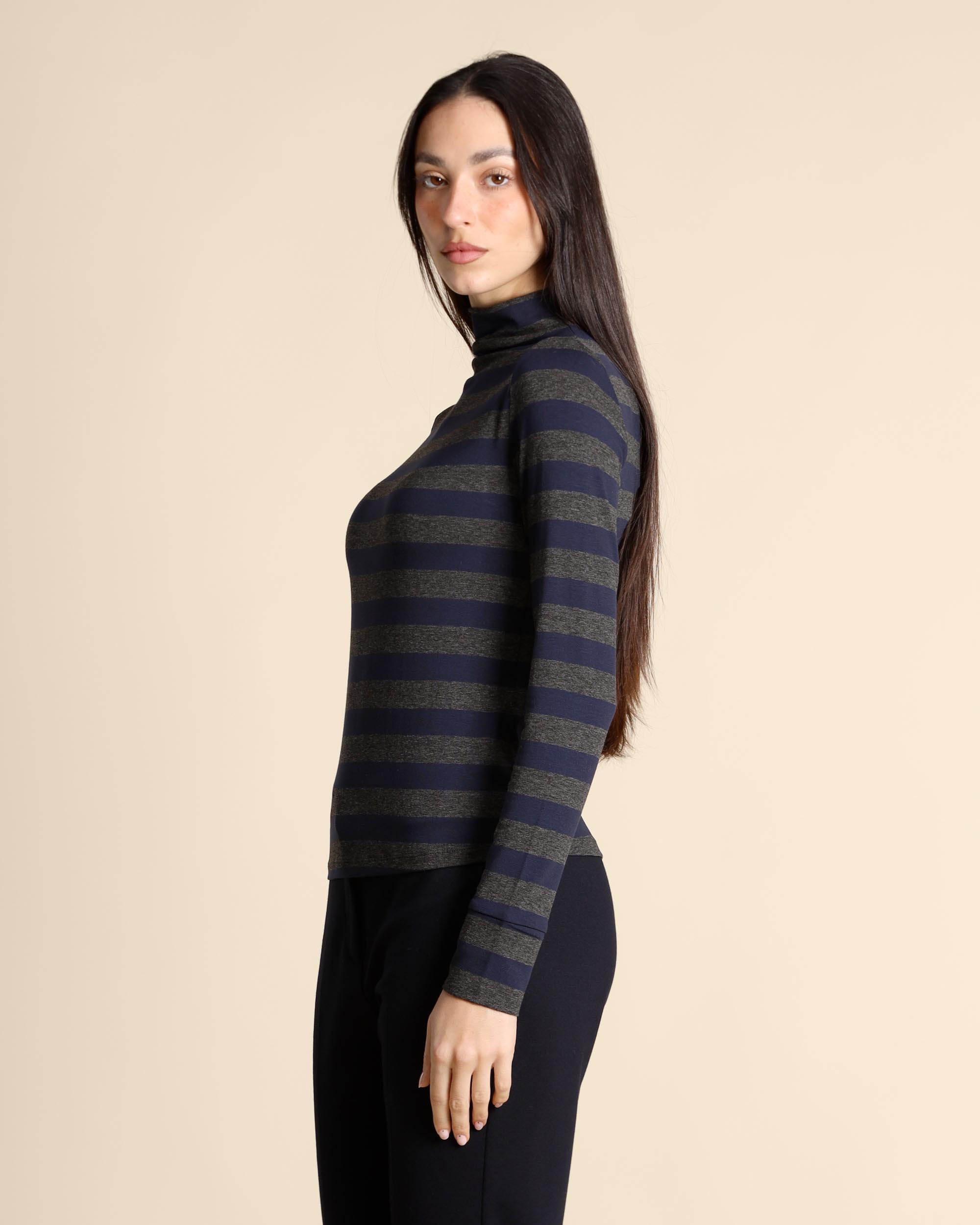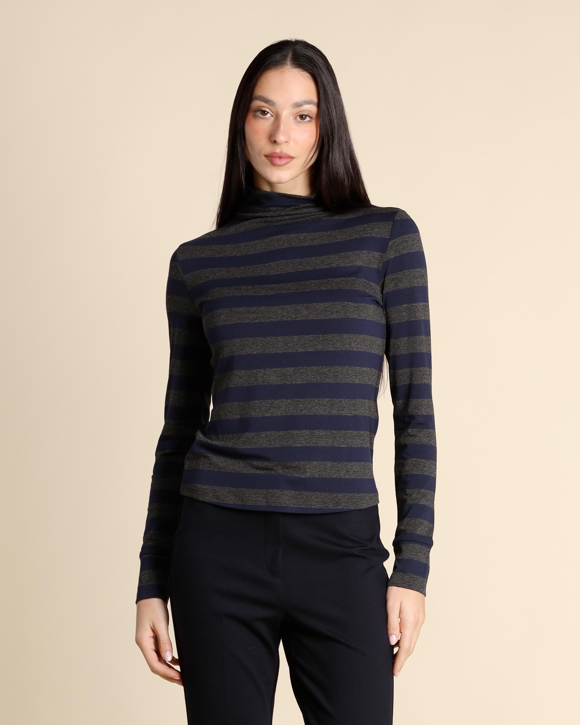 T shirt blu ed antracite a righe in jersey di viscosa stretch, collo alto, maniche lunghe, linea semiaderente, la modella indossa una tg.S, la modella ha le seguenti misure: altezza 173, seno 84, vita 63, fianchi 94, collezione donna Emme by Marella Autunno Inverno 2025/26