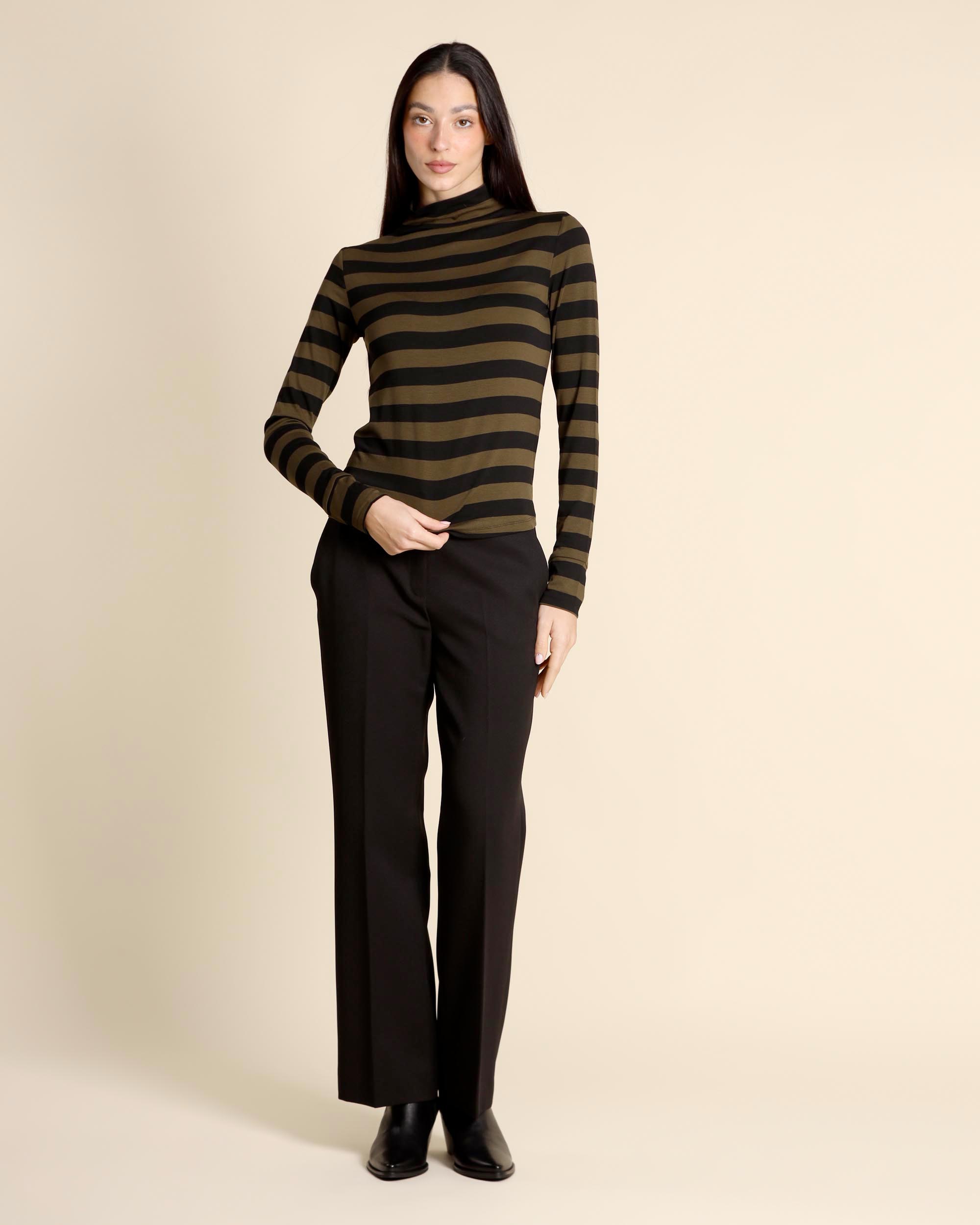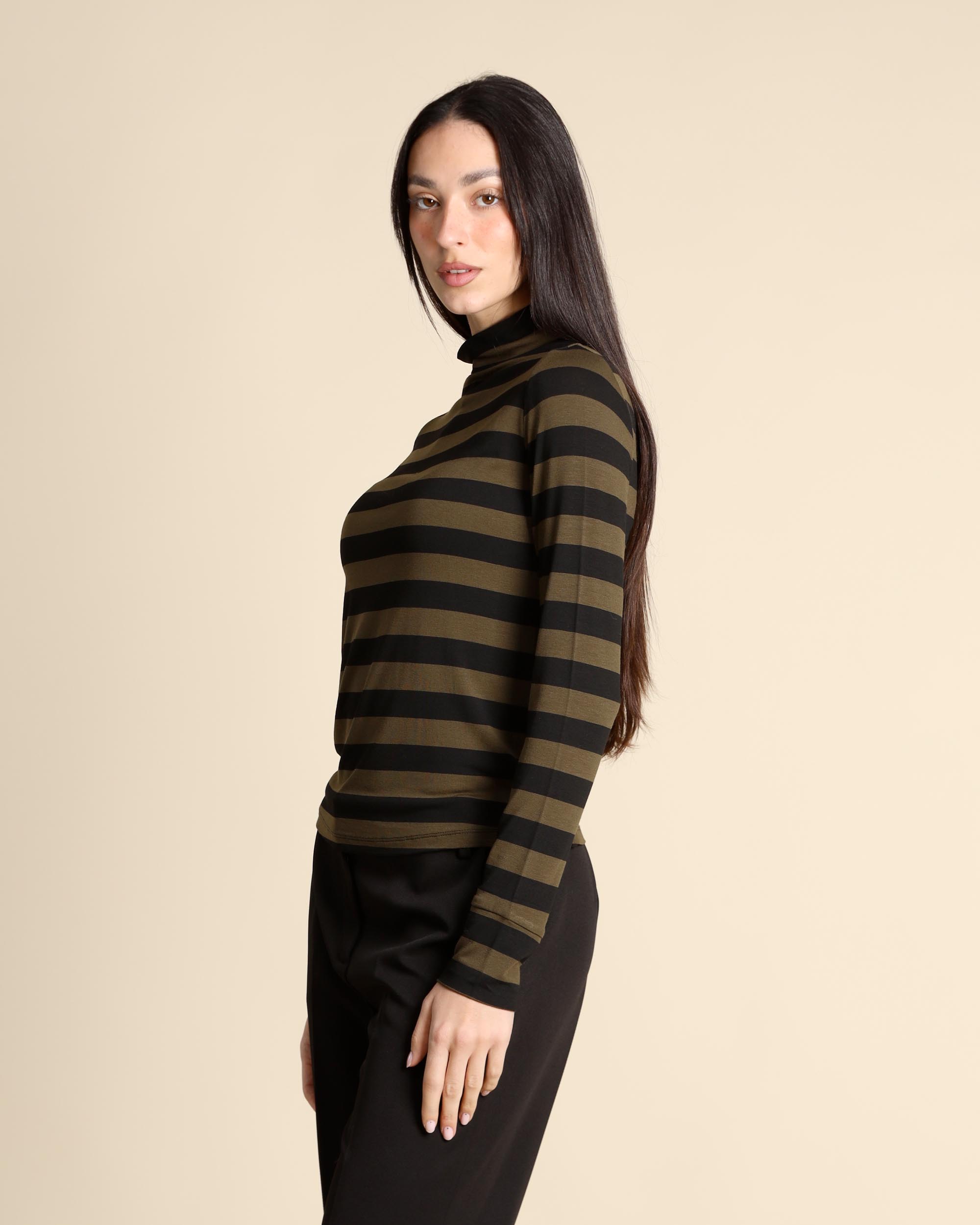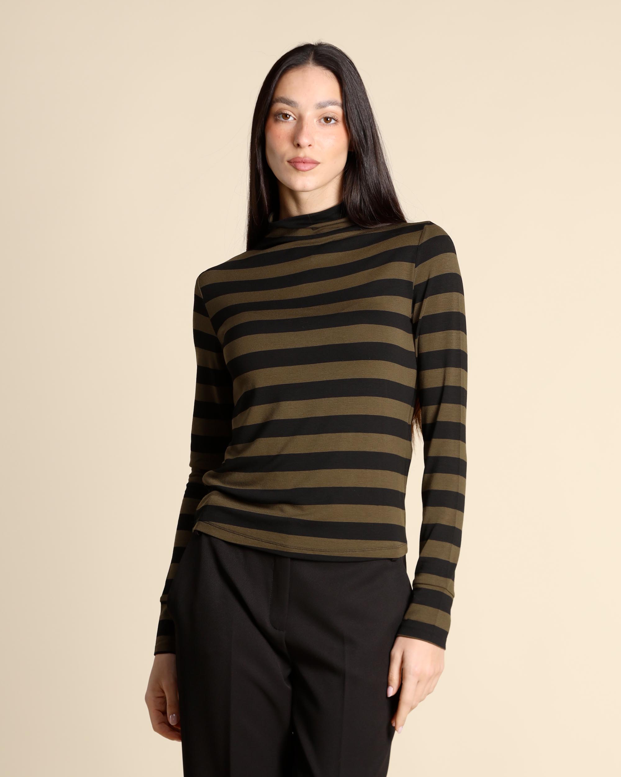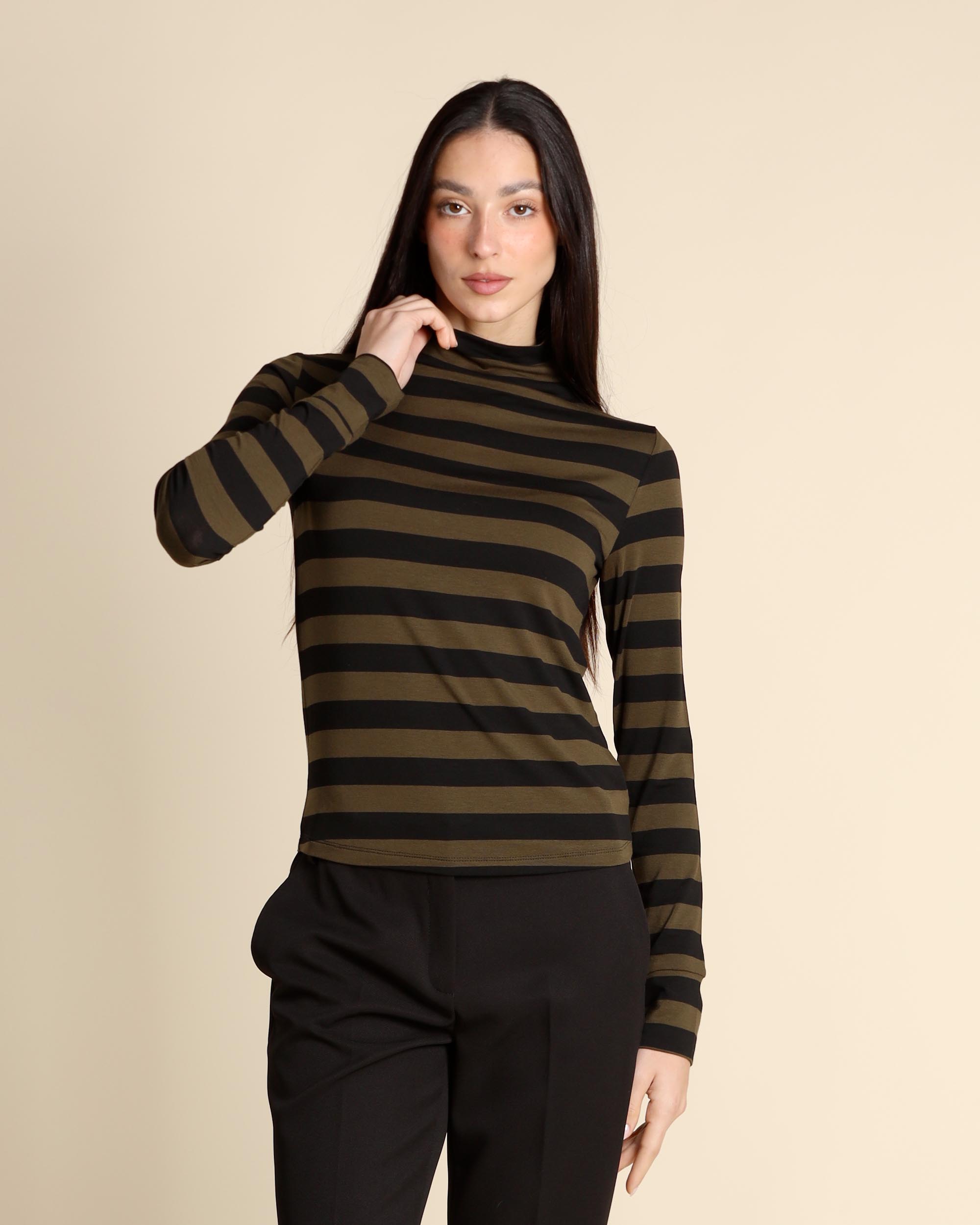 T shirt verde a righe in jersey di viscosa stretch, collo alto, maniche lunghe, linea semiaderente, la modella indossa una tg.S, la modella ha le seguenti misure: altezza 173, seno 84, vita 63, fianchi 94, collezione donna Emme by Marella Autunno Inverno 2025/26