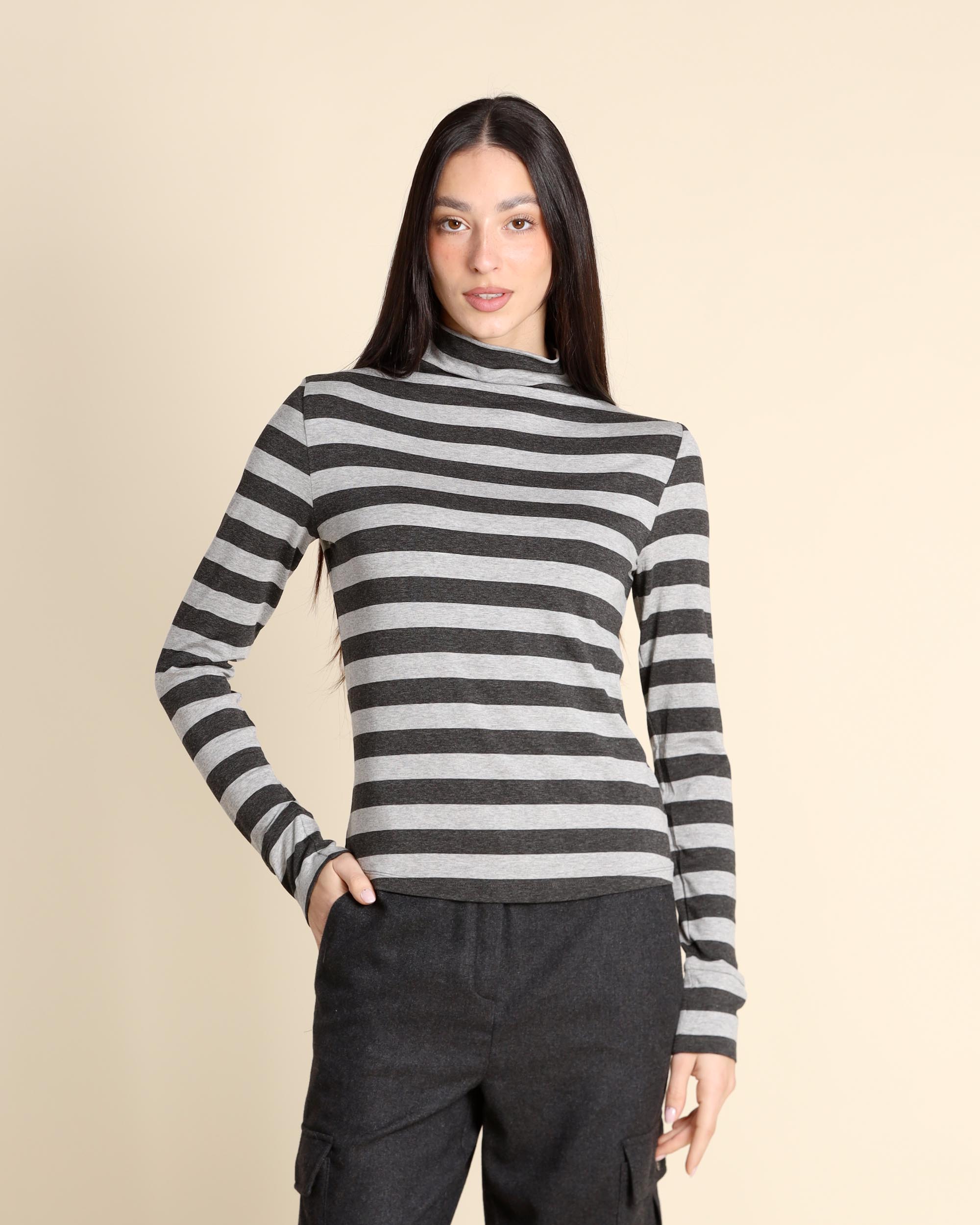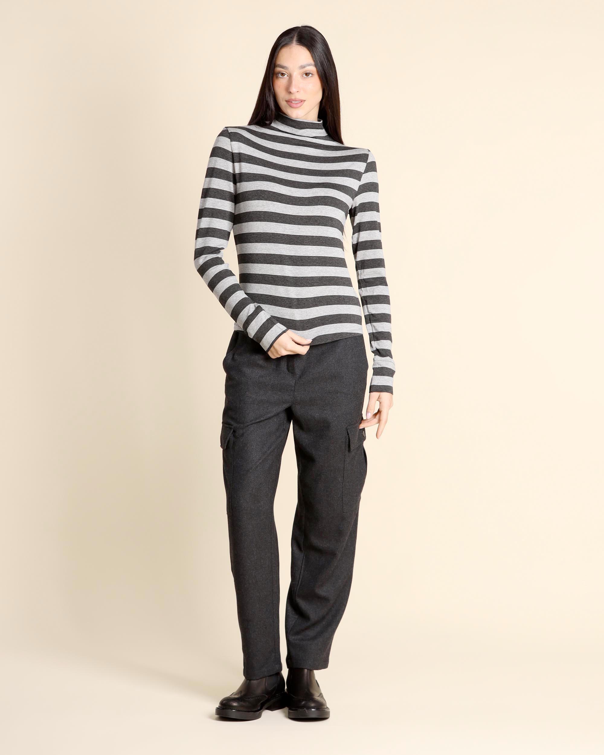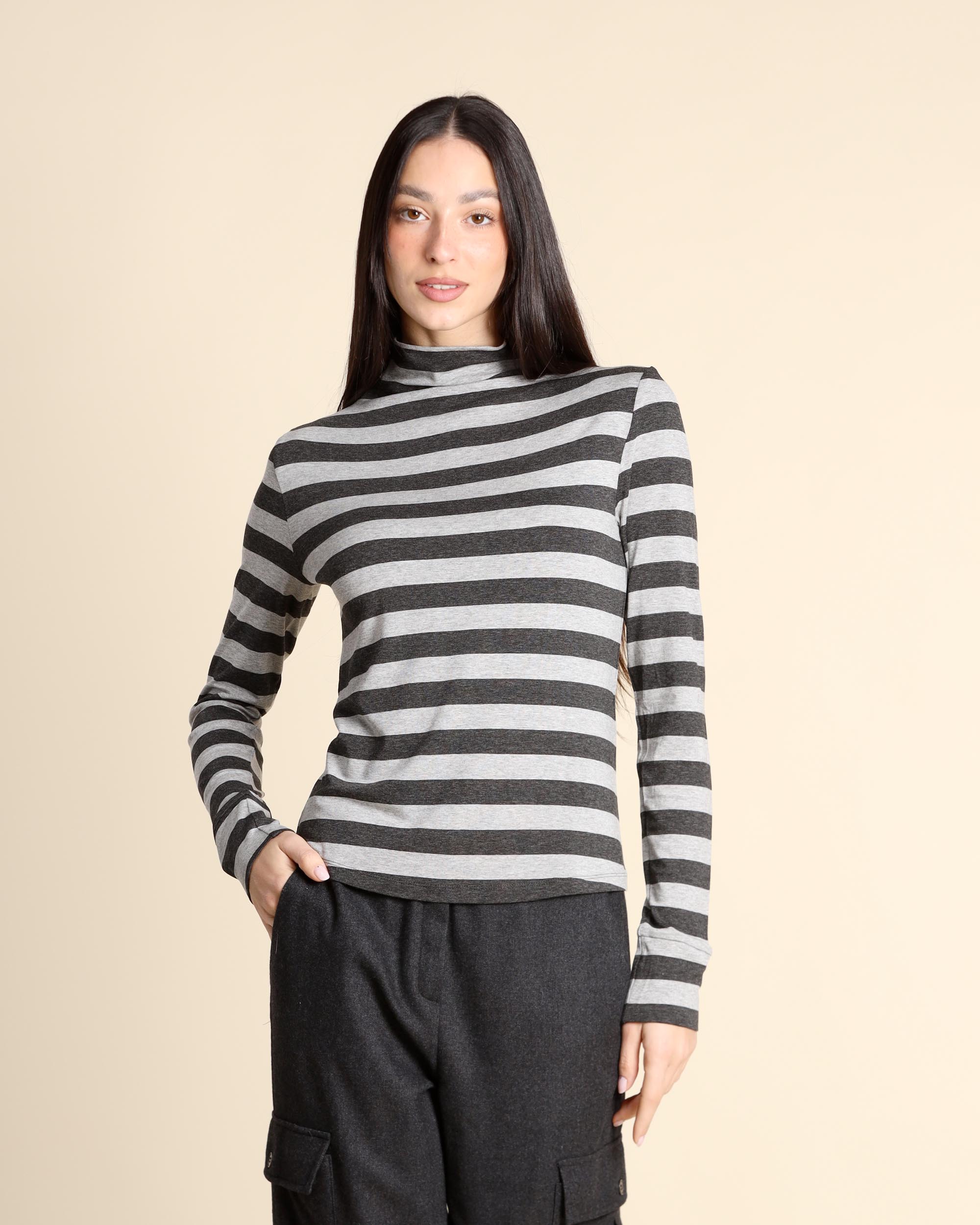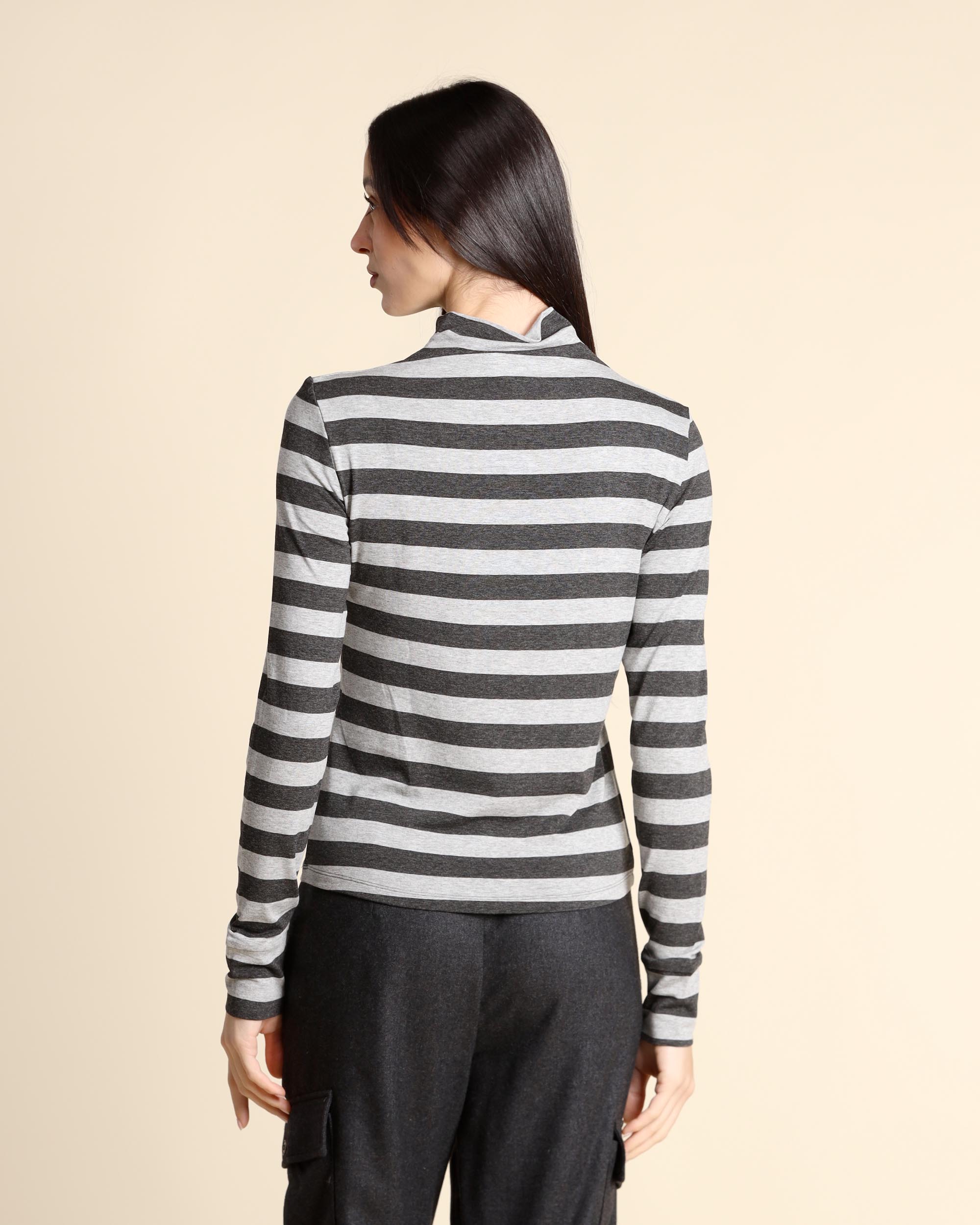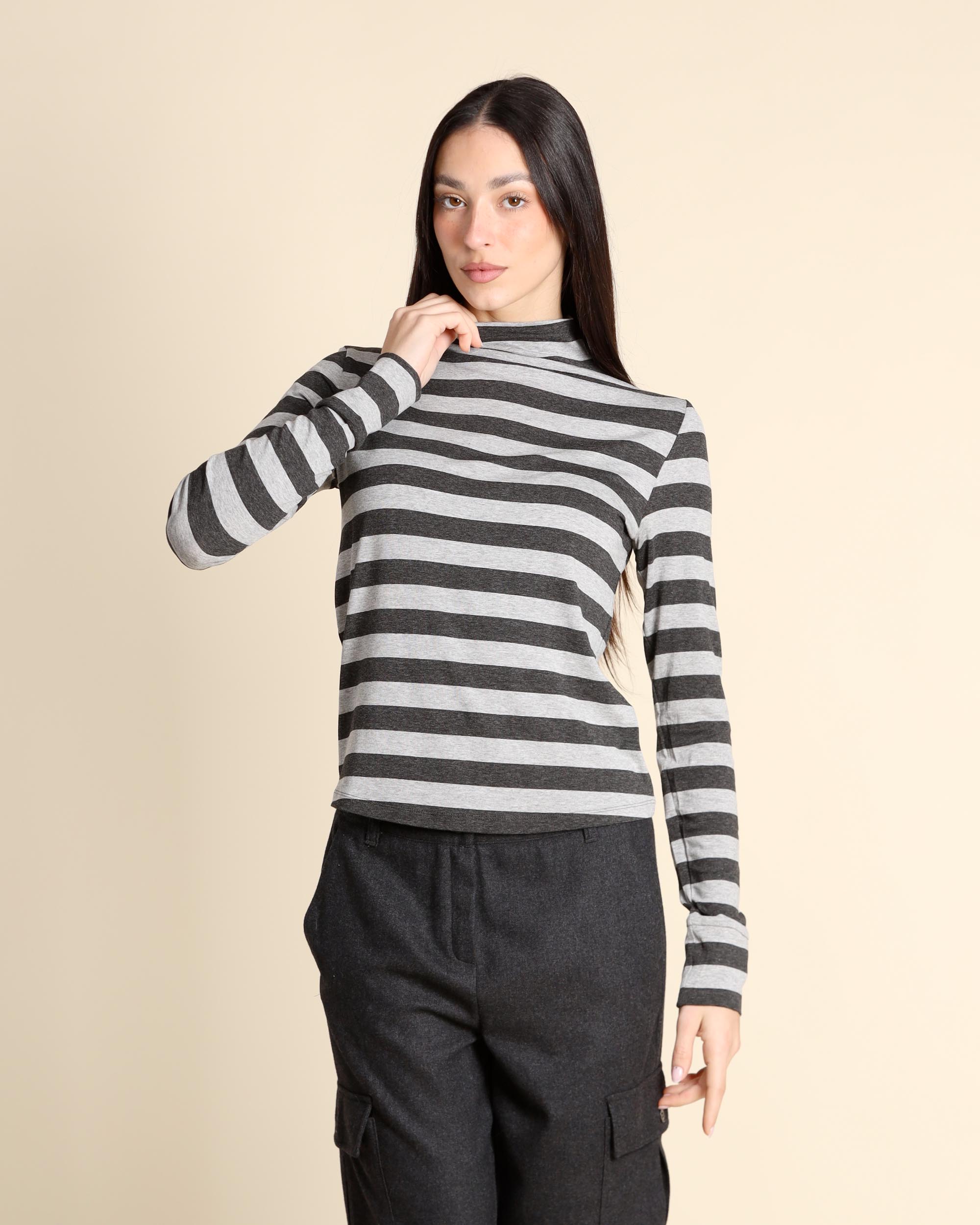 T shirt grigio chiaro ed antracite a righe in jersey di viscosa stretch, collo alto, maniche lunghe, linea semiaderente, la modella indossa una tg.S, la modella ha le seguenti misure: altezza 173, seno 84, vita 63, fianchi 94, collezione donna Emme by Marella Autunno Inverno 2025/26