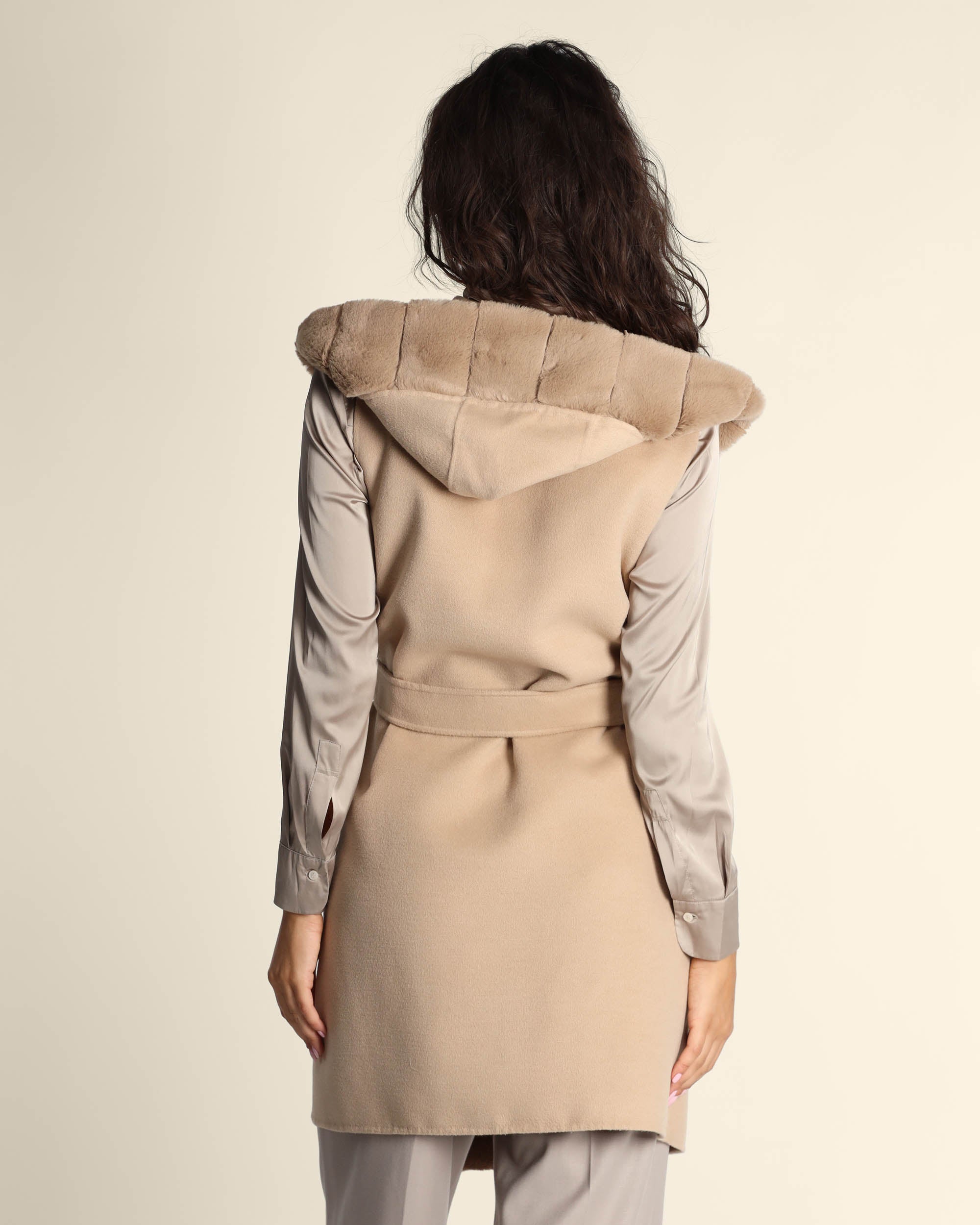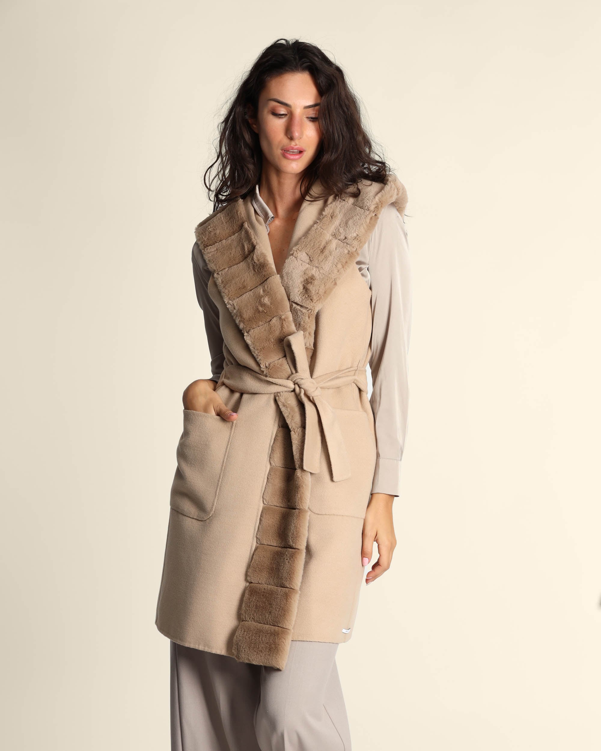 Gilet beige in bimateriale, tessuto effetto pelliccia sul davanti e nel cappuccio e panno double sul dietro, collo con cappuccio, senza maniche, linea dritta, senza bottoni, cintura coordinata, tasche applicate, Elisa indossa una tg.42, Elisa ha le seguenti misure: altezza 179, seno 84, vita 63, fianchi 94, collezione donna Emme by Marella Autunno Inverno 2025/26