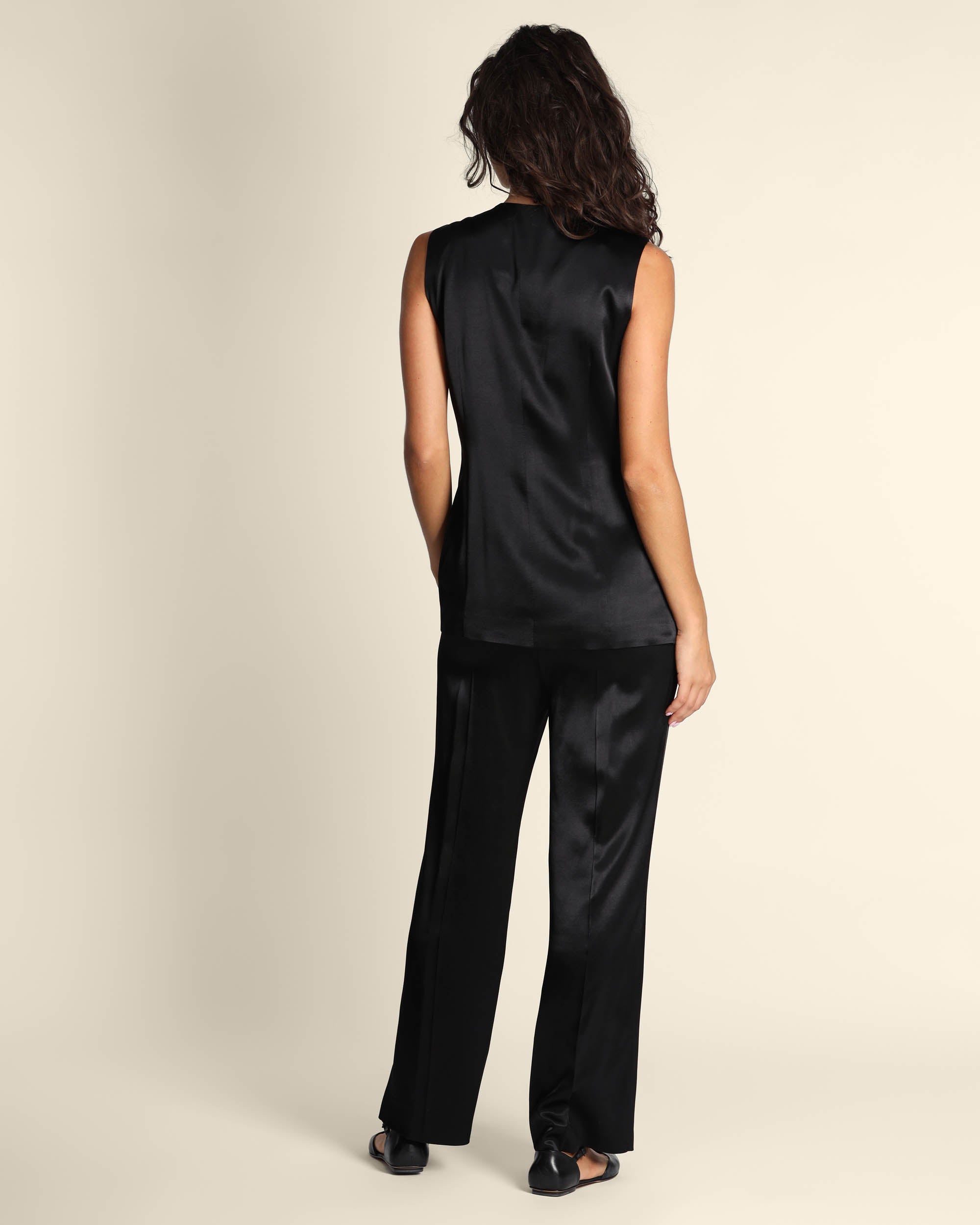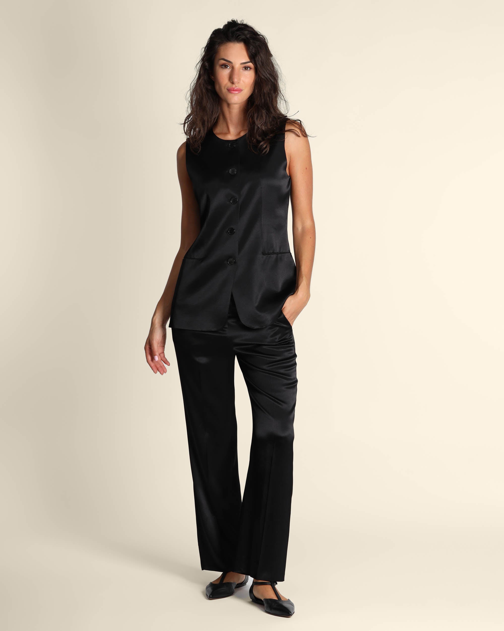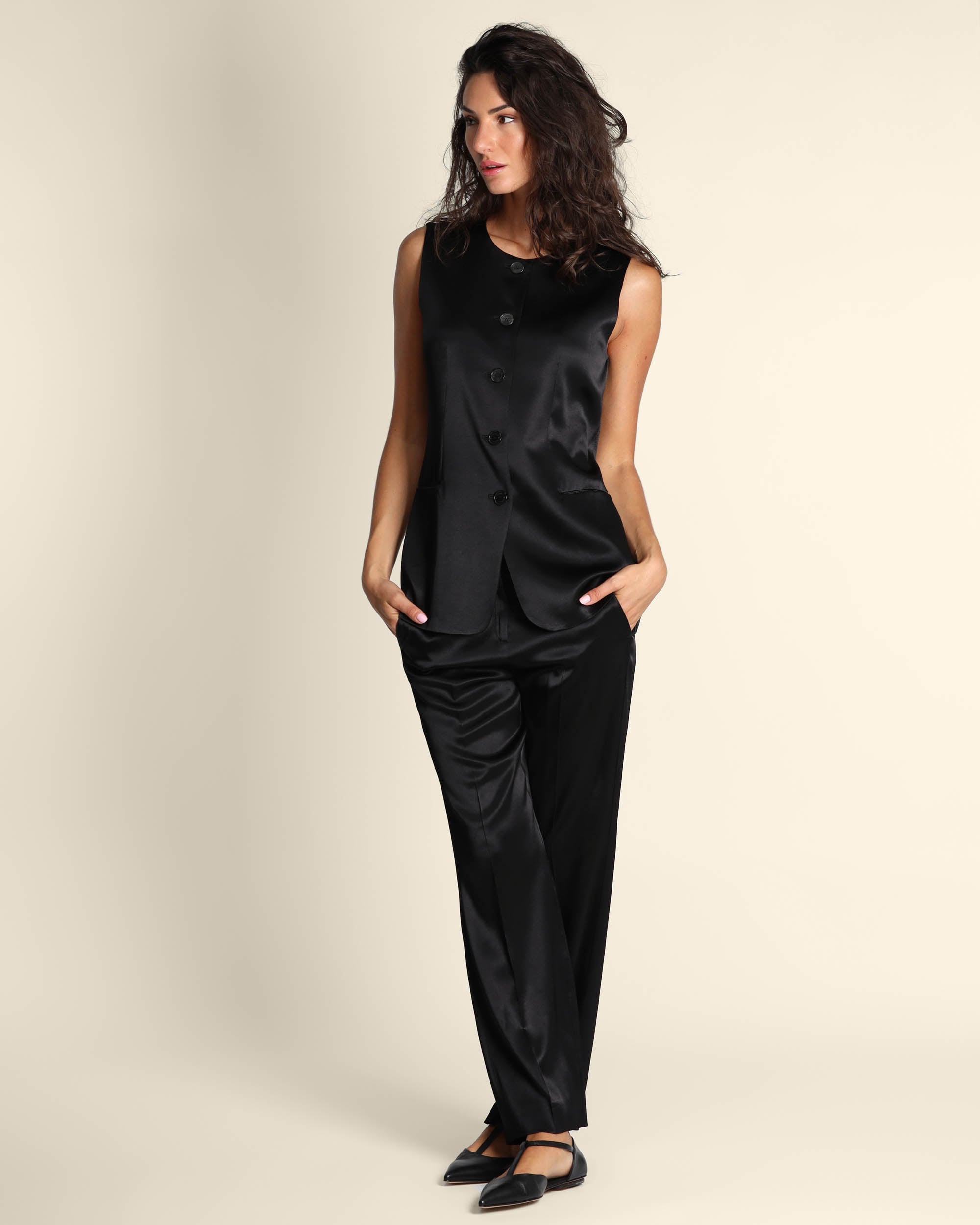 Completo gilet e pantaloni neri in raso di viscosa stretch, gilet senza maniche, scollo tondo, chiusura con bottoni, tasche a filetto, foderato, linea dritta, pantaloni con chiusura con bottone a pressione e zip nascosti, linea dritta, tasche alla francese, piega stirata danti e dietro, la modella indossa una tg.42, la modella ha le seguenti misure: altezza 178, seno 86,vita 65, fianchi 93, collezione donna Emme by Marella Autunno Inverno 2025/26