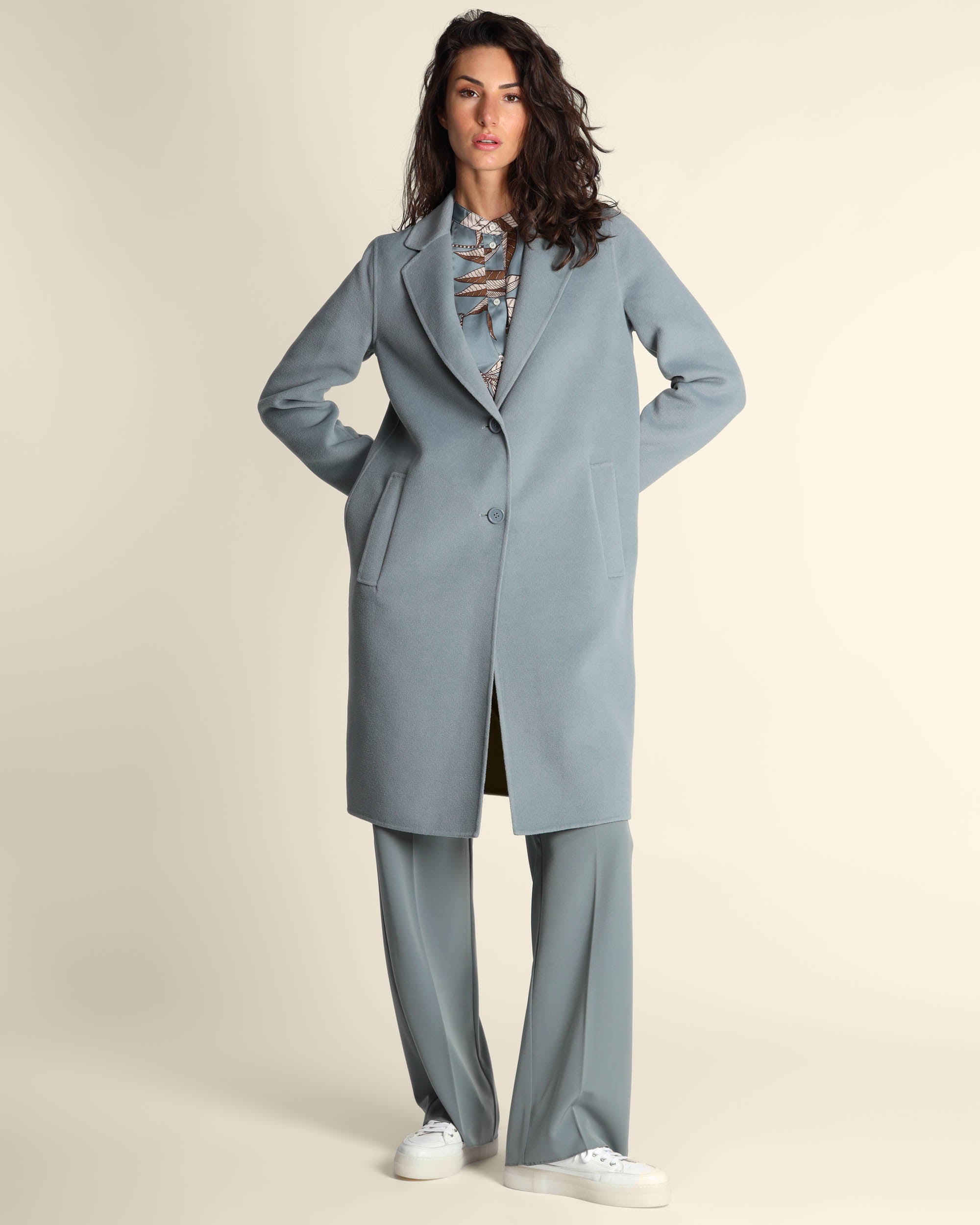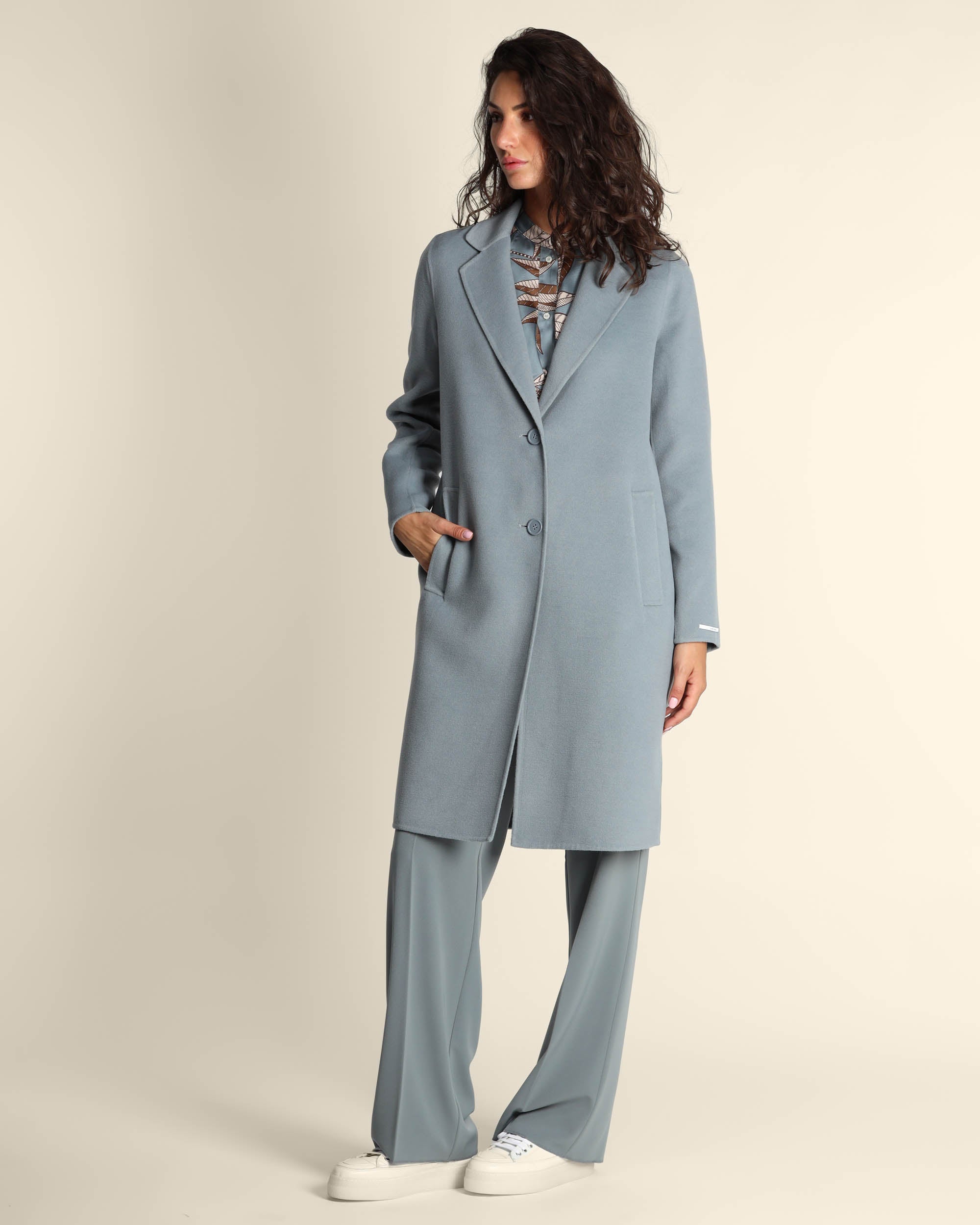 Cappotto azzurro polvere in panno double, collo a rever, maniche lunghe, chiusura con bottoni, linea dritta, tasche a filetto, cucito a mano, sfoderato, la modella indossa una tg.42, la modella ha le seguenti misure: altezza 178, seno 86,vita 65, fianchi 93, collezione donna Emme by Marella Autunno Inverno 2025