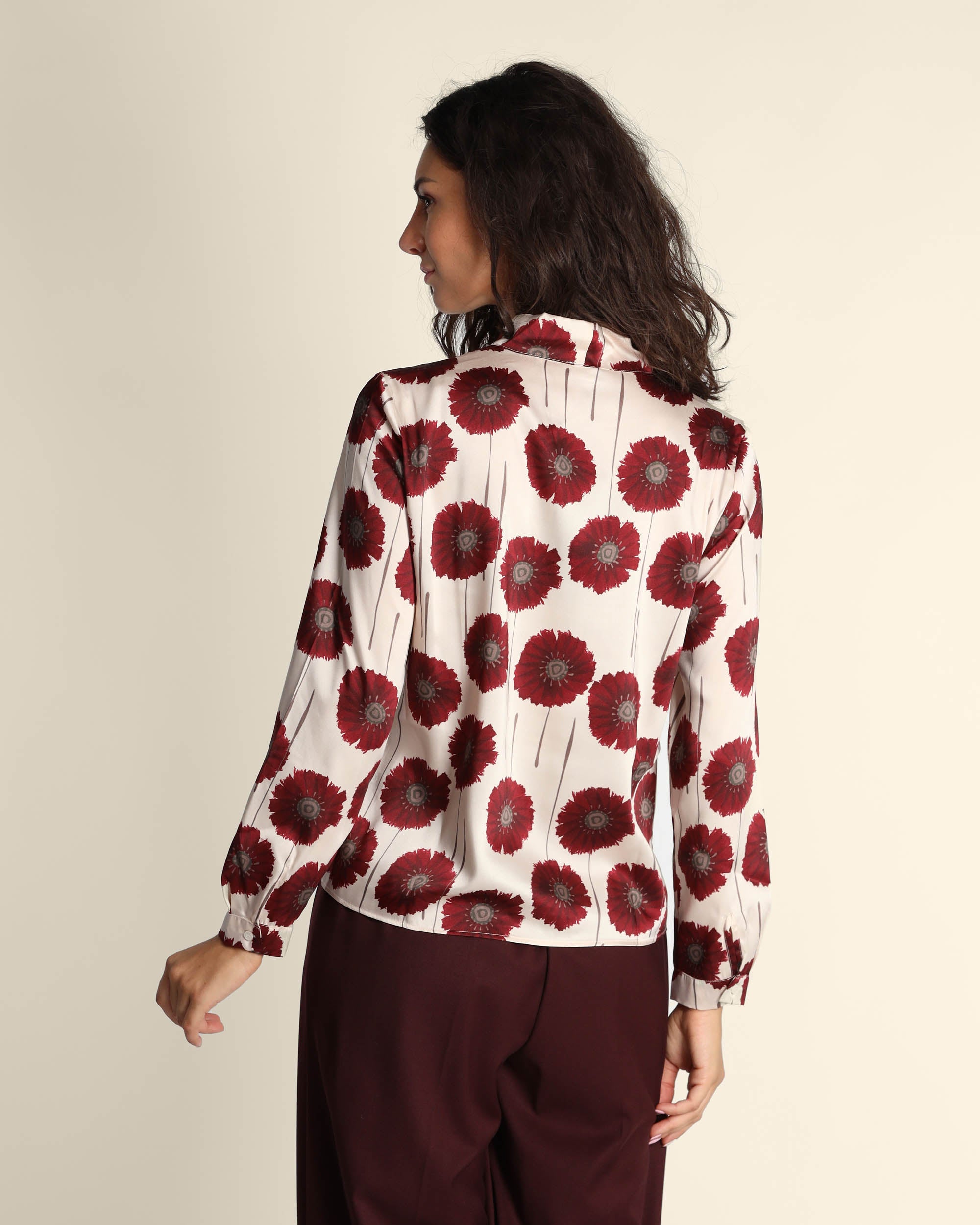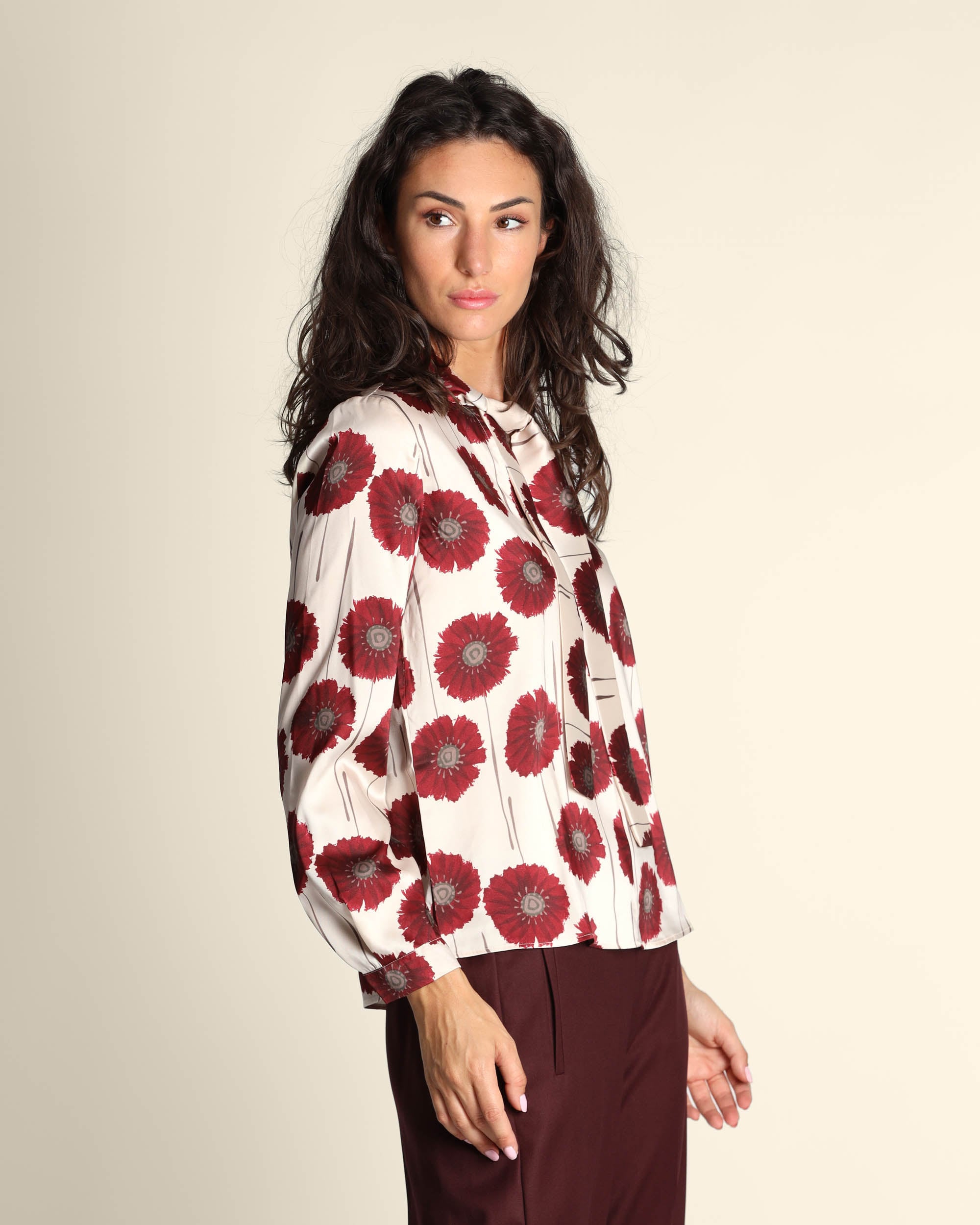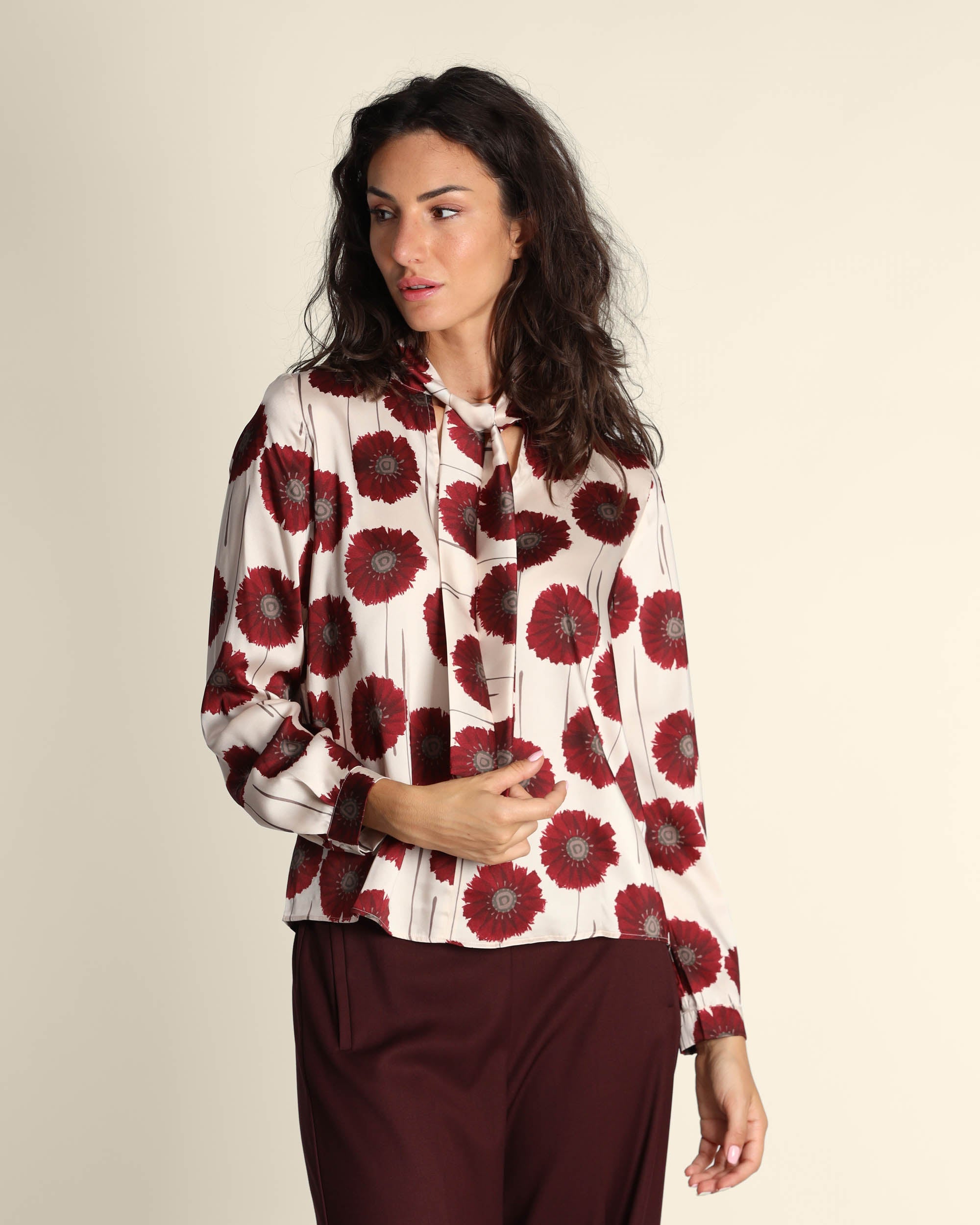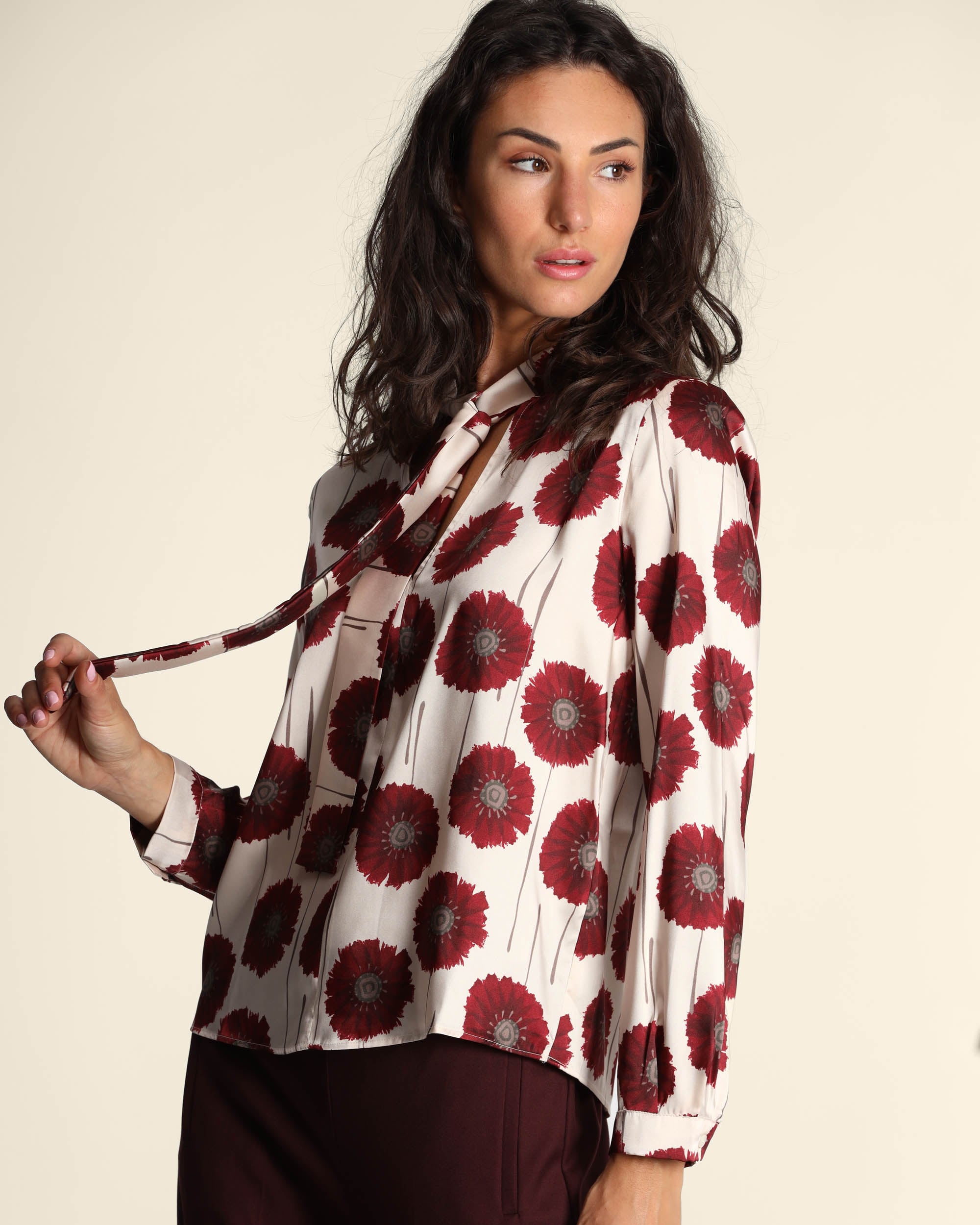 Camicia a fantasia color burro e bordeaux in twill, collo a V con fiocco, maniche lunghe con polsino, linea dritta, la modella indossa una tg.42, la modella ha le seguenti misure: altezza 178, seno 86,vita 65, fianchi 93, collezione donna Emme by Marella Autunno Inverno 2025/26