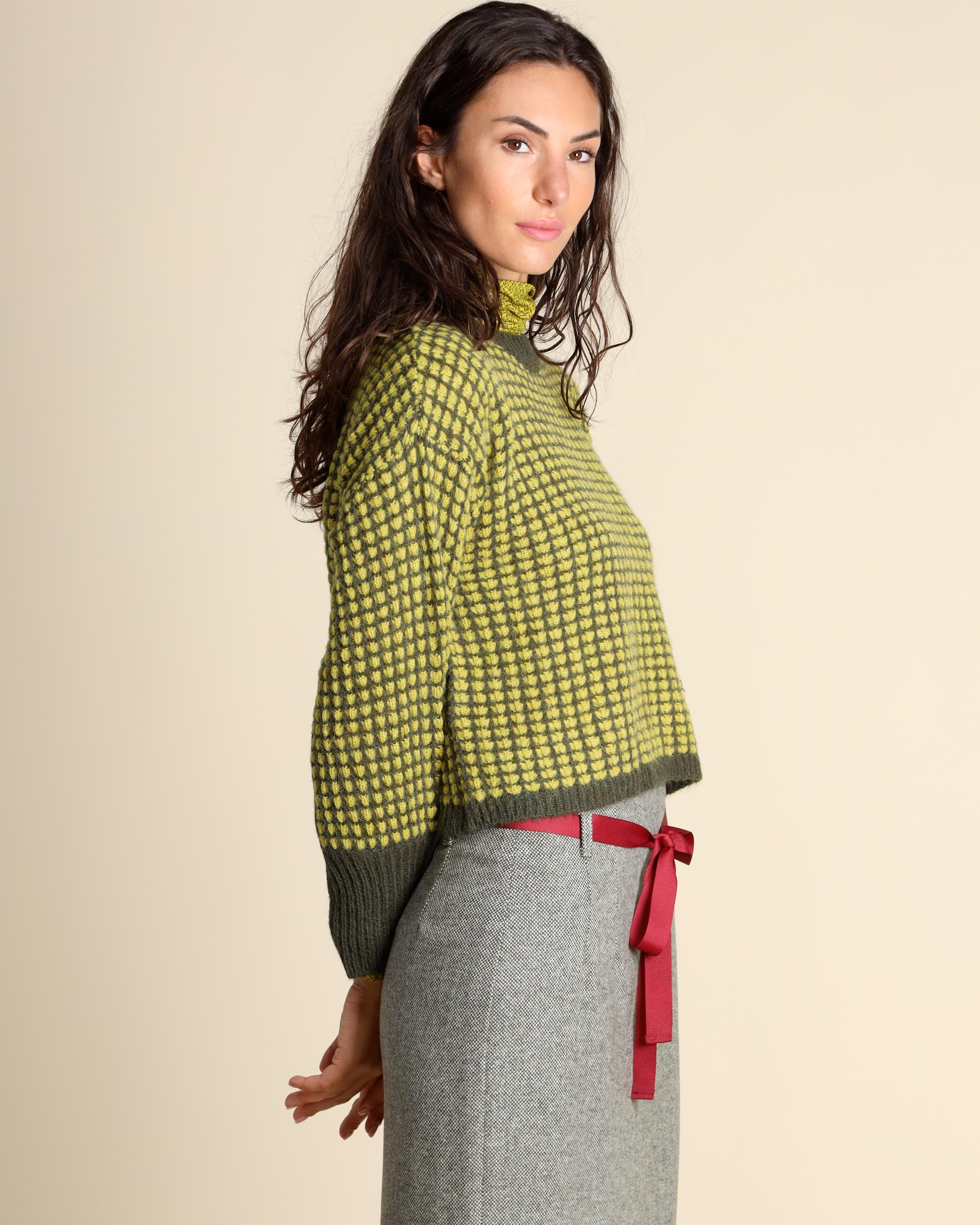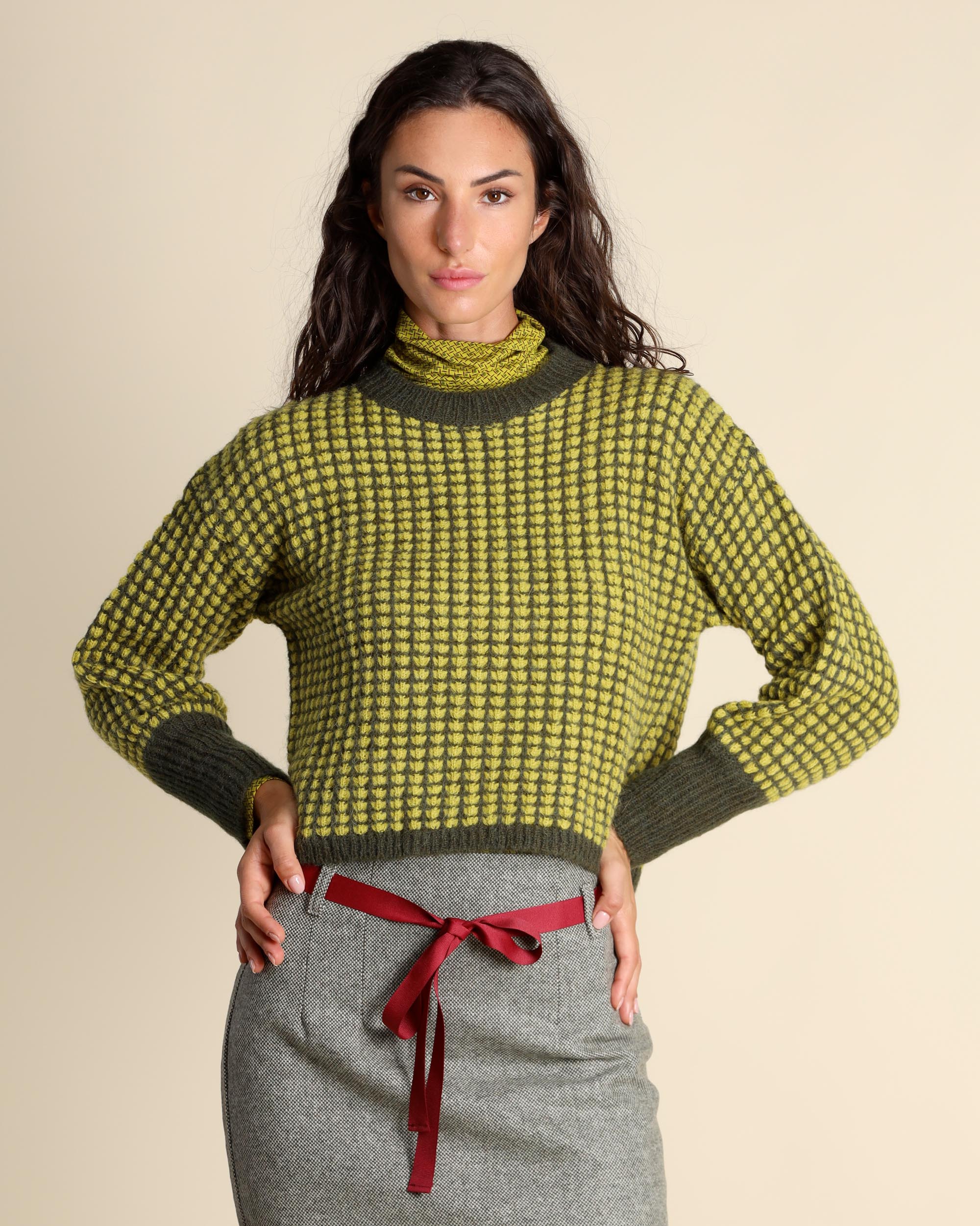 Maglia di misto alpaca verde oliva e verde acido, scollo tondo, maniche lunghe, giro sceso, linea dritta, made in Italy, la modella indossa una tg.S, la modella ha le seguenti misure: altezza 179, seno 84, vita 63, fianchi 94, collezione donna Justmine Autunno Inverno 2025/26