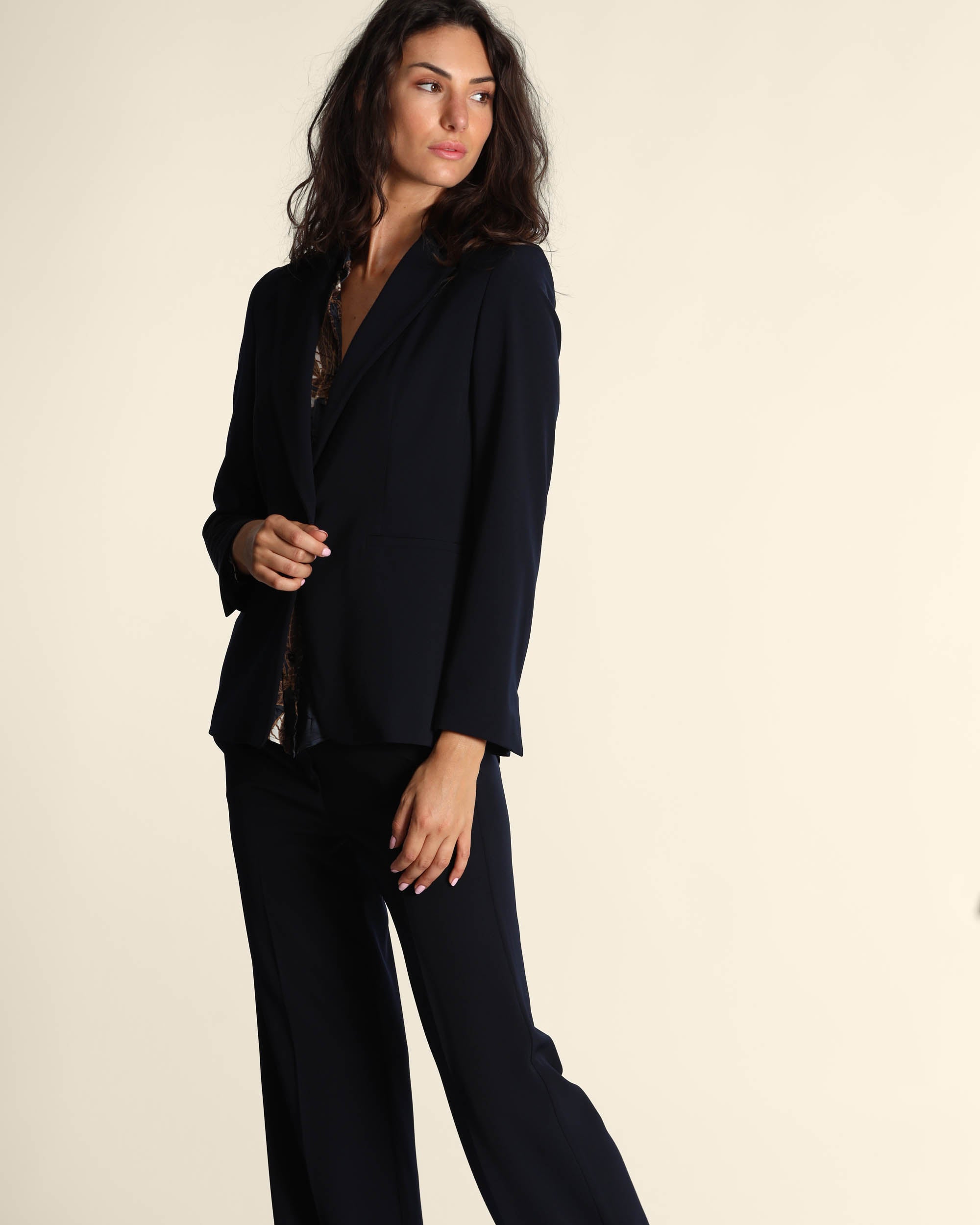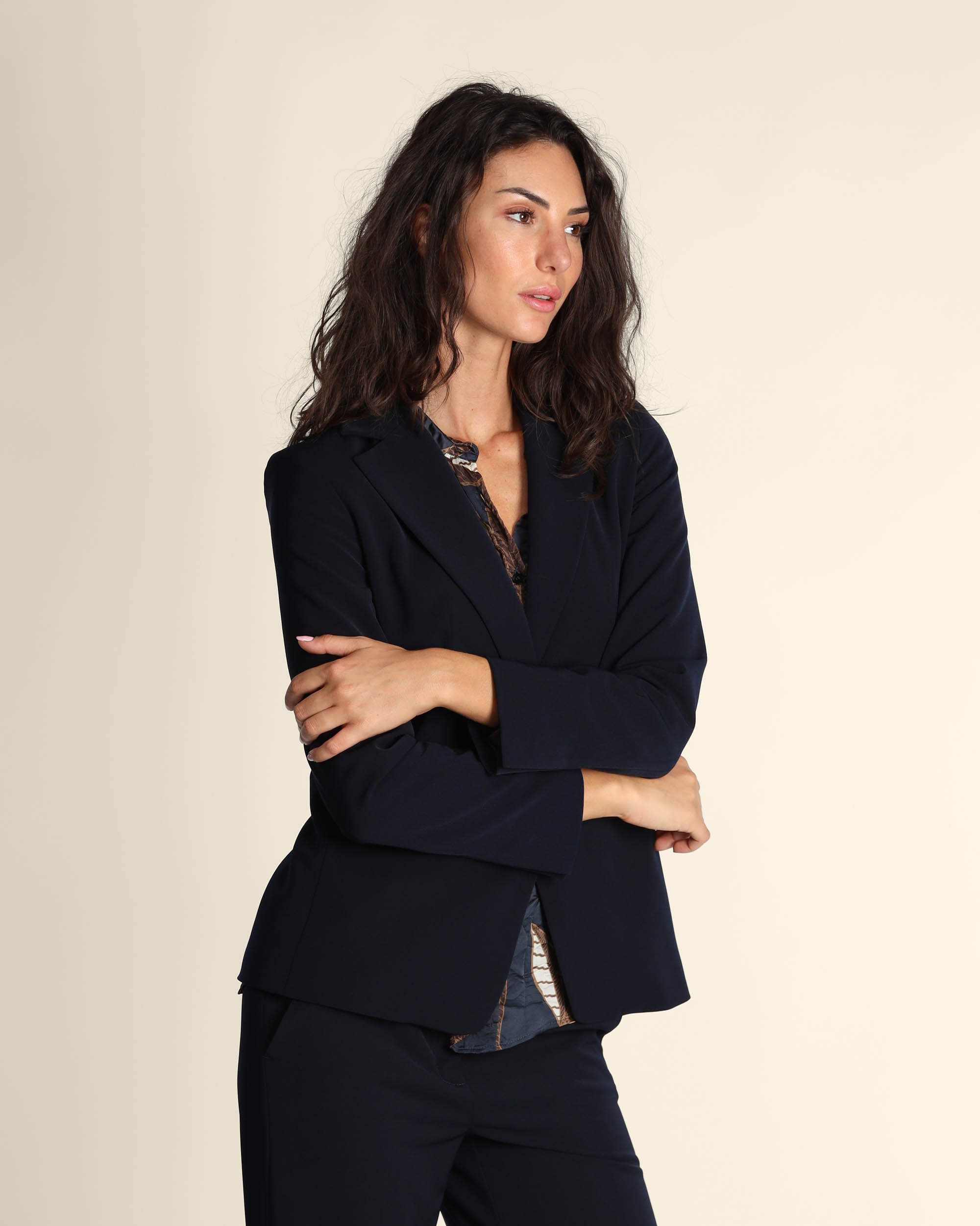 Giacca blu in twill fluido stretch, collo a rever, maniche lunghe, chiusura con bottone, linea semiaderente, tasche a filetto, foderata, la modella indossa una tg.42, la modella ha le seguenti misure: altezza 178, seno 86,vita 65, fianchi 93, collezione donna Emme by Marella Autunno Inverno 2025/26