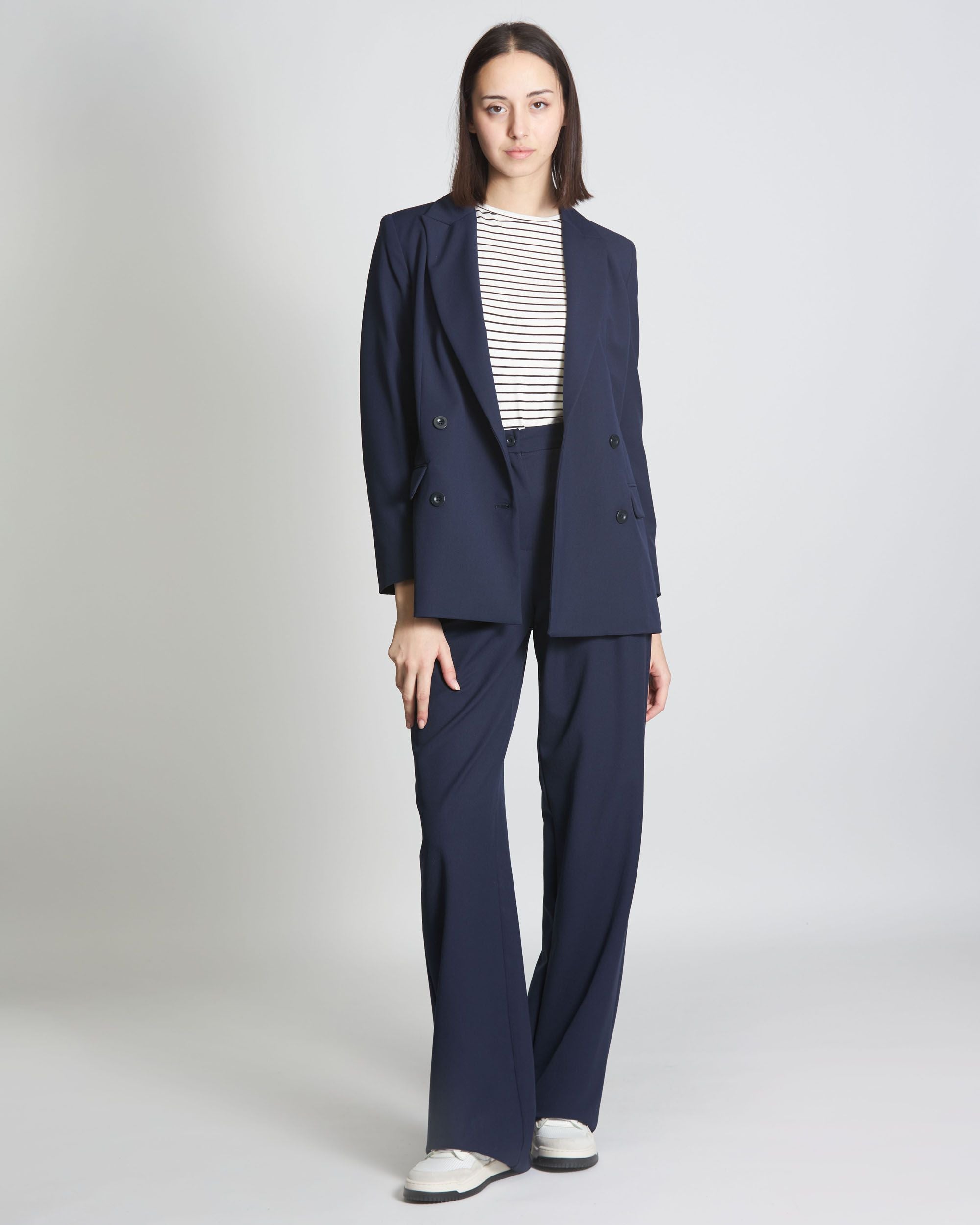Pantaloni blu notte in gabardine di misto viscosa stretch, chiusura con bottone e zip nascosta, tasche alla francese, linea ampia, piega stirata davanti e dietro, Giorgia indossa una tg.42, Giorgia ha le seguenti misure: altezza 1.78, seno 85cm, vita 70cm, fianchi 88cm, collezione donna Emme by Marella Primavera Estate 2024